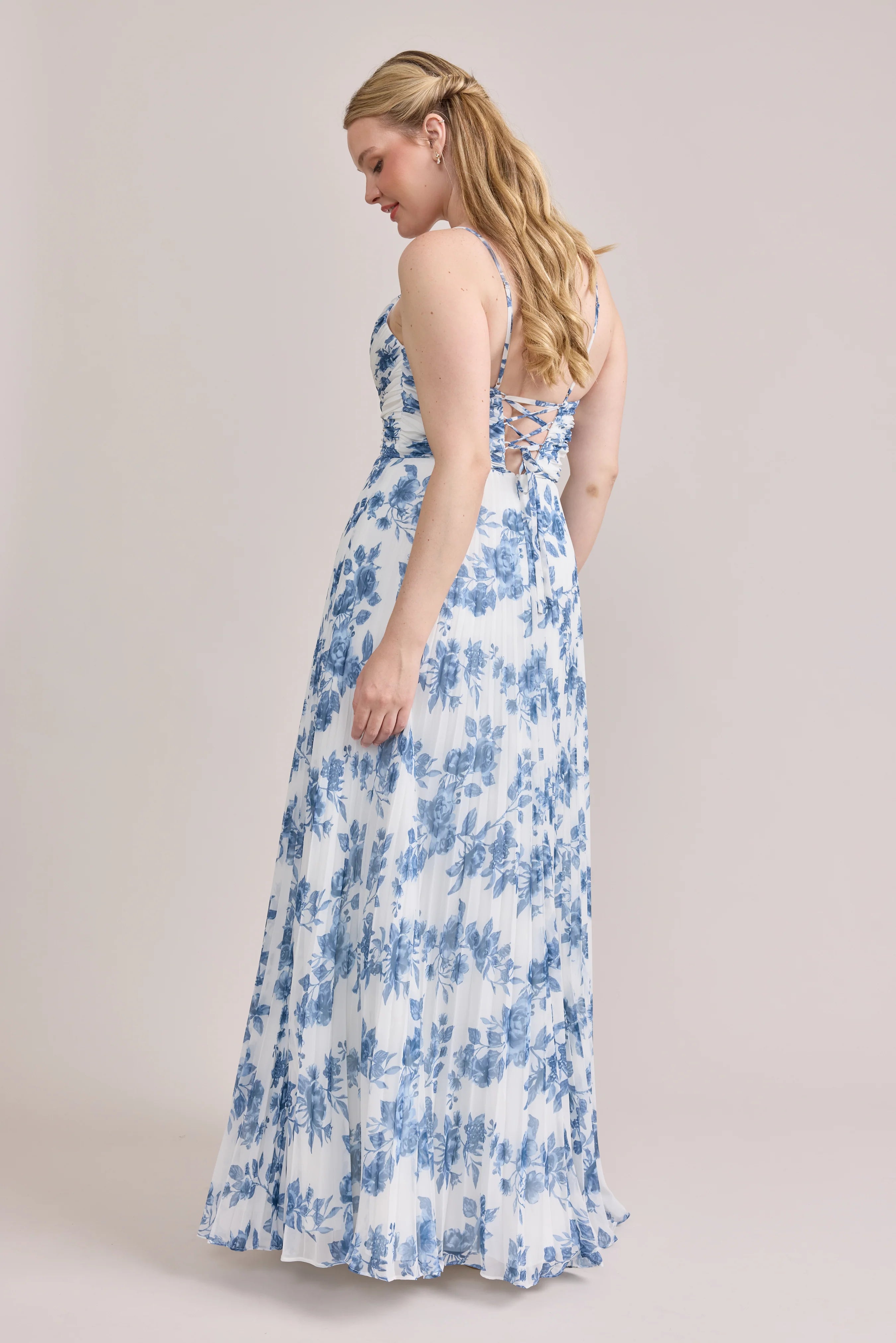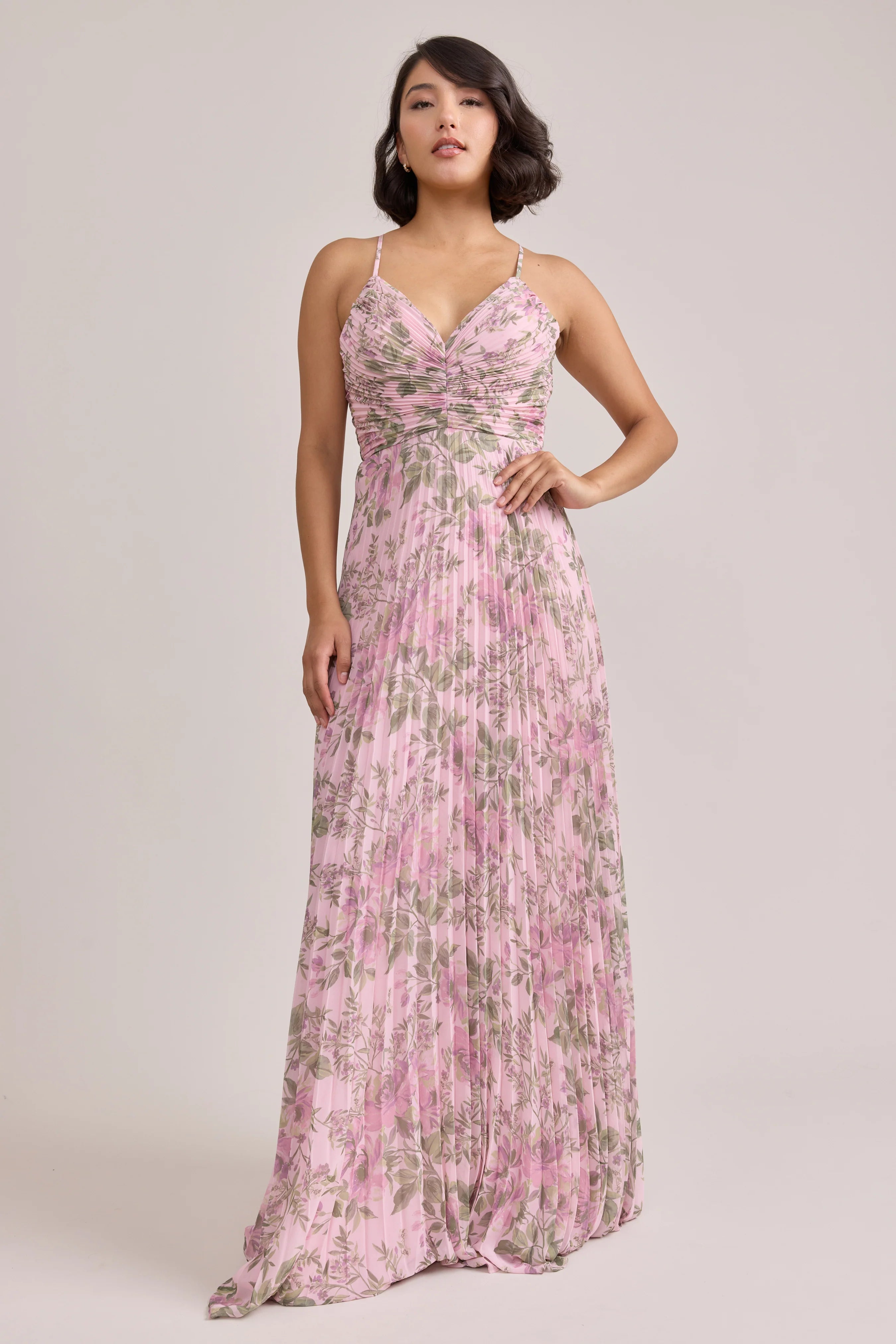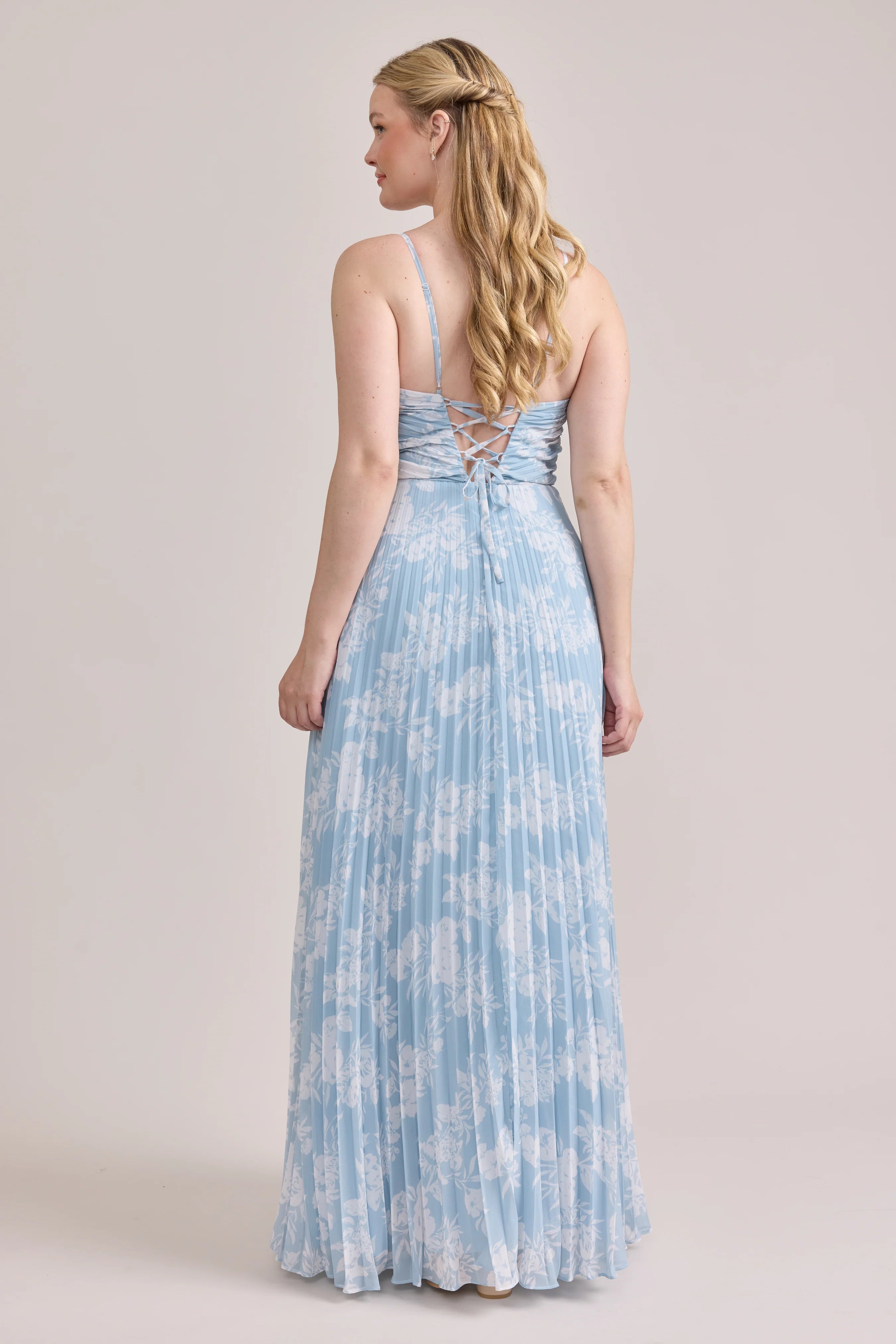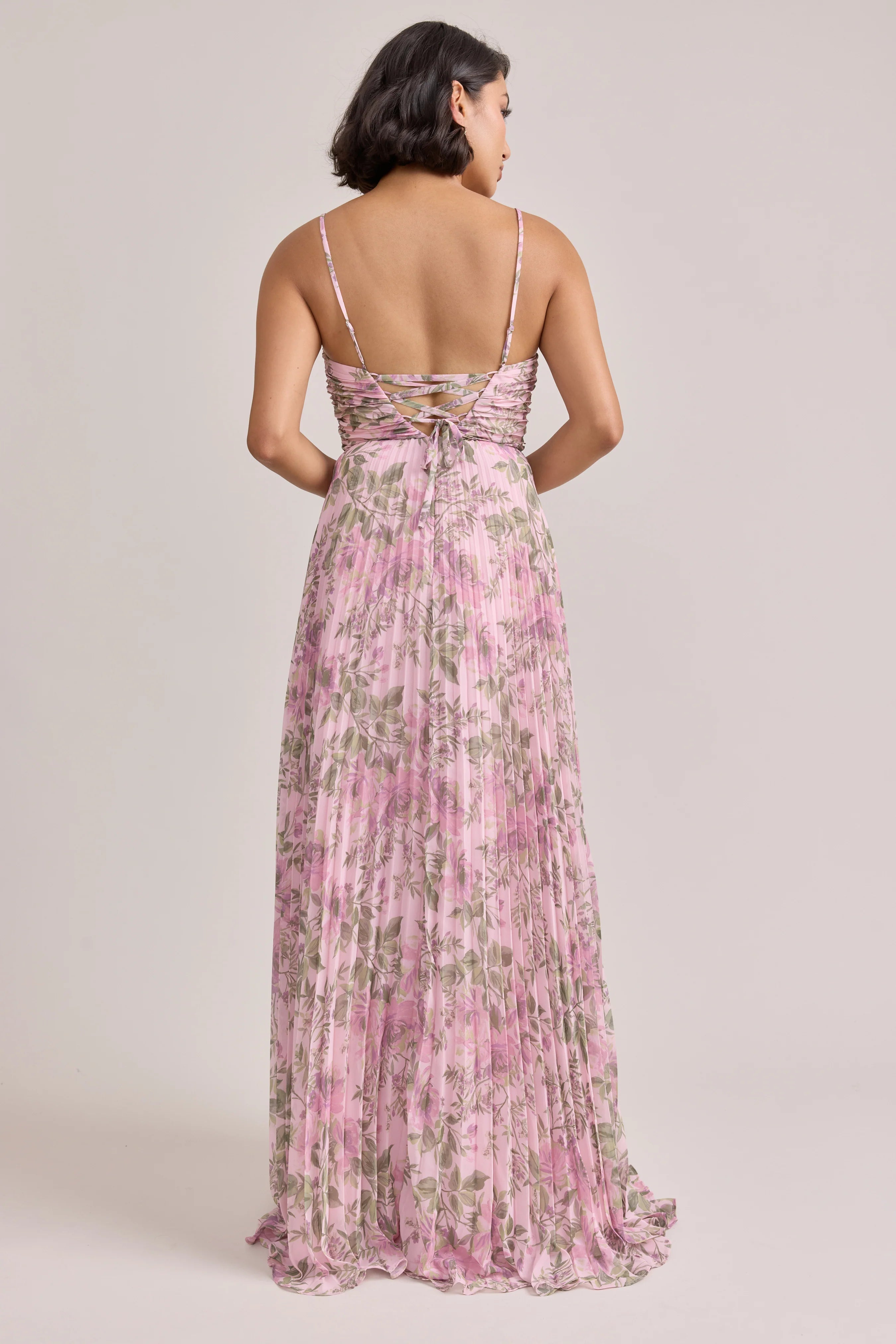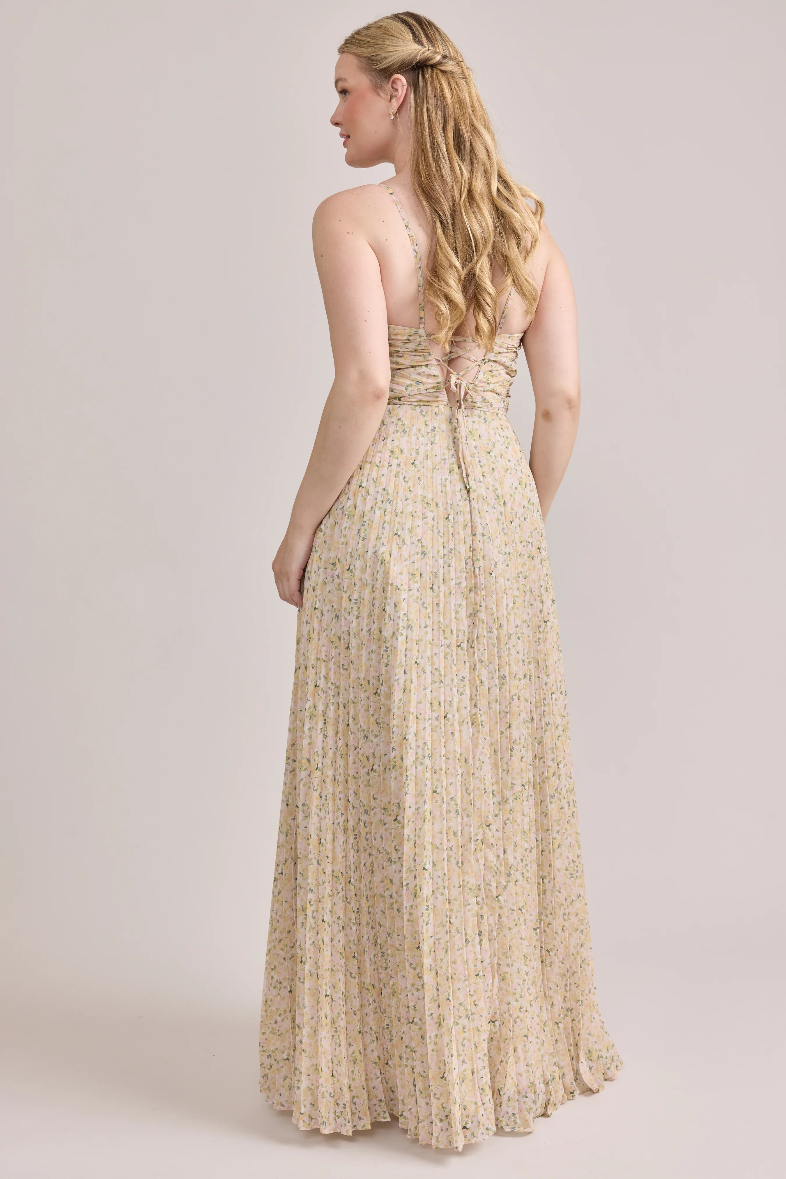Our bestselling Ellapink Satin Dress, reimagined in Chiffon! Her pleated butterfly-esc bodice offers both great support and nostalgic vibes, sitting at an empire waistline, her vertical chiffon pleats flow down for a flowy and comfortable fit. Interior boning, dainty adjustable straps and a lace-up back allow for added support and flexibility.