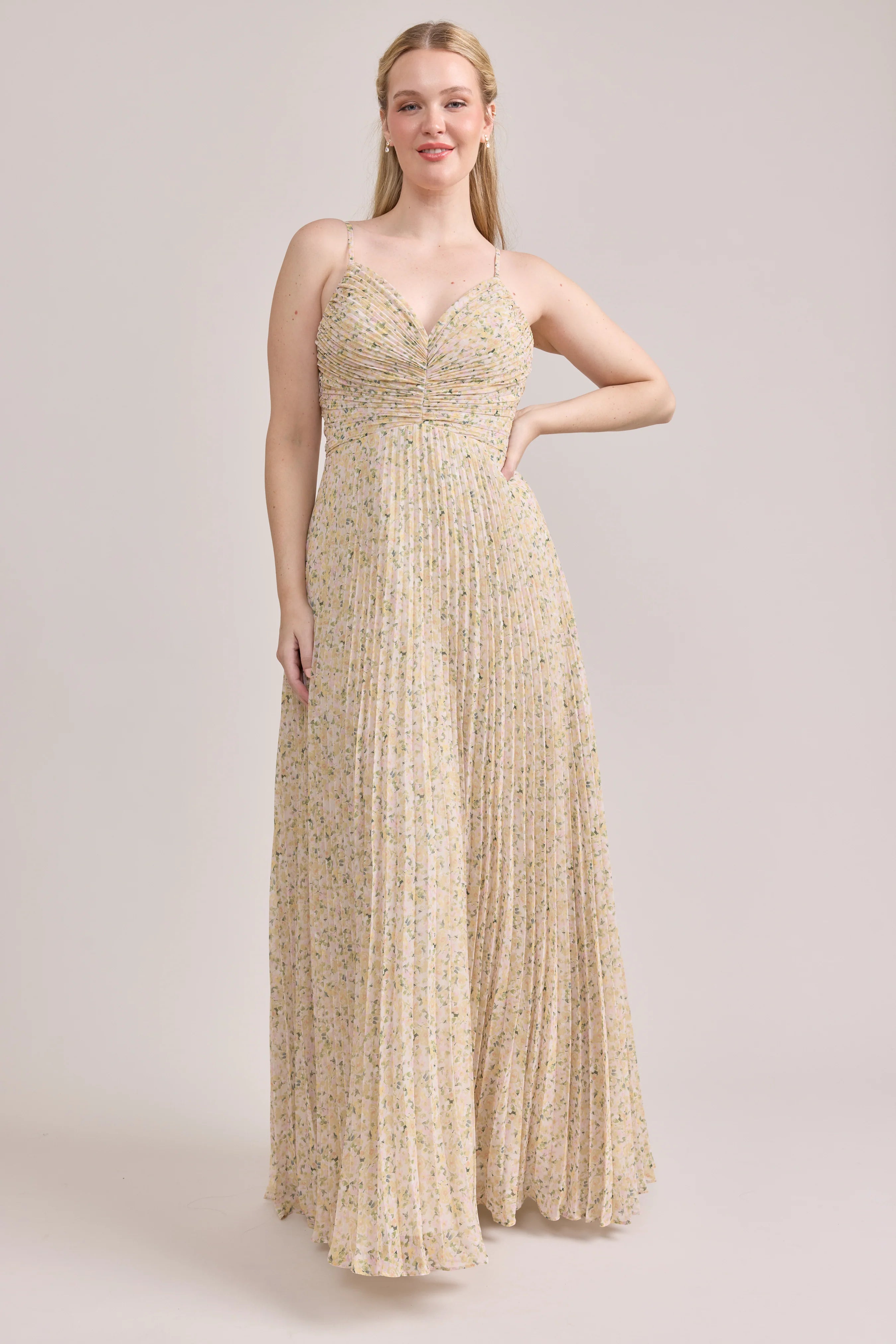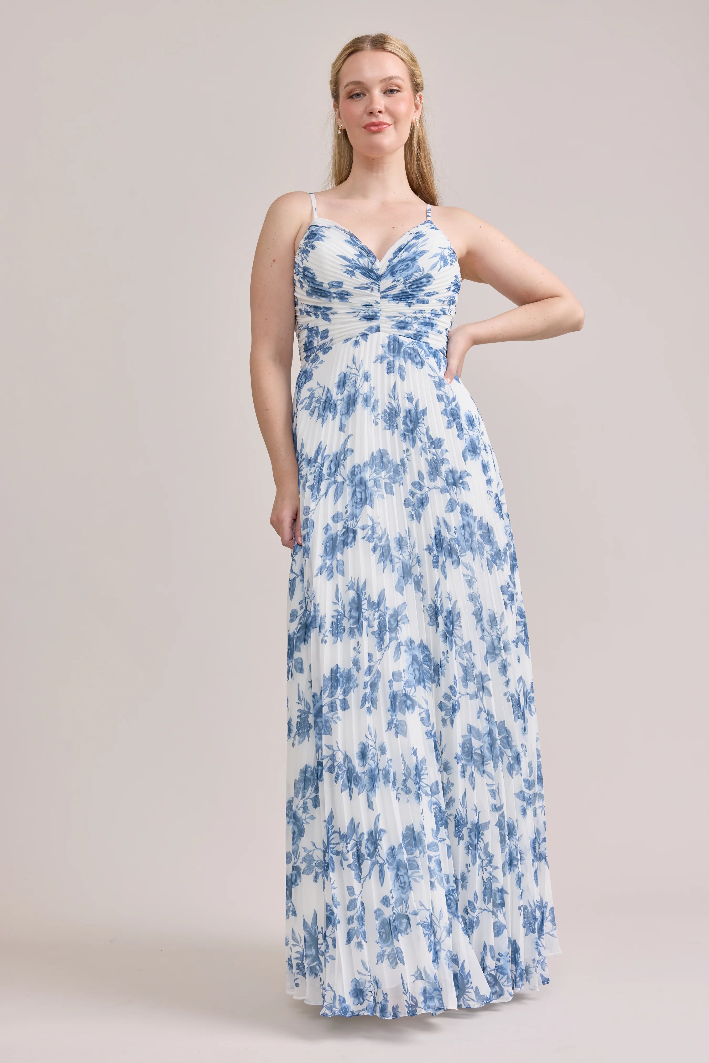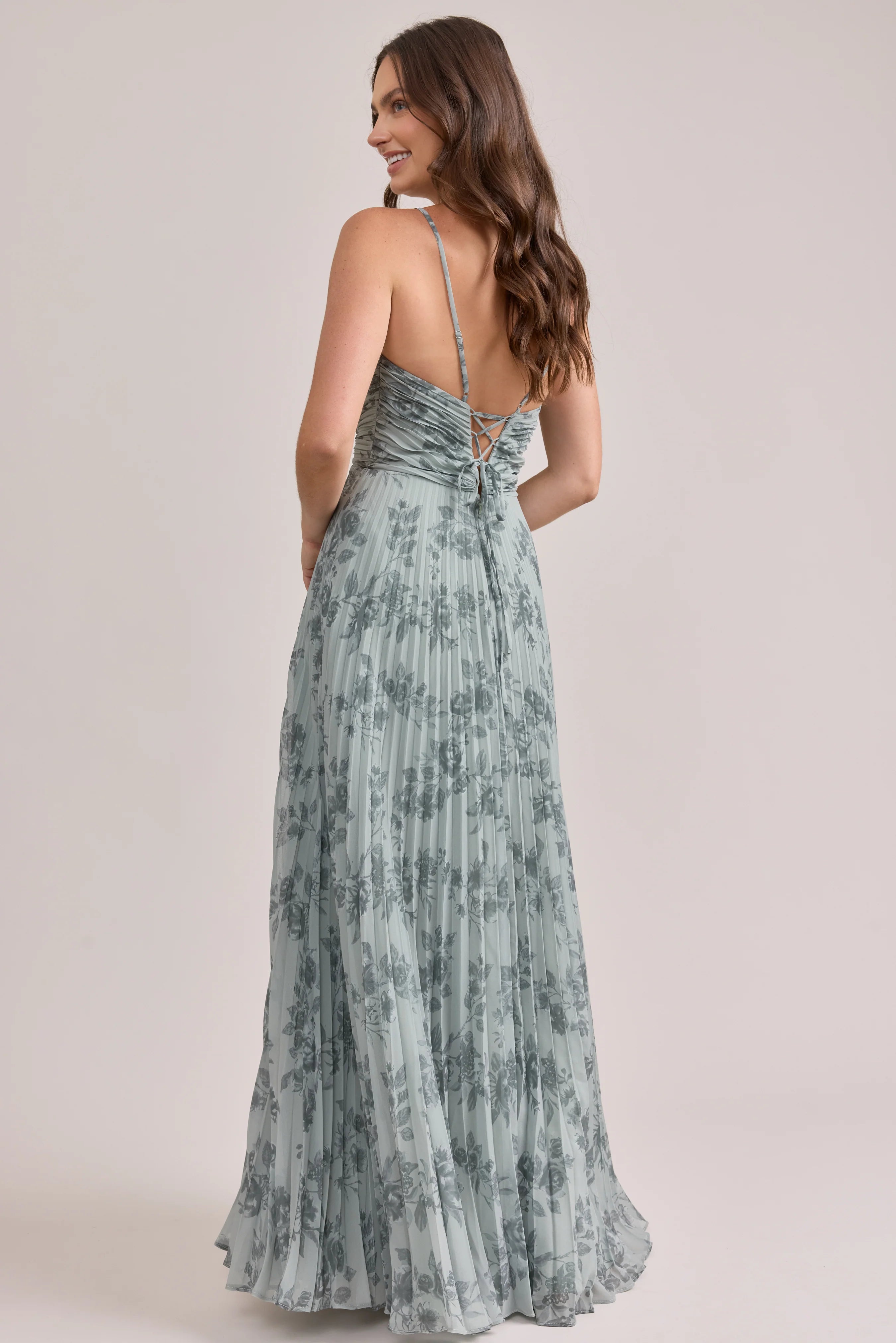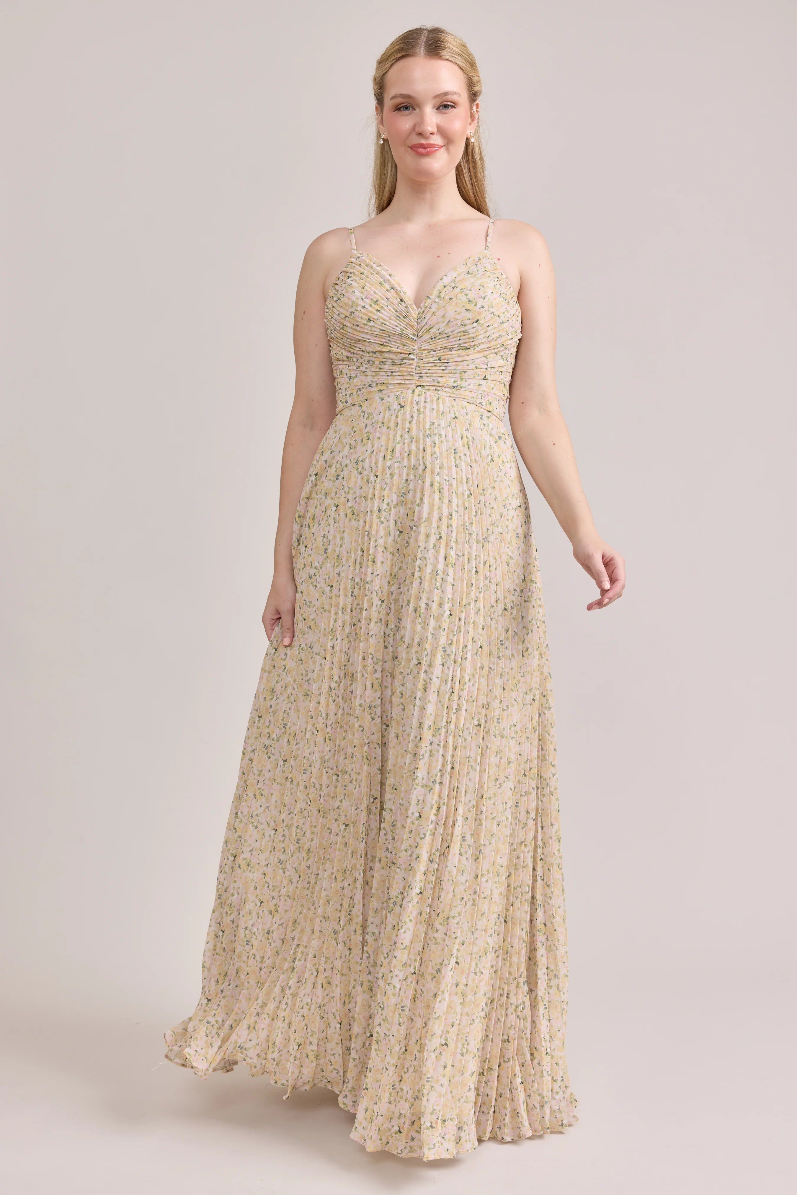 Our bestselling Ellapink Satin Dress, reimagined in Chiffon! Her pleated butterfly-esc bodice offers both great support and nostalgic vibes, sitting at an empire waistline, her vertical chiffon pleats flow down for a flowy and comfortable fit. Interior boning, dainty adjustable straps and a lace-up back allow for added support and flexibility.