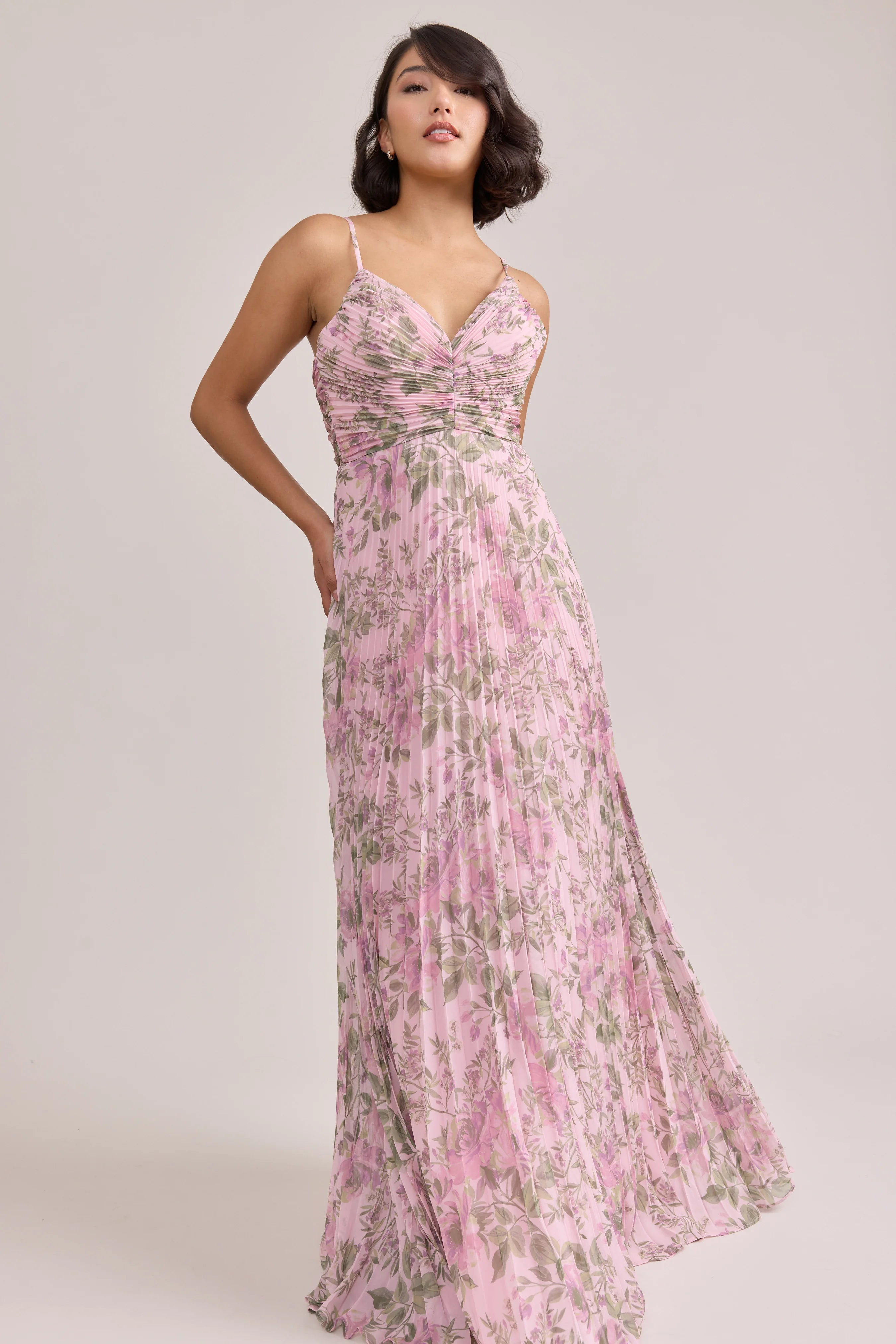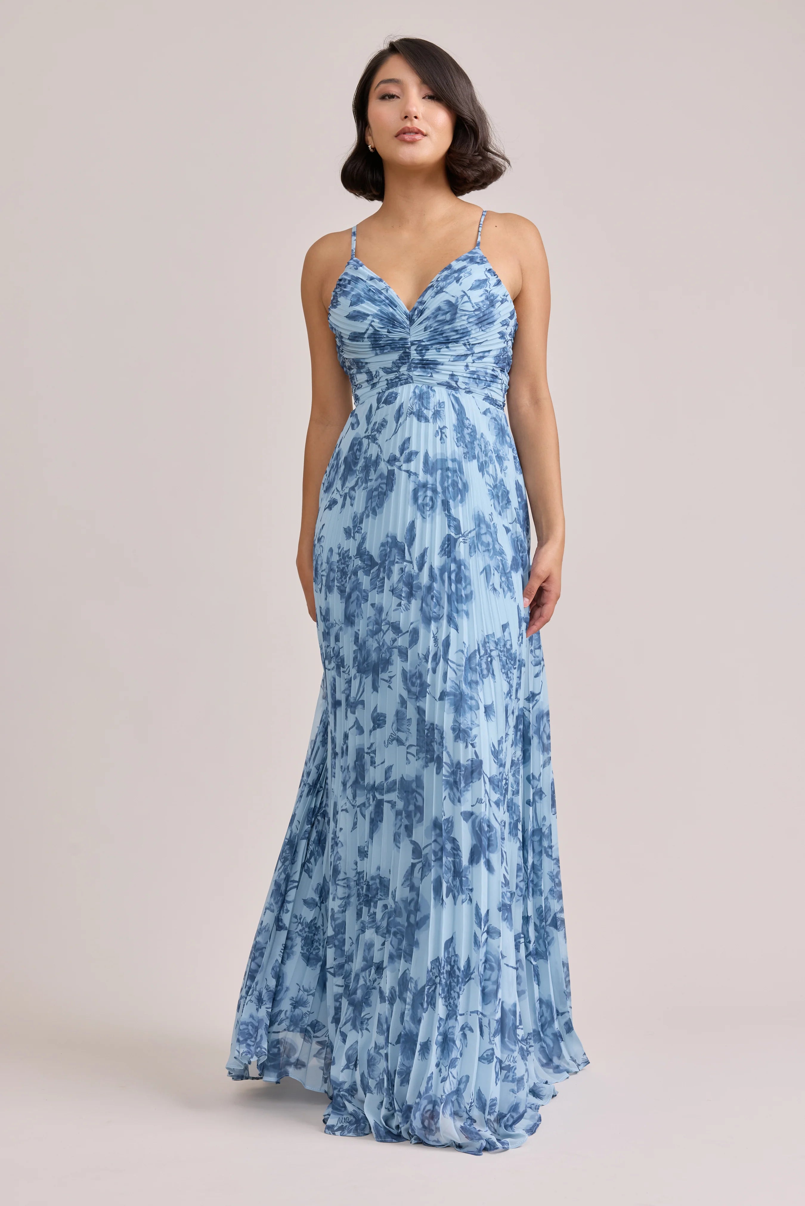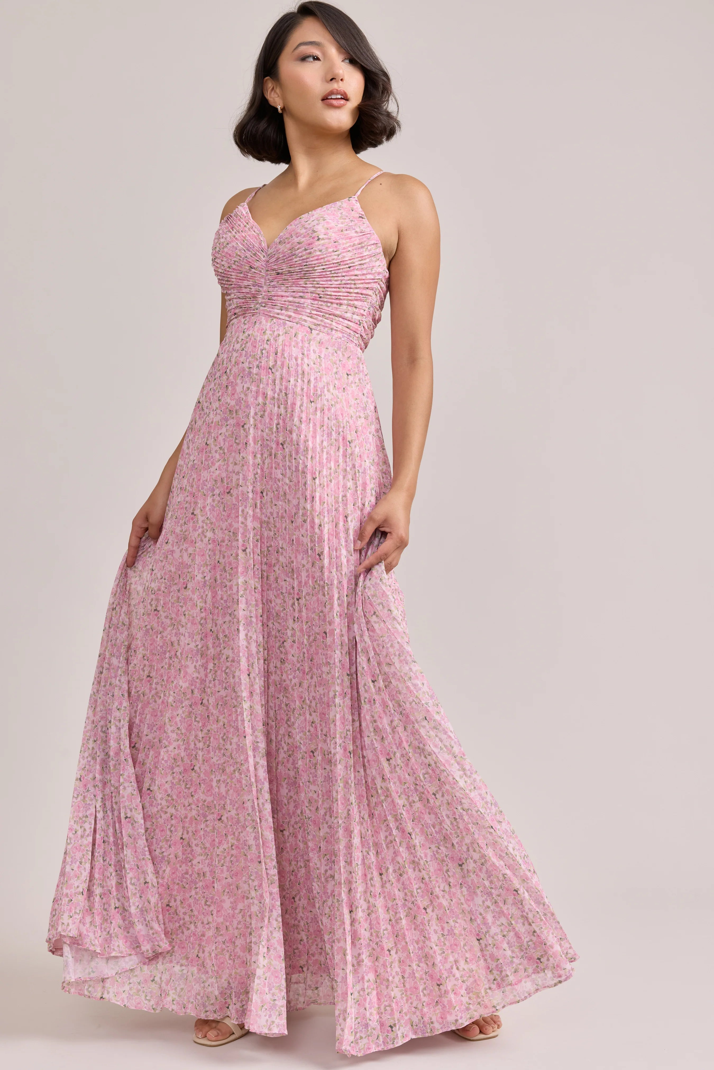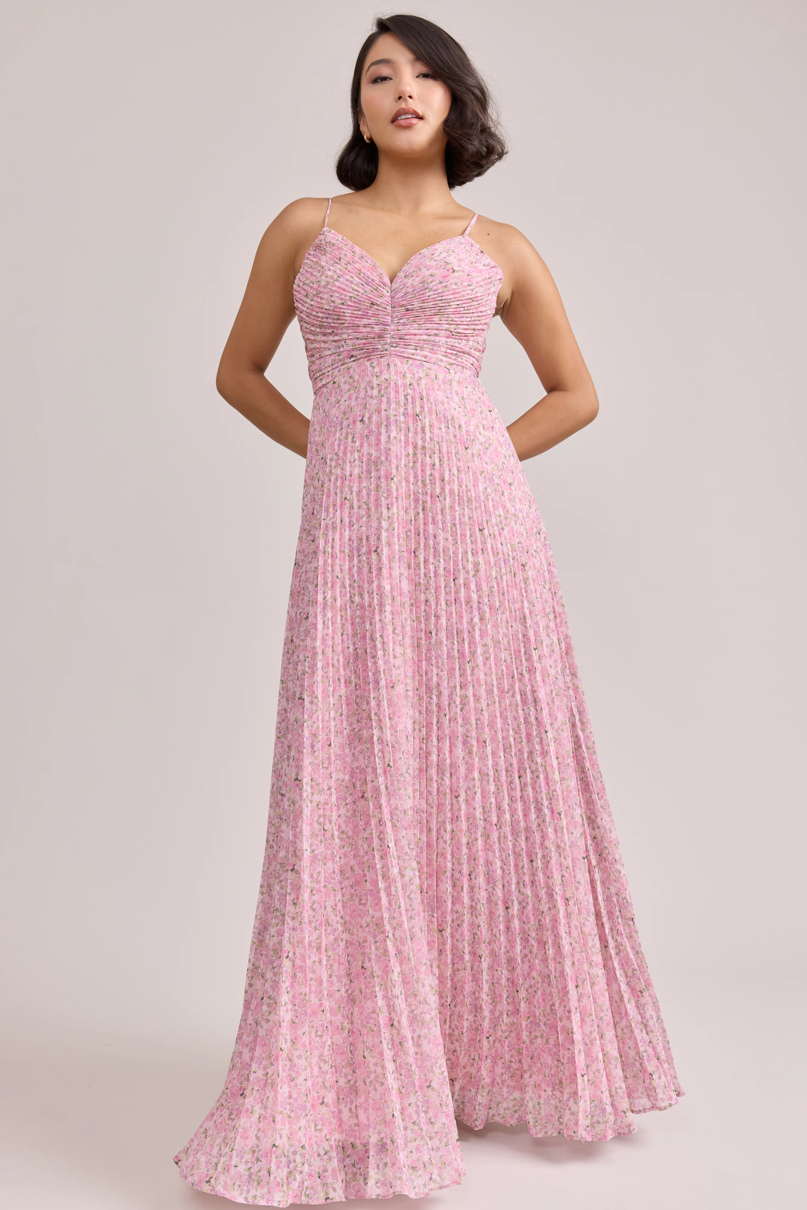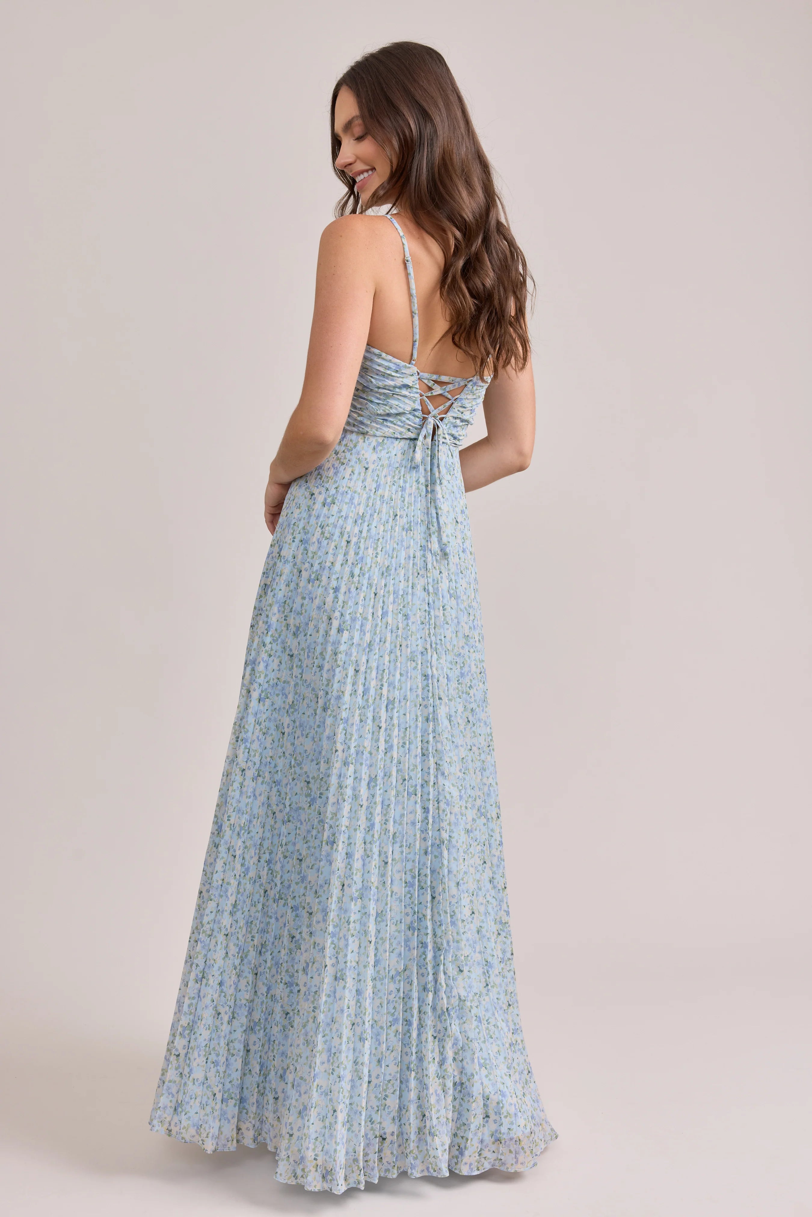 Our bestselling Ellapink Satin Dress, reimagined in Chiffon! Her pleated butterfly-esc bodice offers both great support and nostalgic vibes, sitting at an empire waistline, her vertical chiffon pleats flow down for a flowy and comfortable fit. Interior boning, dainty adjustable straps and a lace-up back allow for added support and flexibility.