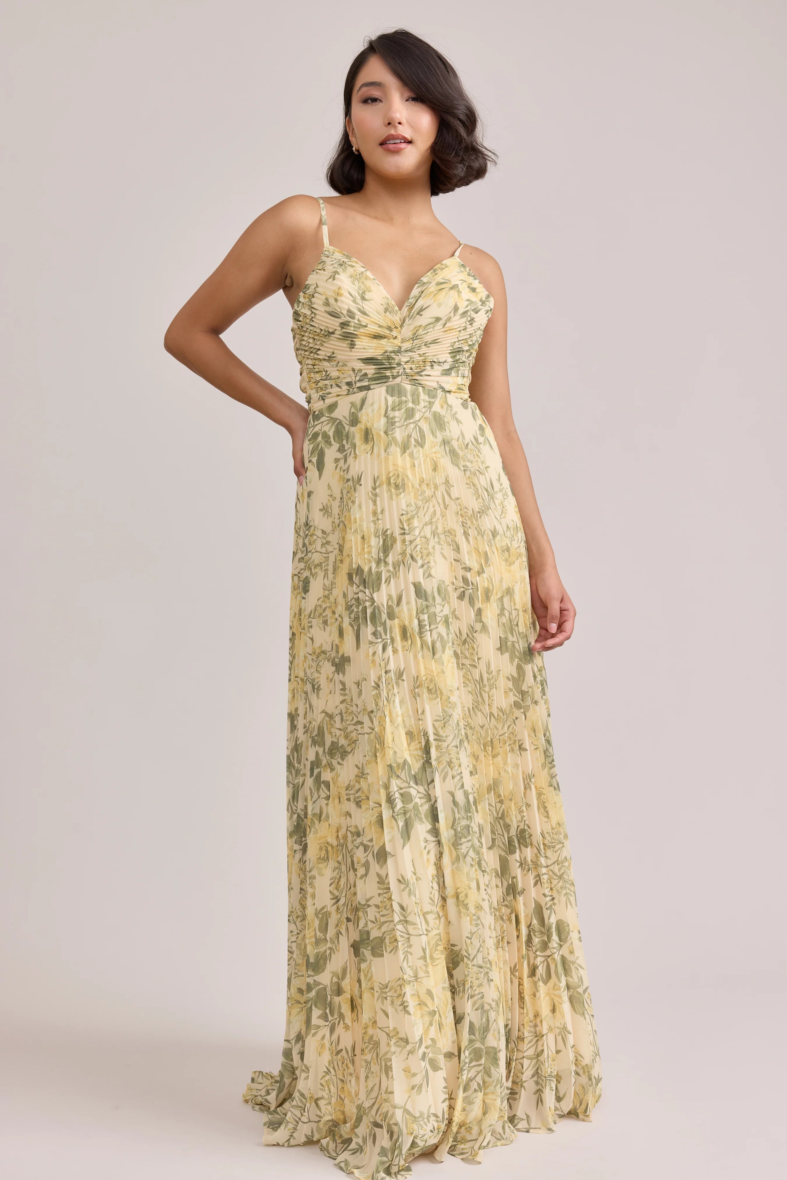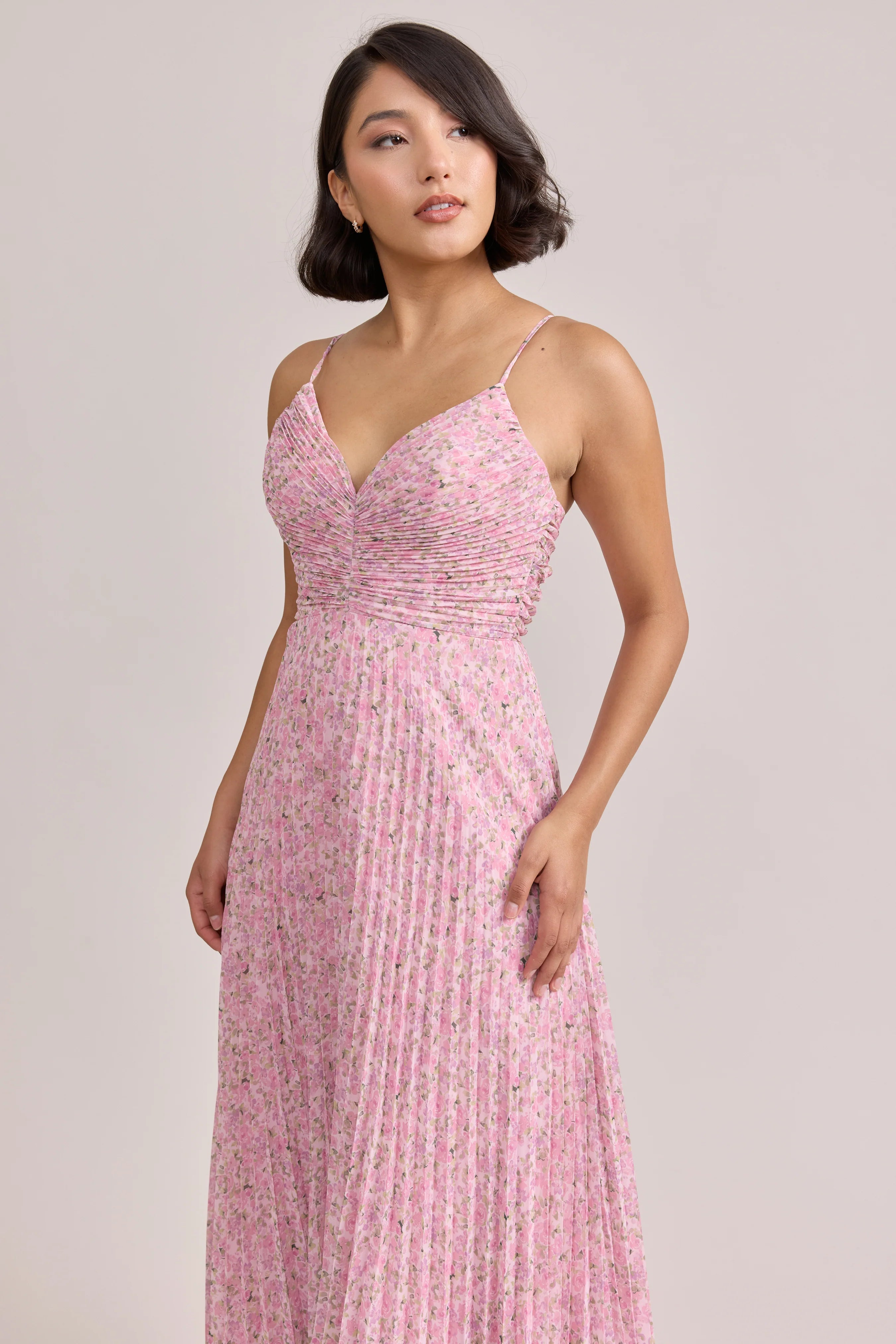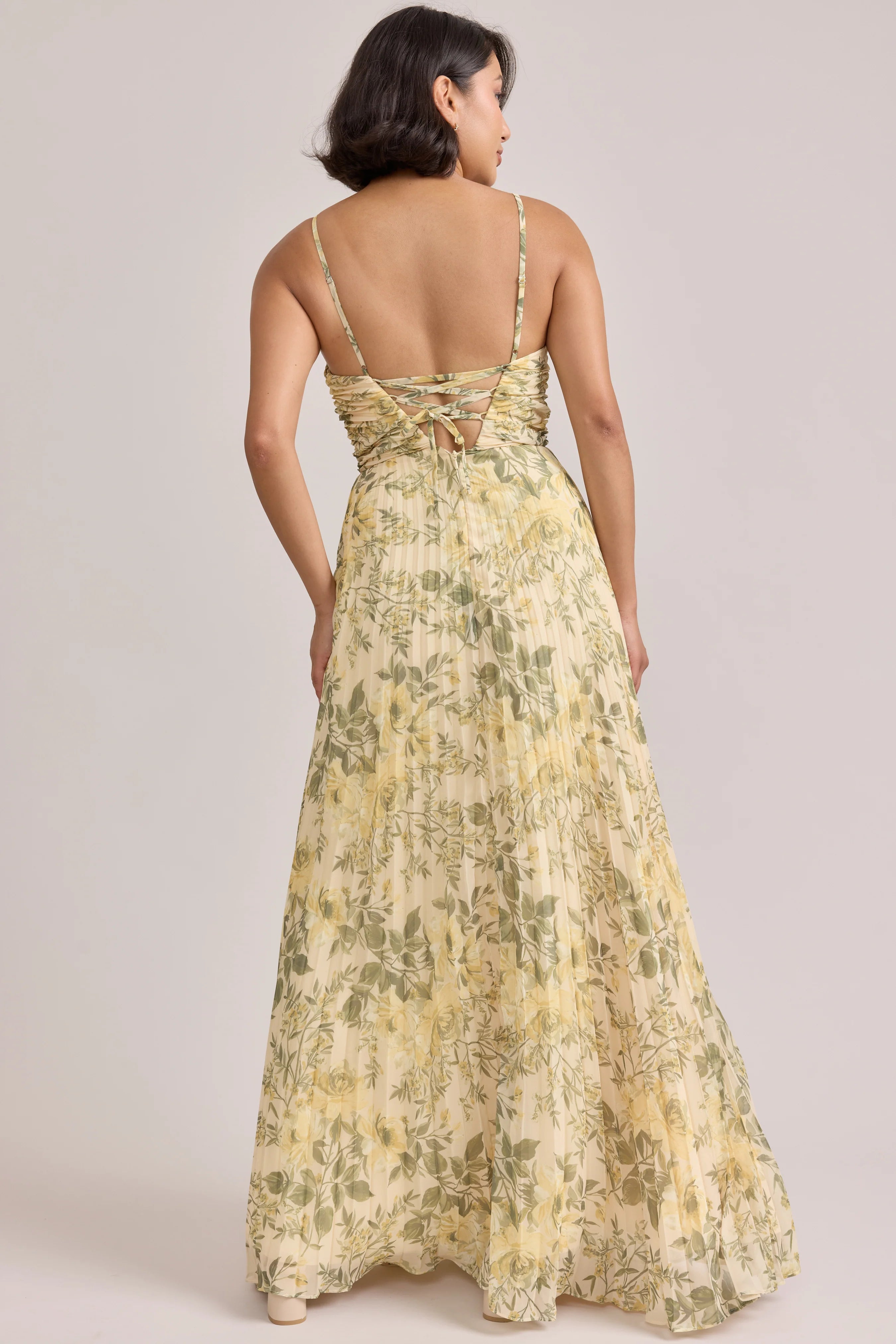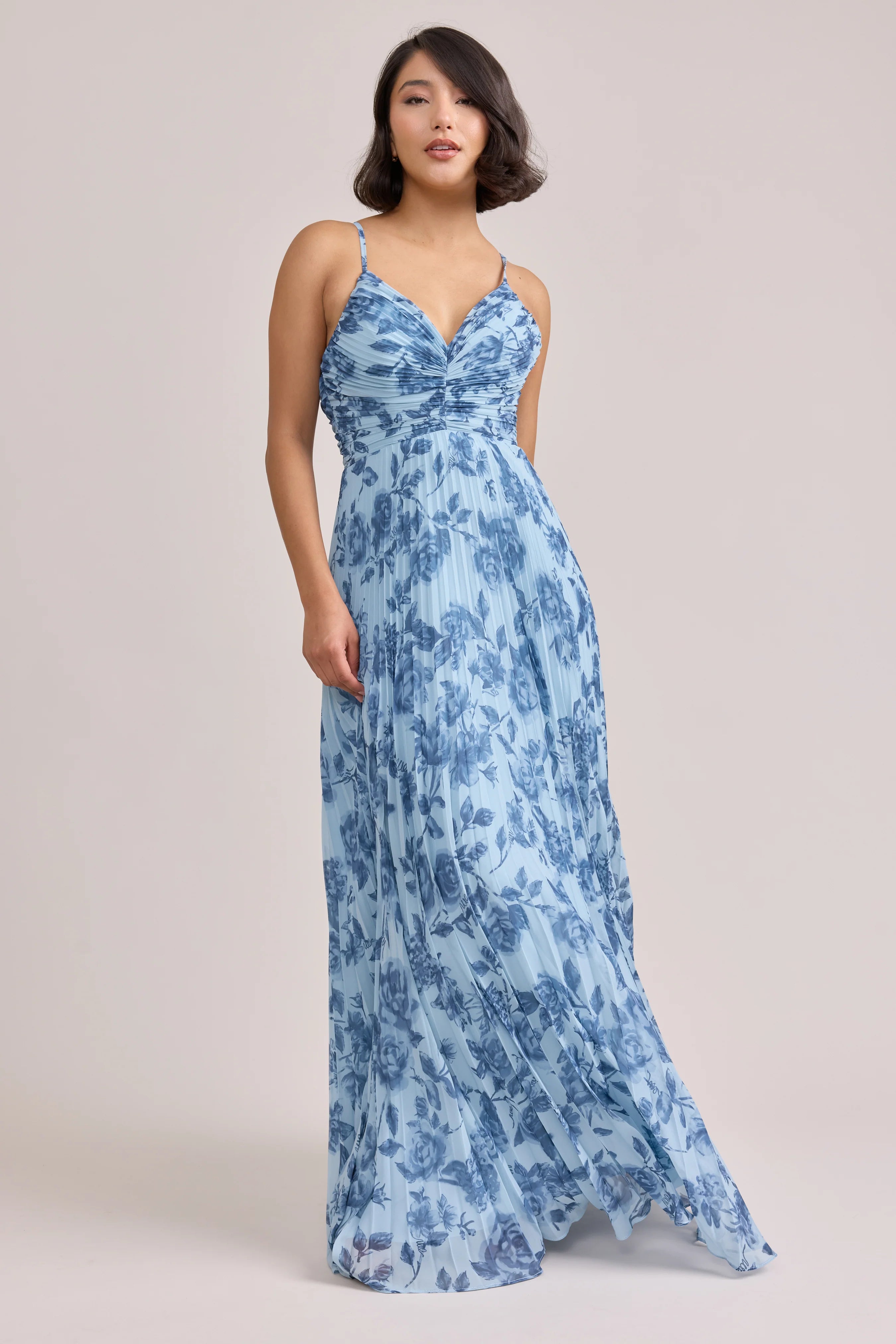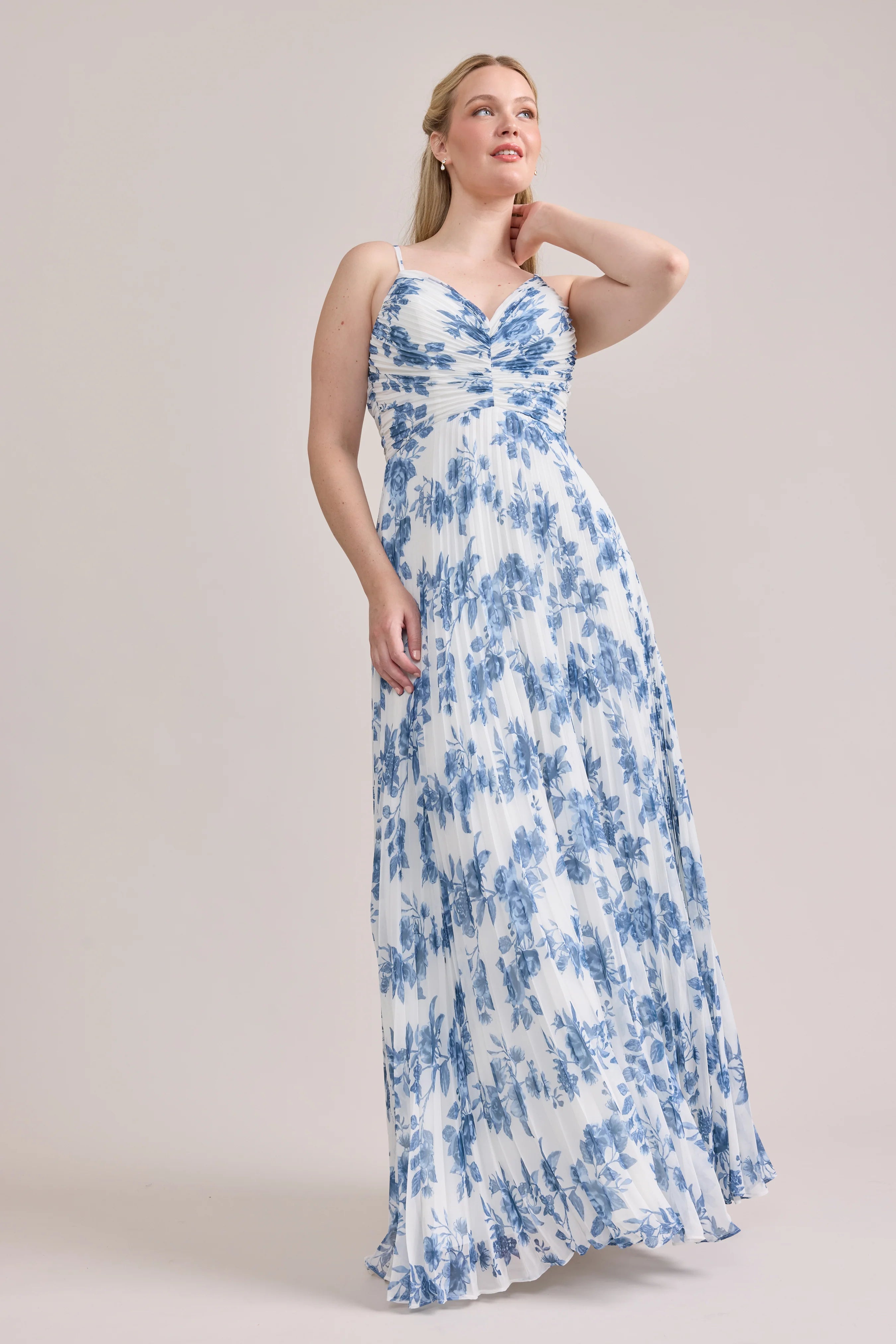 Our bestselling Ellapink Satin Dress, reimagined in Chiffon! Her pleated butterfly-esc bodice offers both great support and nostalgic vibes, sitting at an empire waistline, her vertical chiffon pleats flow down for a flowy and comfortable fit. Interior boning, dainty adjustable straps and a lace-up back allow for added support and flexibility.