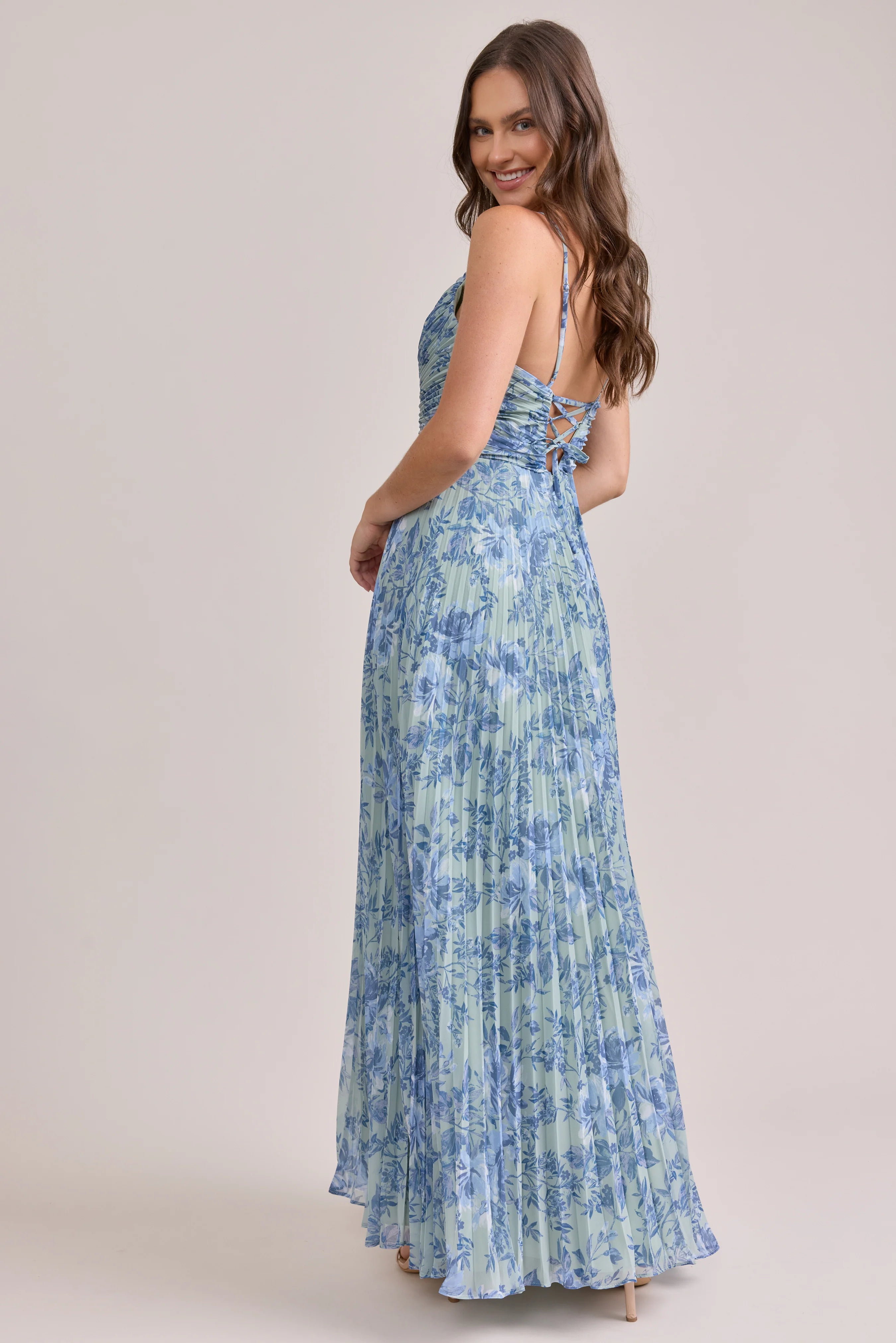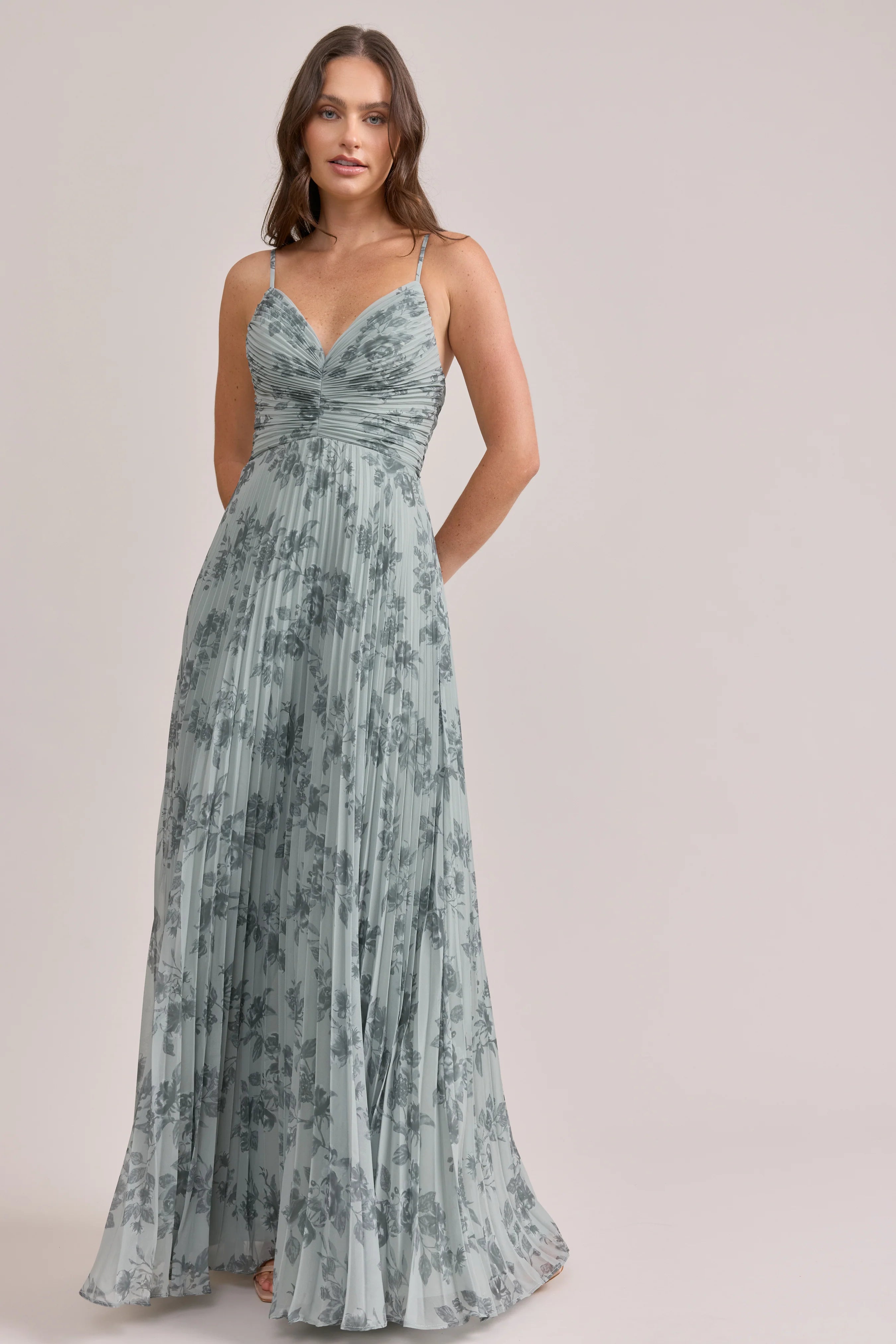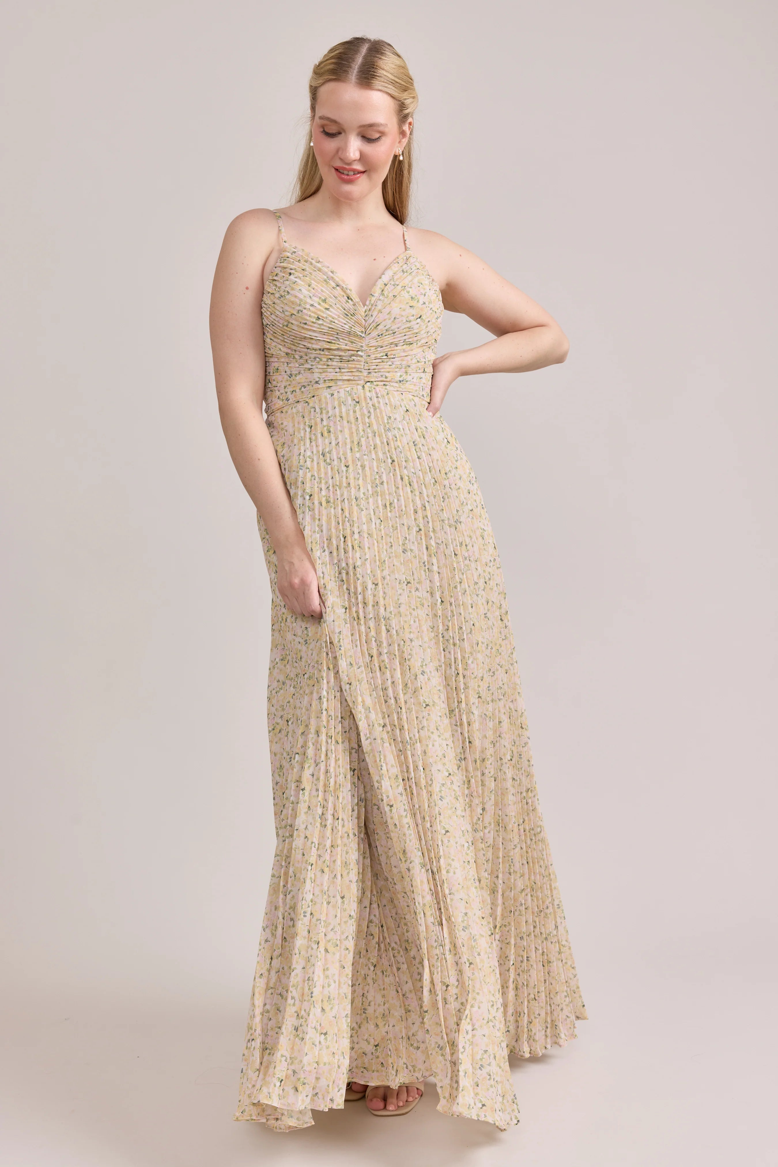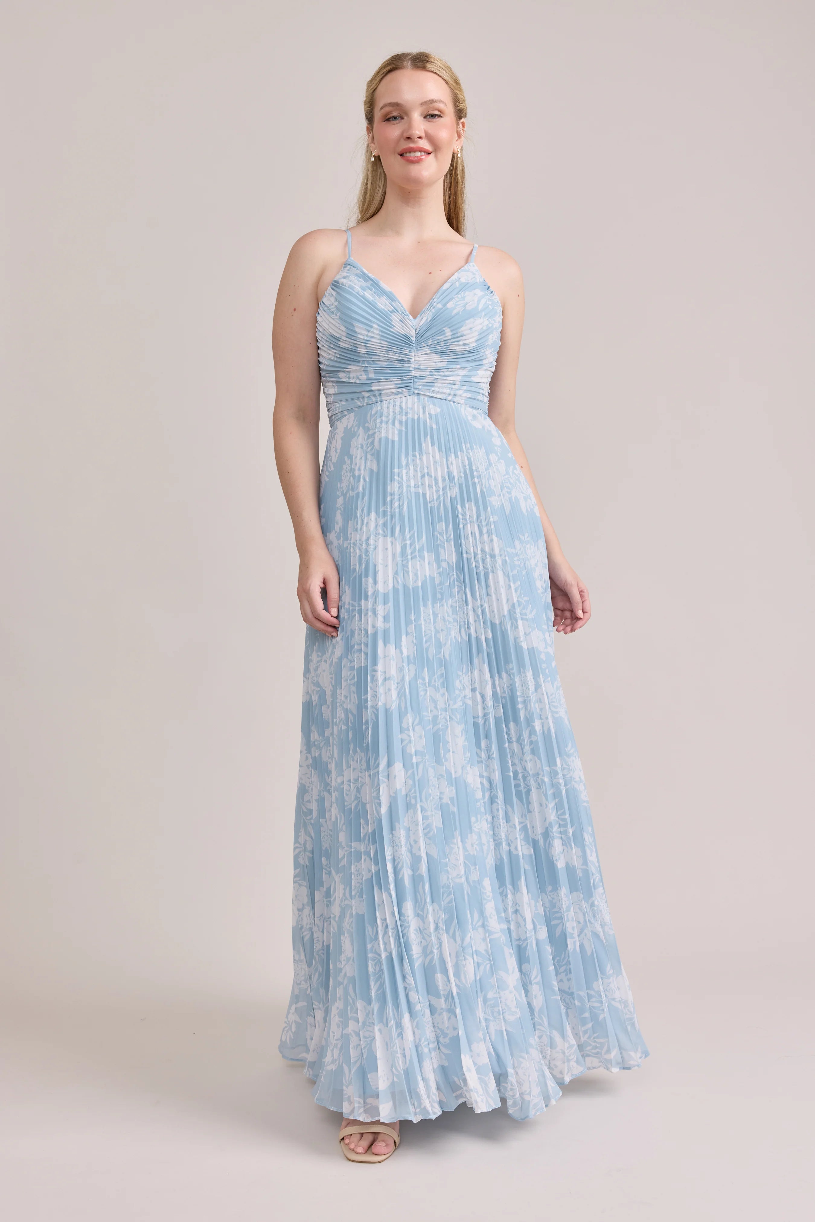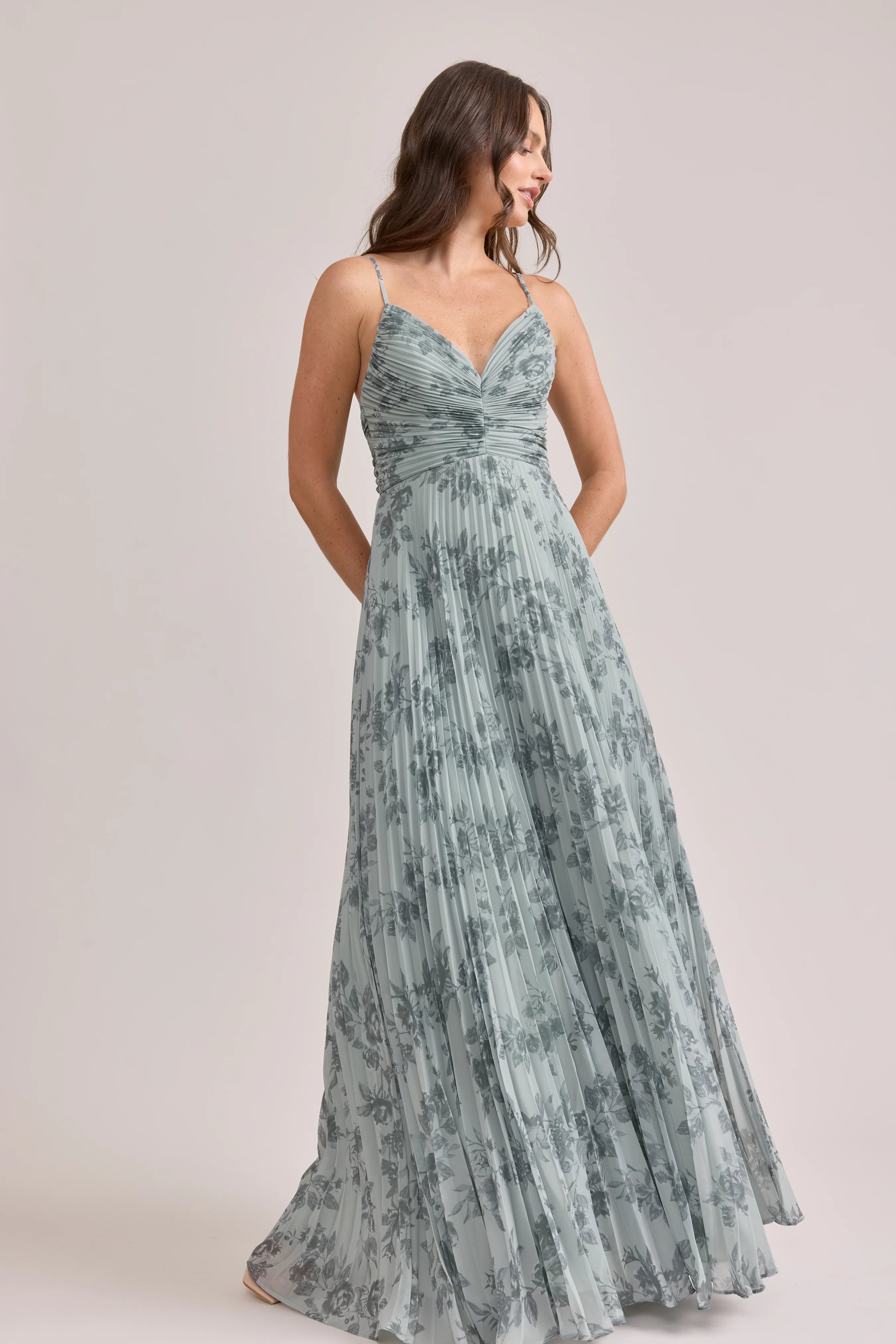Our bestselling Ellapink Satin Dress, reimagined in Chiffon! Her pleated butterfly-esc bodice offers both great support and nostalgic vibes, sitting at an empire waistline, her vertical chiffon pleats flow down for a flowy and comfortable fit. Interior boning, dainty adjustable straps and a lace-up back allow for added support and flexibility.
