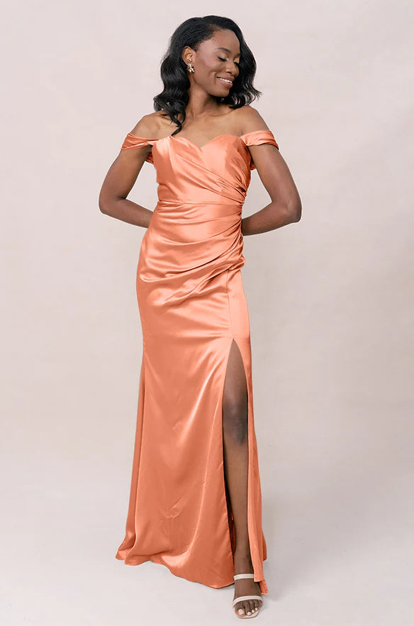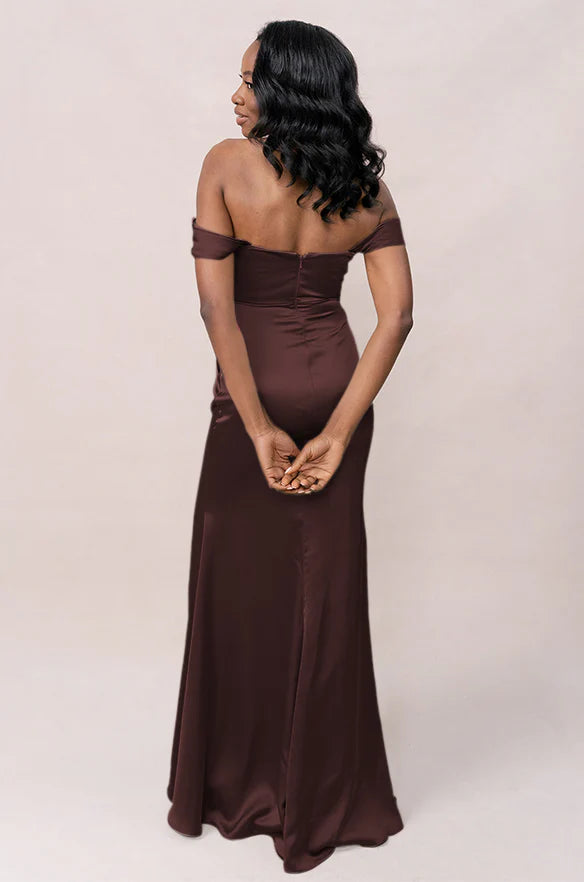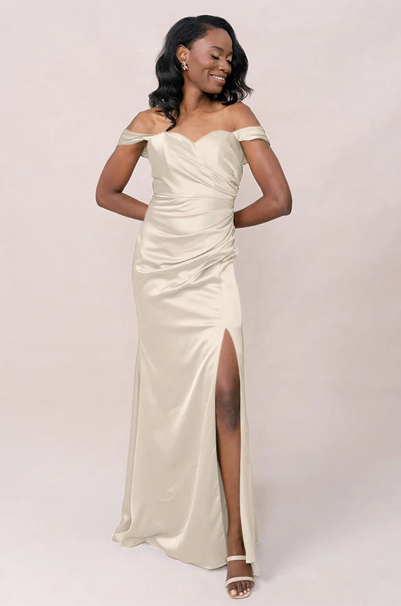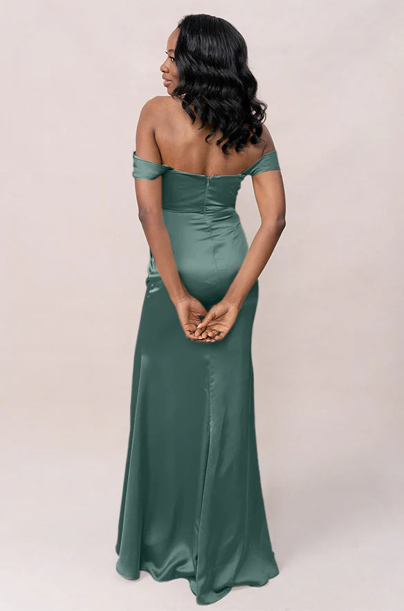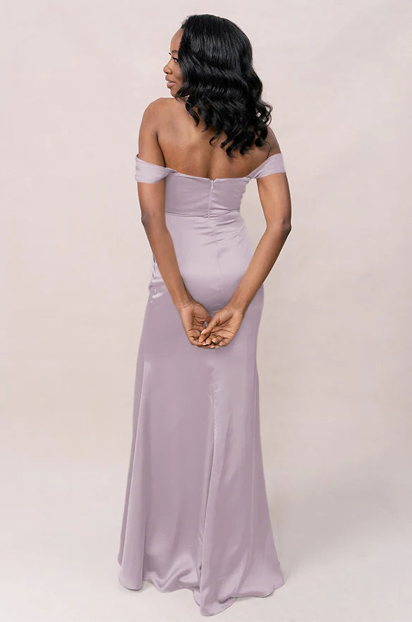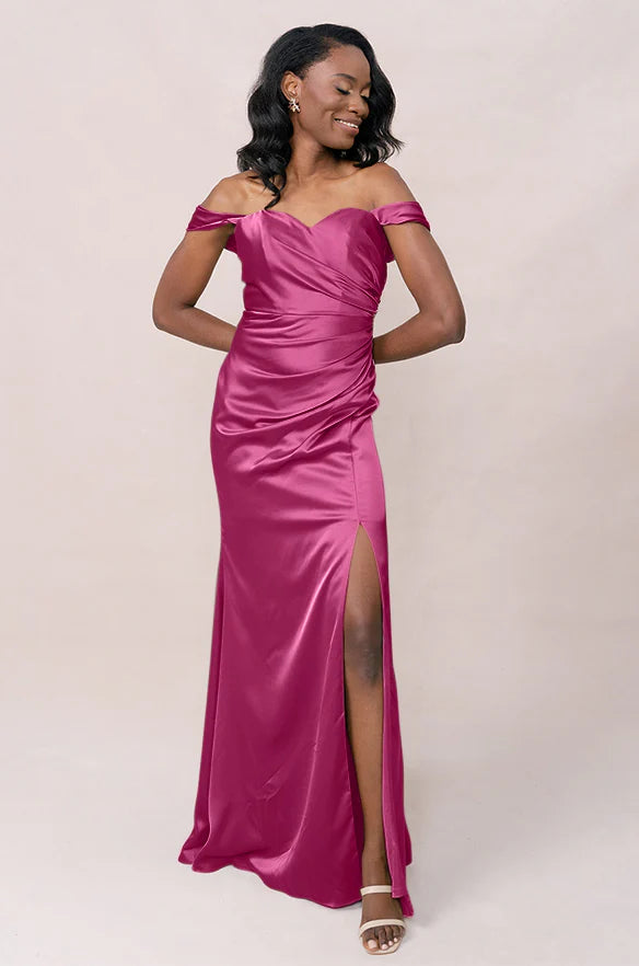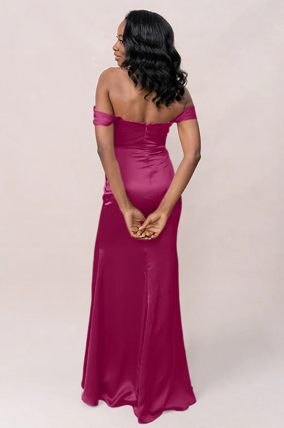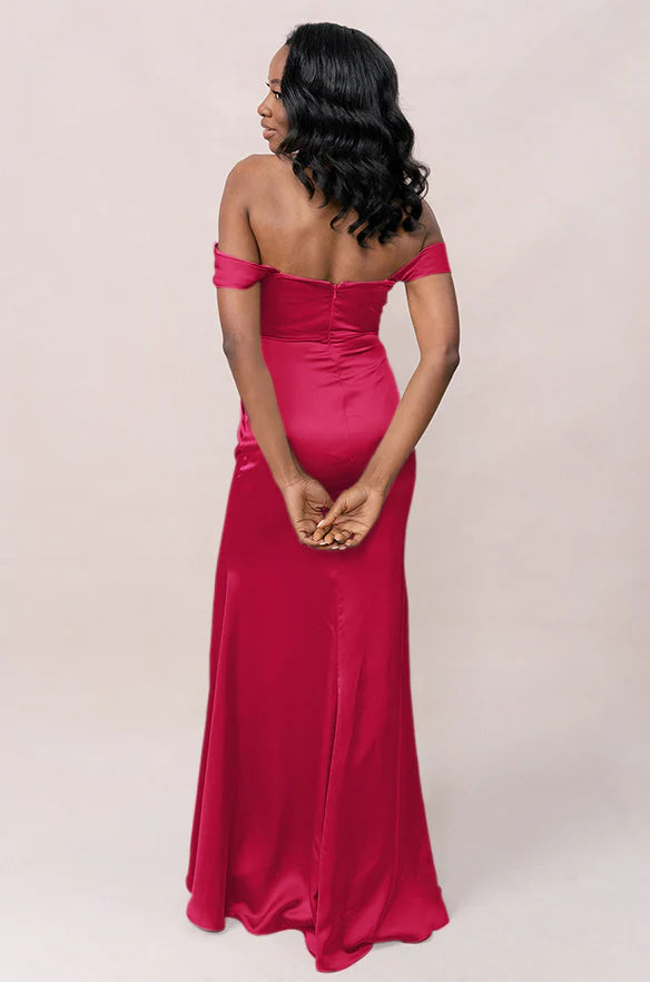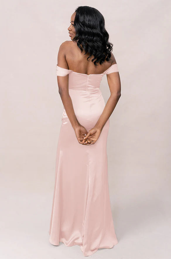 Our Ellapink Convertible Satin dress is a polished style for any bridesmaid that wants to transform their look from day to night! This dress features detachable off-the-shoulder sleeves that snap on and off with small buttons on the inside bust of the dress letting the bridal party go from an elegant day look to dancing the night away in a strapless and flirty gown.