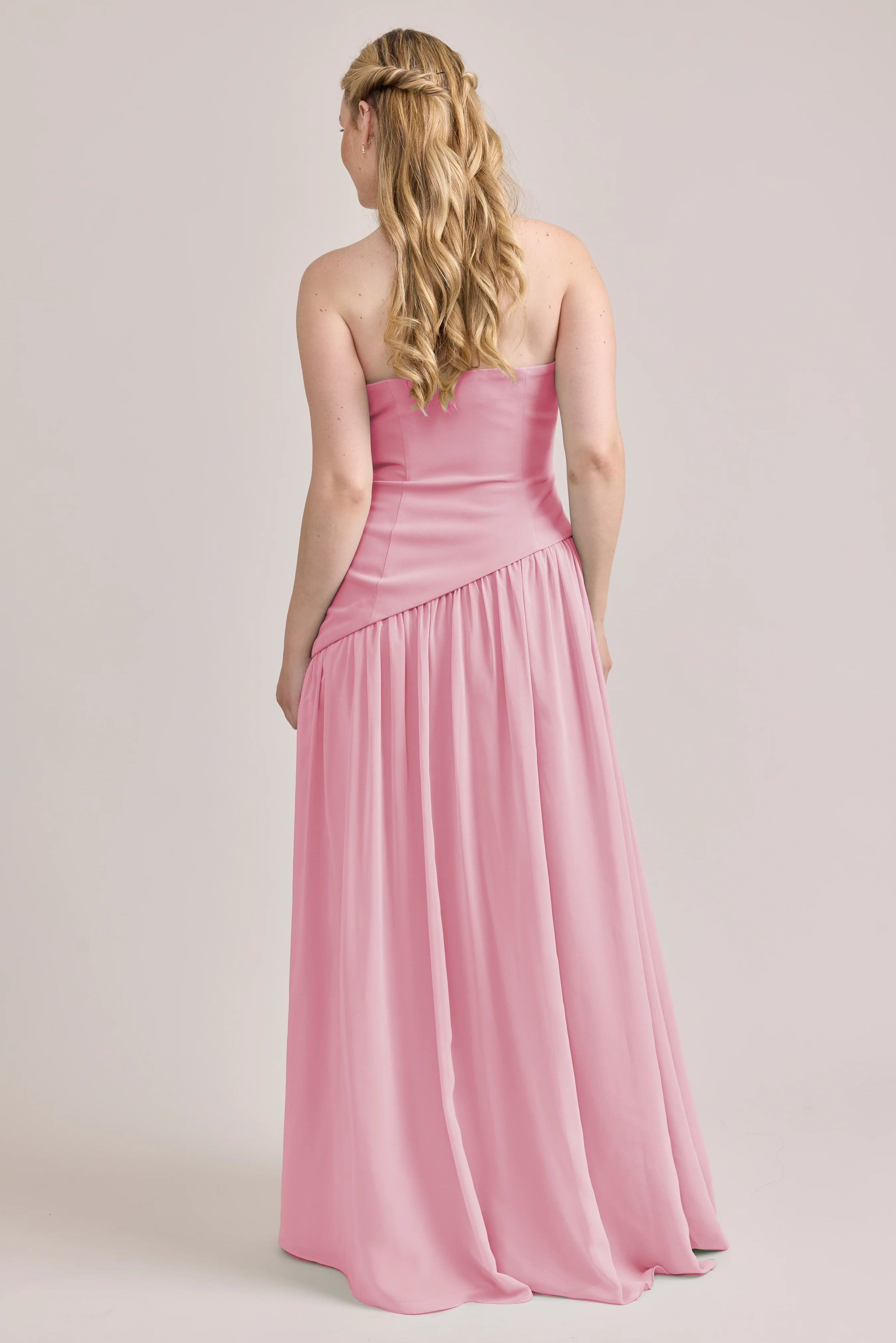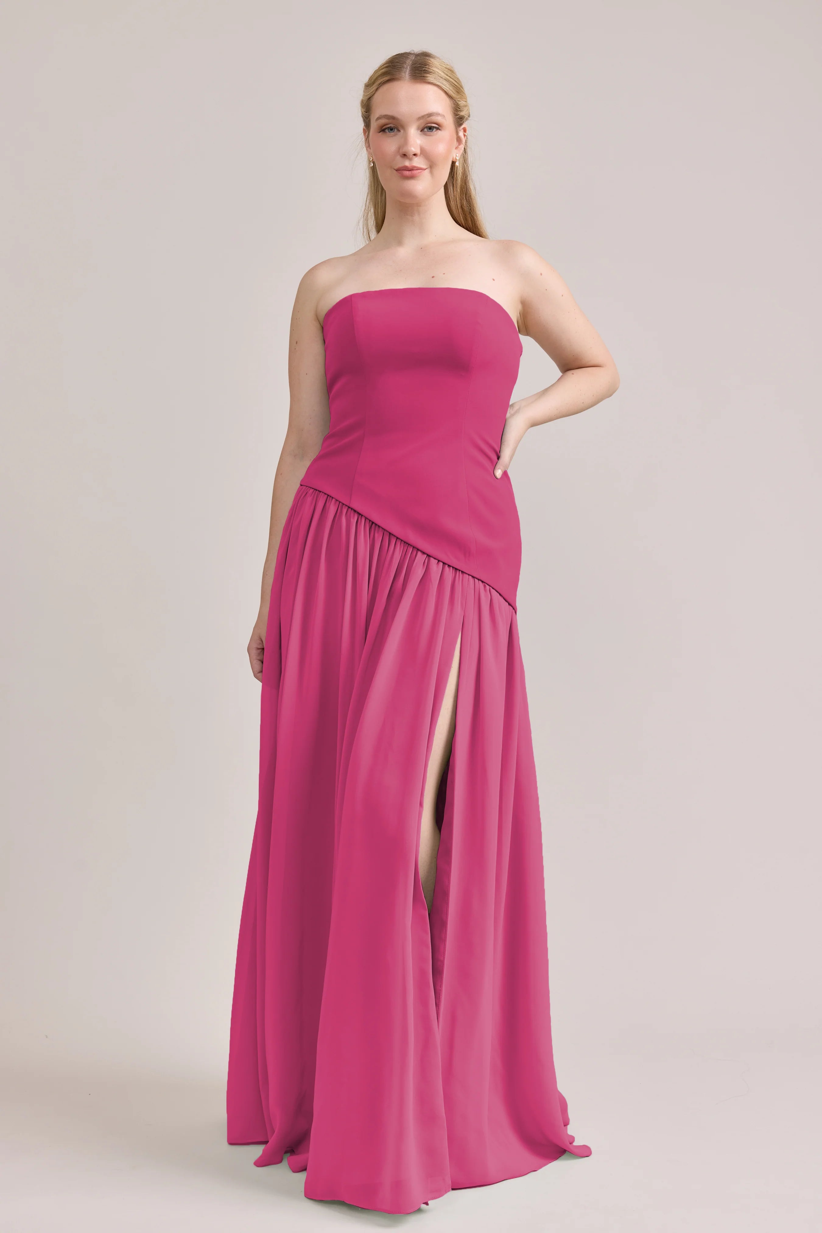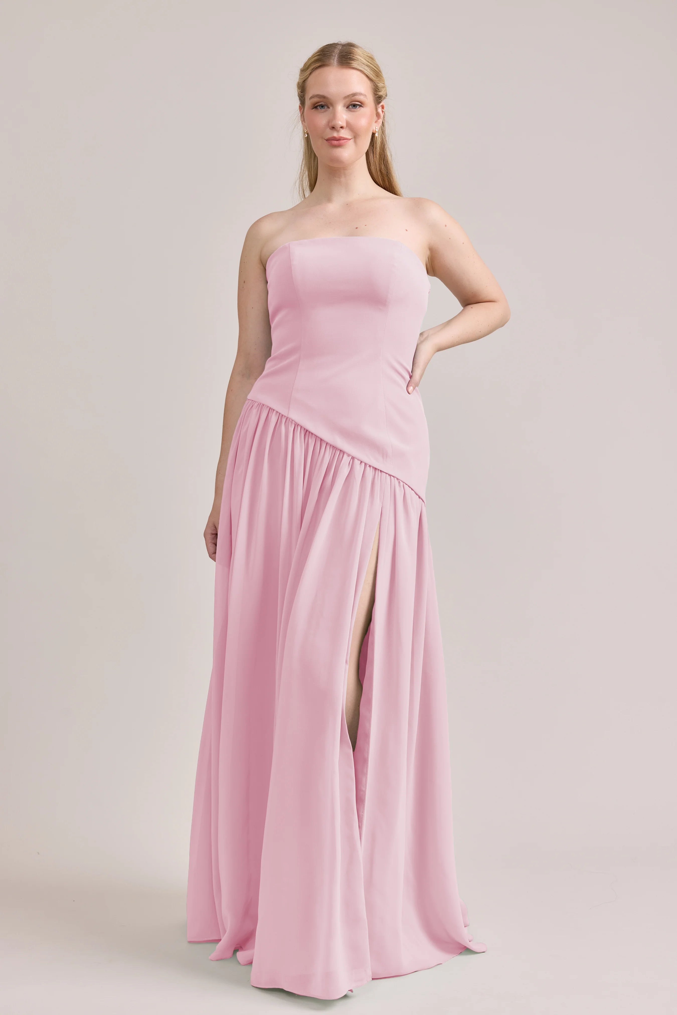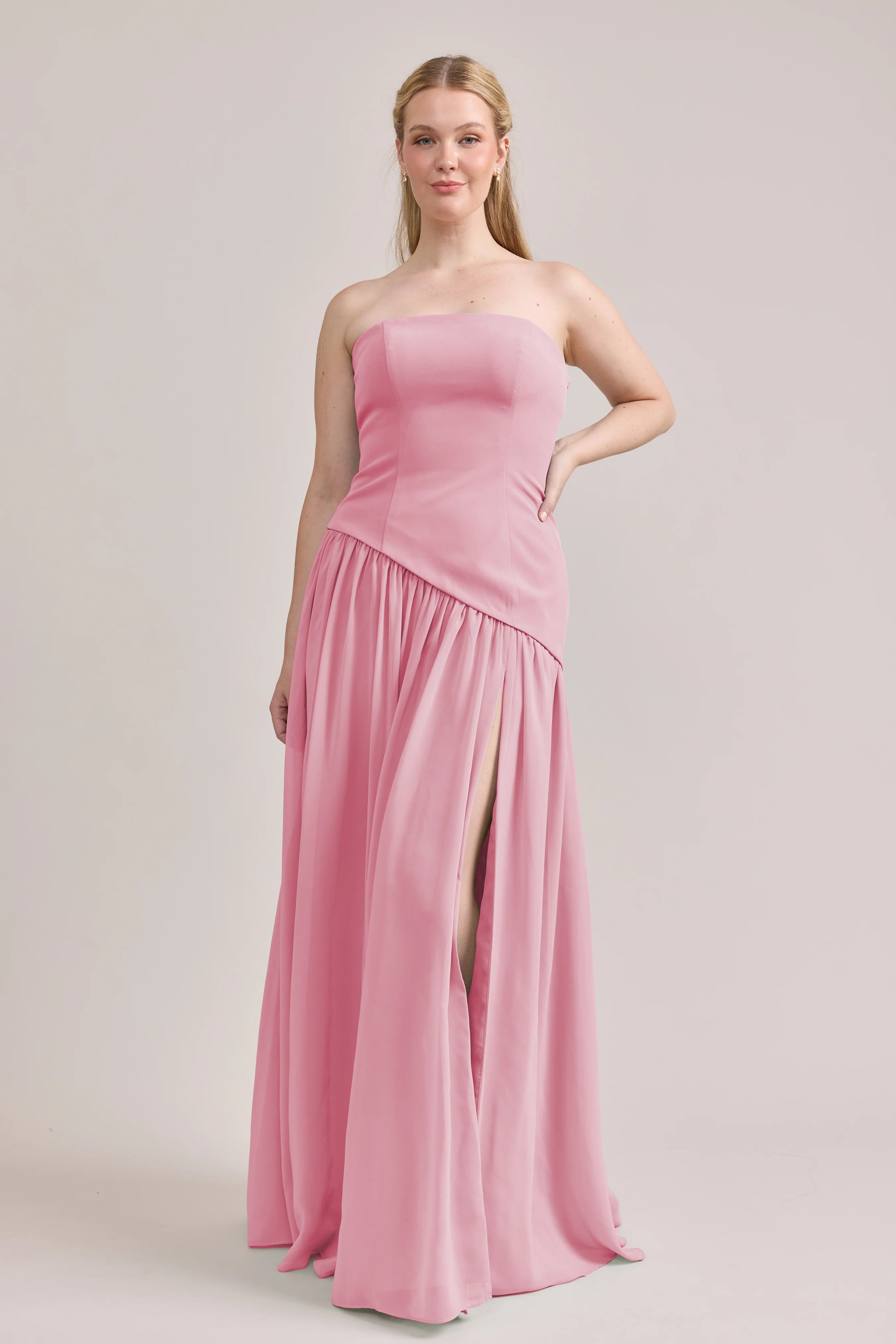 Ultra chic, ultra cool, our Ellapink Crepe + Chiffon dress is sure to get you compliments all night. She features a fitted, strapless Crepe bodice with an asymmetrical dropped waistline, and flowing chiffon skirt with a high front slit, keeping her light and airy while keeping you comfortable and supported.