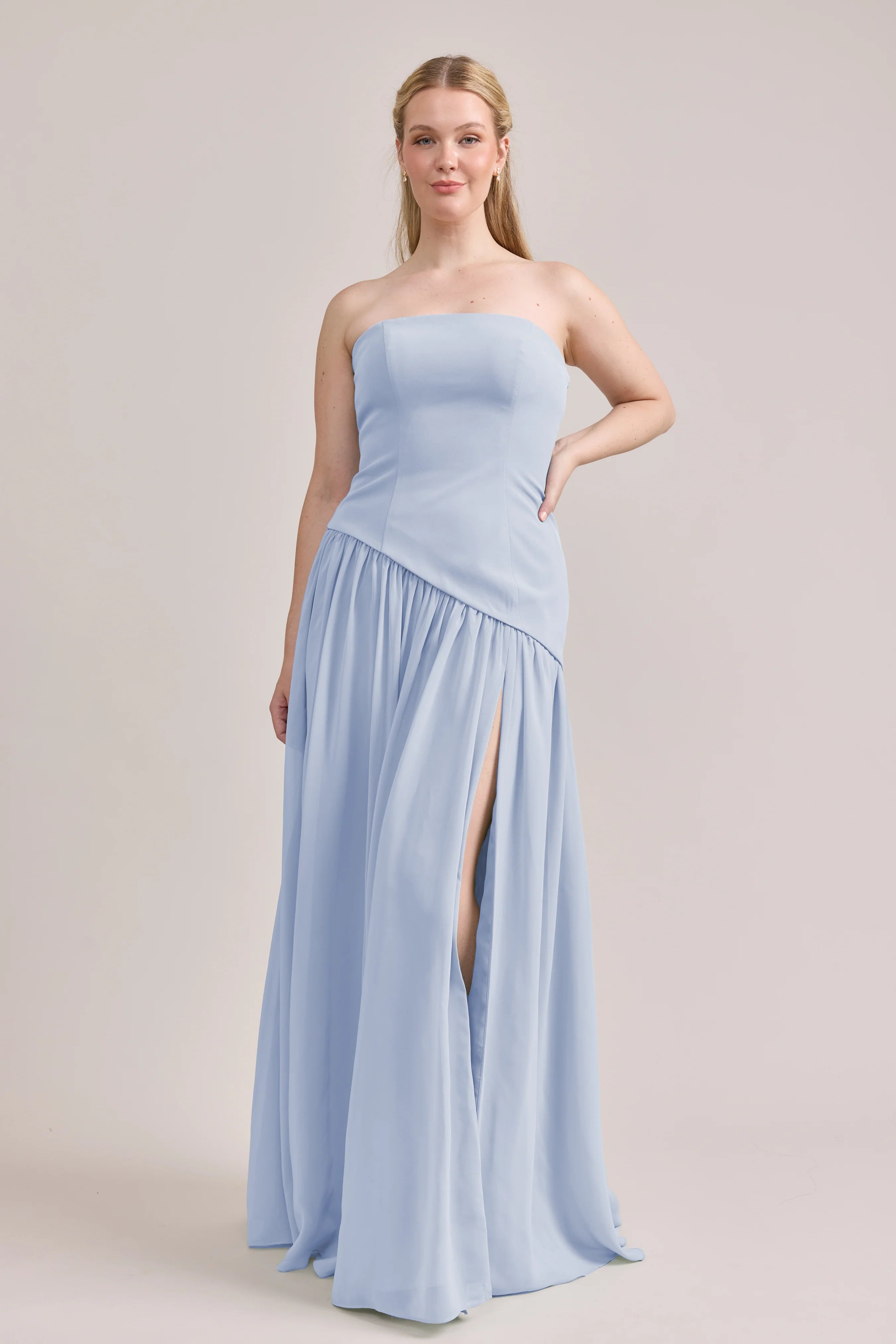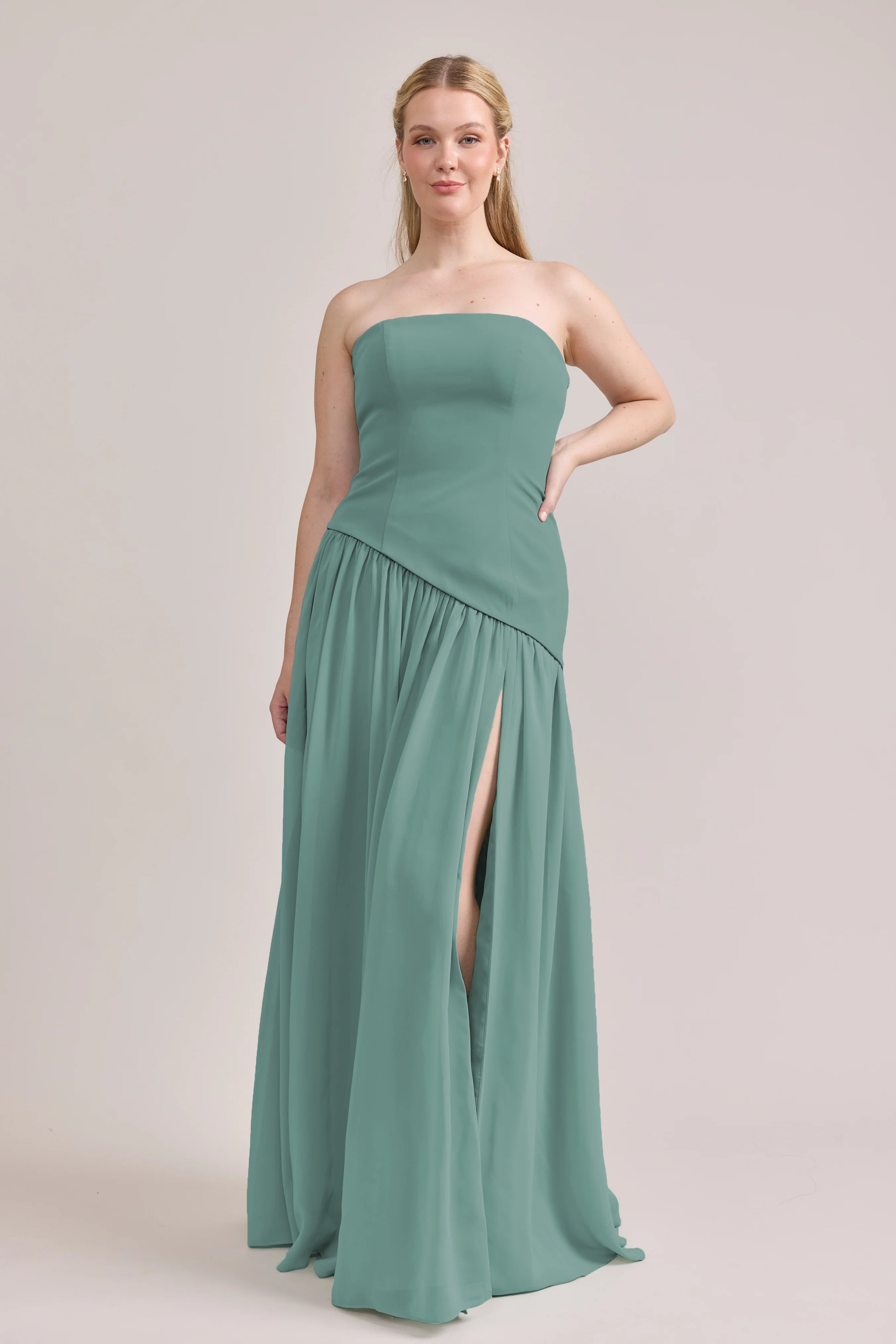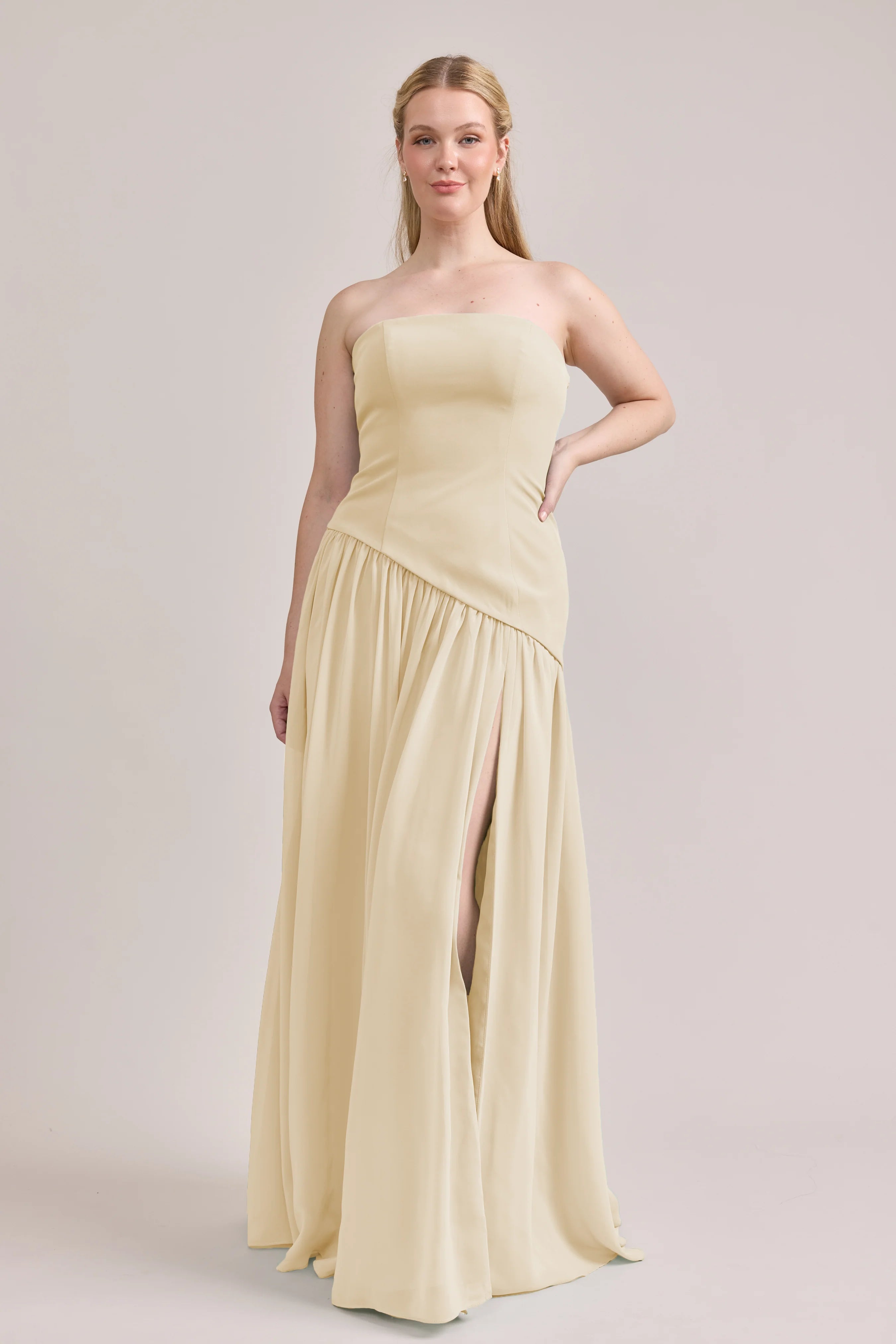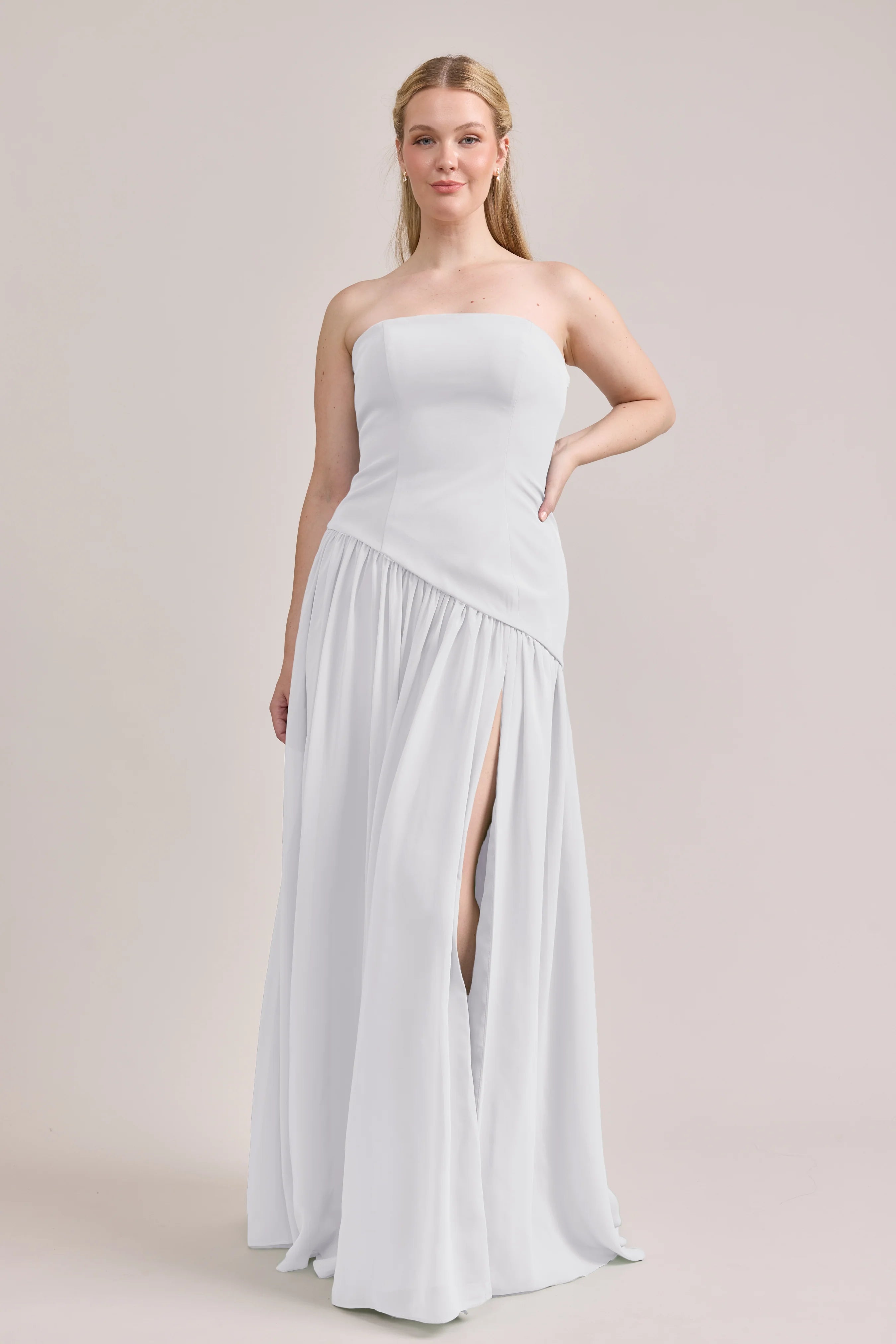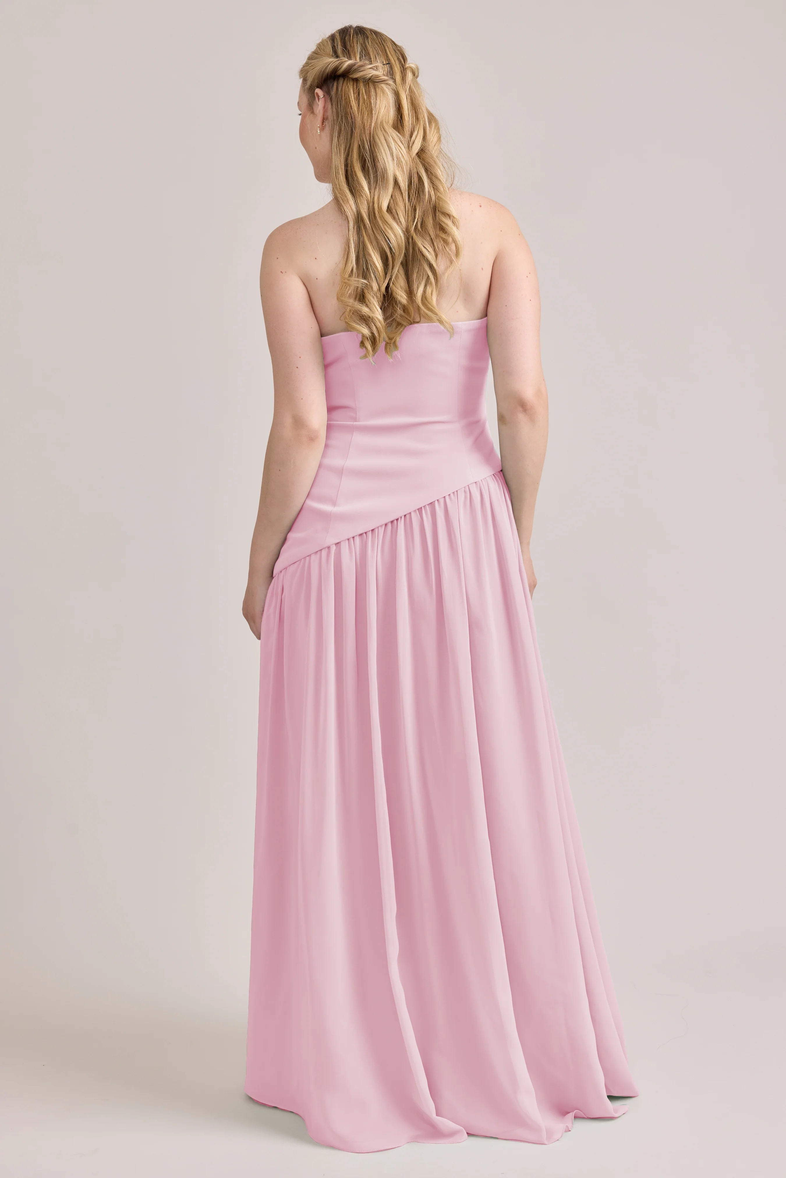 Ultra chic, ultra cool, our Ellapink Crepe + Chiffon dress is sure to get you compliments all night. She features a fitted, strapless Crepe bodice with an asymmetrical dropped waistline, and flowing chiffon skirt with a high front slit, keeping her light and airy while keeping you comfortable and supported.