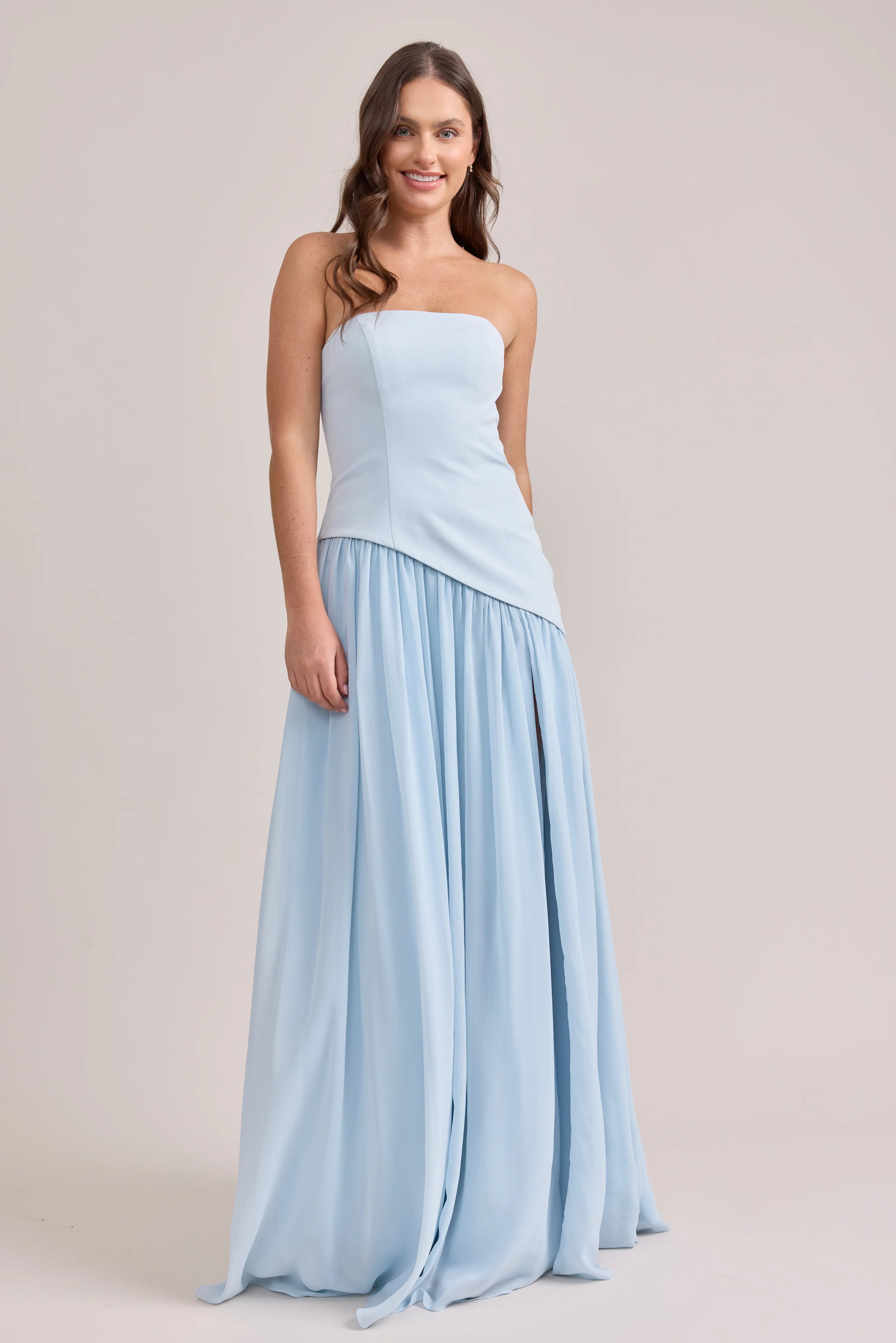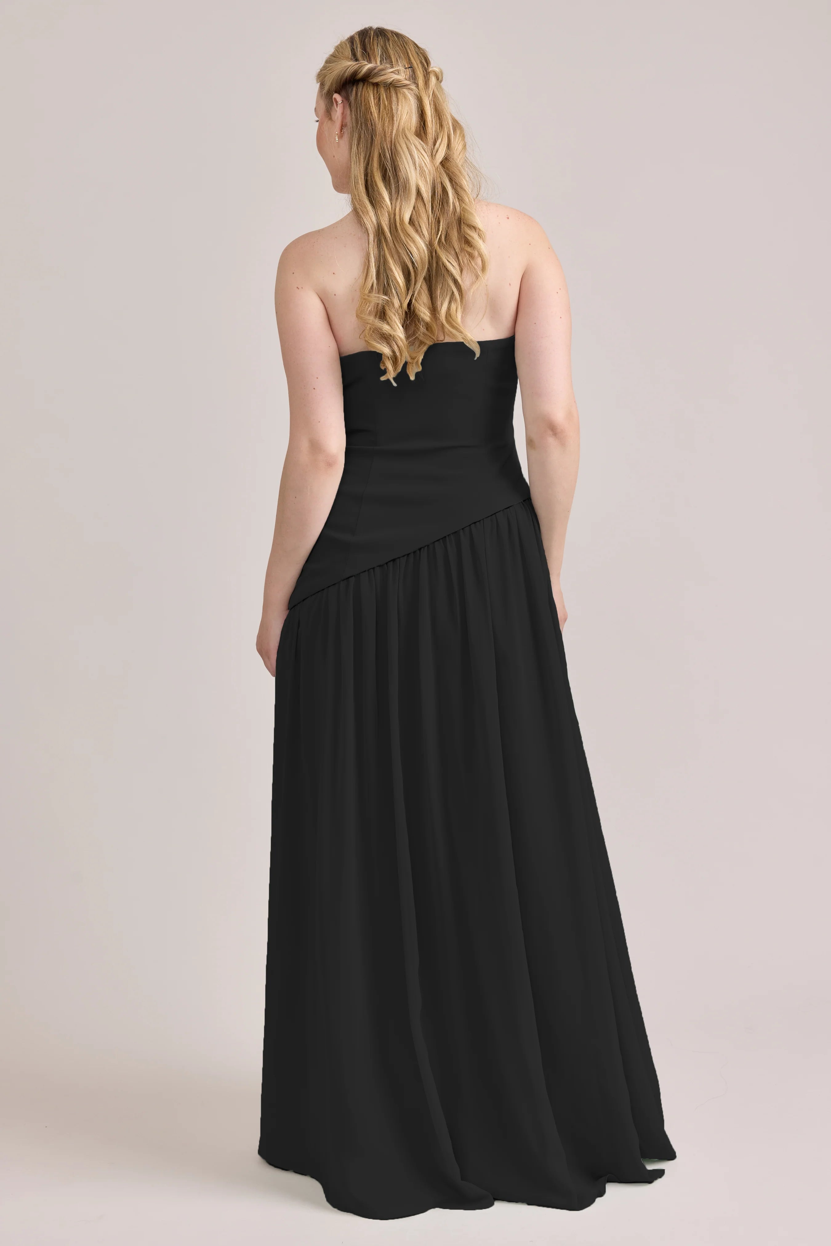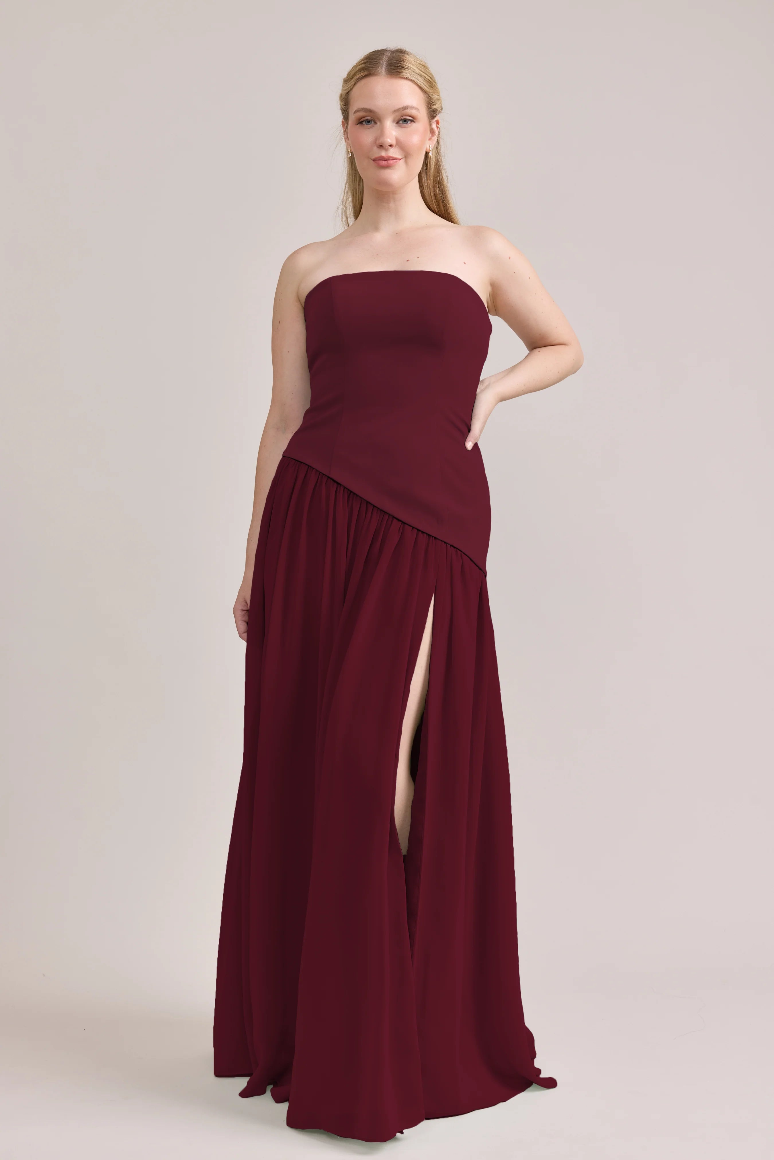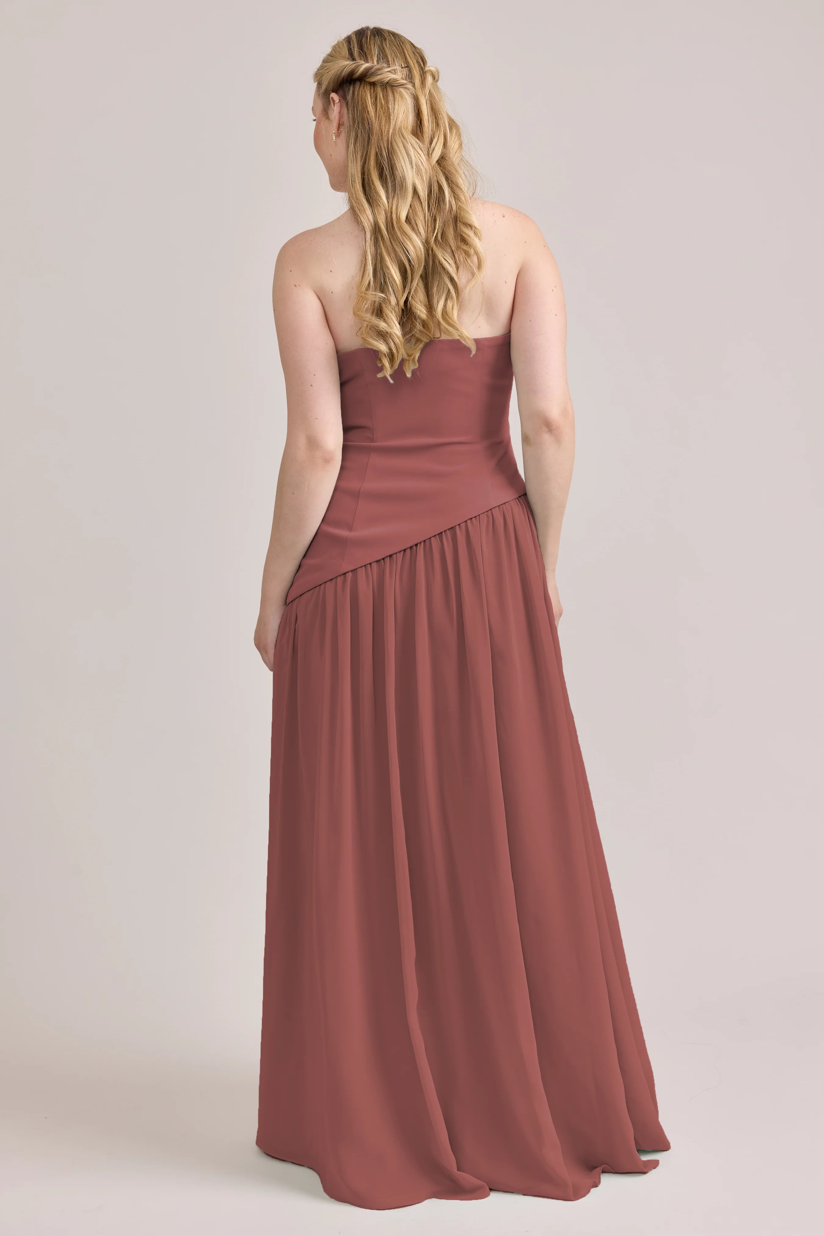 Ultra chic, ultra cool, our Ellapink Crepe + Chiffon dress is sure to get you compliments all night. She features a fitted, strapless Crepe bodice with an asymmetrical dropped waistline, and flowing chiffon skirt with a high front slit, keeping her light and airy while keeping you comfortable and supported.