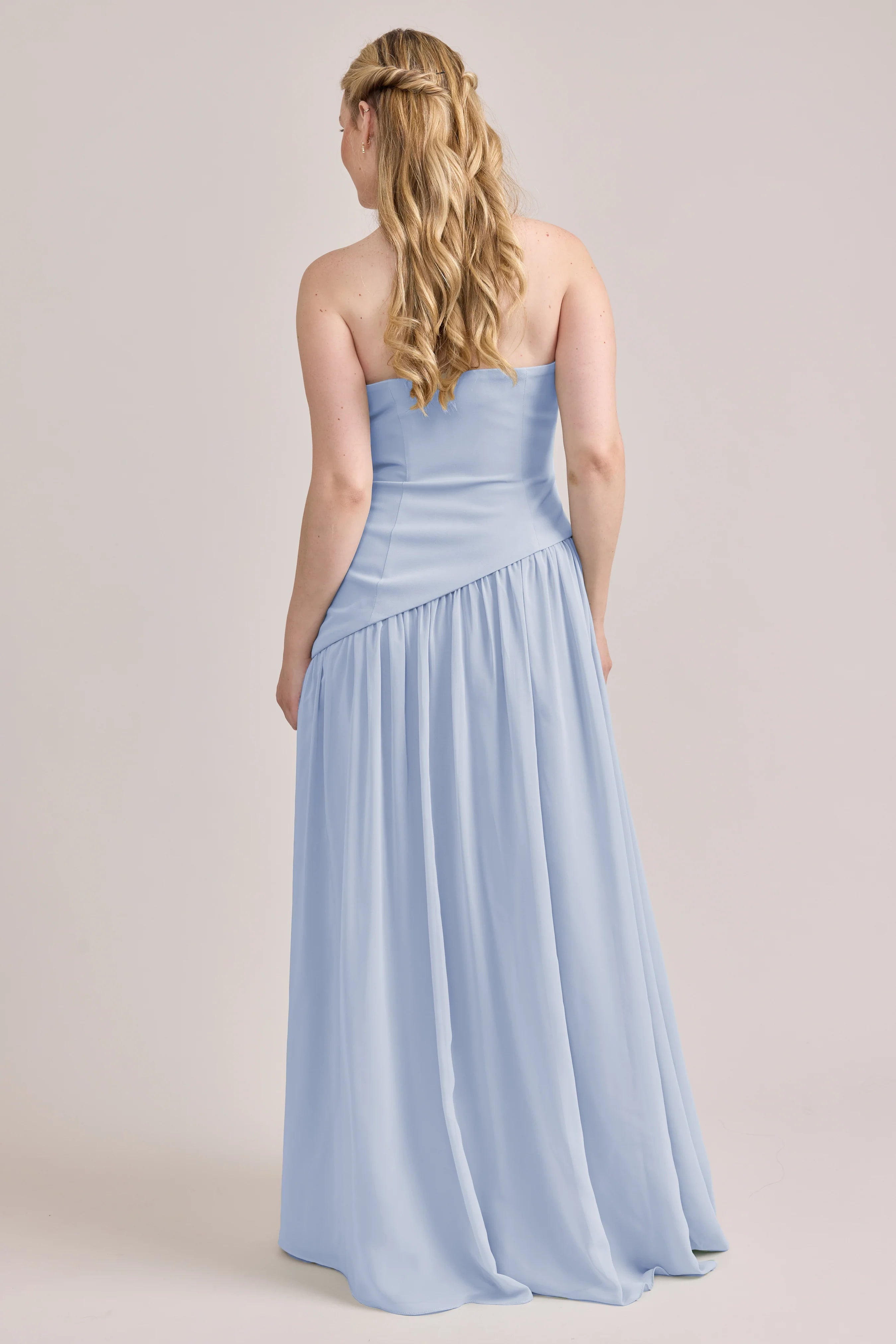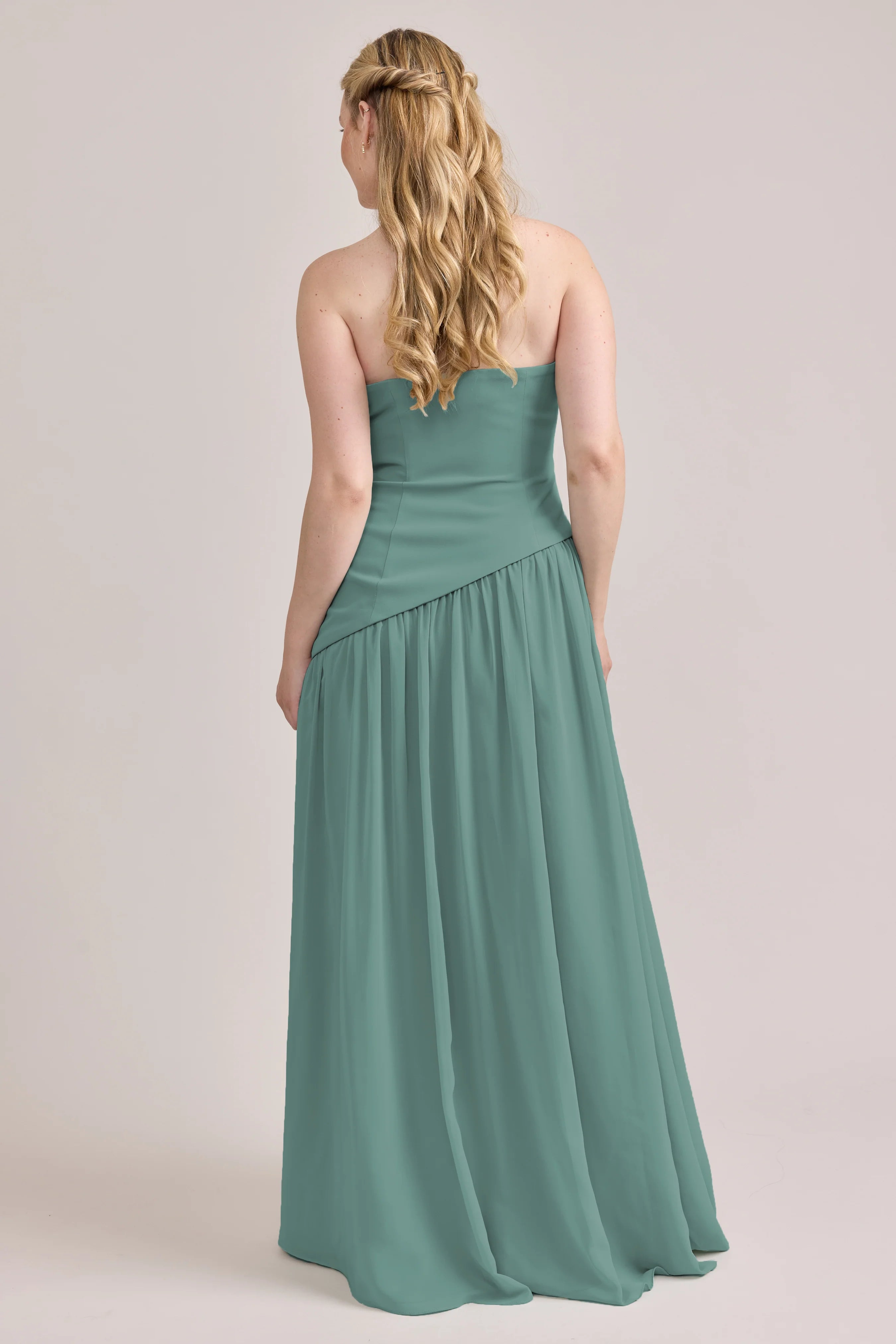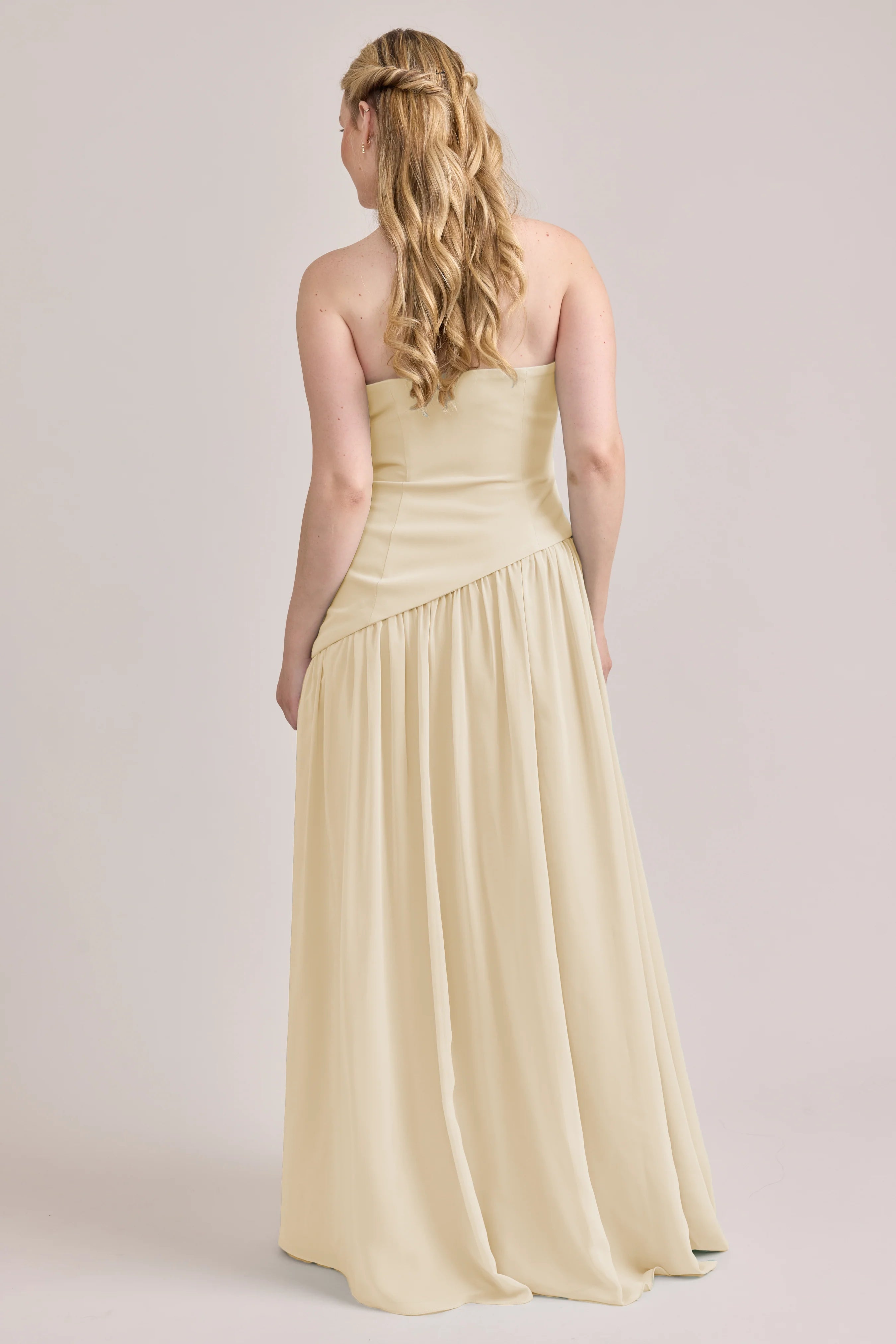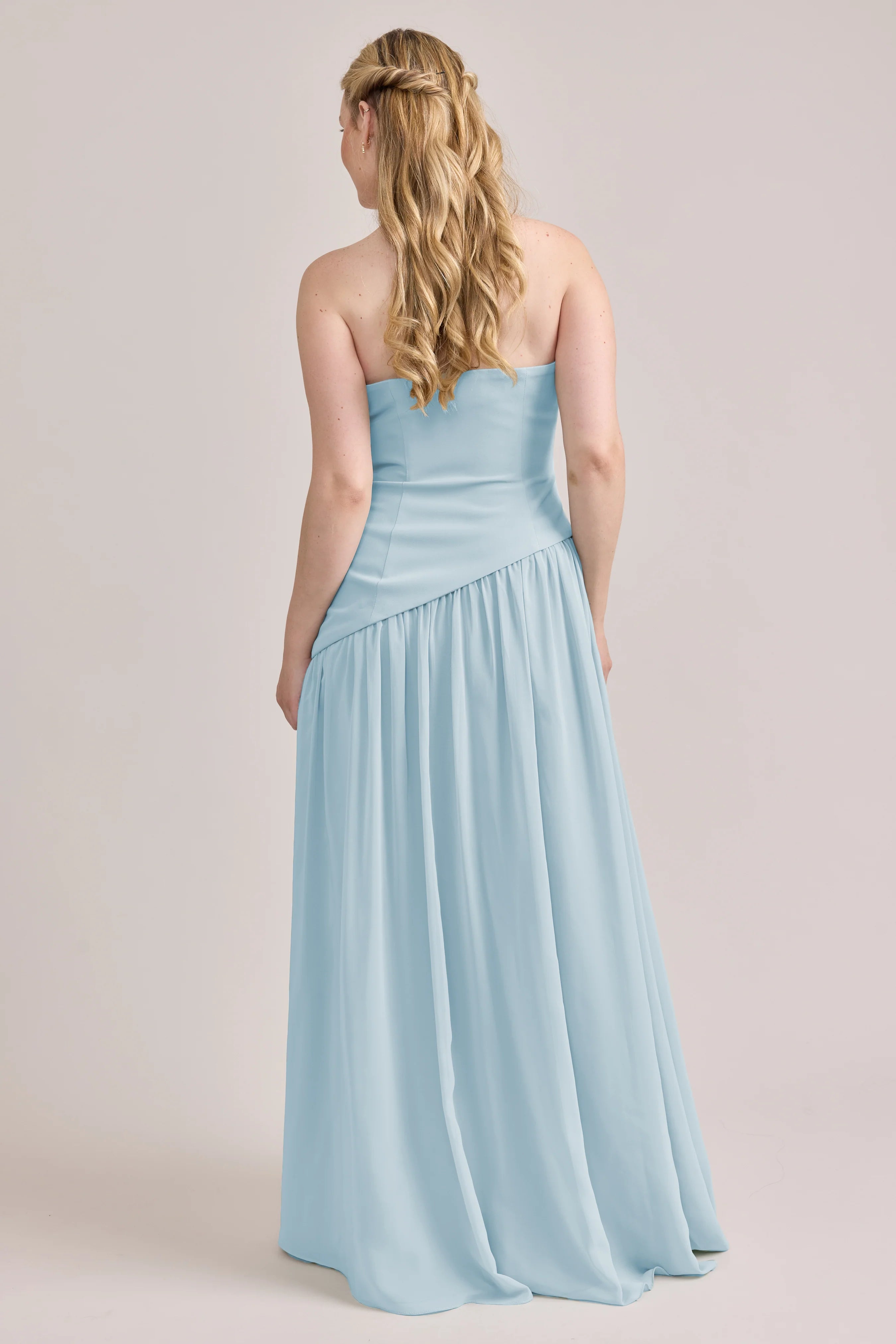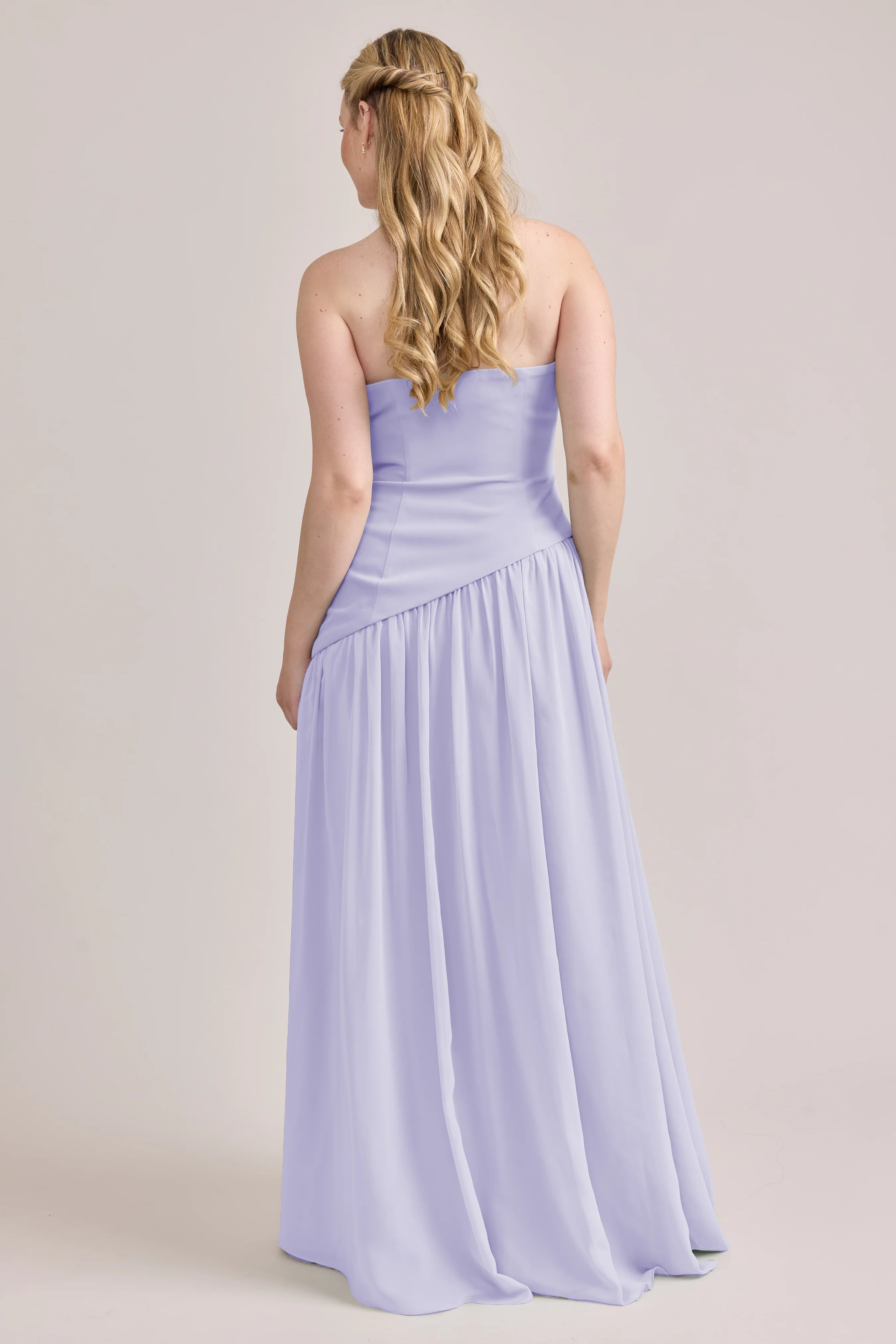 Ultra chic, ultra cool, our Ellapink Crepe + Chiffon dress is sure to get you compliments all night. She features a fitted, strapless Crepe bodice with an asymmetrical dropped waistline, and flowing chiffon skirt with a high front slit, keeping her light and airy while keeping you comfortable and supported.