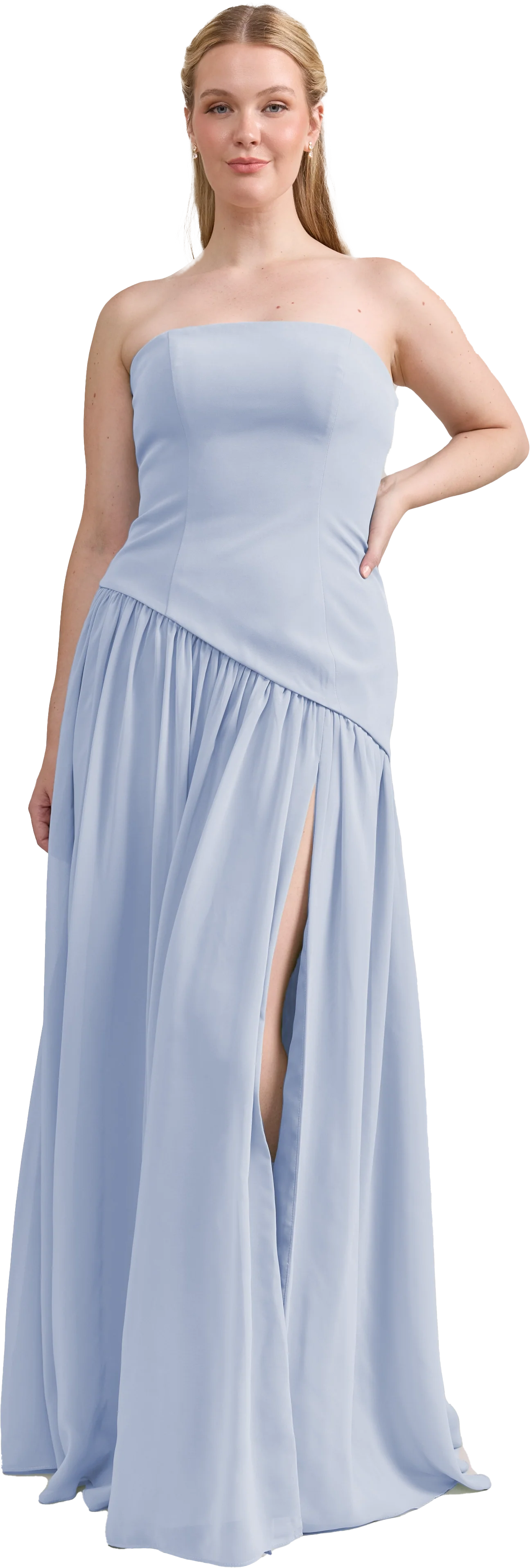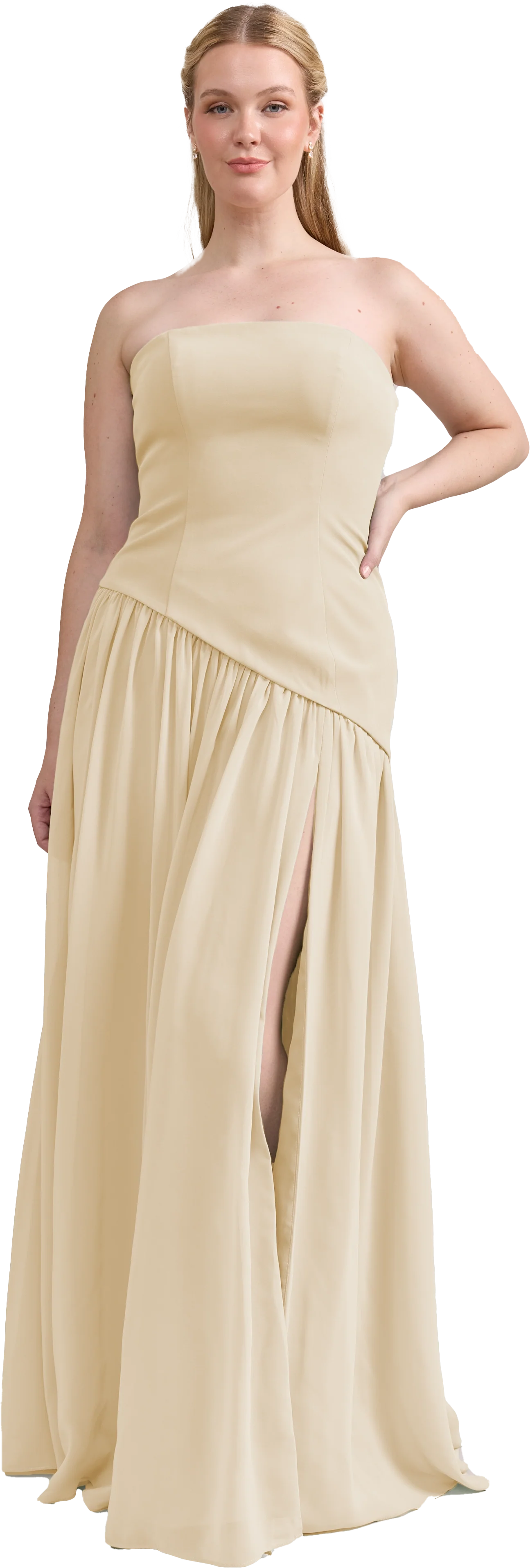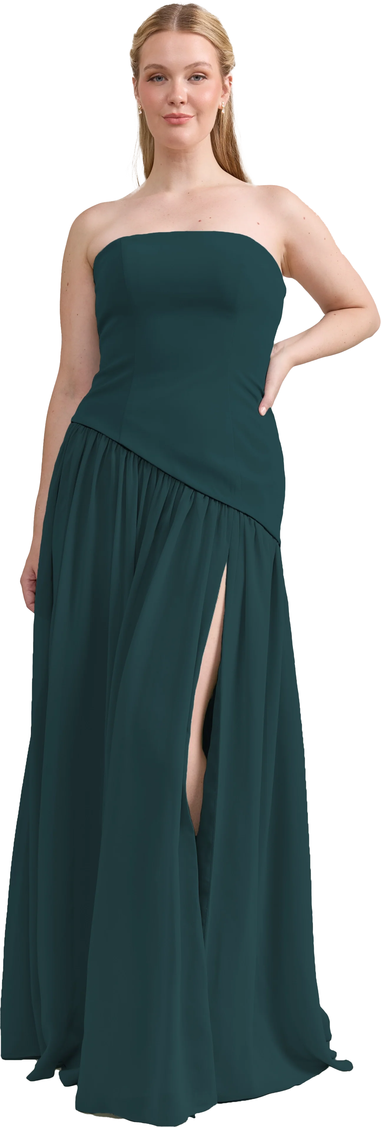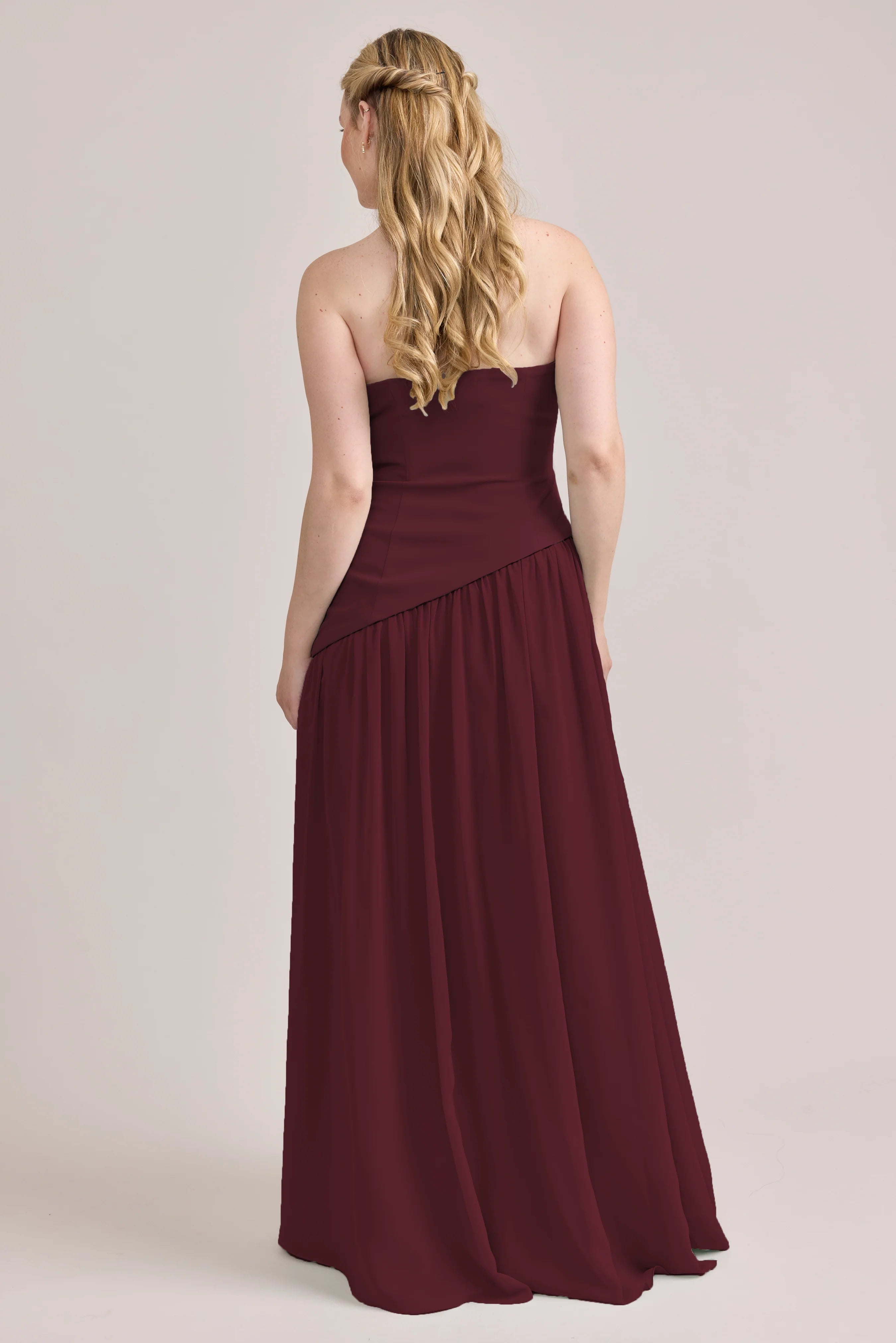 Ultra chic, ultra cool, our Ellapink Crepe + Chiffon dress is sure to get you compliments all night. She features a fitted, strapless Crepe bodice with an asymmetrical dropped waistline, and flowing chiffon skirt with a high front slit, keeping her light and airy while keeping you comfortable and supported.