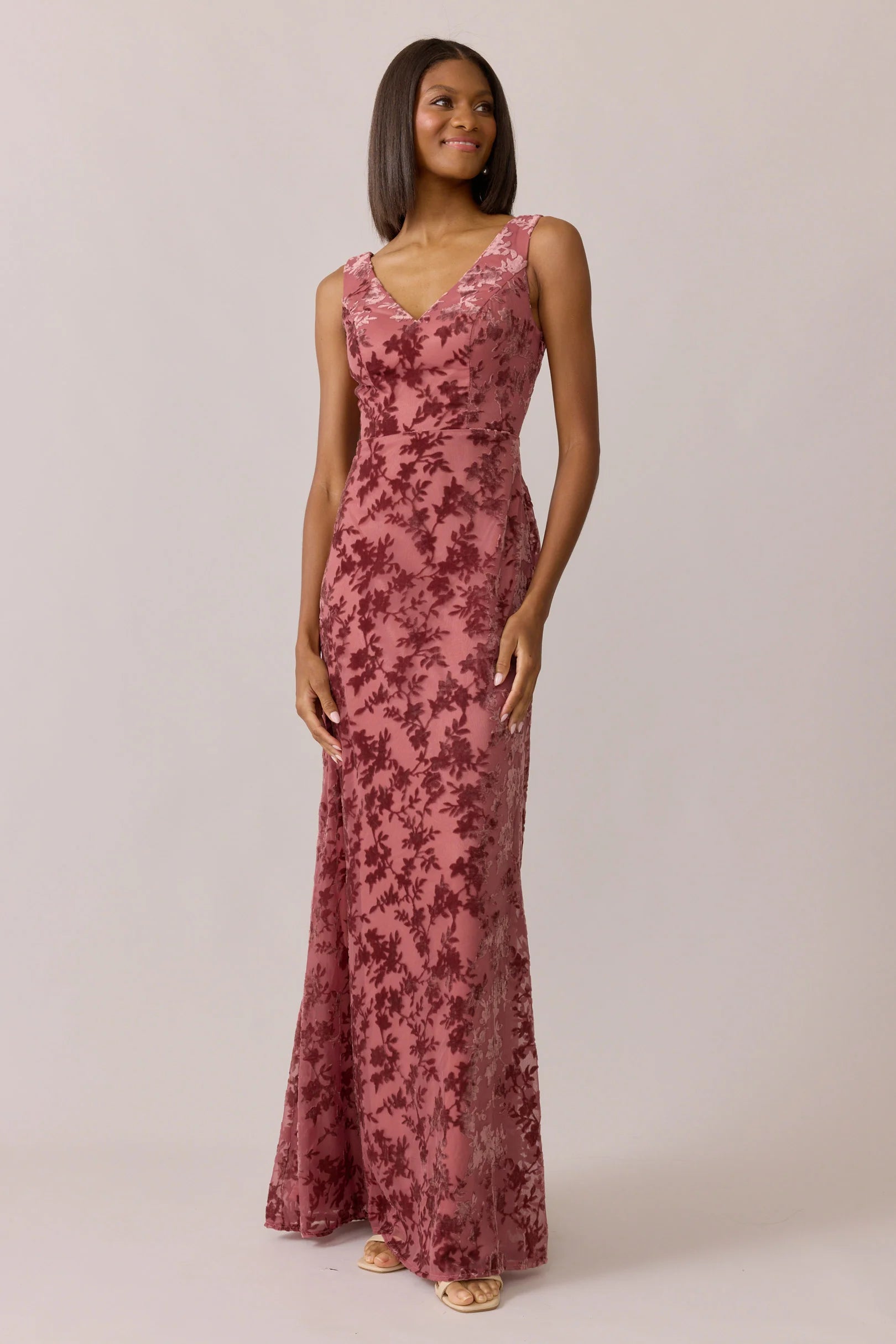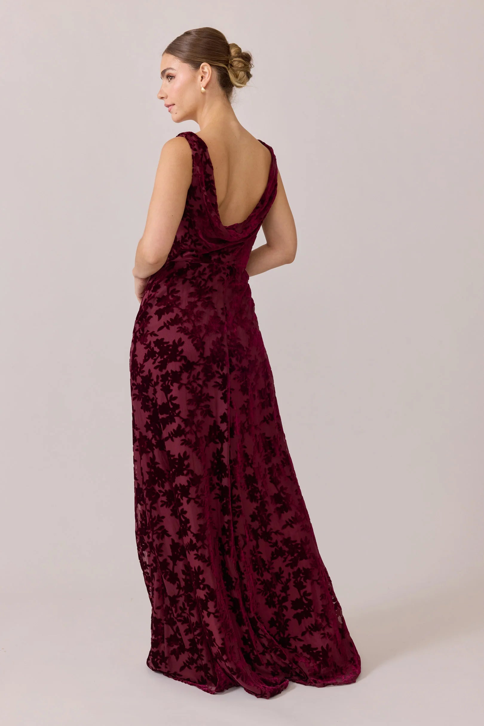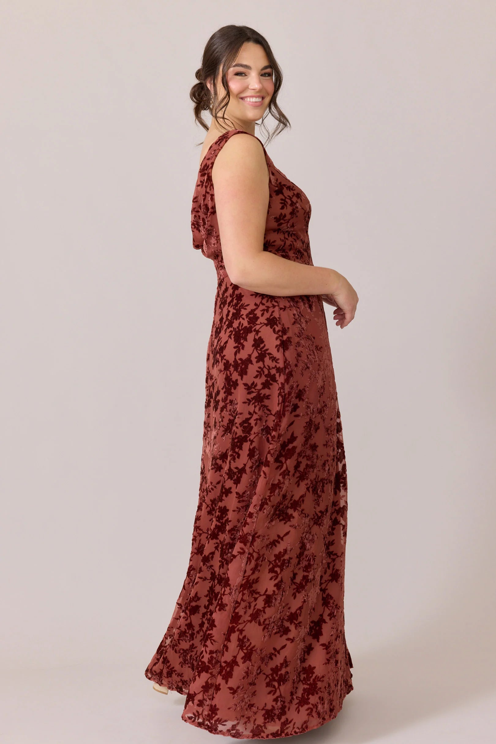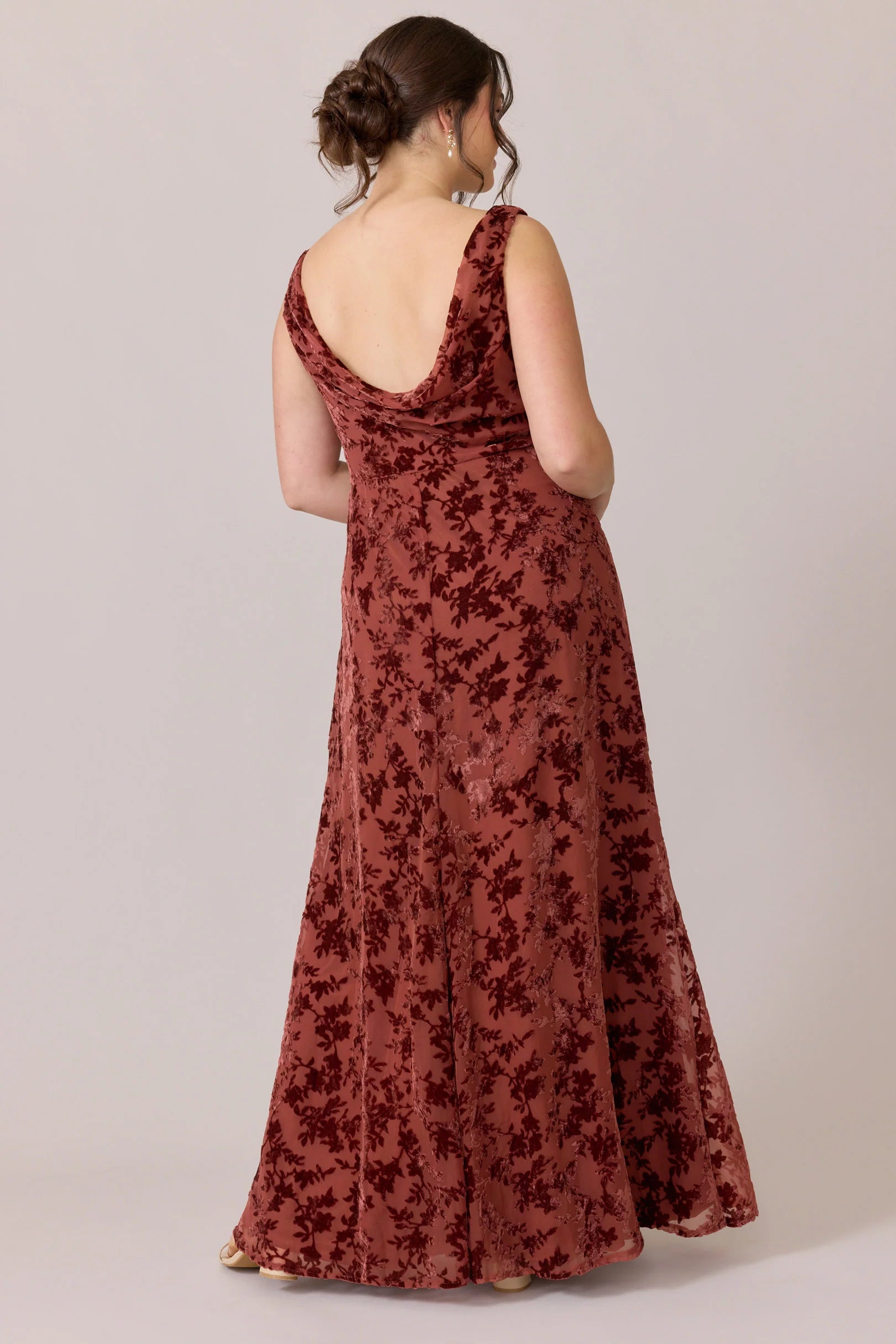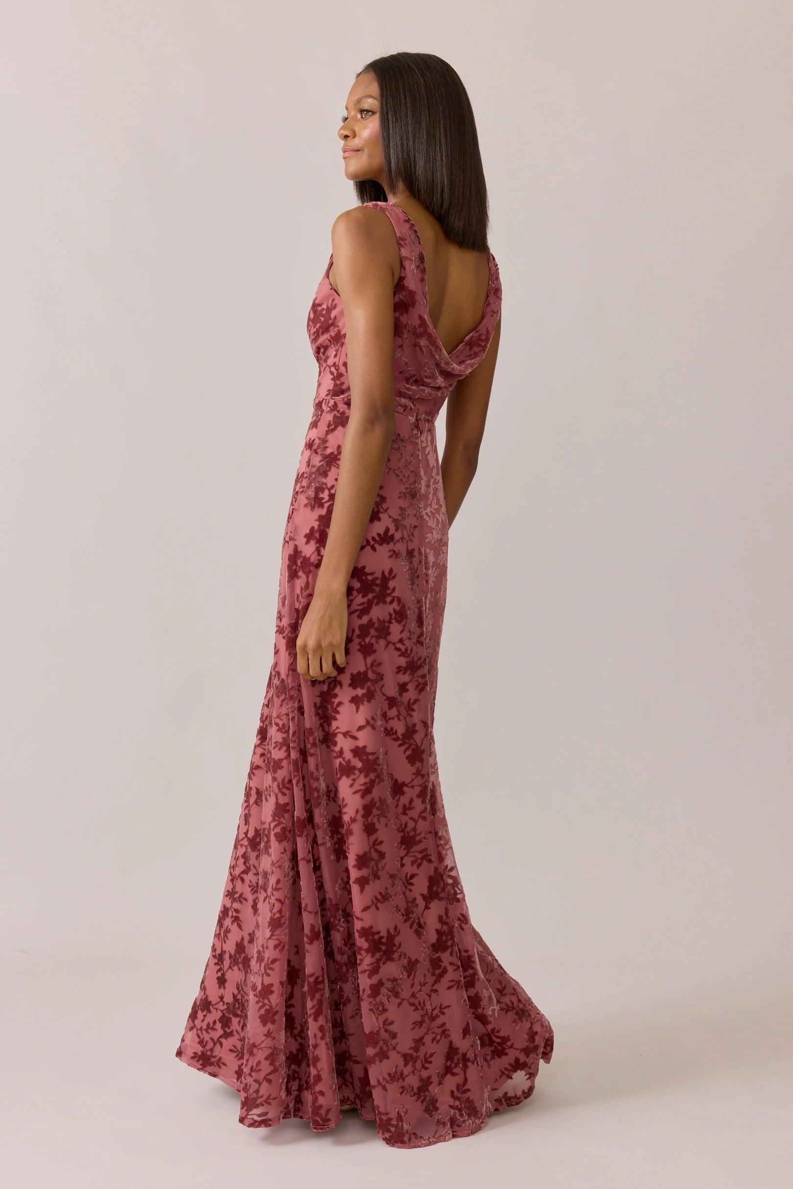 Elegant and curve-skimming, the Ellapink Burnout Velvet Dress is a timeless silhouette with subtle glam. Featuring a flattering V-neckline and thick shoulder straps, this A-line style glides over the body and highlights every shape. The draped cowl scoop back adds a striking open-back moment, while built-in cups and boning offer structure and support. Fully lined for comfort and coverage, Dakota is effortlessly graceful—perfect for every member of your bridal party.