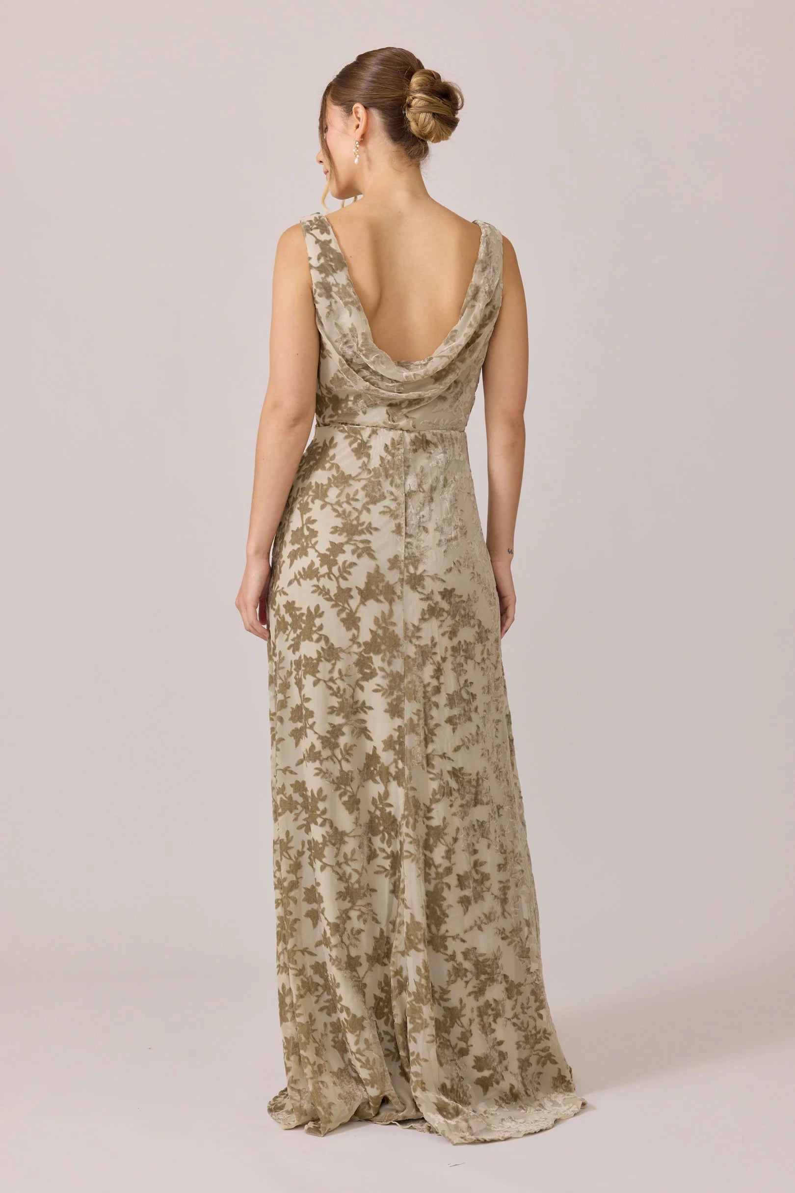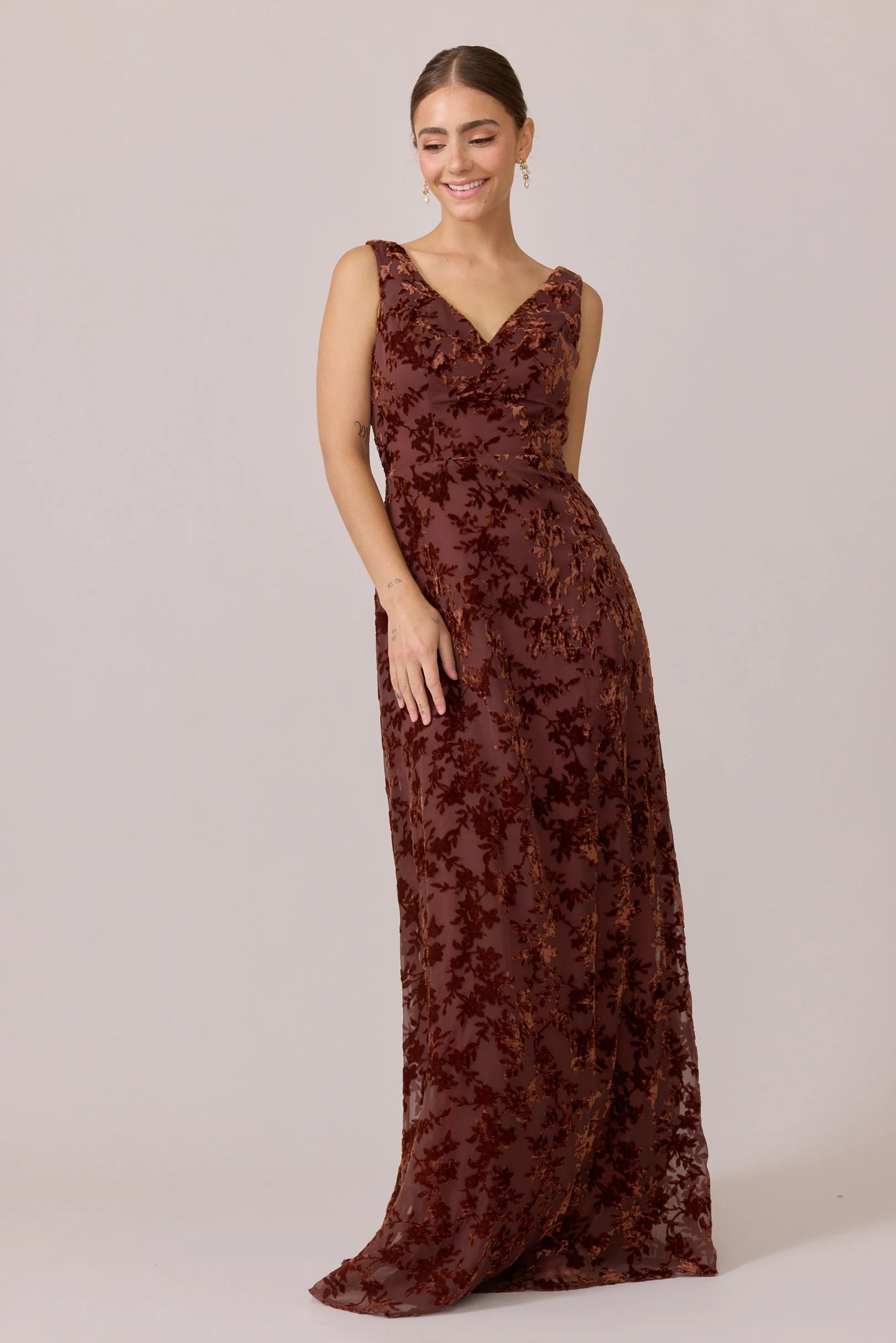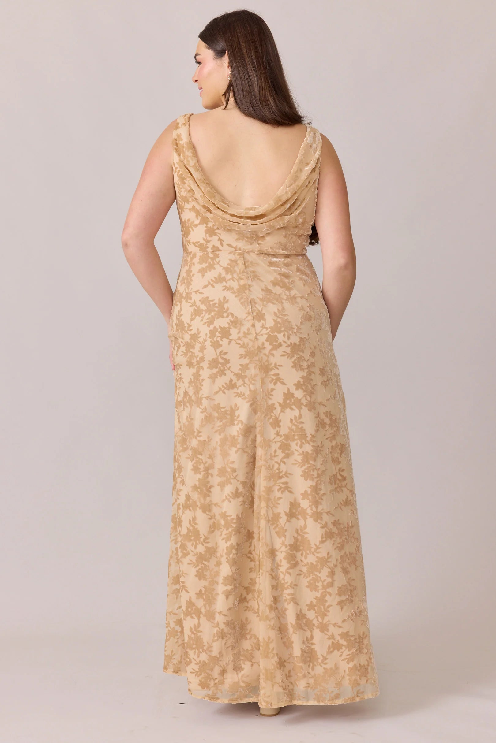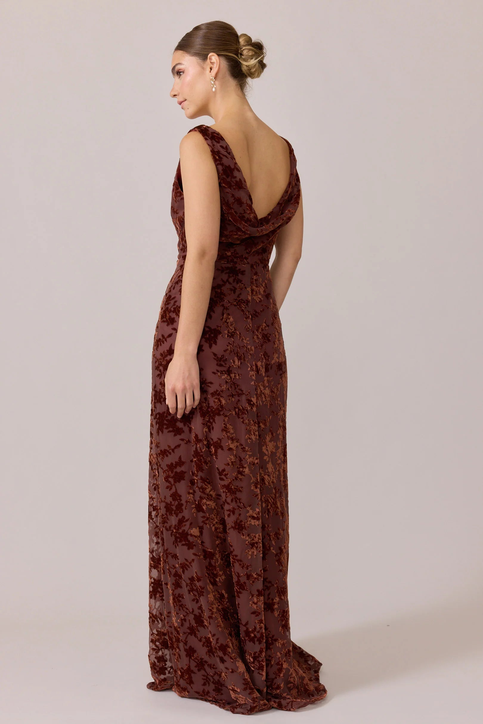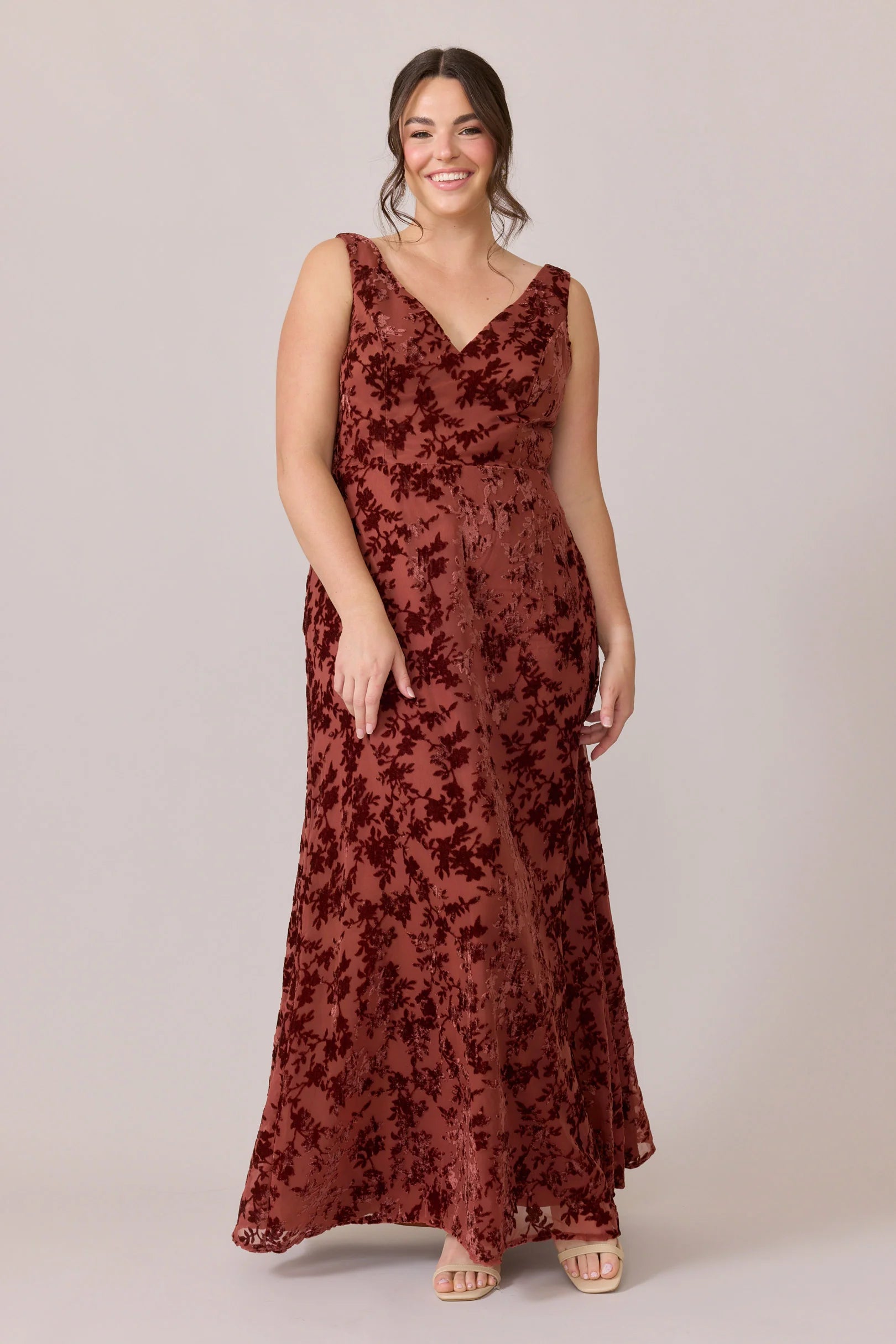 Elegant and curve-skimming, the Ellapink Burnout Velvet Dress is a timeless silhouette with subtle glam. Featuring a flattering V-neckline and thick shoulder straps, this A-line style glides over the body and highlights every shape. The draped cowl scoop back adds a striking open-back moment, while built-in cups and boning offer structure and support. Fully lined for comfort and coverage, Dakota is effortlessly graceful—perfect for every member of your bridal party.