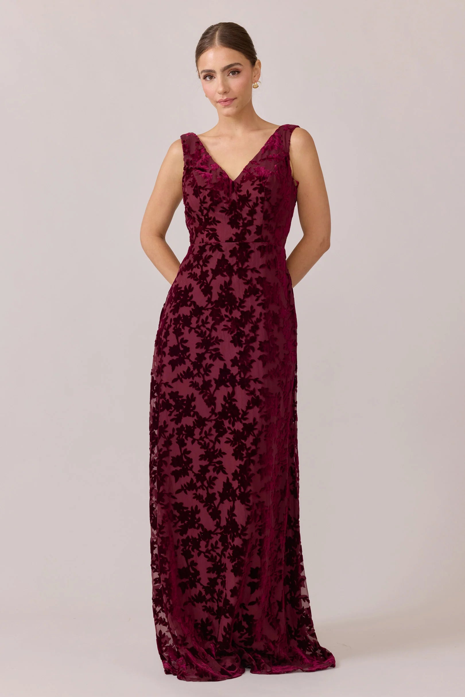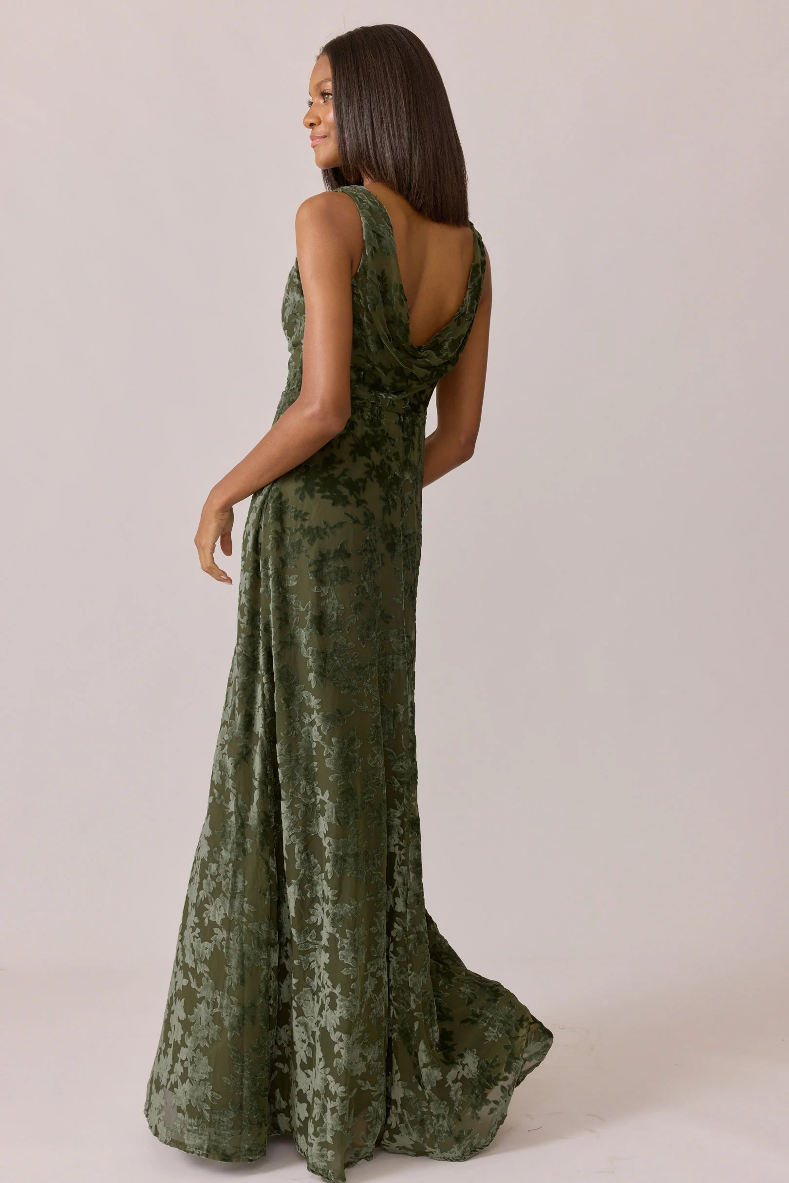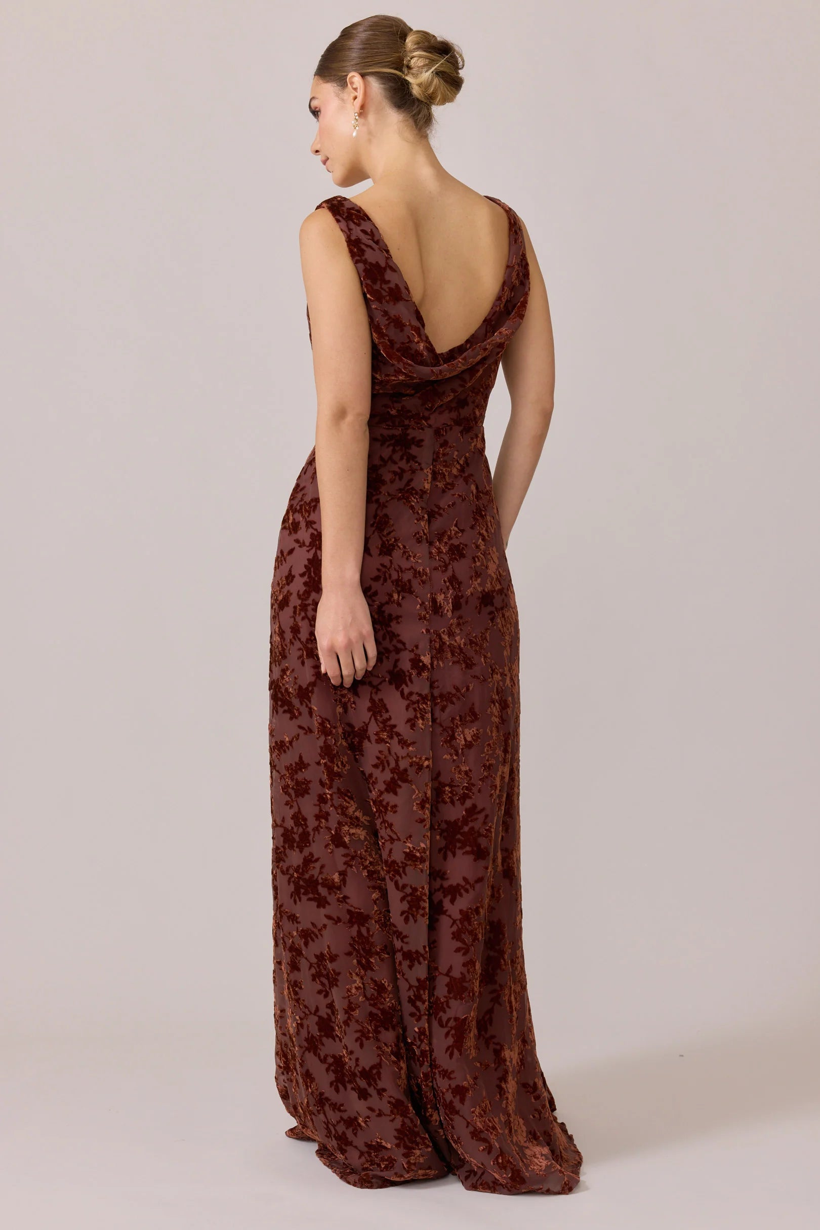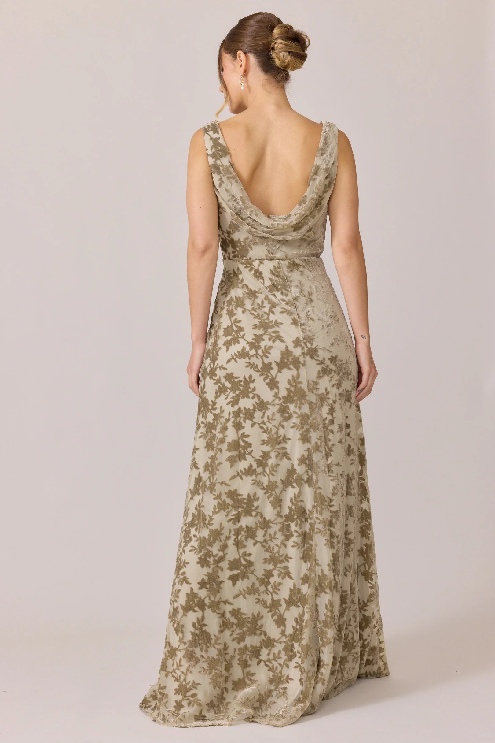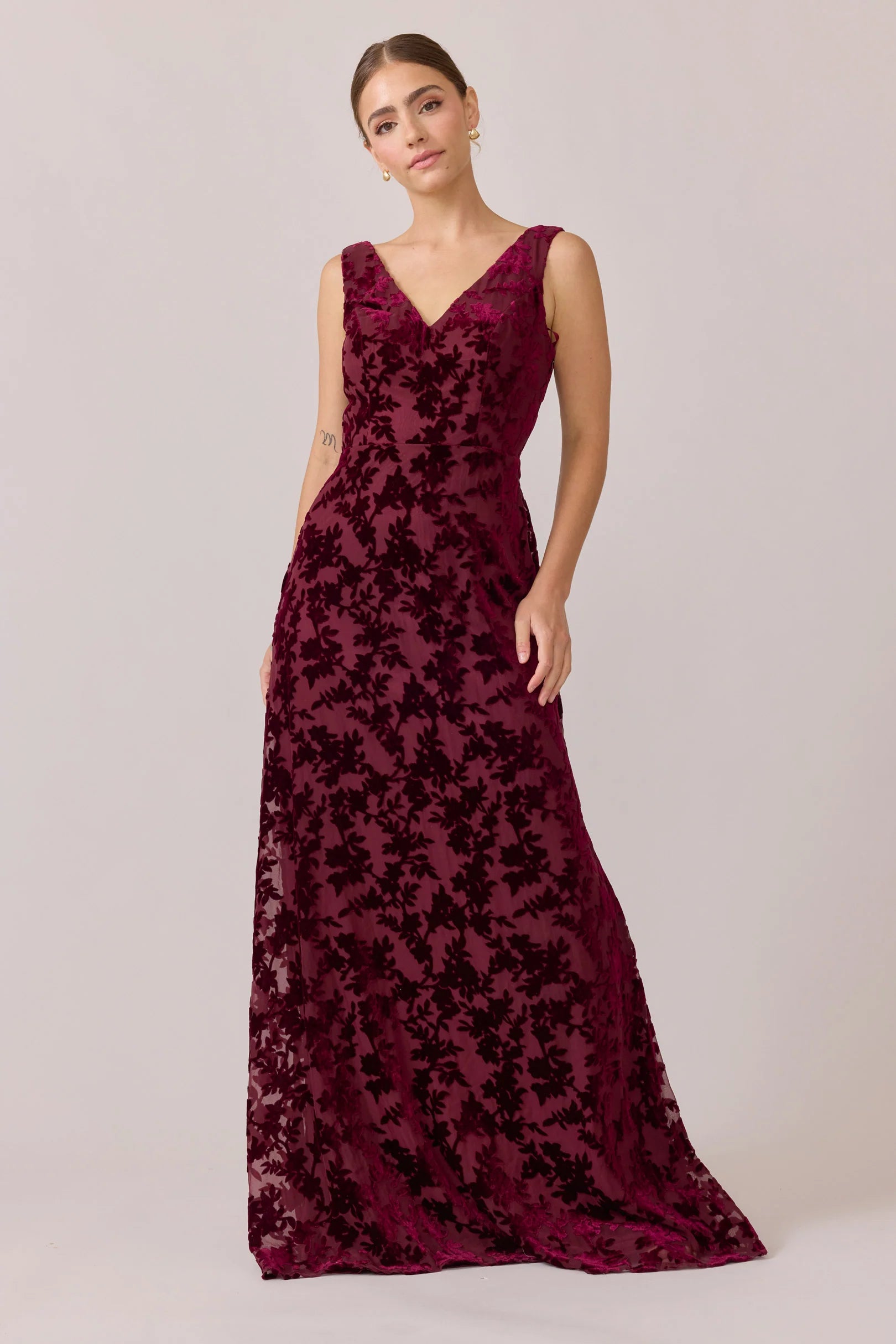 Elegant and curve-skimming, the Ellapink Burnout Velvet Dress is a timeless silhouette with subtle glam. Featuring a flattering V-neckline and thick shoulder straps, this A-line style glides over the body and highlights every shape. The draped cowl scoop back adds a striking open-back moment, while built-in cups and boning offer structure and support. Fully lined for comfort and coverage, Dakota is effortlessly graceful—perfect for every member of your bridal party.