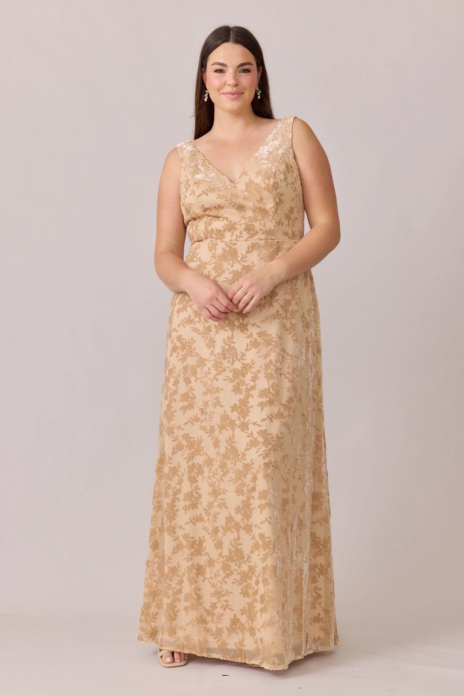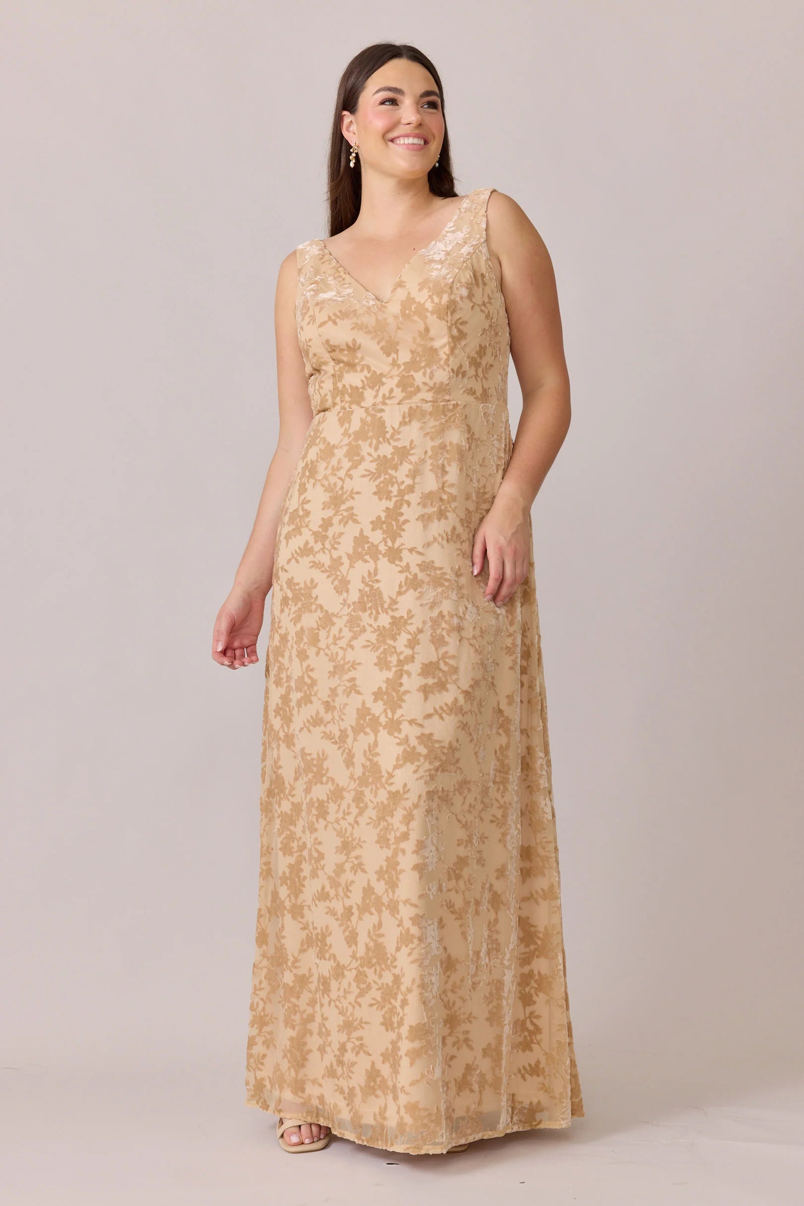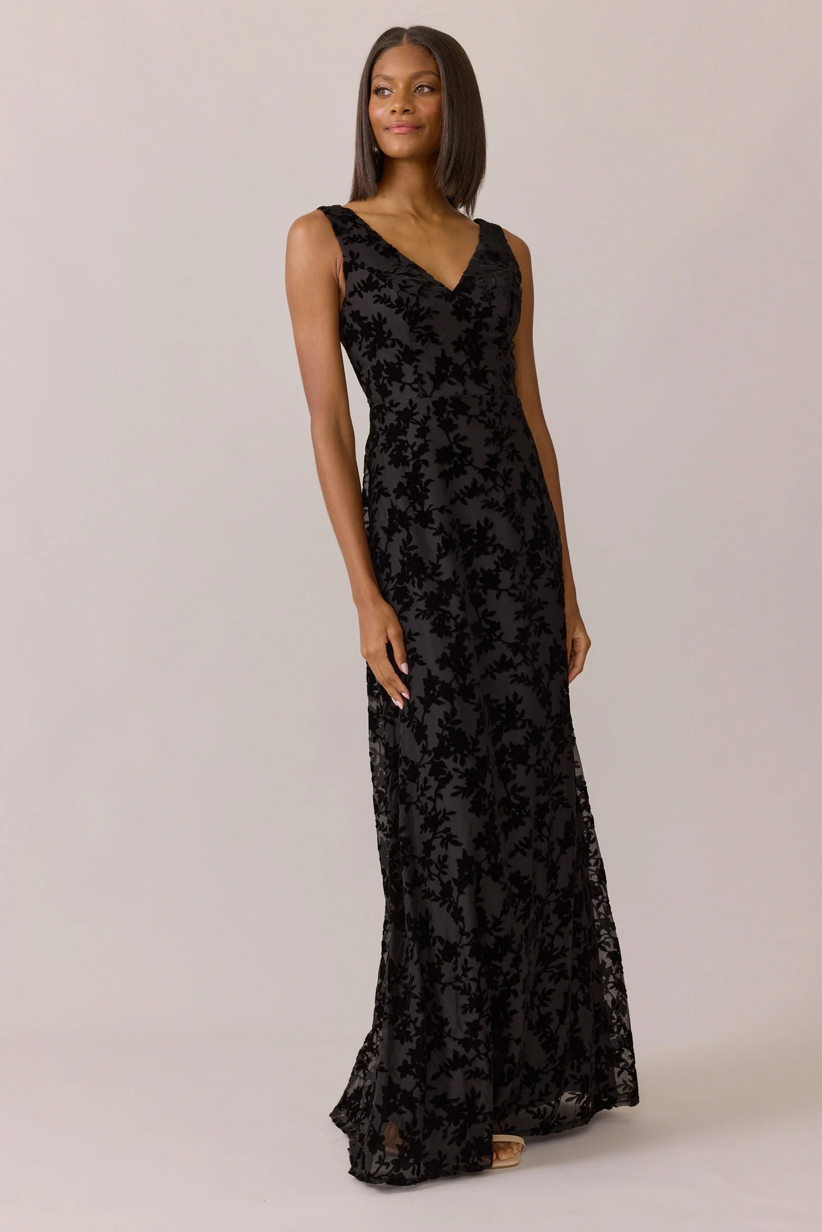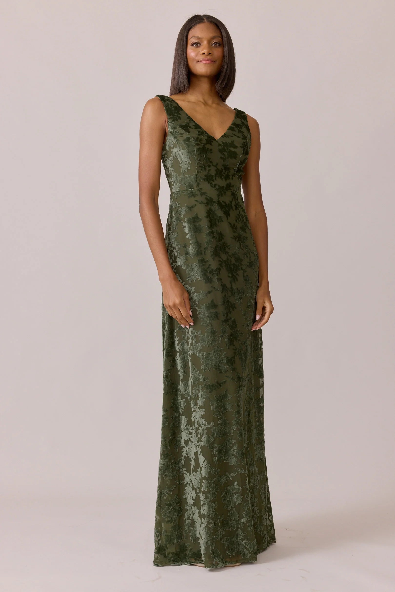 Elegant and curve-skimming, the Ellapink Burnout Velvet Dress is a timeless silhouette with subtle glam. Featuring a flattering V-neckline and thick shoulder straps, this A-line style glides over the body and highlights every shape. The draped cowl scoop back adds a striking open-back moment, while built-in cups and boning offer structure and support. Fully lined for comfort and coverage, Dakota is effortlessly graceful—perfect for every member of your bridal party.