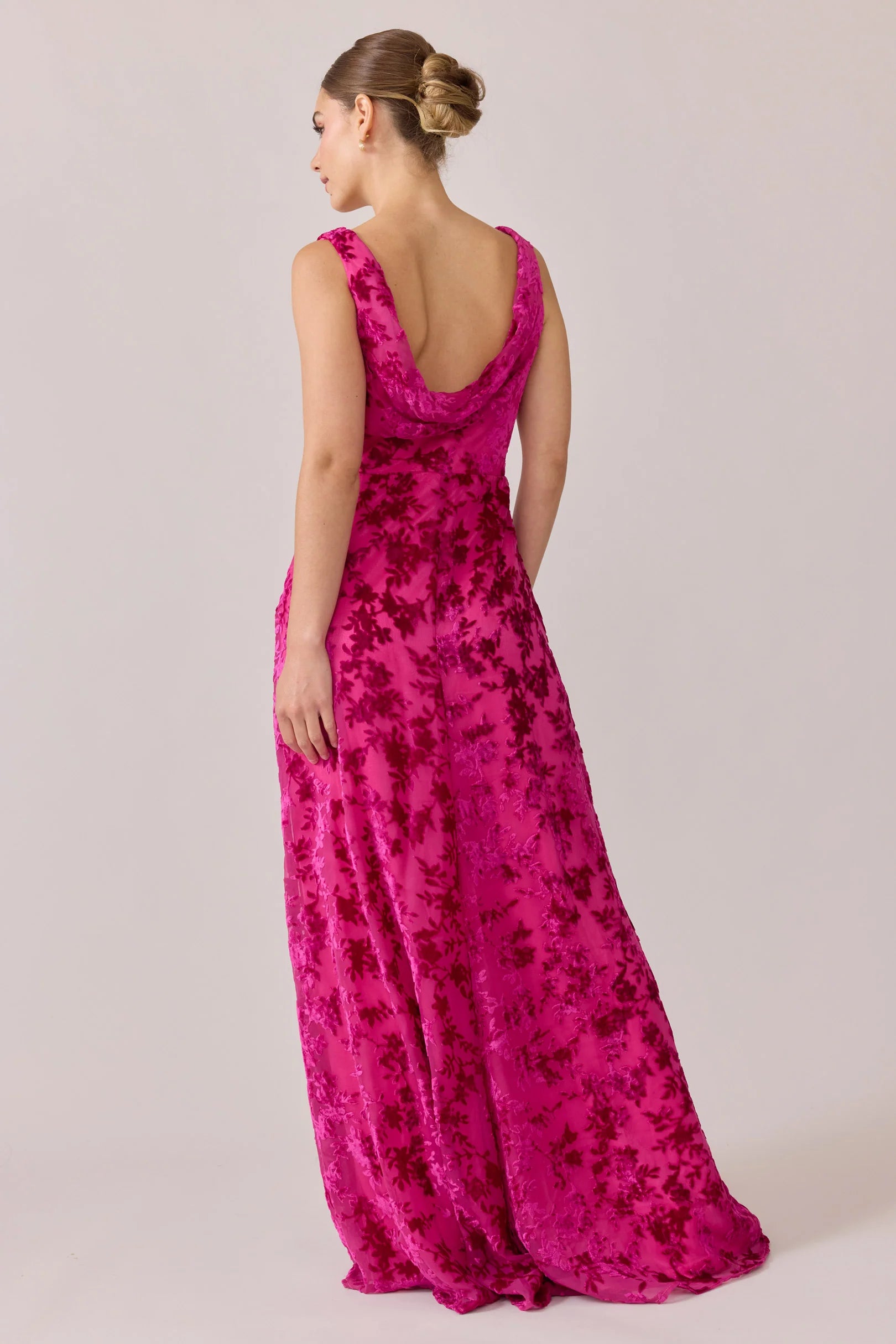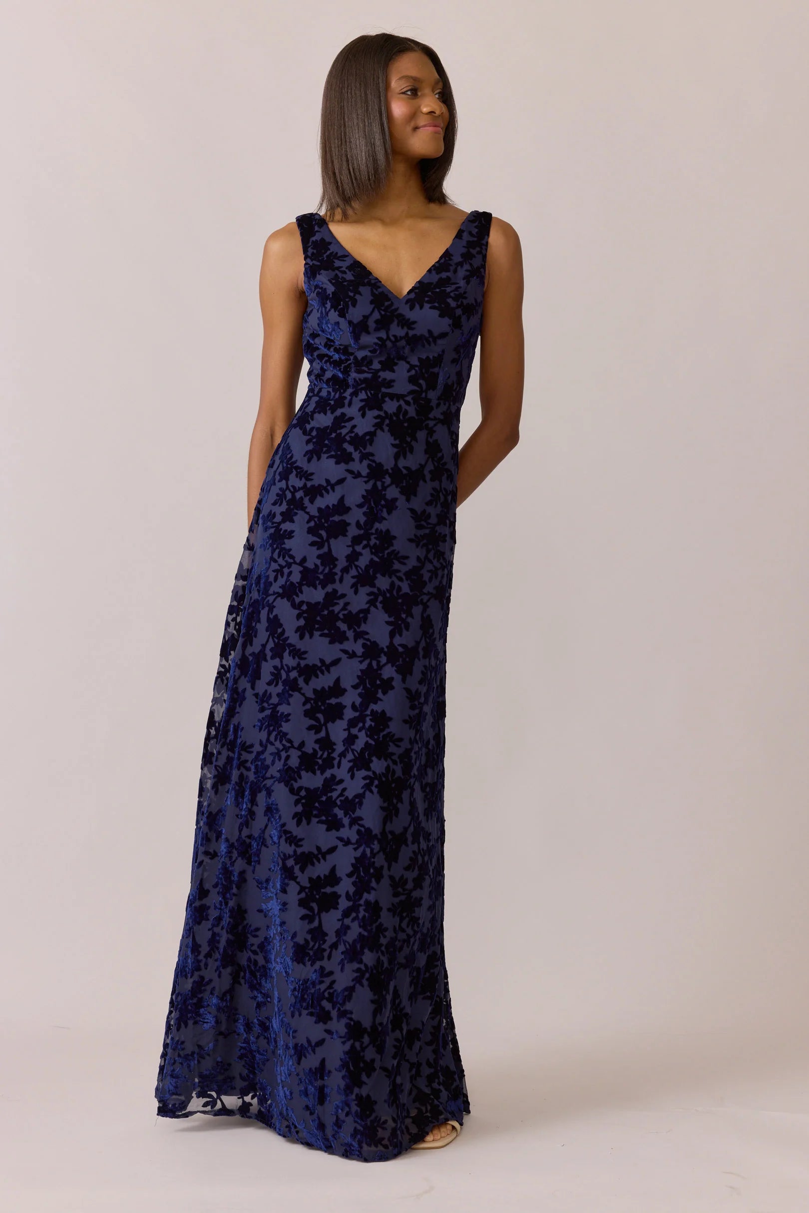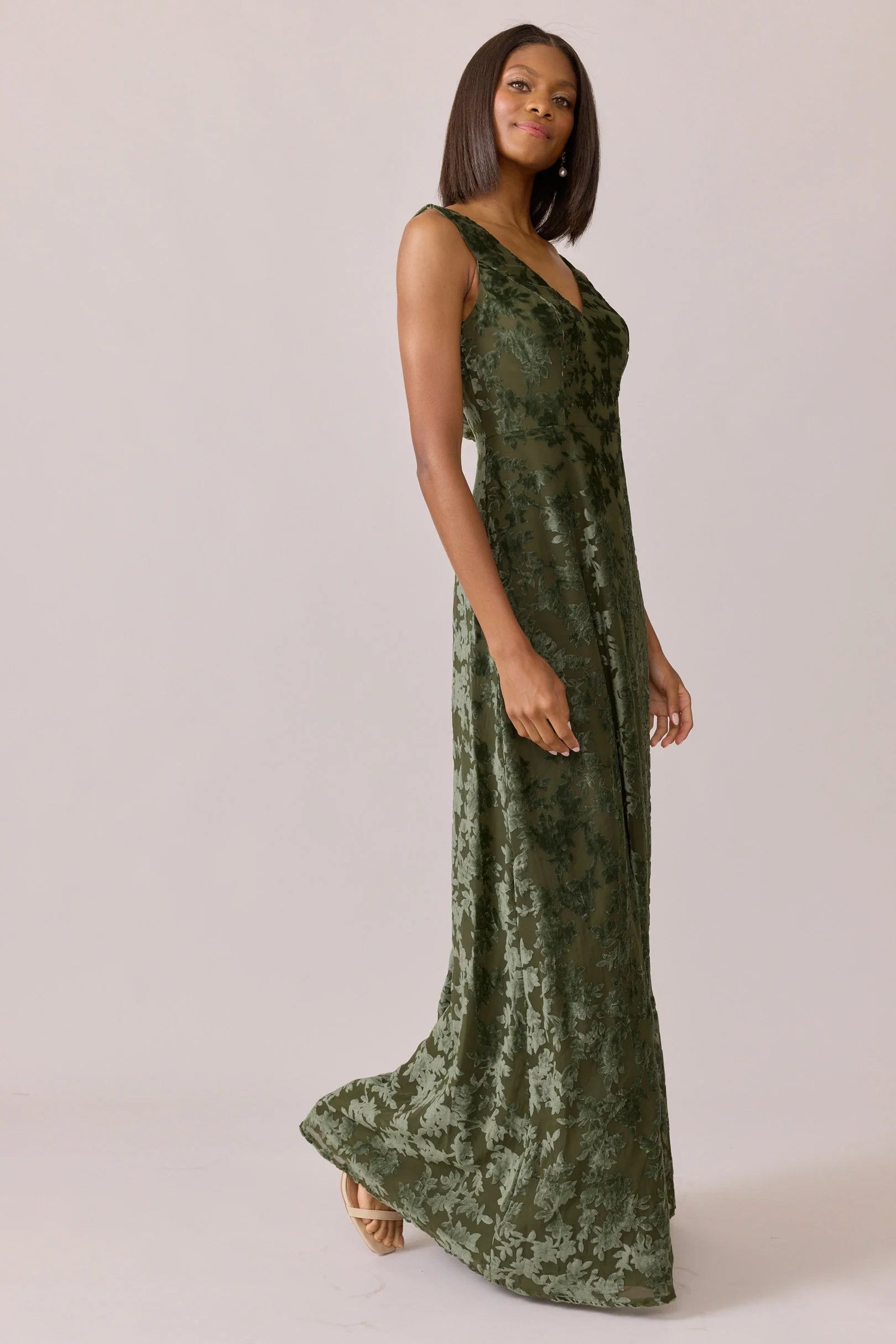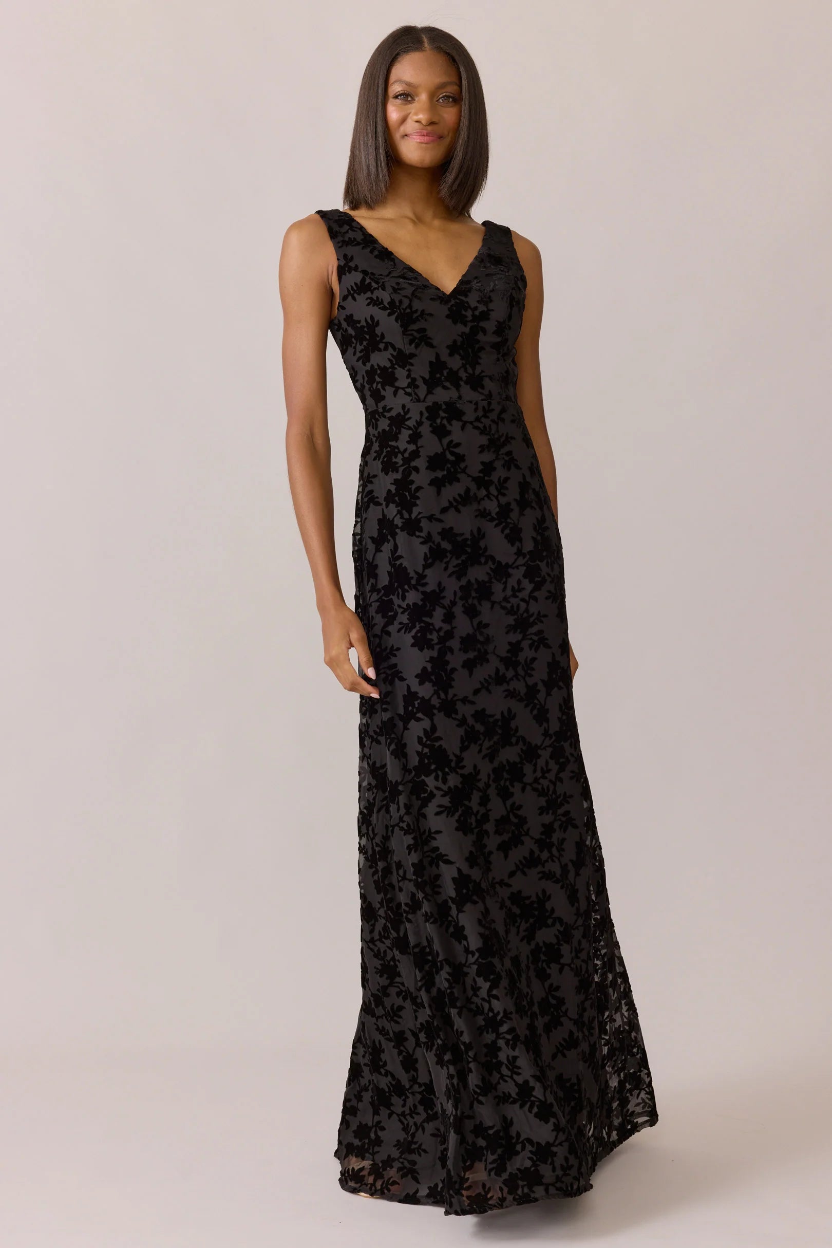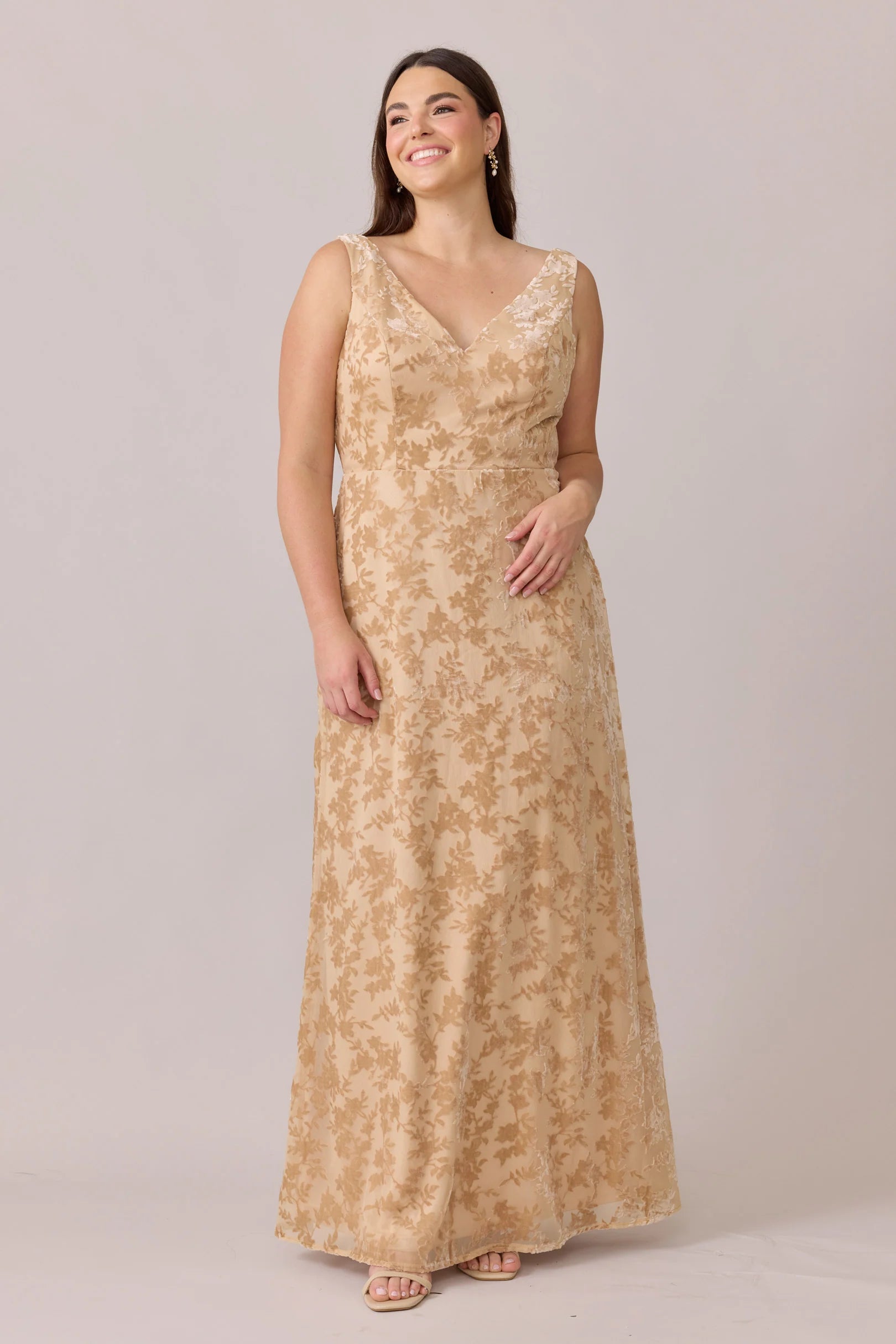 Elegant and curve-skimming, the Ellapink Burnout Velvet Dress is a timeless silhouette with subtle glam. Featuring a flattering V-neckline and thick shoulder straps, this A-line style glides over the body and highlights every shape. The draped cowl scoop back adds a striking open-back moment, while built-in cups and boning offer structure and support. Fully lined for comfort and coverage, Dakota is effortlessly graceful—perfect for every member of your bridal party.