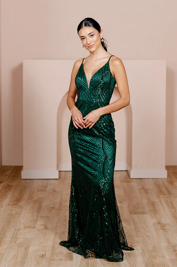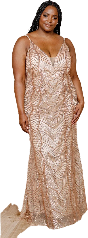 Our Ellapink dress will provide all the glitz and glamour for your big day and is now available in our specialty fabric; the Geo Sequin pattern! Camilla is an instant show stopper with its alluring fit-and-flare style and plunging neckline supported by skin-tone mesh illusion for moderate coverage.