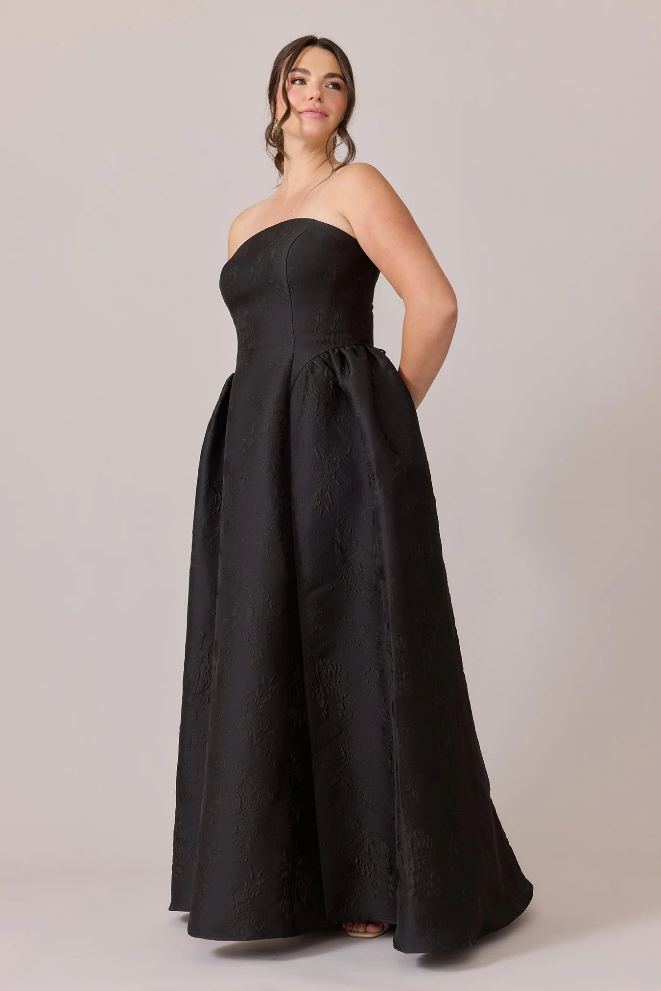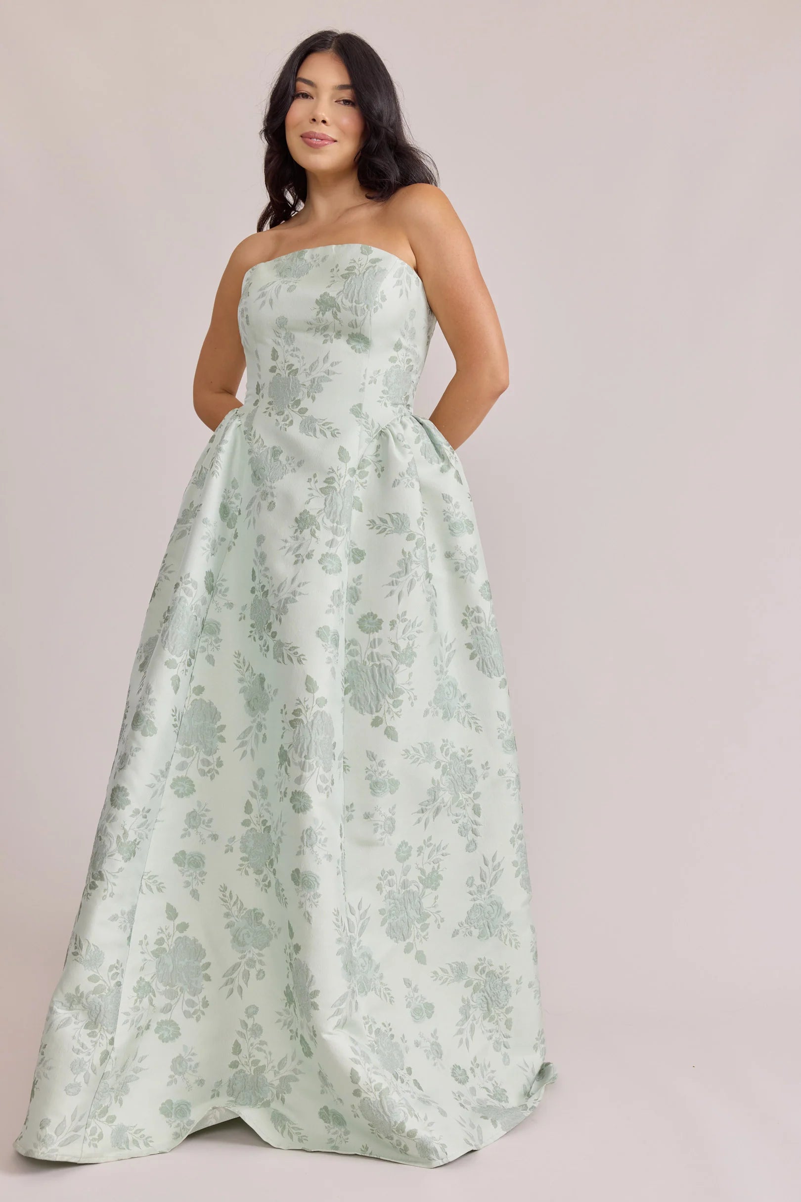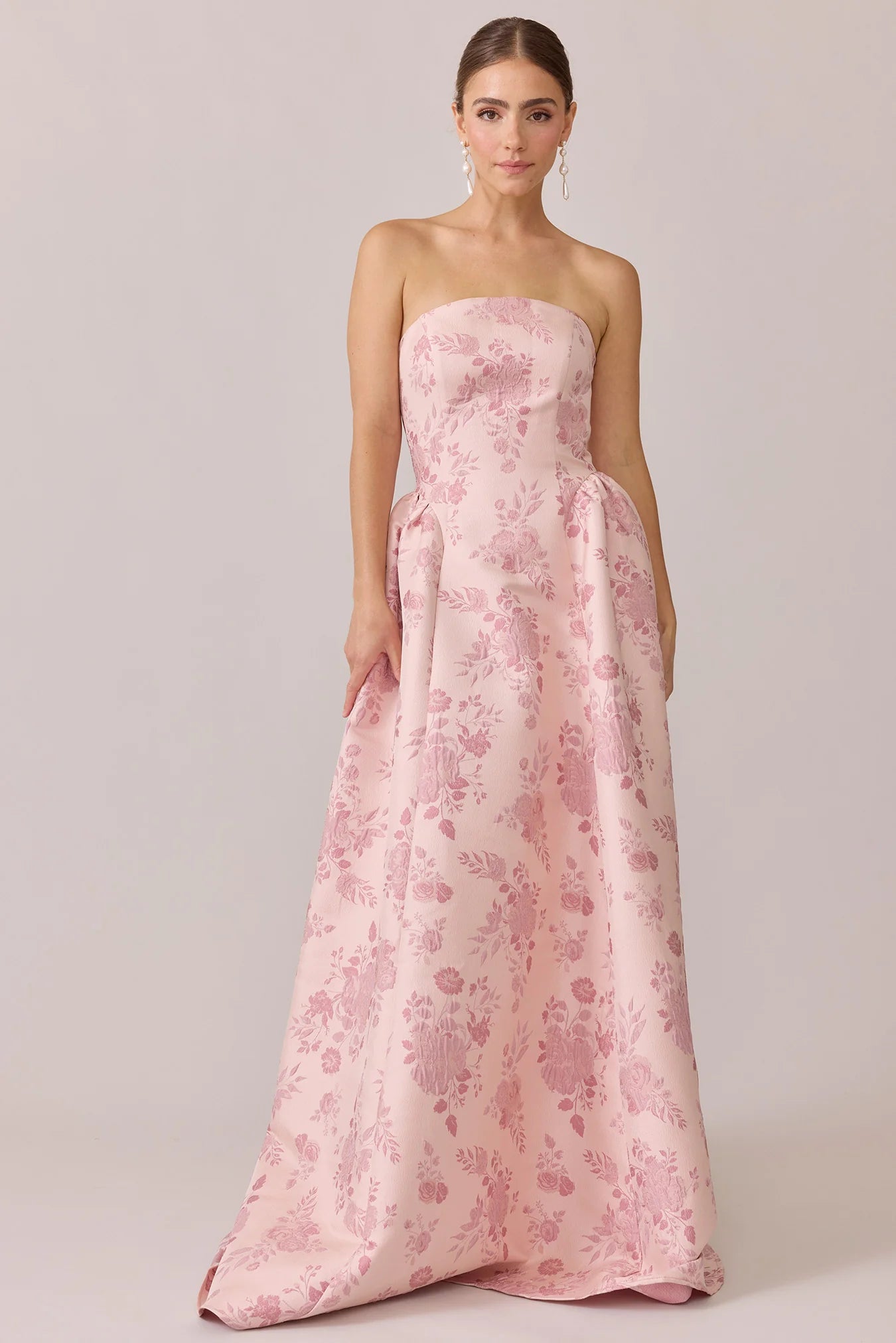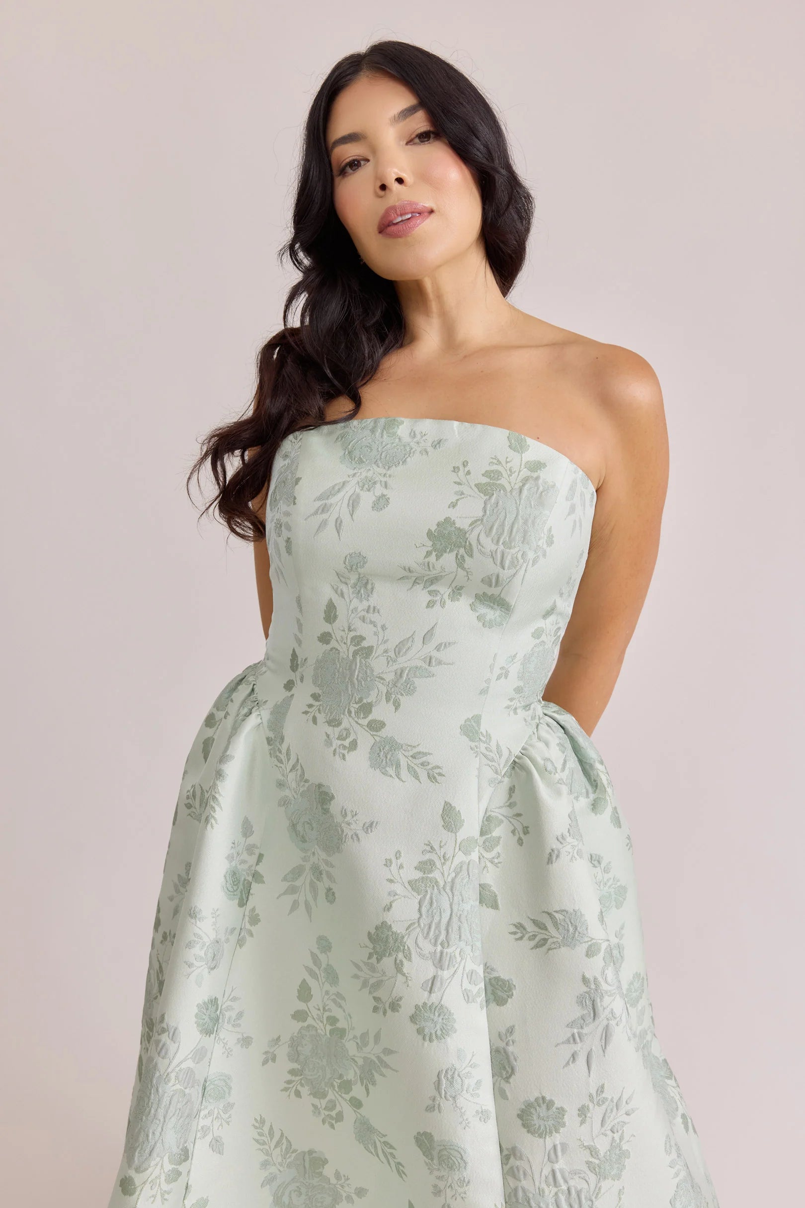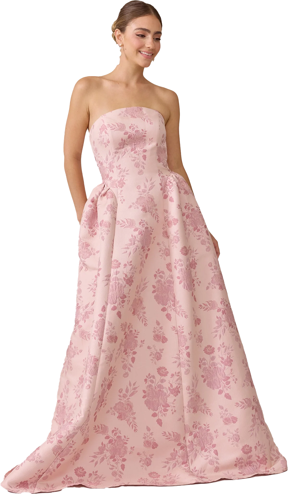 Our Ellapink Jacquard Dress is a showstopping, basque-waist style. With a rounded neckline and pleats on the side of the skirt, Sofia has all the on-trend details to stand out.