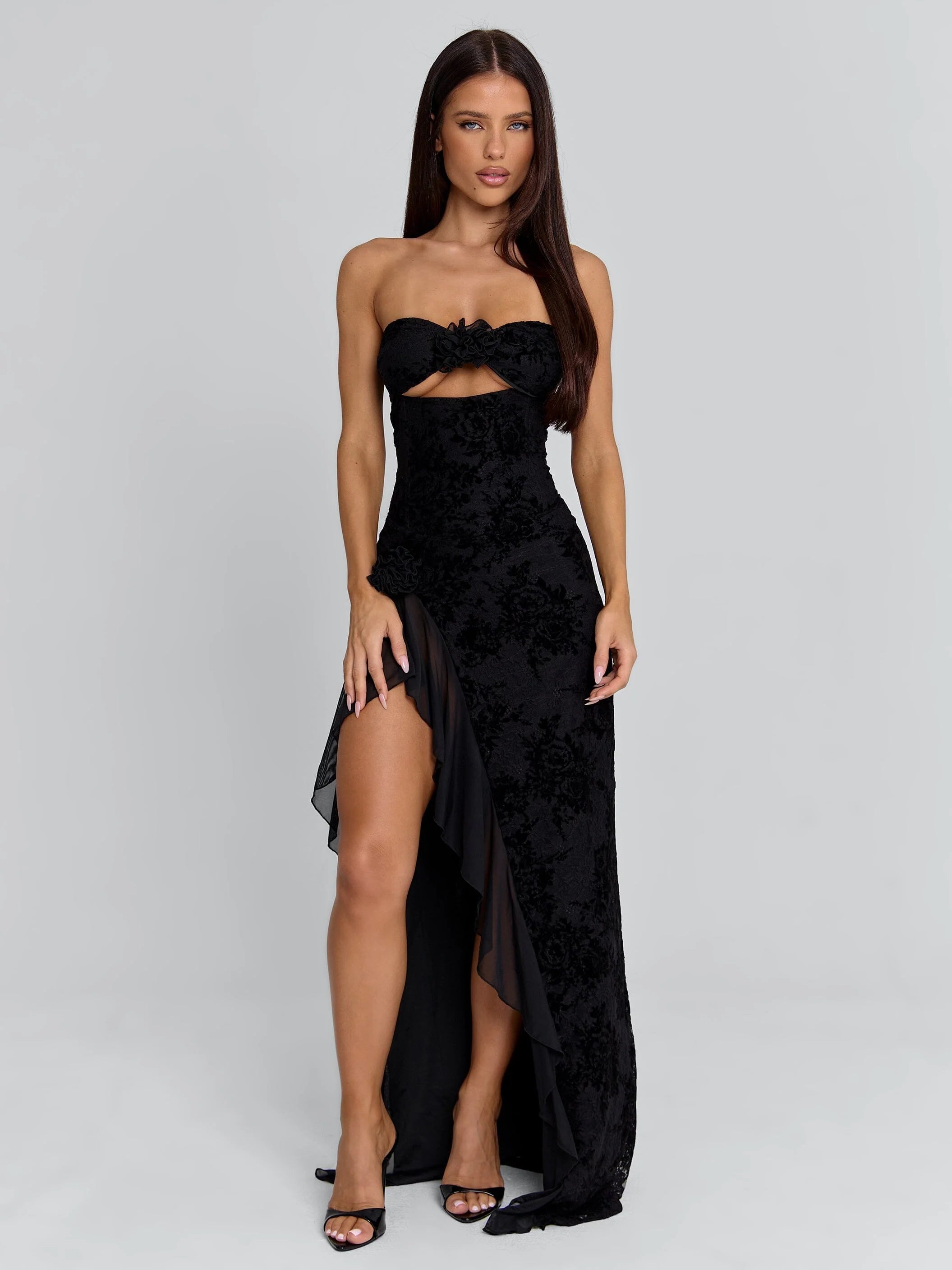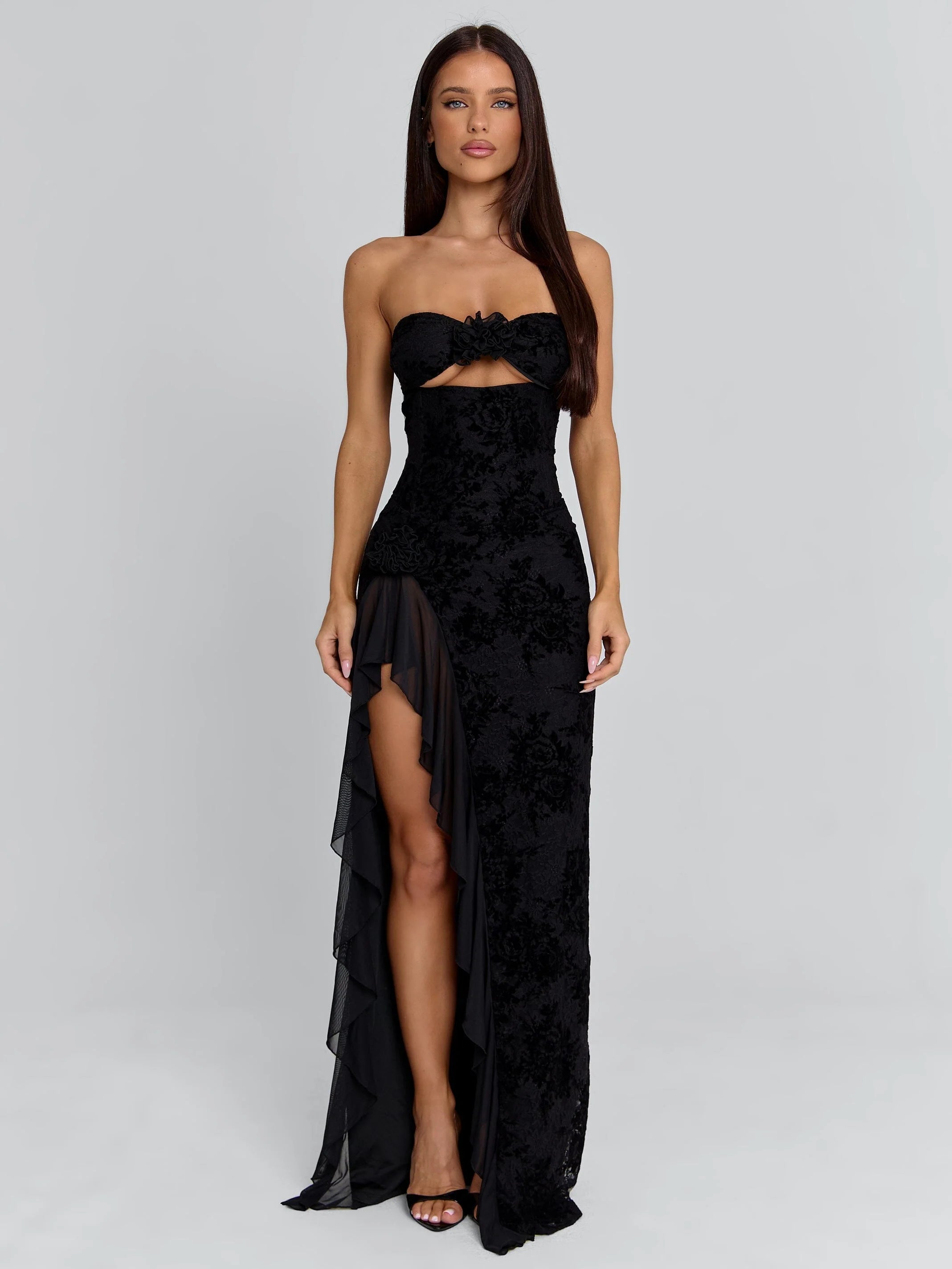 Crafted from lace and lined in soft polyknit, Julian features a strapless neckline with a delicate floral detail at the centre. The fitted bodice flows into a full maxi skirt with a high thigh split and soft flounce, adding movement while keeping the look refined.