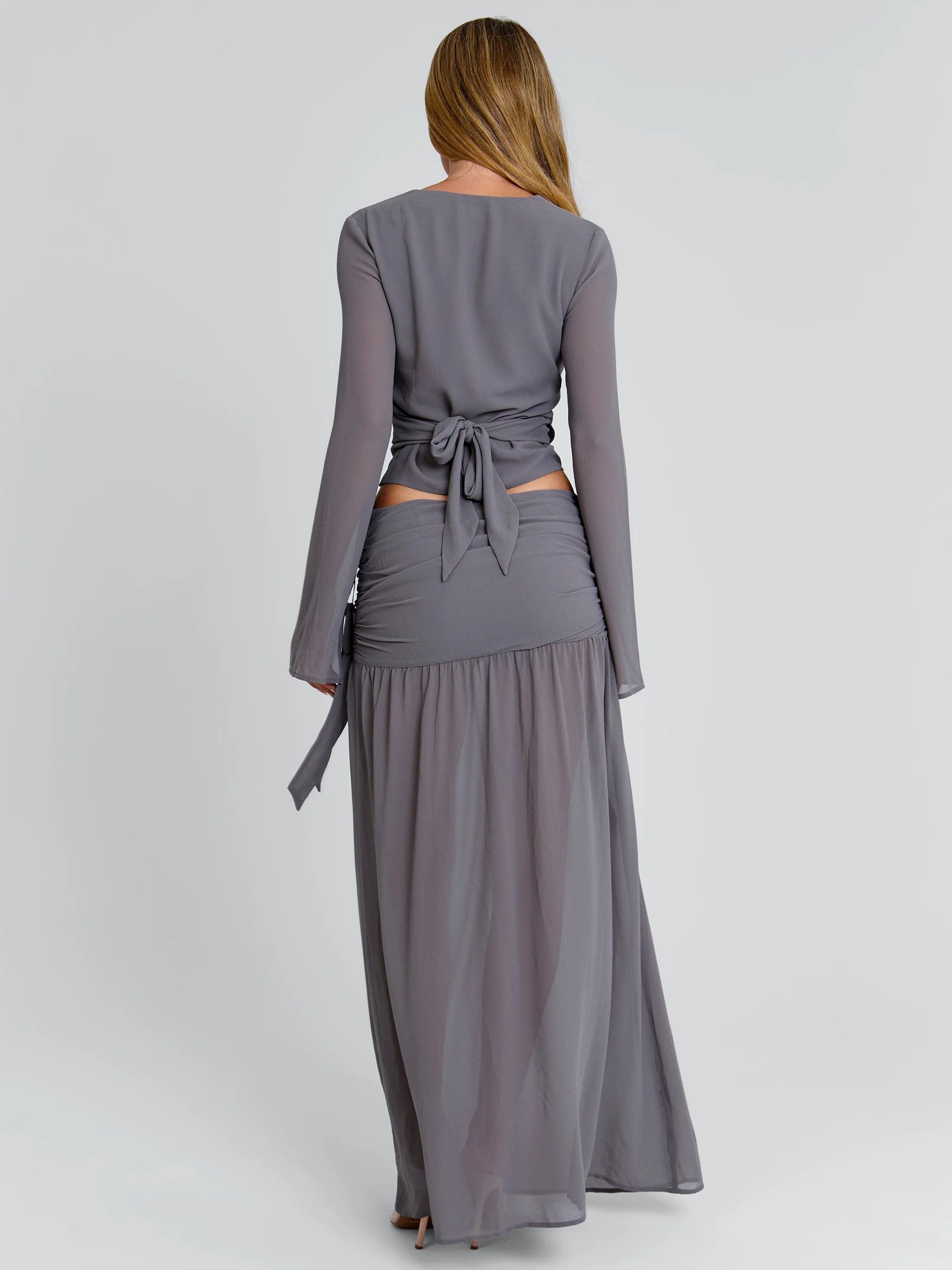 Our Livvie Maxi Skirt in Grey is cut from sheer georgette and designed to sit comfortably on the waist with a softly gathered waistband. Falling into a full-length silhouette, the skirt features a thigh-high split, creating an elegant yet sultry effect. Finished with a zip closure for a clean fit, this skirt flows effortlessly with every step.