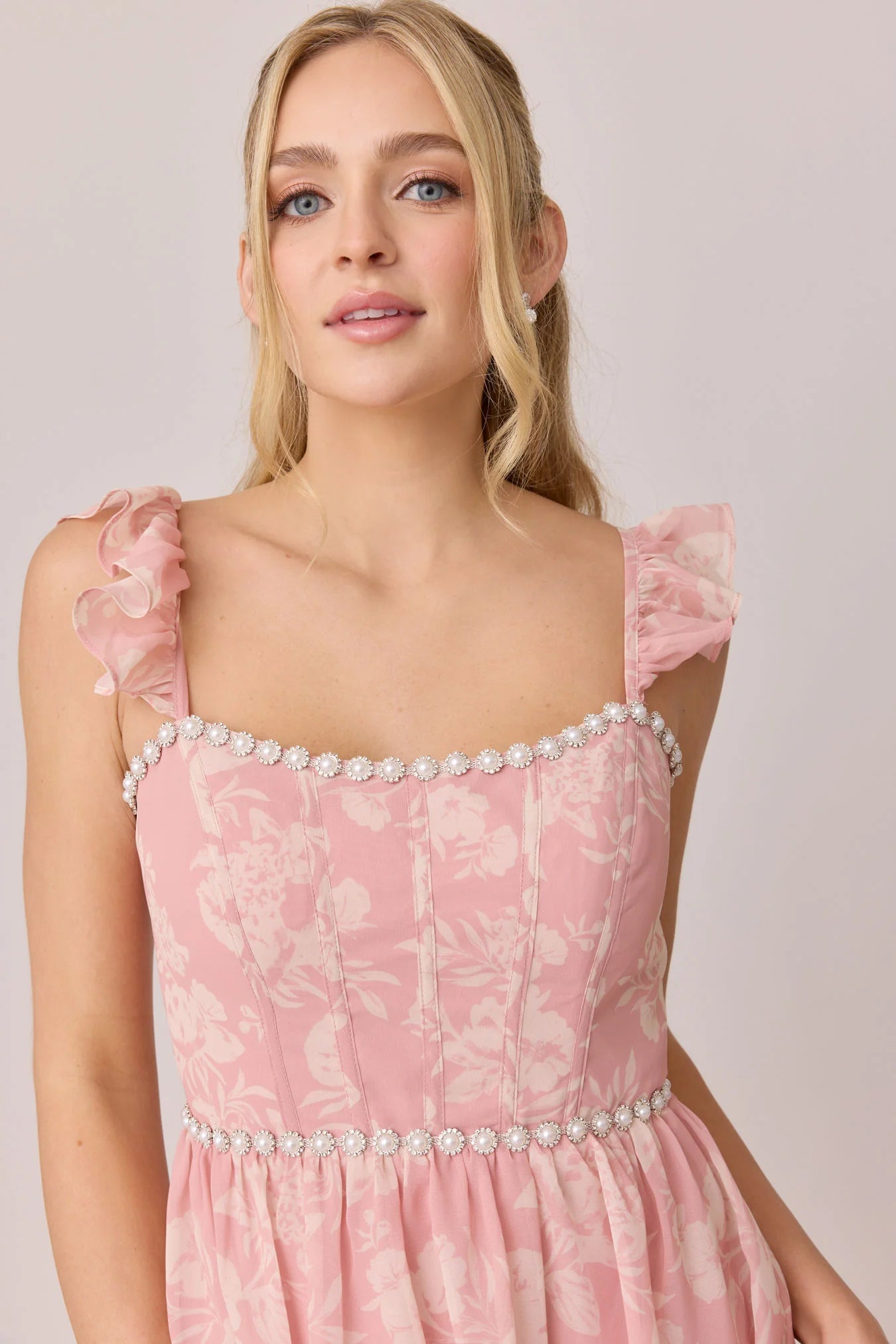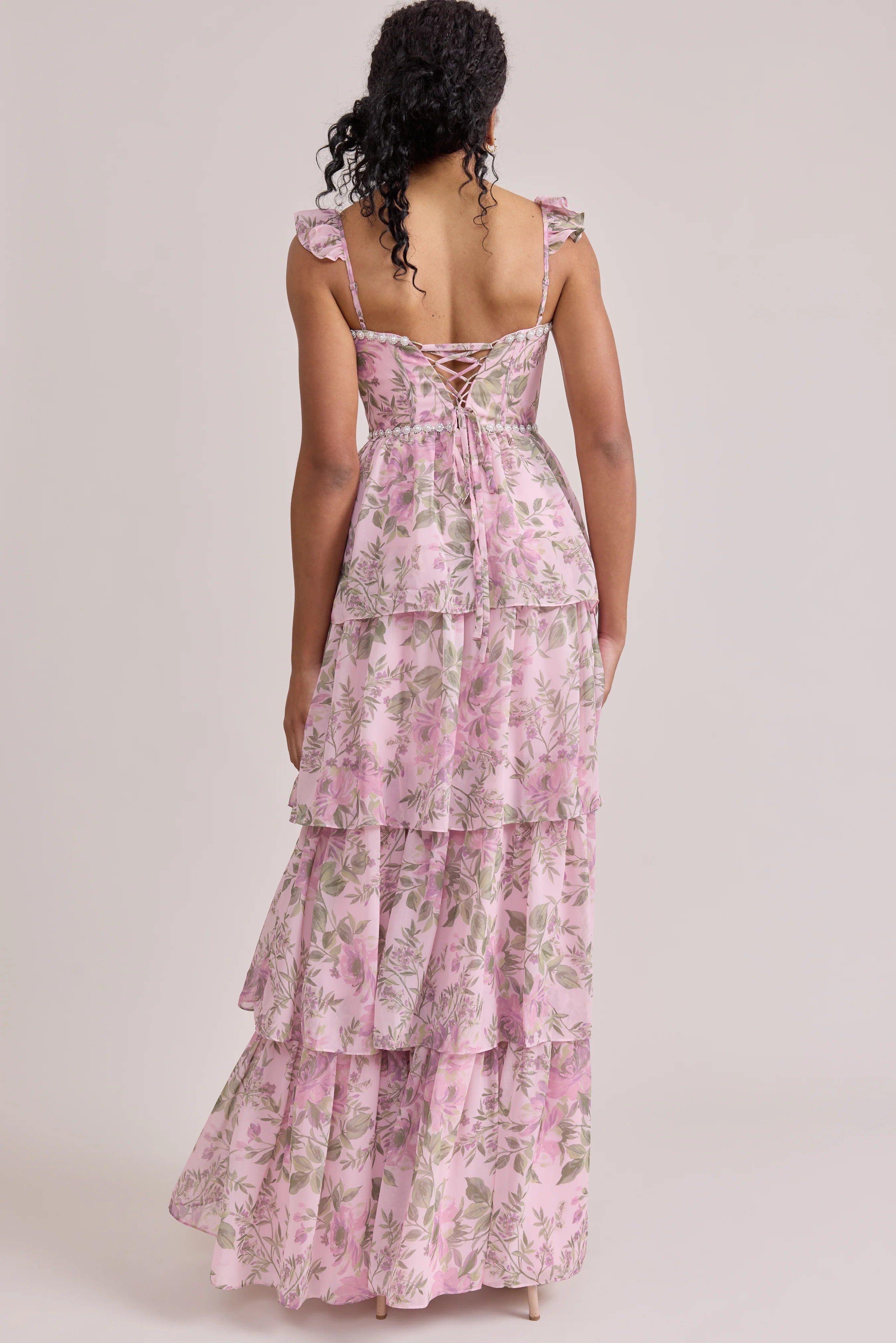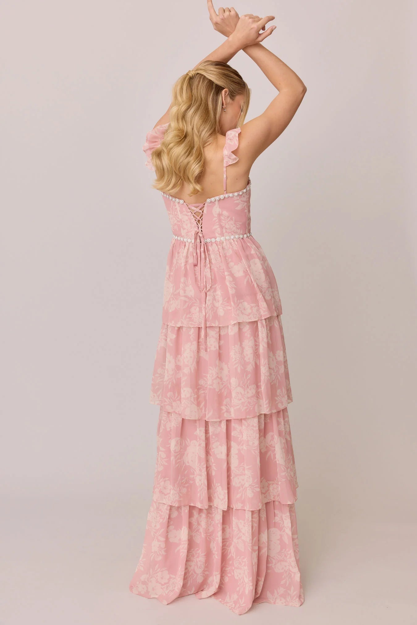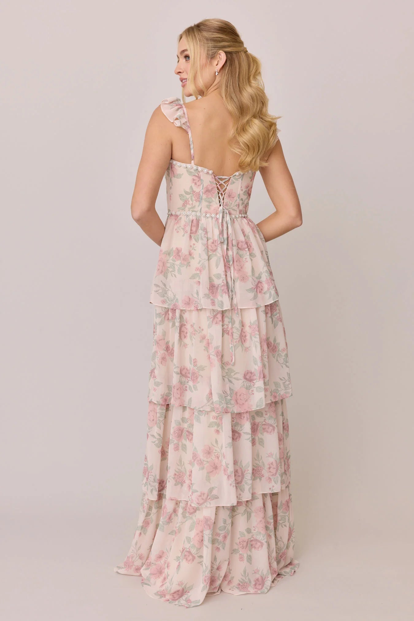 Have the standout style of the garden party in our Ellapink Luxe Chiffon Floral Print Dress! We've added glam to Ellapink with an embellished waist and neckline. With dainty ruffle straps, a tiered skirt, a corset bodice, and a lace-up back - Ellapink has all the trending features to turn heads.