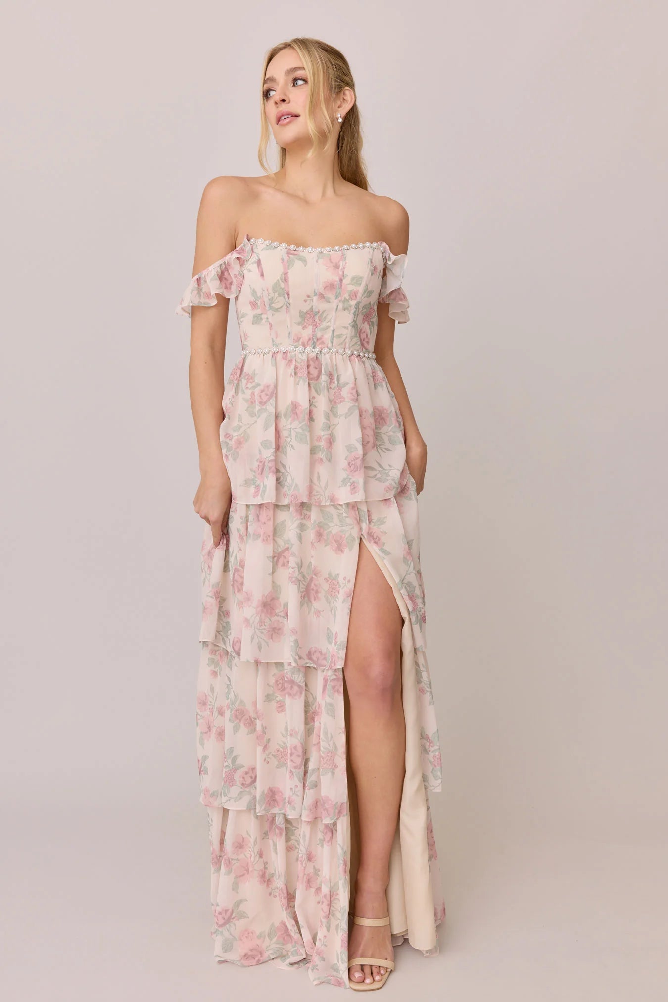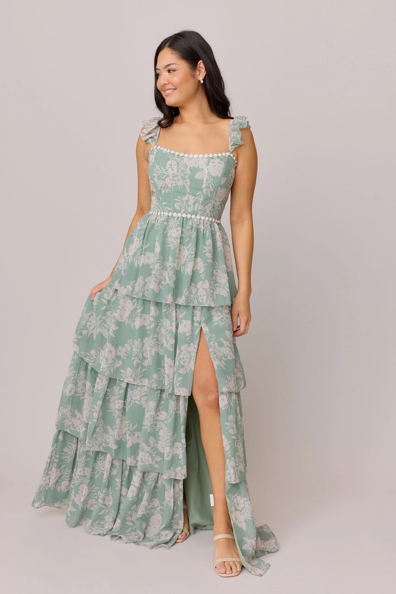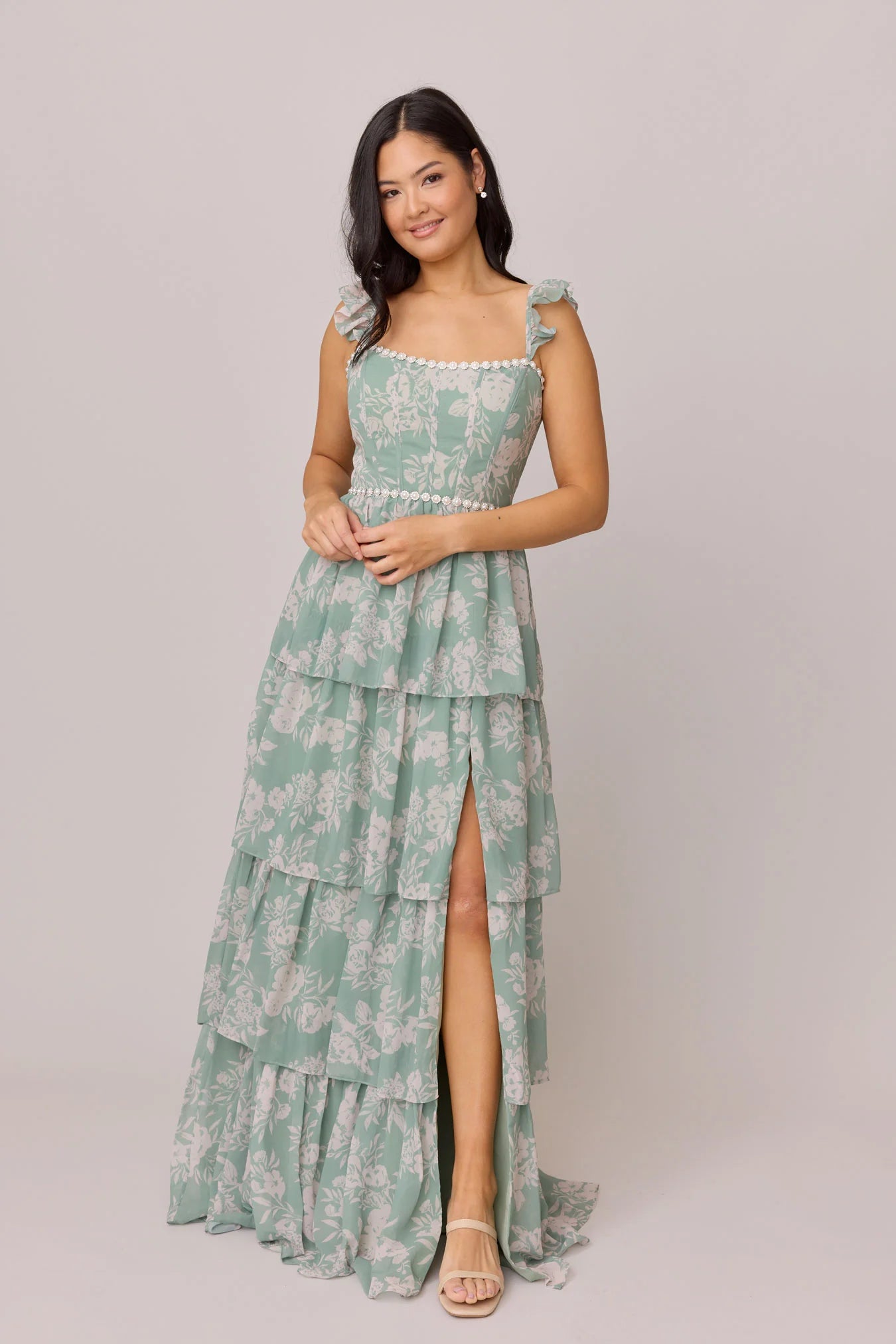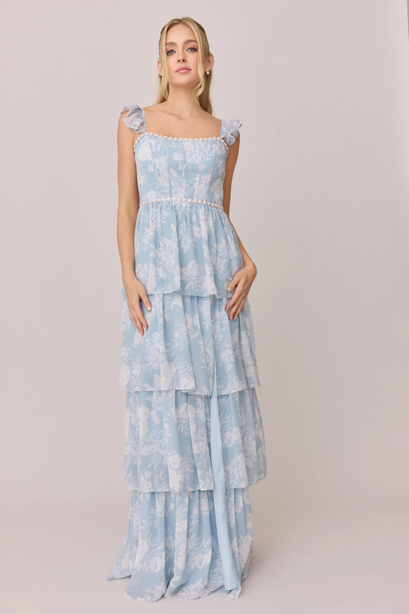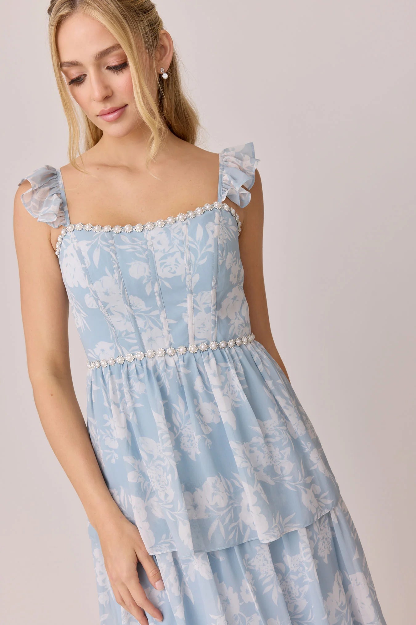 Have the standout style of the garden party in our Ellapink Luxe Chiffon Floral Print Dress! We've added glam to Ellapink with an embellished waist and neckline. With dainty ruffle straps, a tiered skirt, a corset bodice, and a lace-up back - Ellapink has all the trending features to turn heads.