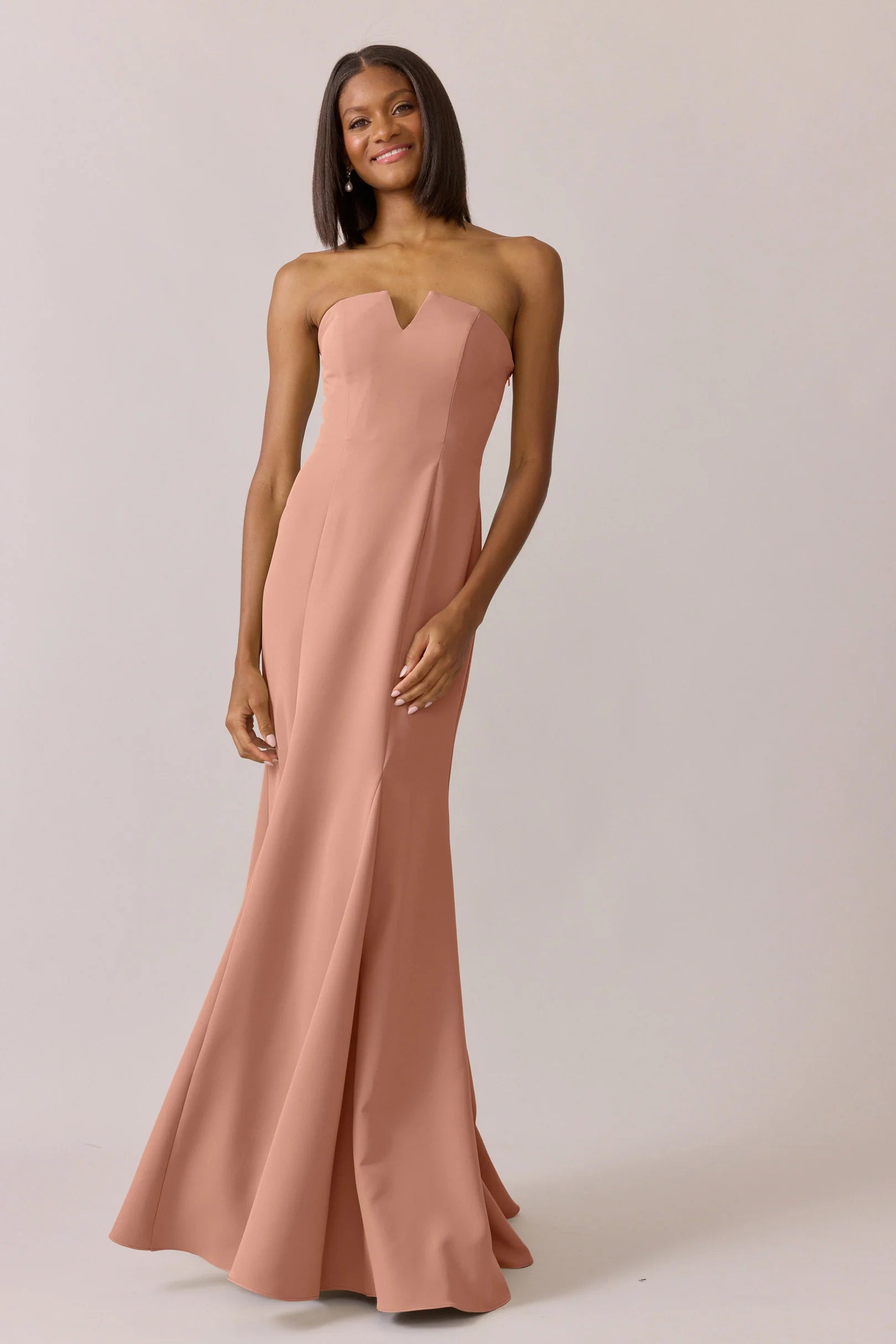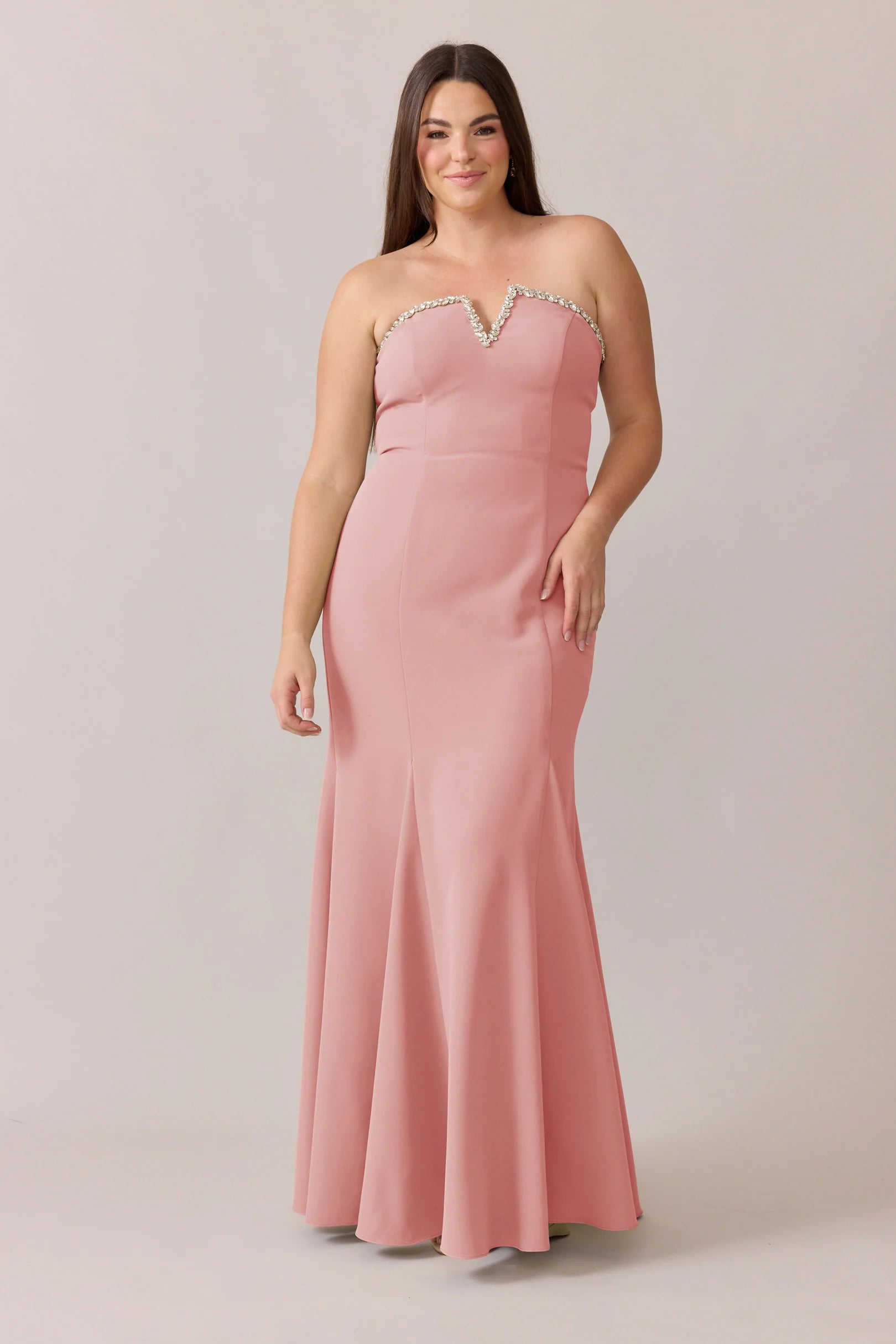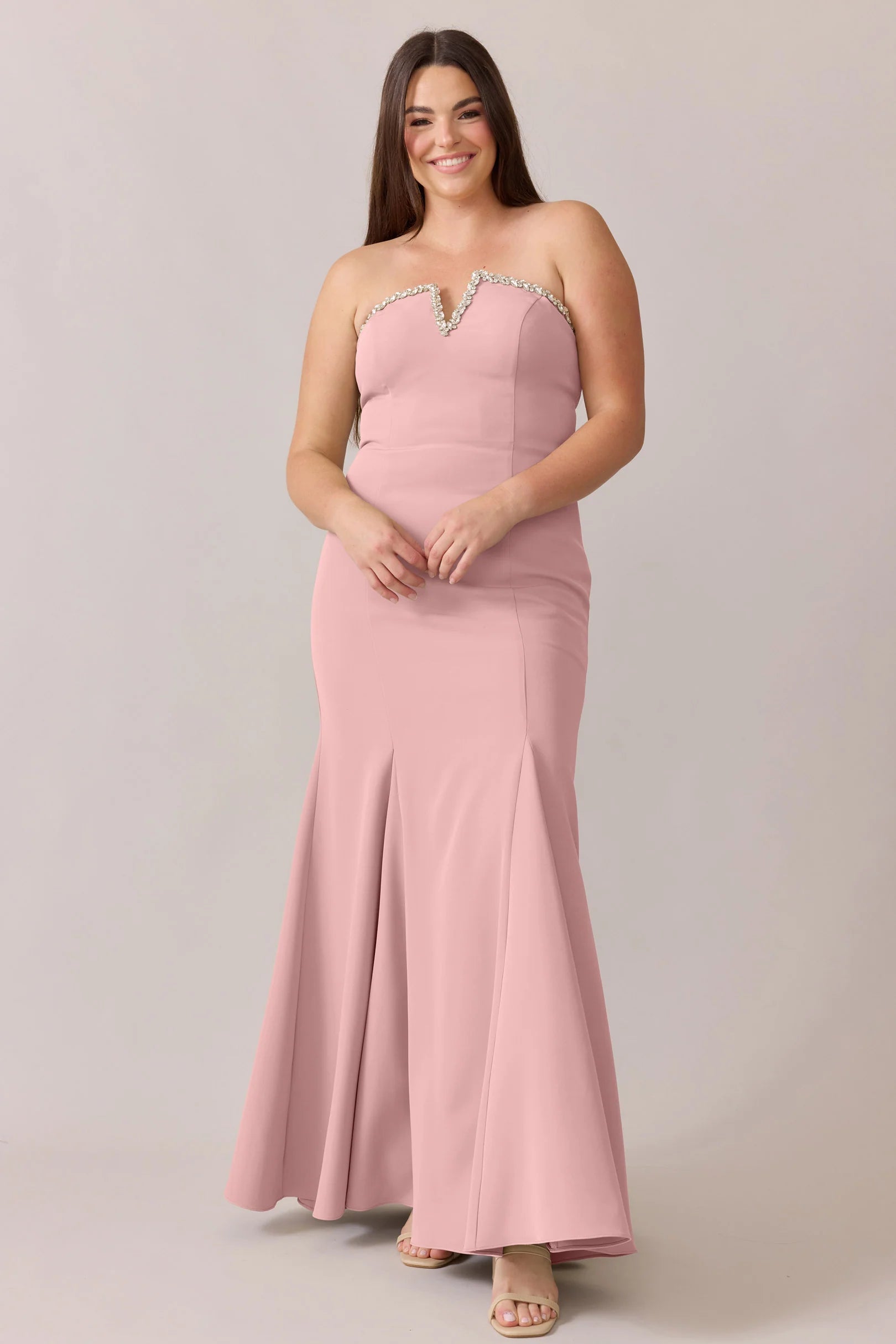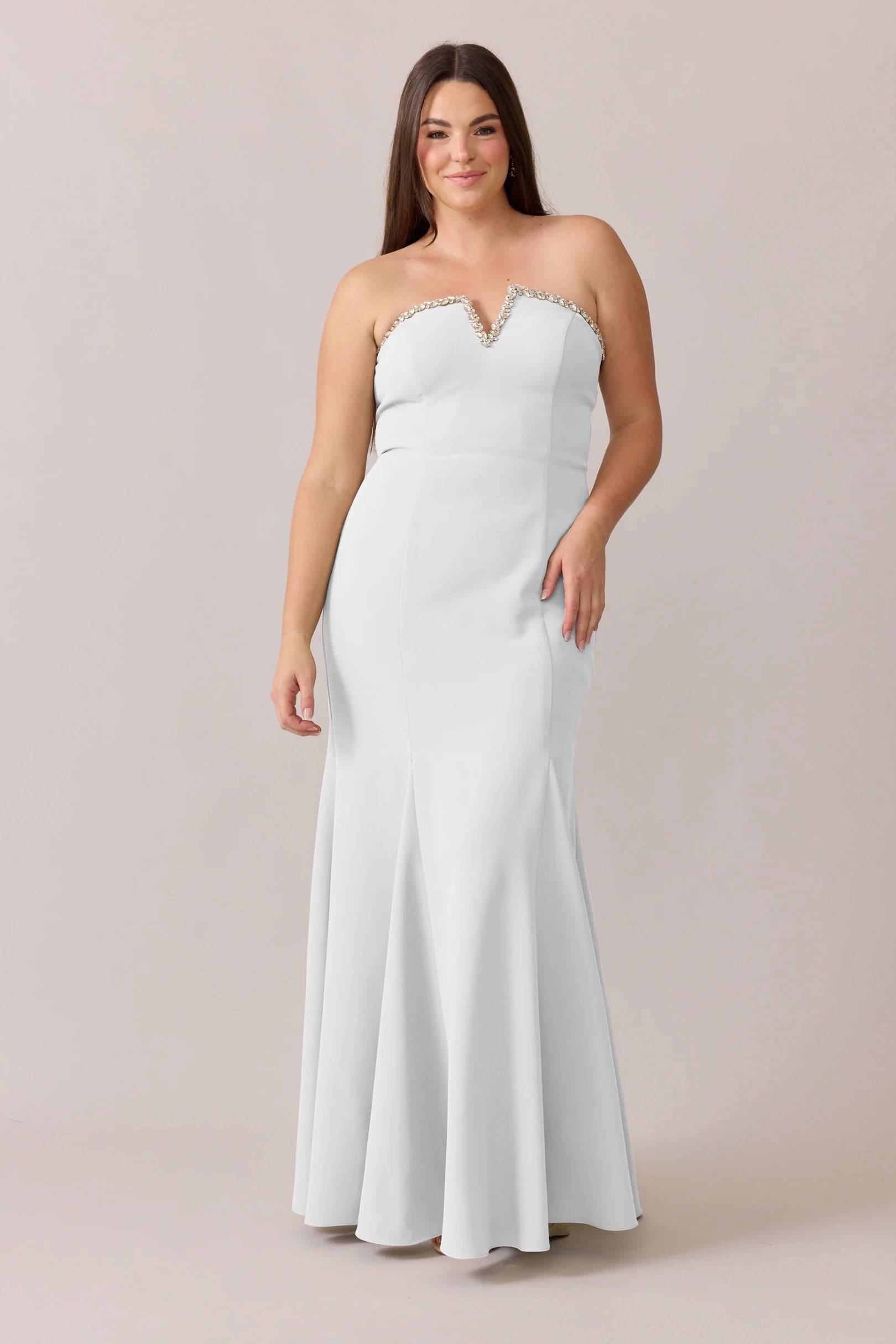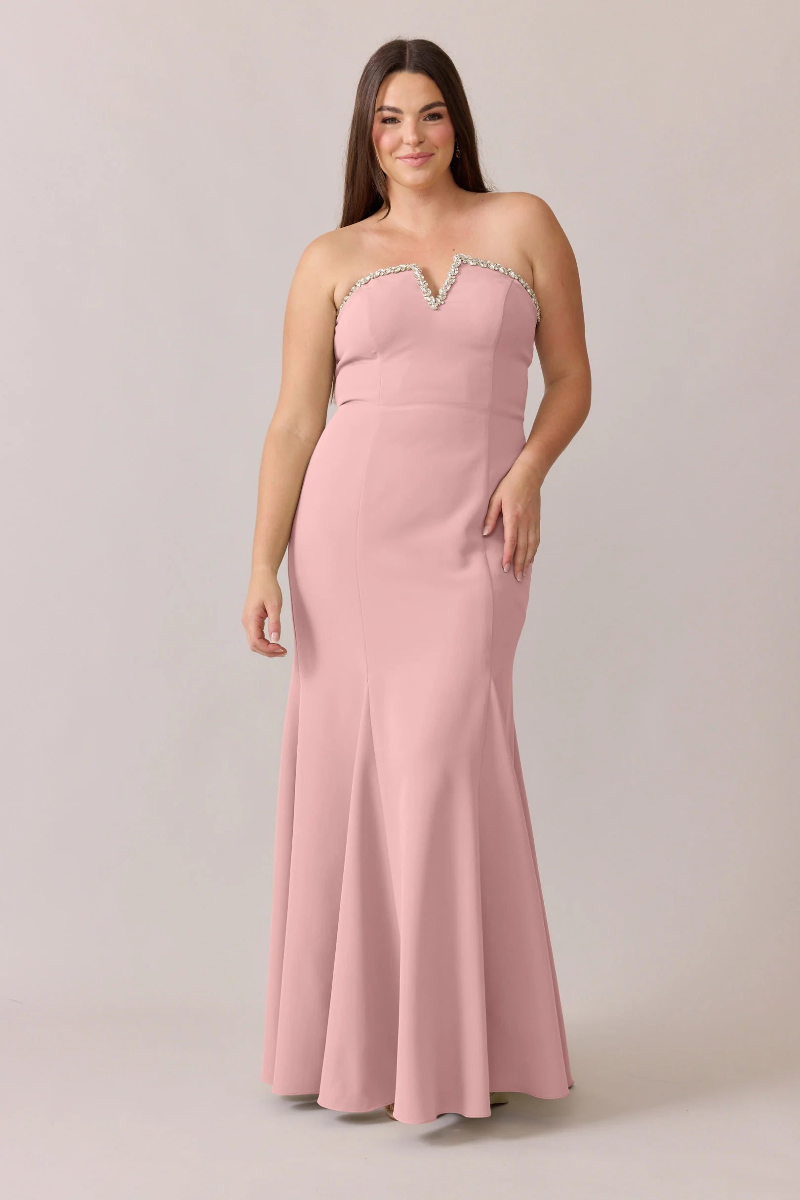 Understated, sculpted, and so refined. The Ellapink Luxe Crepe Dress stuns with a sleek mermaid silhouette, strapless V-notch neckline embellished with jewels, and a flowing godet pleated skirt that adds just the right amount of drama—without a slit. Built-in cups and boning keep things supported, while the full-length double lining ensures smooth, confident wear from ceremony to celebration.