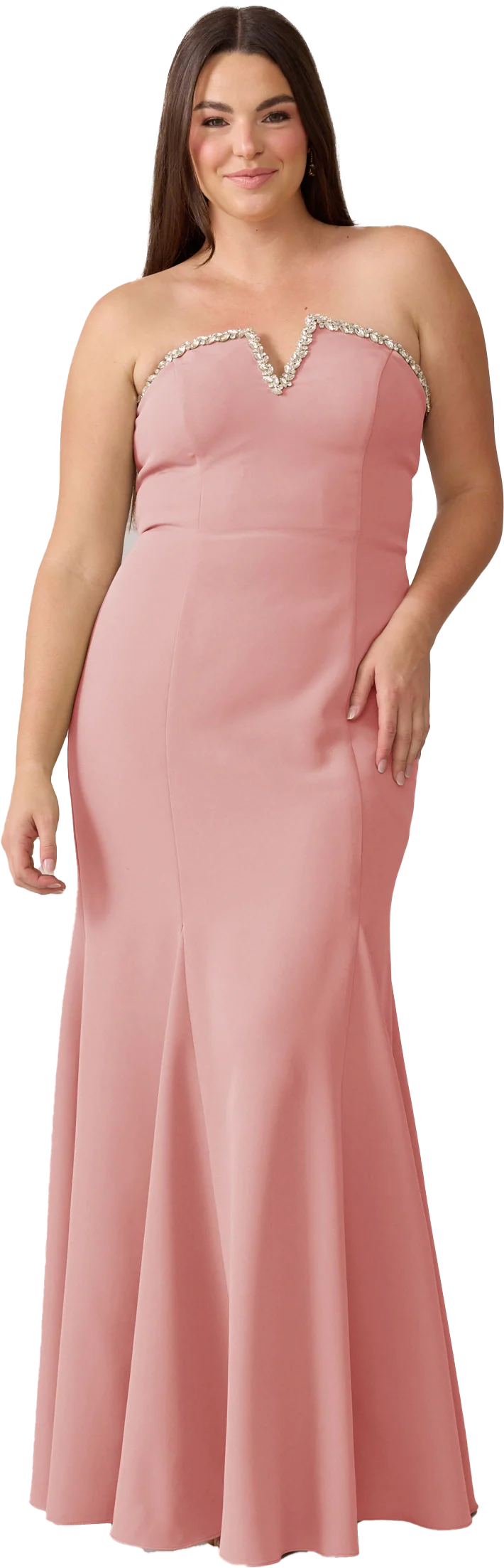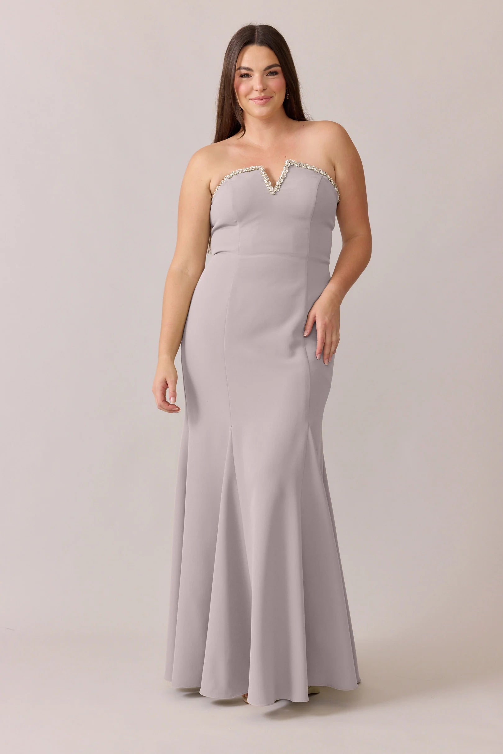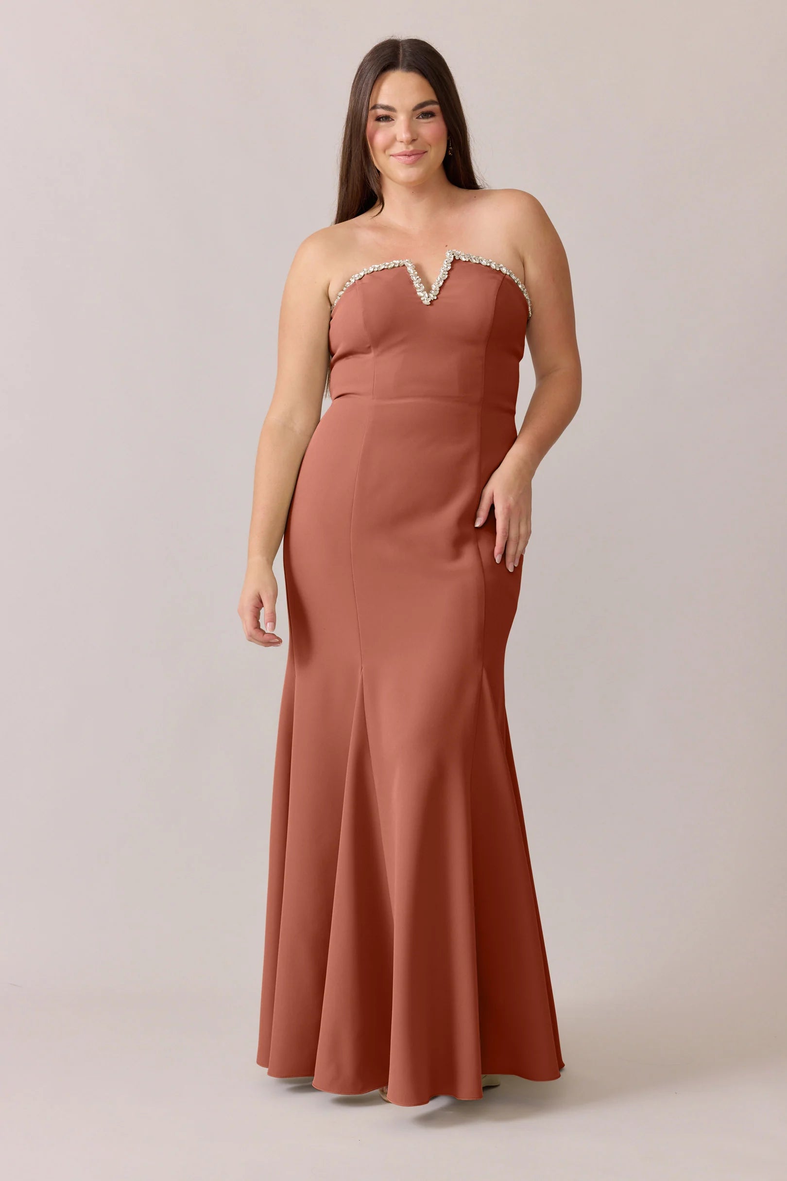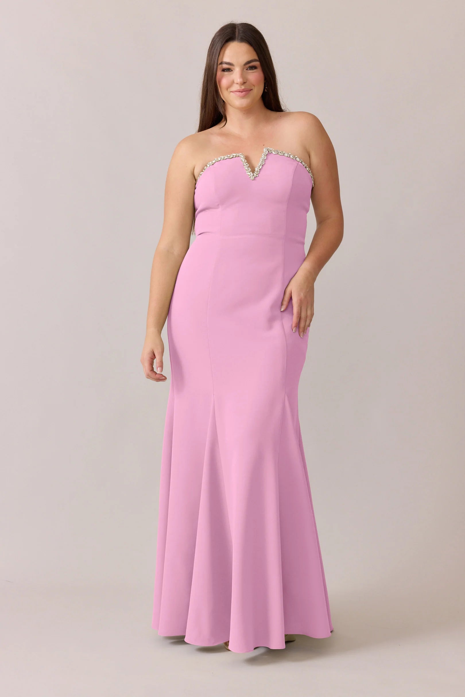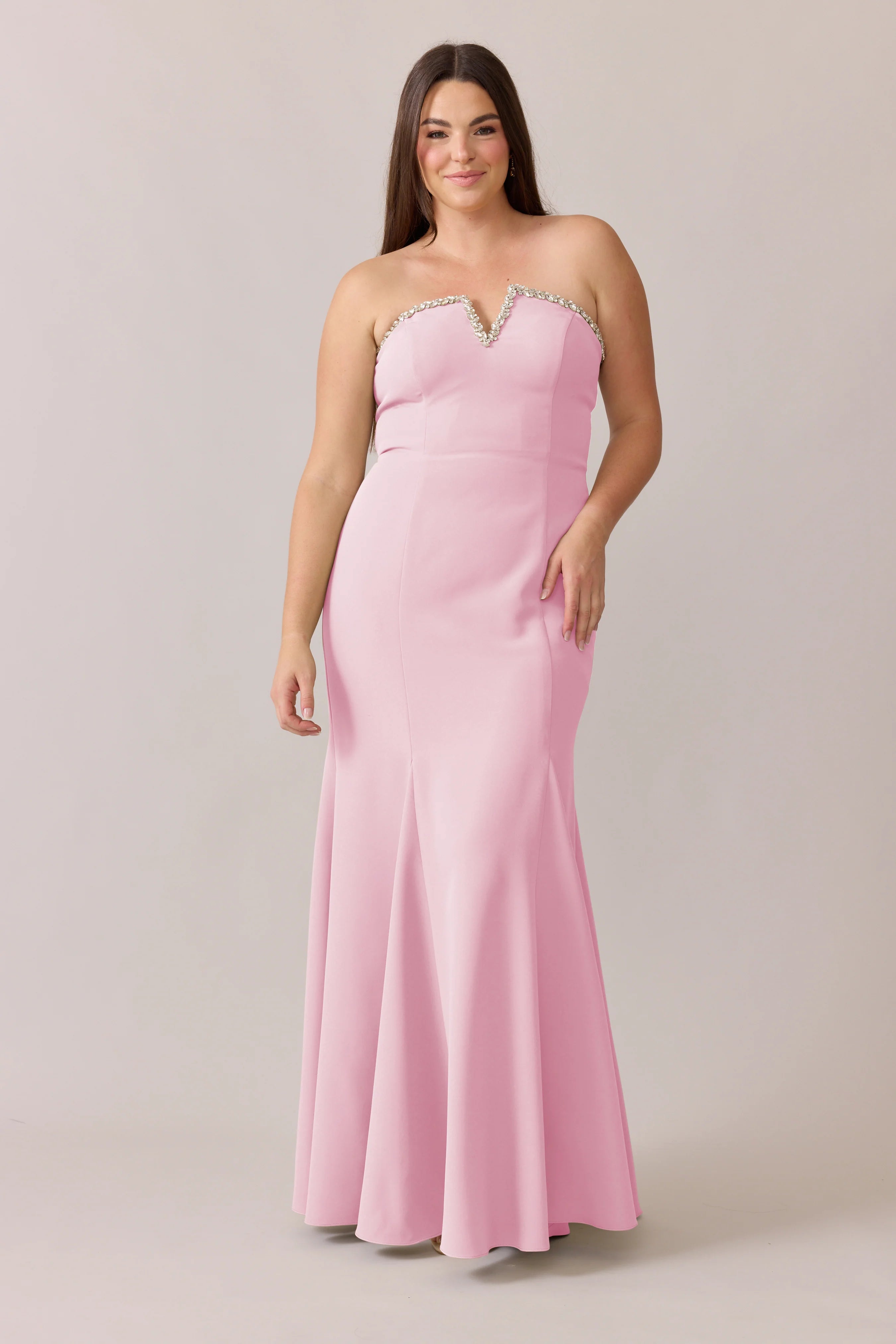 Understated, sculpted, and so refined. The Ellapink Luxe Crepe Dress stuns with a sleek mermaid silhouette, strapless V-notch neckline embellished with jewels, and a flowing godet pleated skirt that adds just the right amount of drama—without a slit. Built-in cups and boning keep things supported, while the full-length double lining ensures smooth, confident wear from ceremony to celebration.
