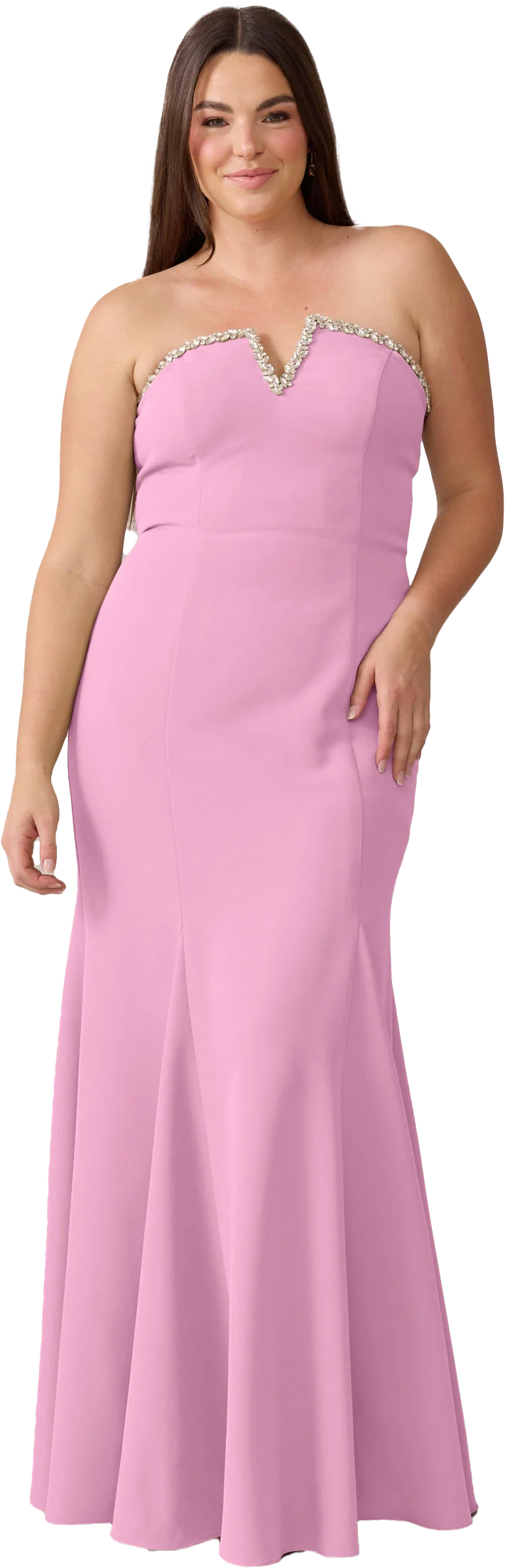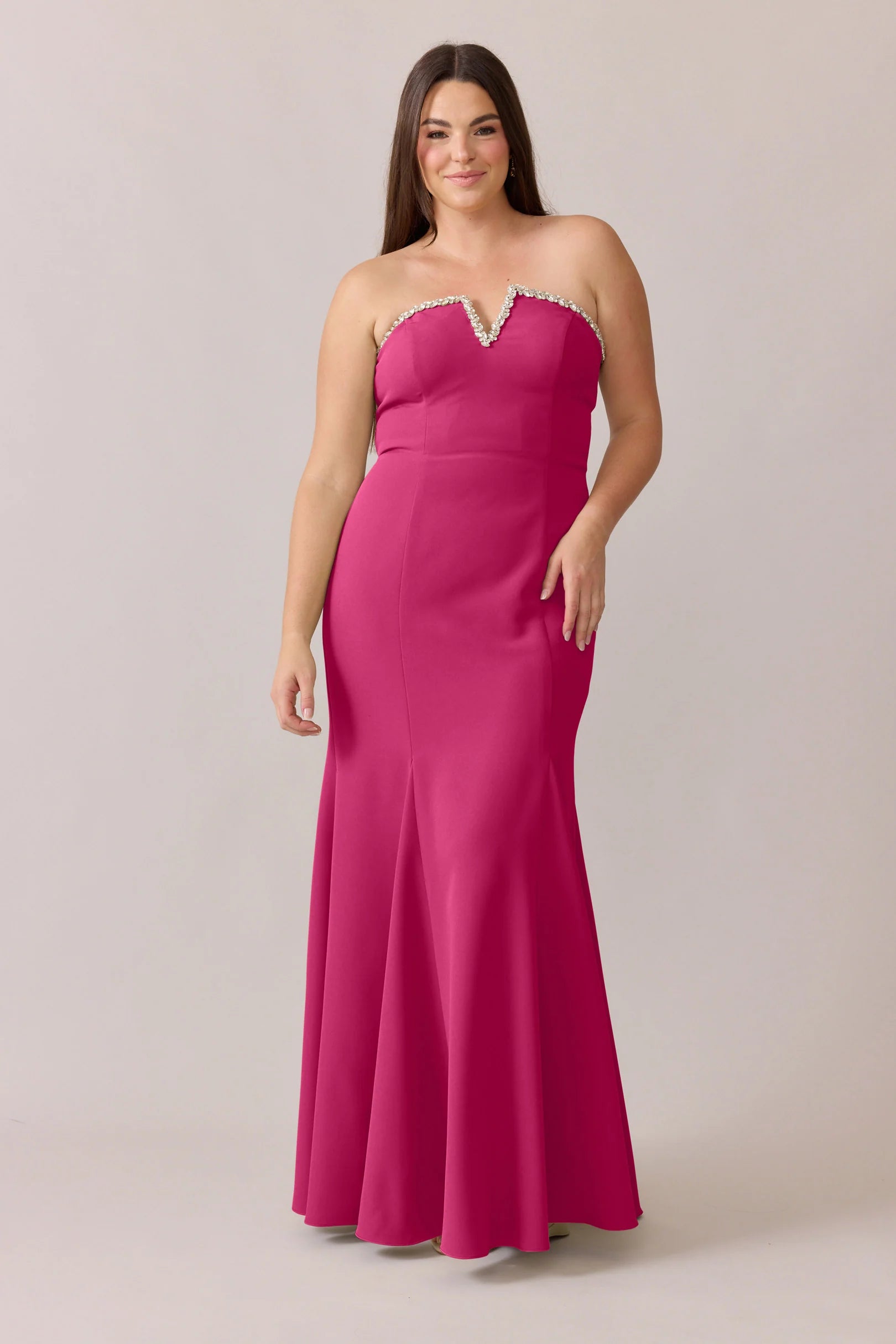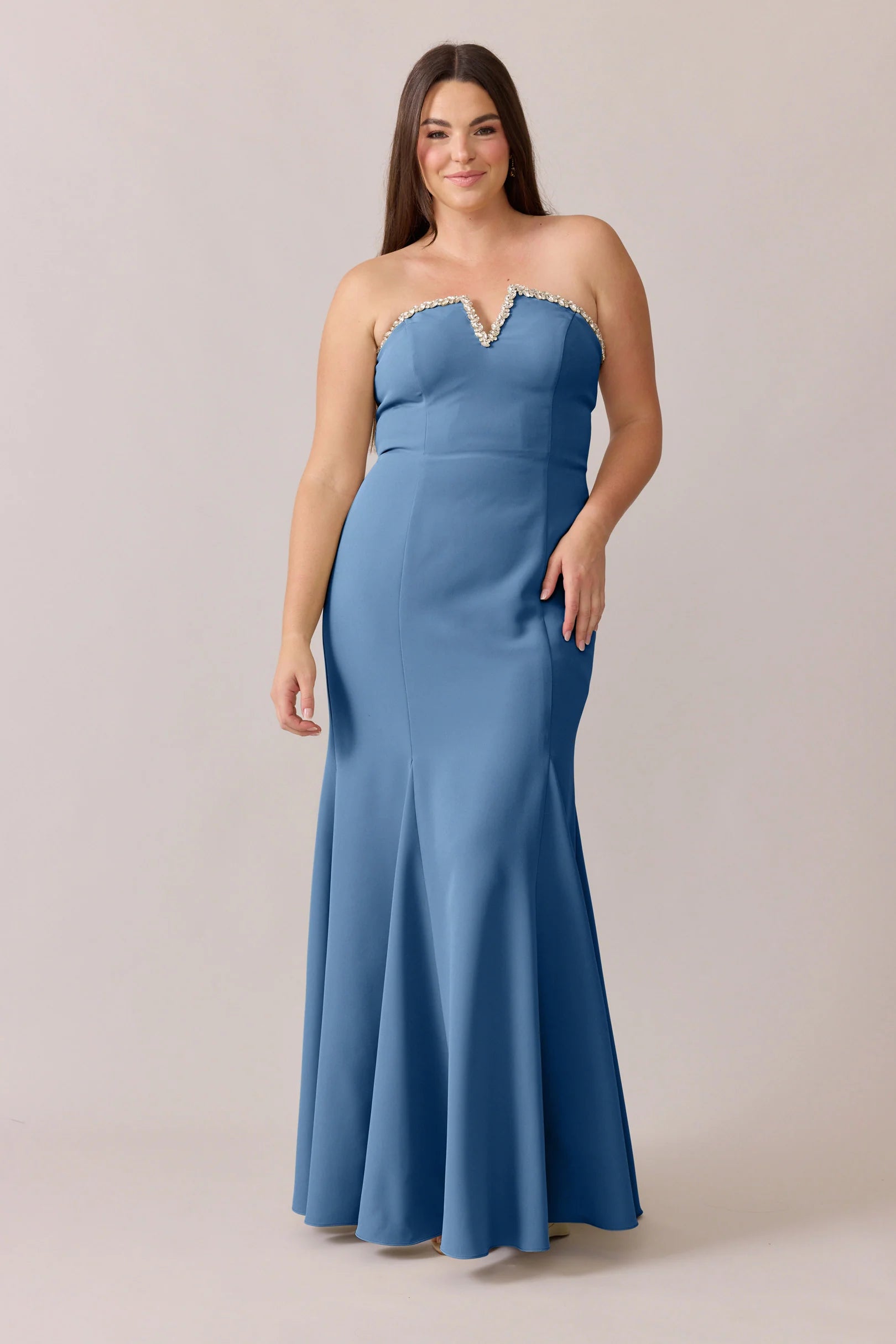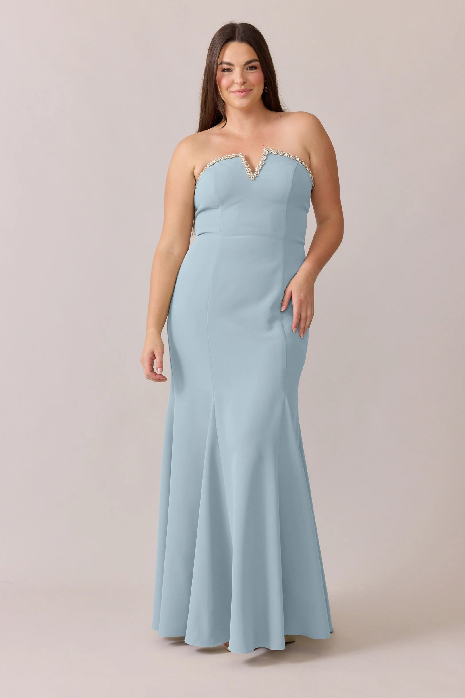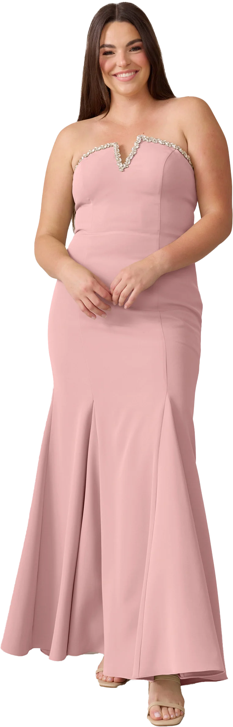Understated, sculpted, and so refined. The Ellapink Luxe Crepe Dress stuns with a sleek mermaid silhouette, strapless V-notch neckline embellished with jewels, and a flowing godet pleated skirt that adds just the right amount of drama—without a slit. Built-in cups and boning keep things supported, while the full-length double lining ensures smooth, confident wear from ceremony to celebration.