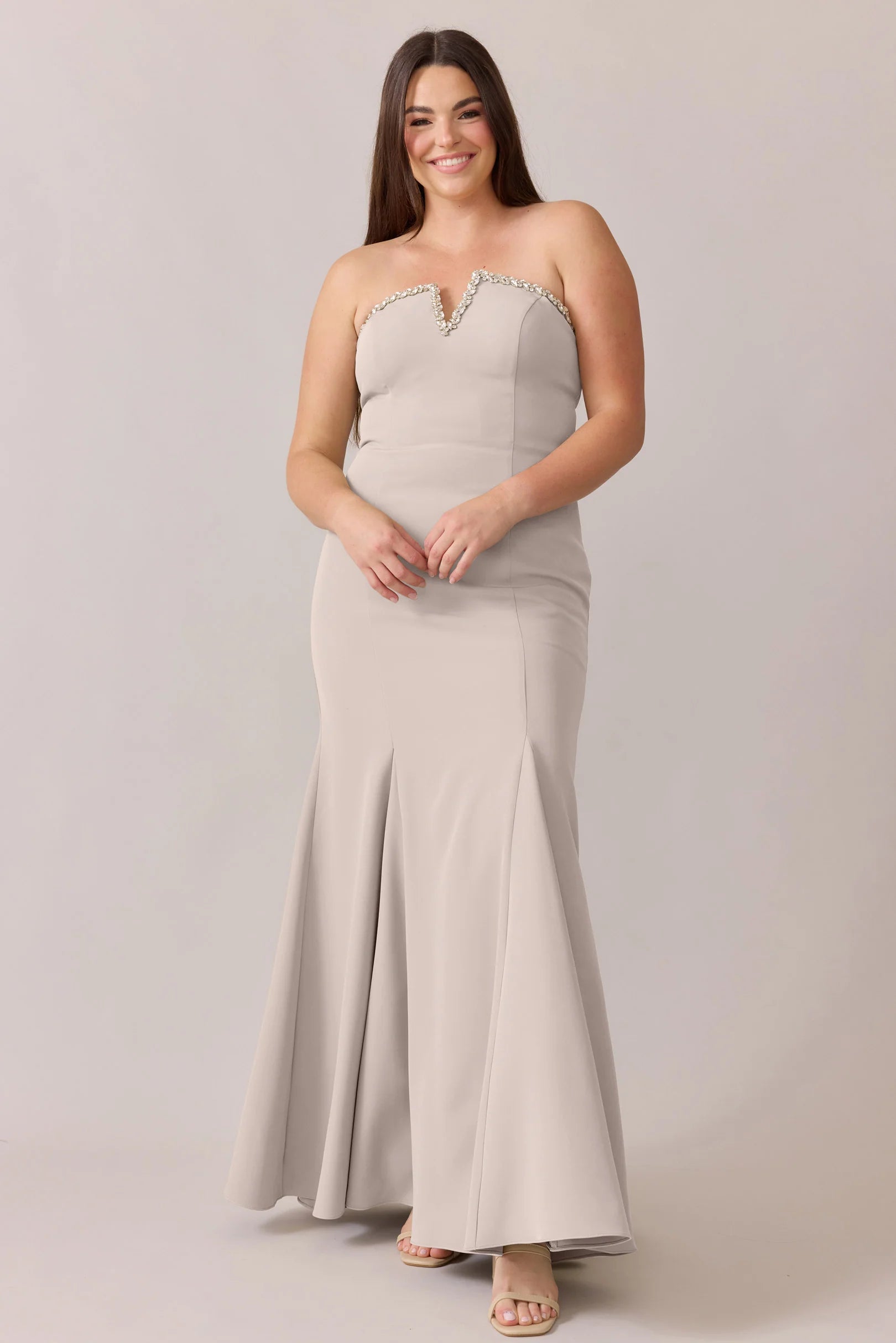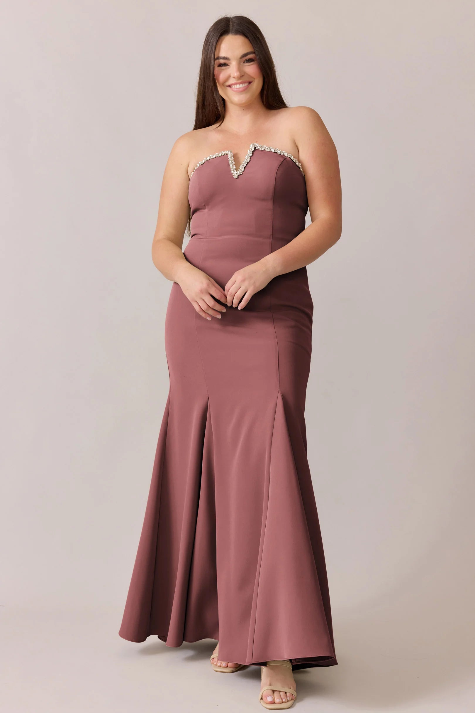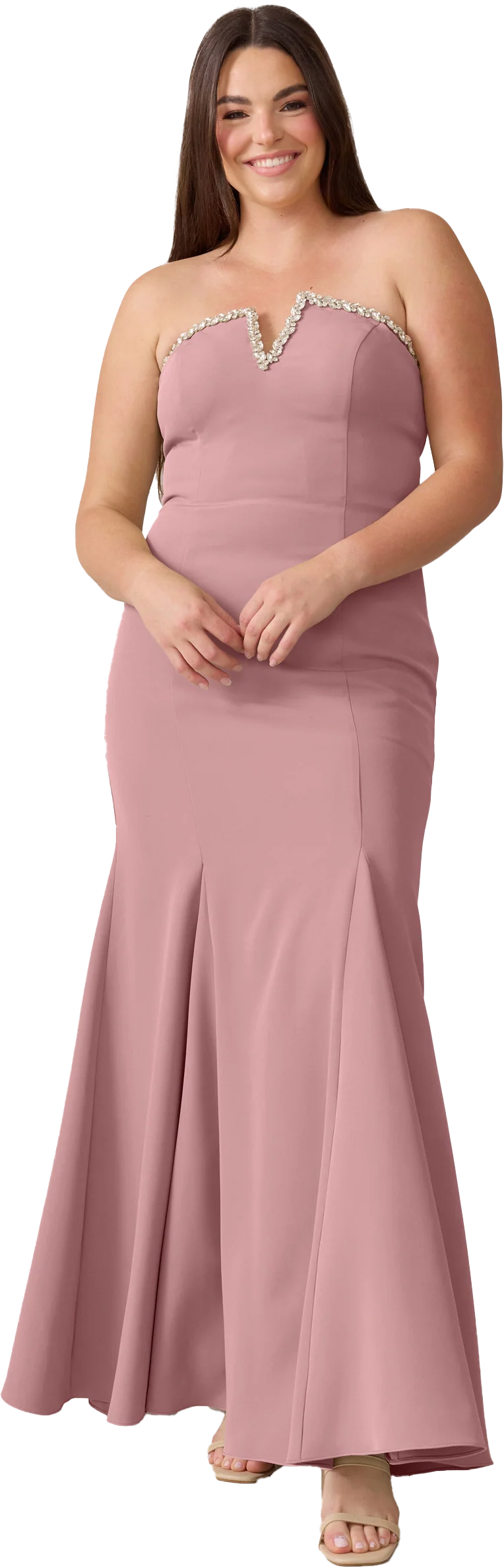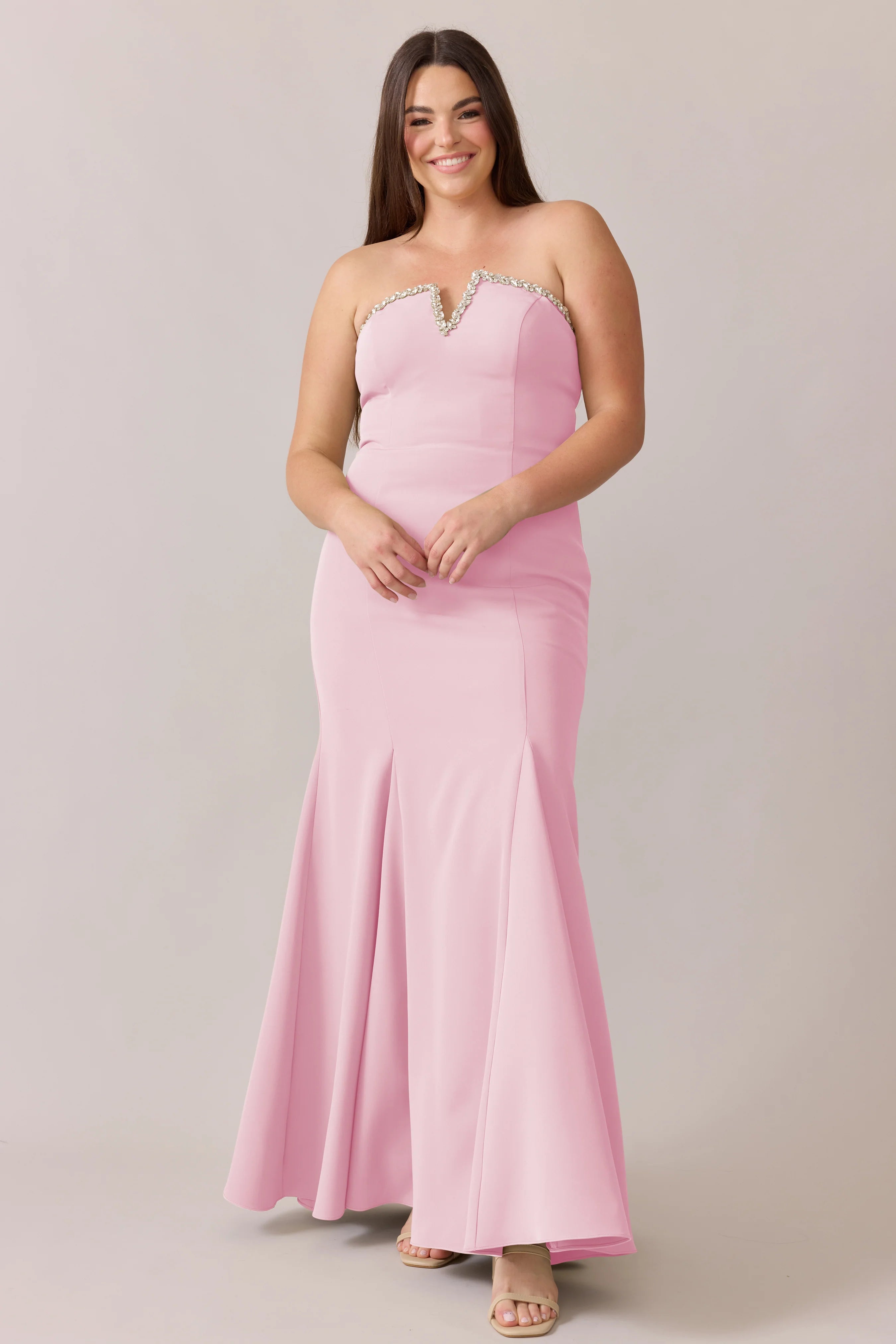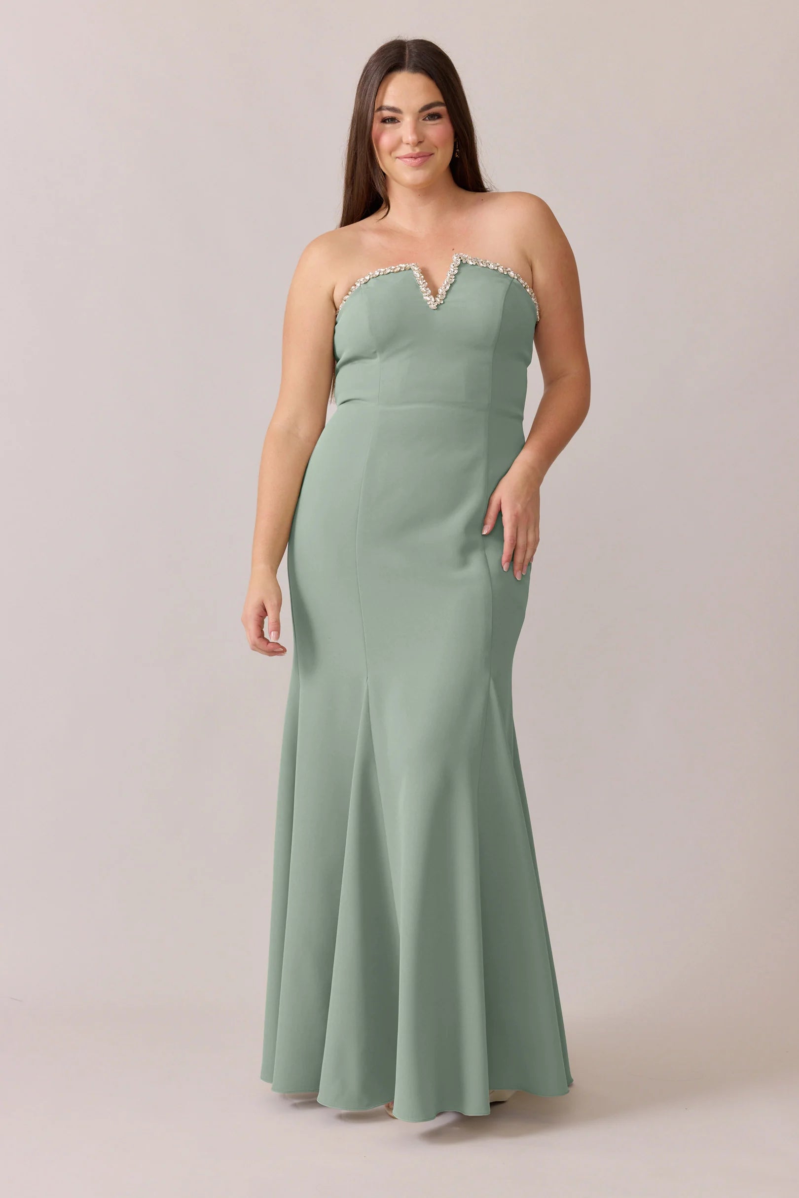 Understated, sculpted, and so refined. The Ellapink Luxe Crepe Dress stuns with a sleek mermaid silhouette, strapless V-notch neckline embellished with jewels, and a flowing godet pleated skirt that adds just the right amount of drama—without a slit. Built-in cups and boning keep things supported, while the full-length double lining ensures smooth, confident wear from ceremony to celebration.