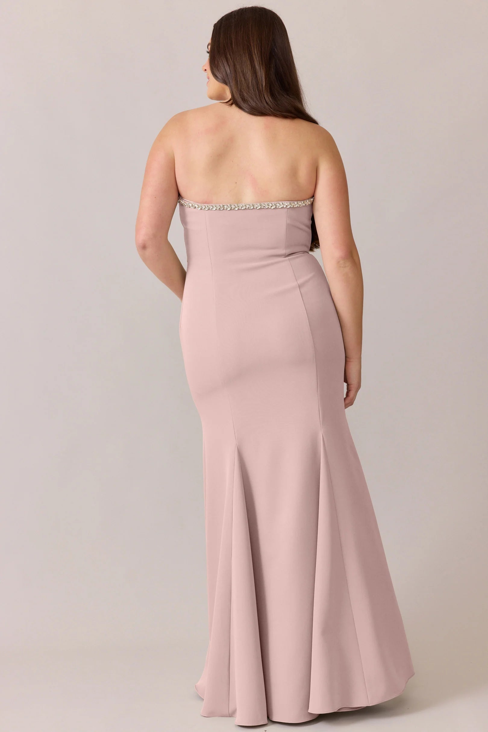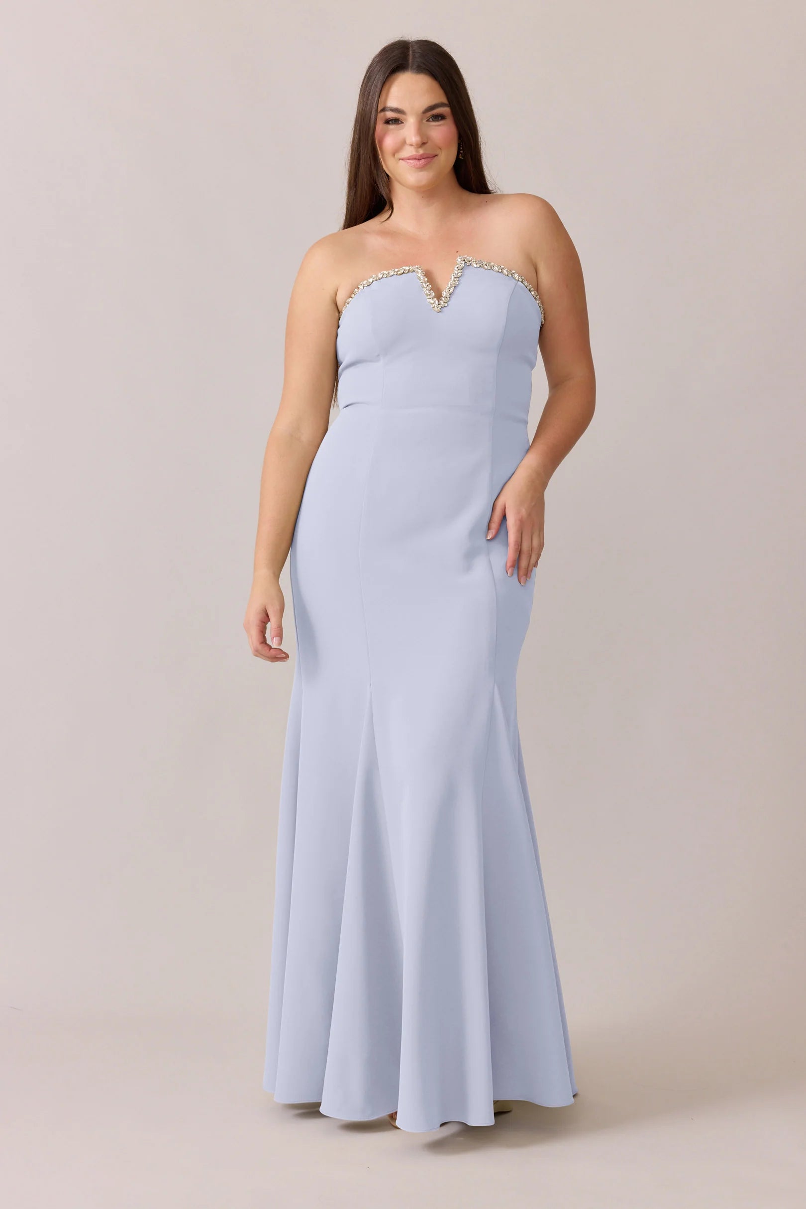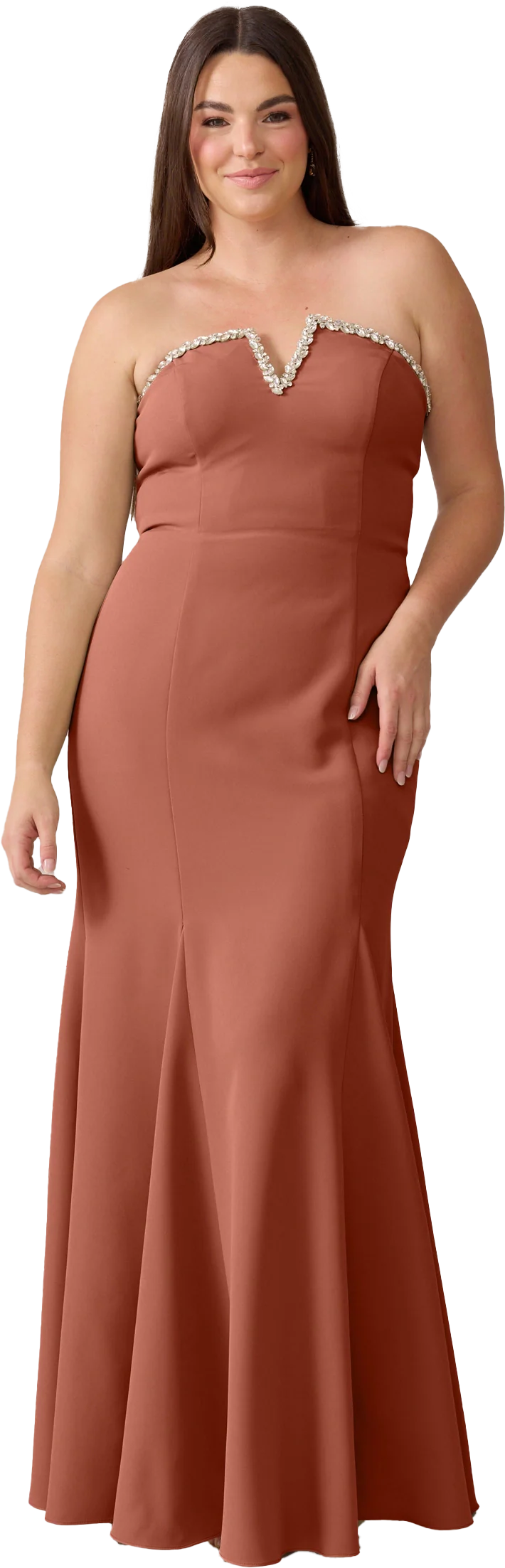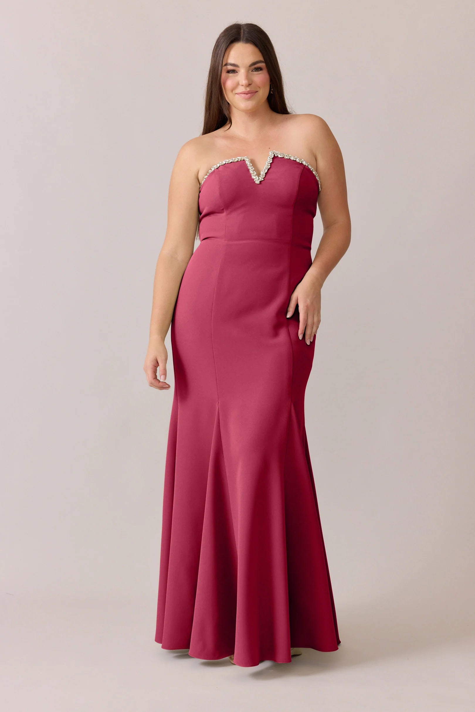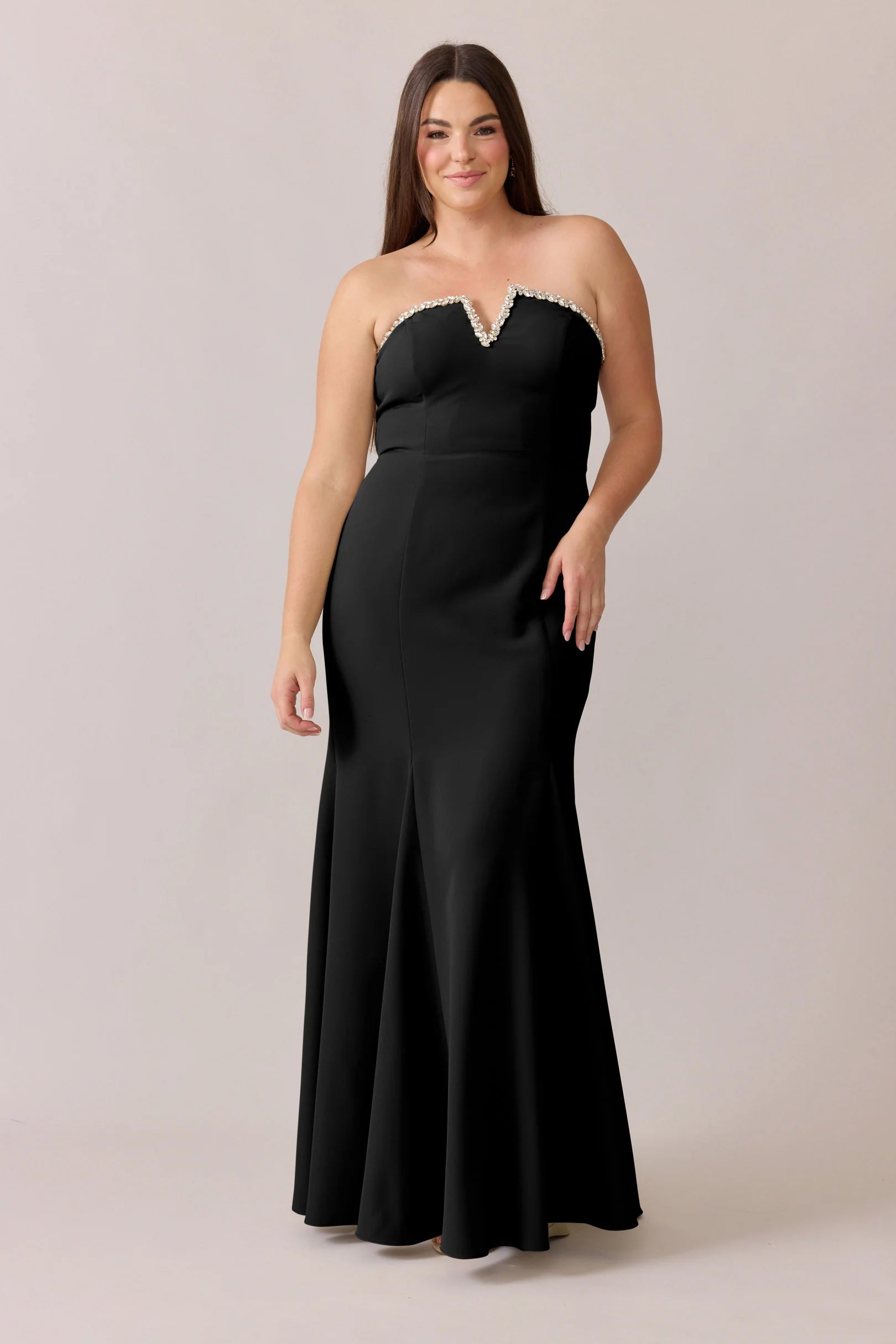 Understated, sculpted, and so refined. The Ellapink Luxe Crepe Dress stuns with a sleek mermaid silhouette, strapless V-notch neckline embellished with jewels, and a flowing godet pleated skirt that adds just the right amount of drama—without a slit. Built-in cups and boning keep things supported, while the full-length double lining ensures smooth, confident wear from ceremony to celebration.