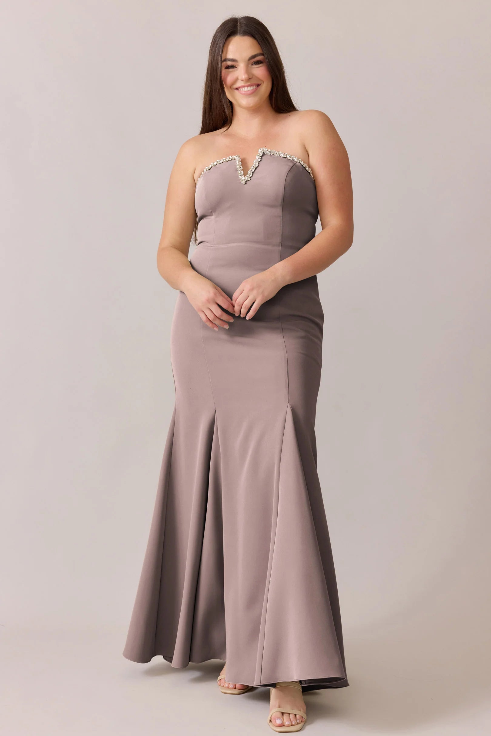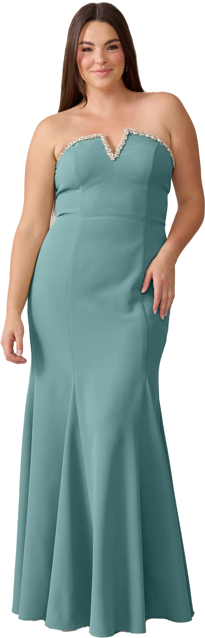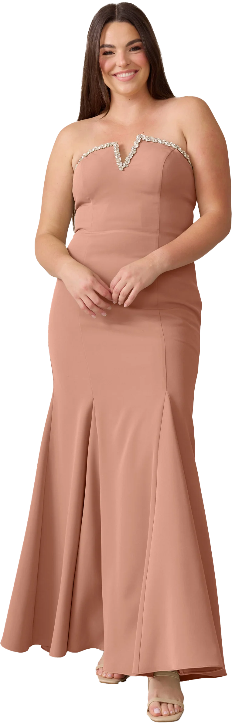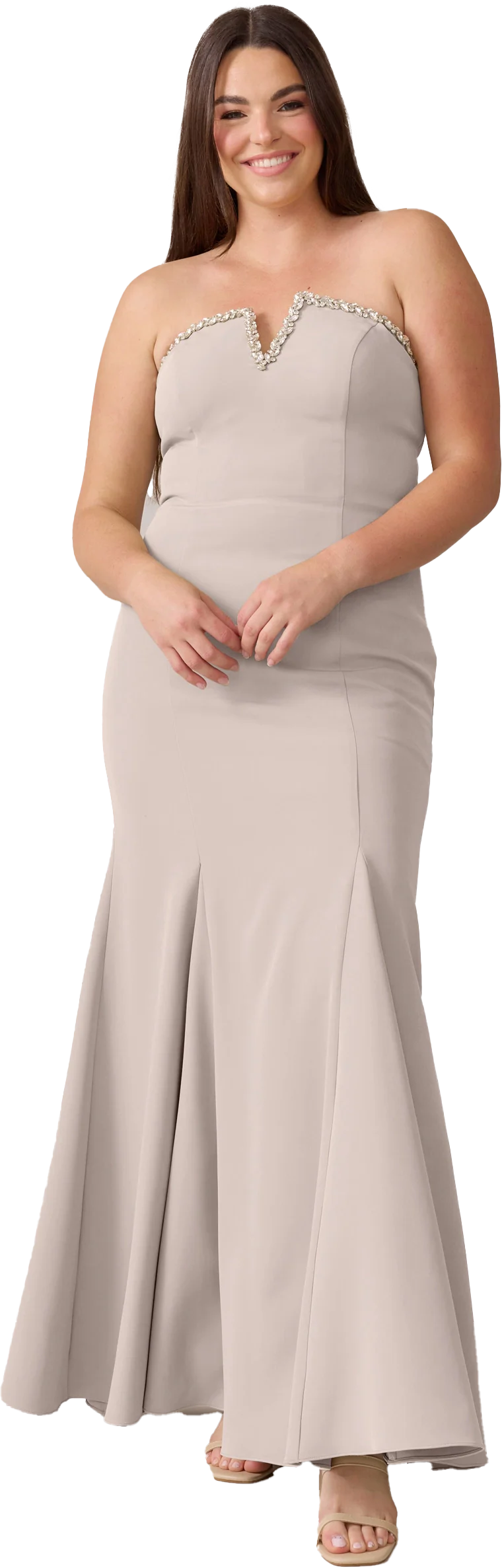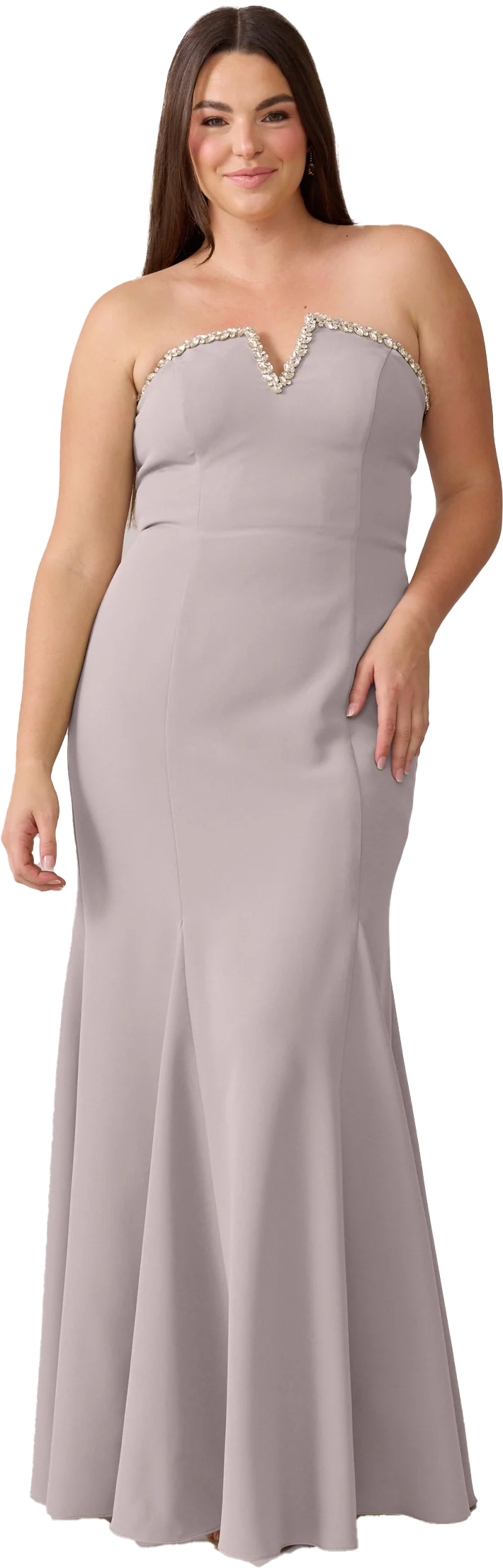 Understated, sculpted, and so refined. The Ellapink Luxe Crepe Dress stuns with a sleek mermaid silhouette, strapless V-notch neckline embellished with jewels, and a flowing godet pleated skirt that adds just the right amount of drama—without a slit. Built-in cups and boning keep things supported, while the full-length double lining ensures smooth, confident wear from ceremony to celebration.