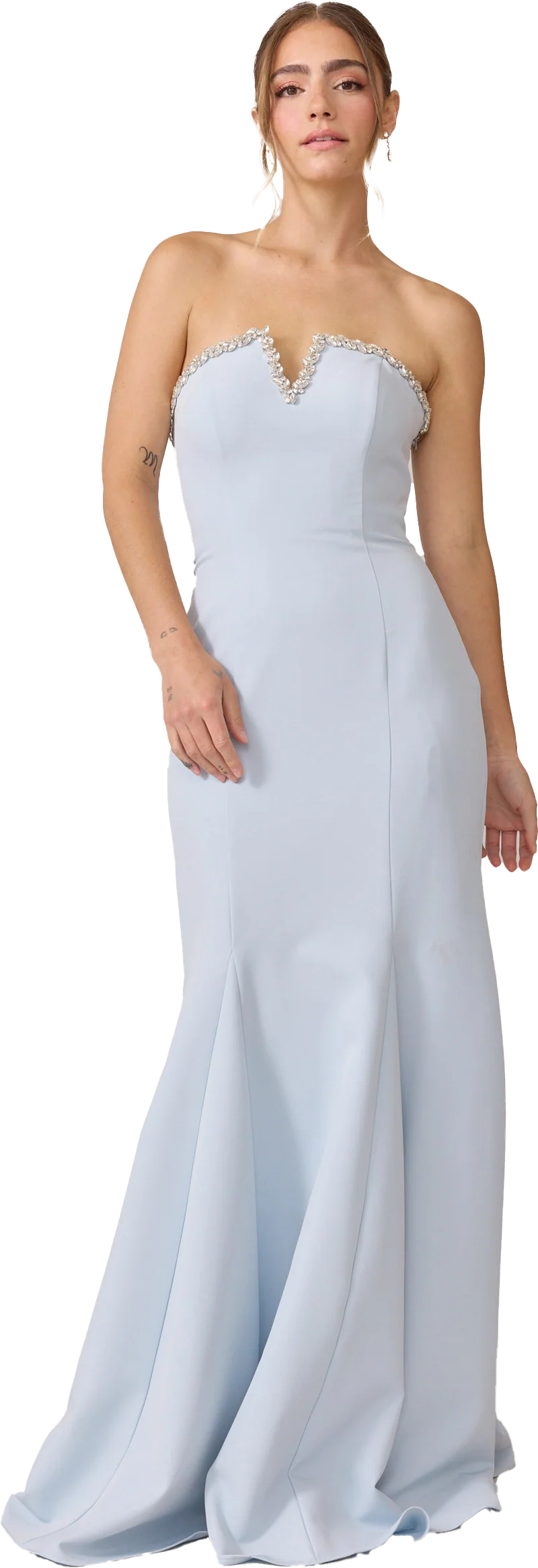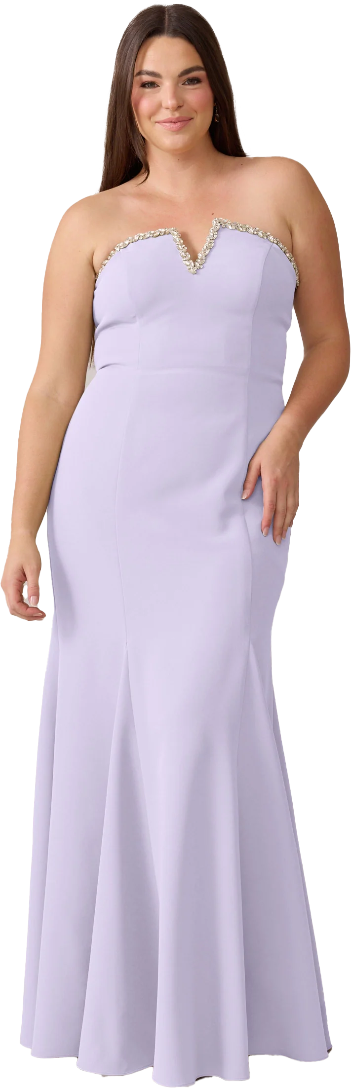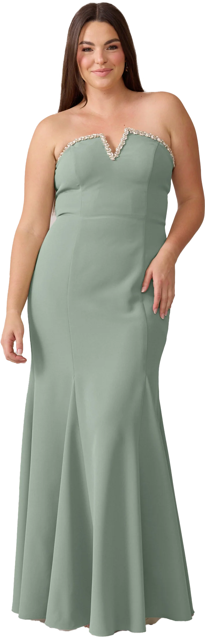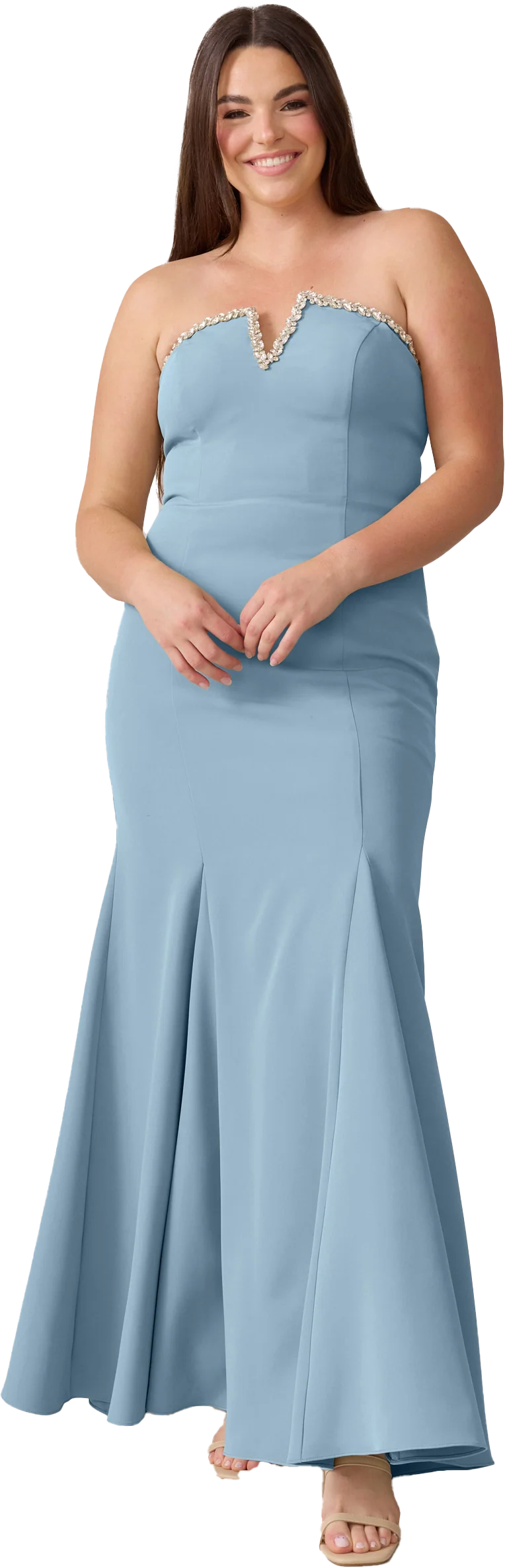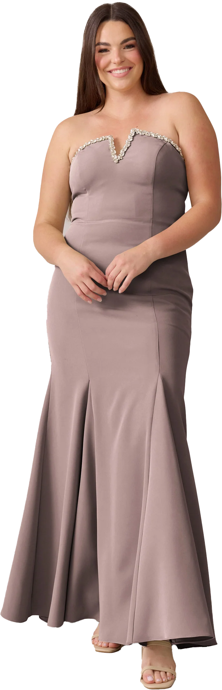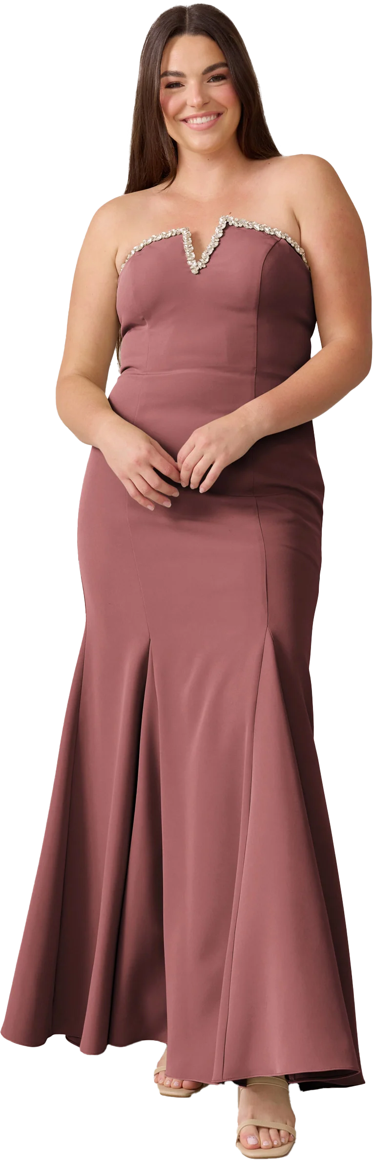 Understated, sculpted, and so refined. The Ellapink Luxe Crepe Dress stuns with a sleek mermaid silhouette, strapless V-notch neckline embellished with jewels, and a flowing godet pleated skirt that adds just the right amount of drama—without a slit. Built-in cups and boning keep things supported, while the full-length double lining ensures smooth, confident wear from ceremony to celebration.