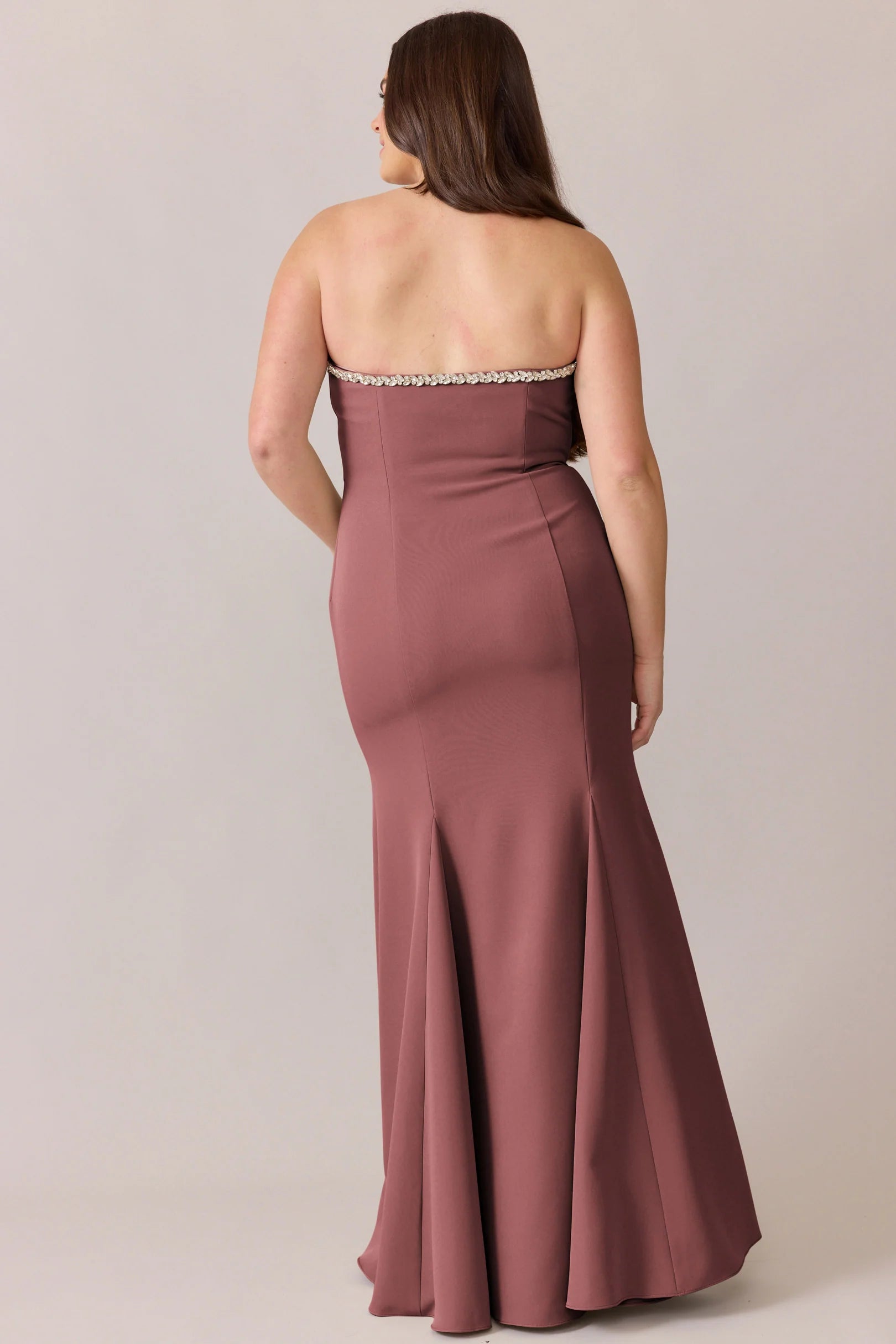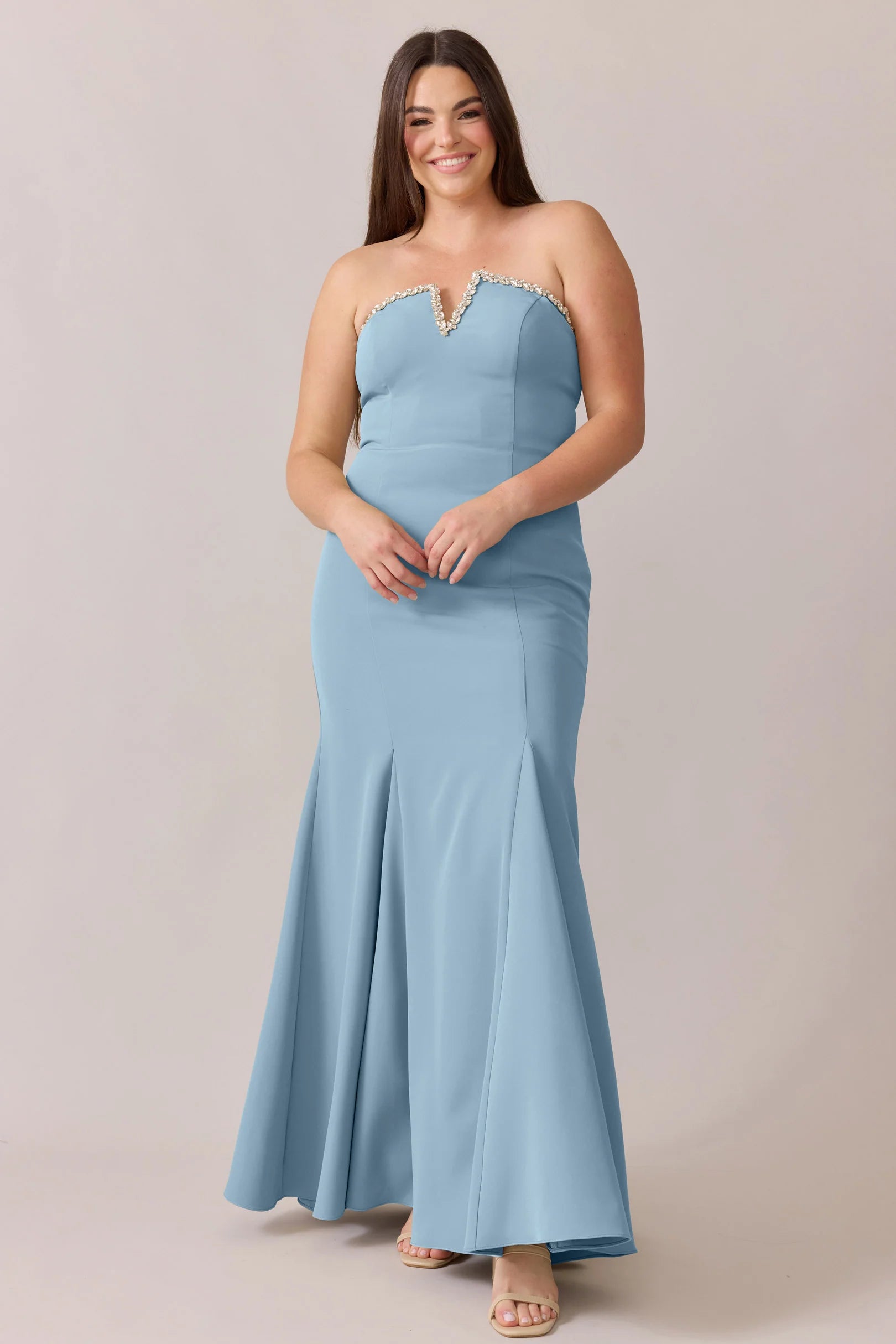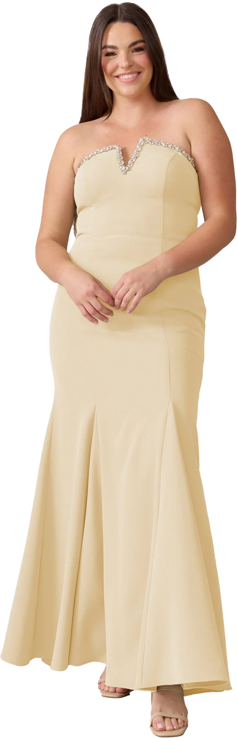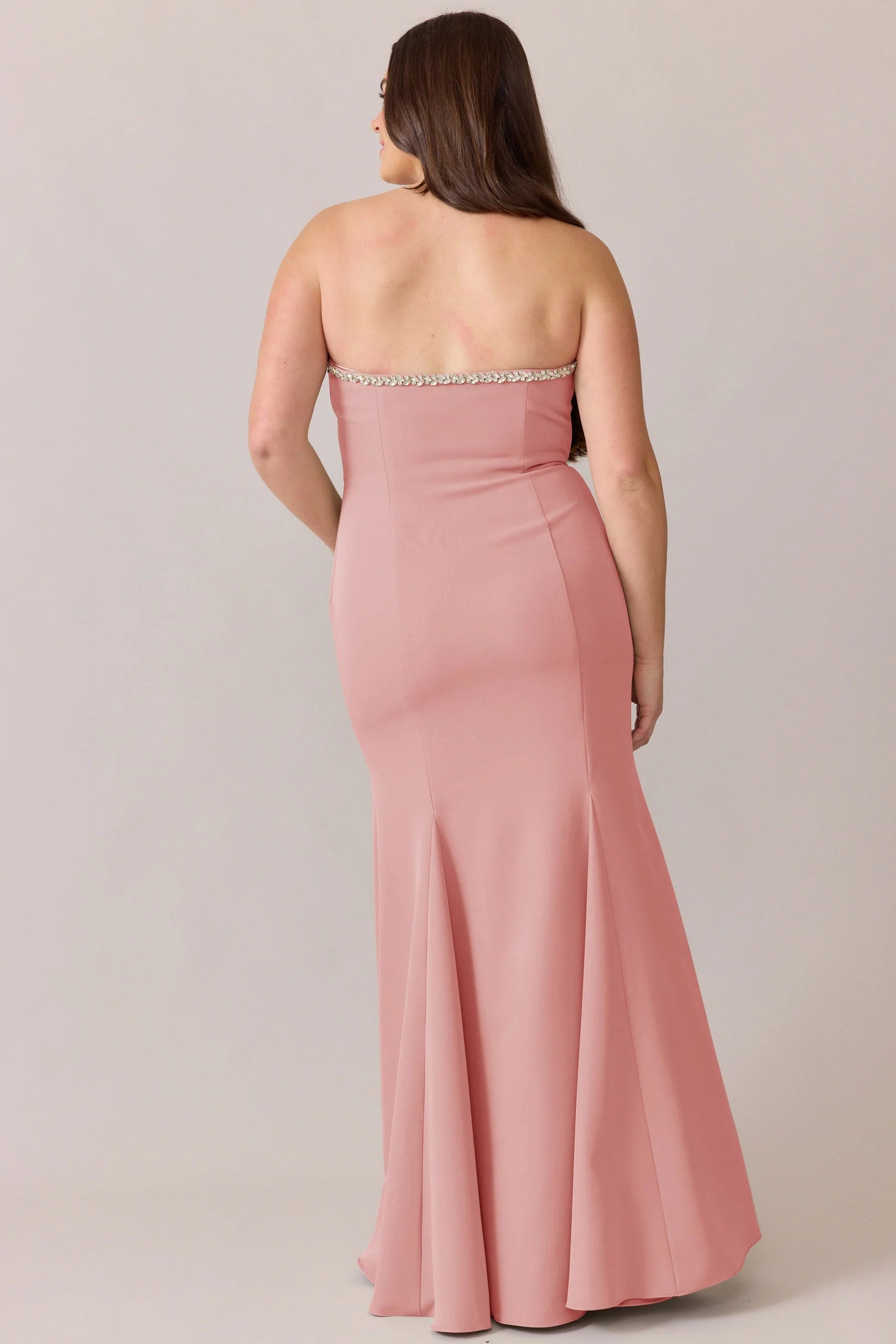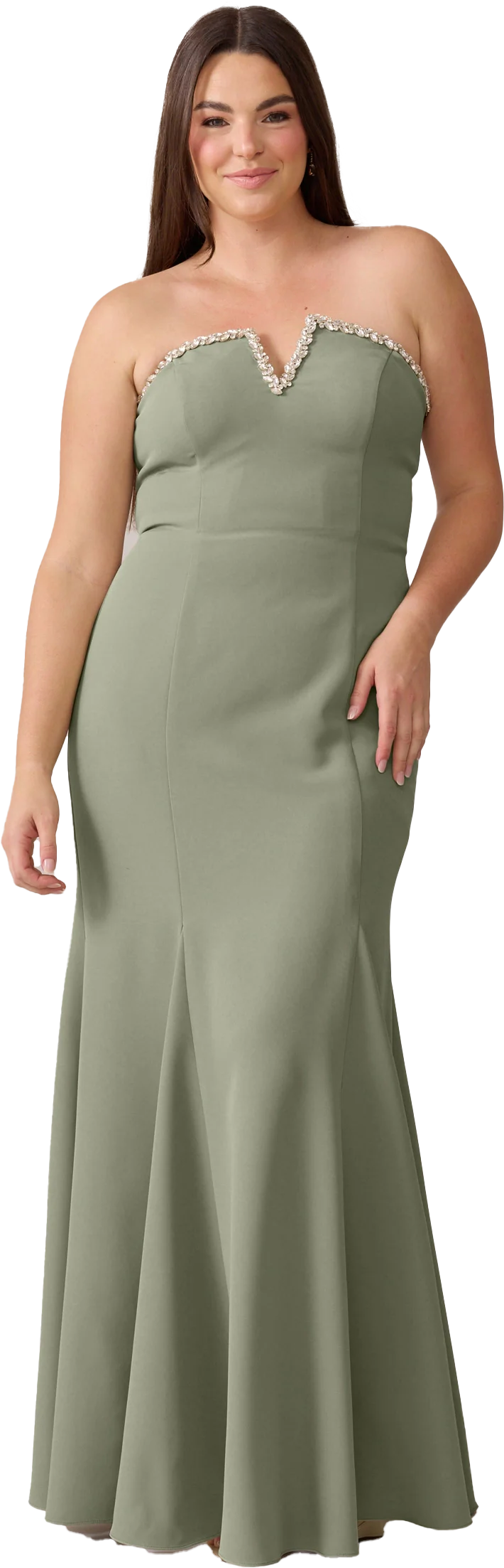 Understated, sculpted, and so refined. The Ellapink Luxe Crepe Dress stuns with a sleek mermaid silhouette, strapless V-notch neckline embellished with jewels, and a flowing godet pleated skirt that adds just the right amount of drama—without a slit. Built-in cups and boning keep things supported, while the full-length double lining ensures smooth, confident wear from ceremony to celebration.