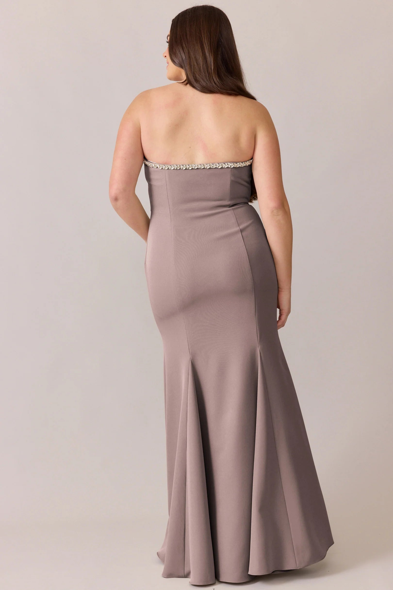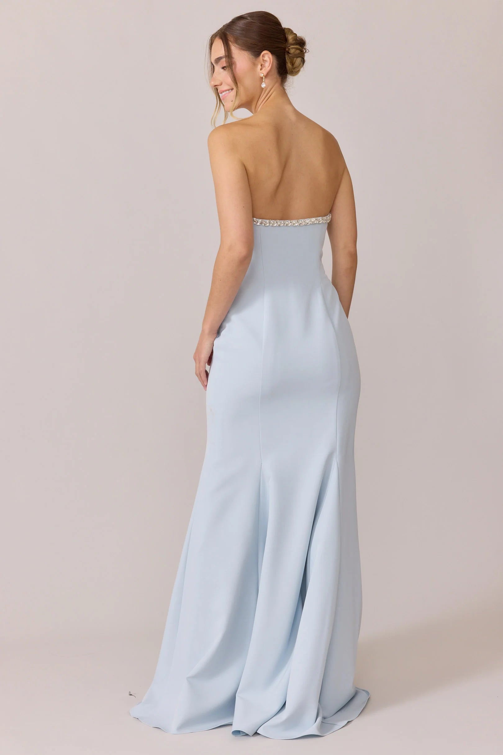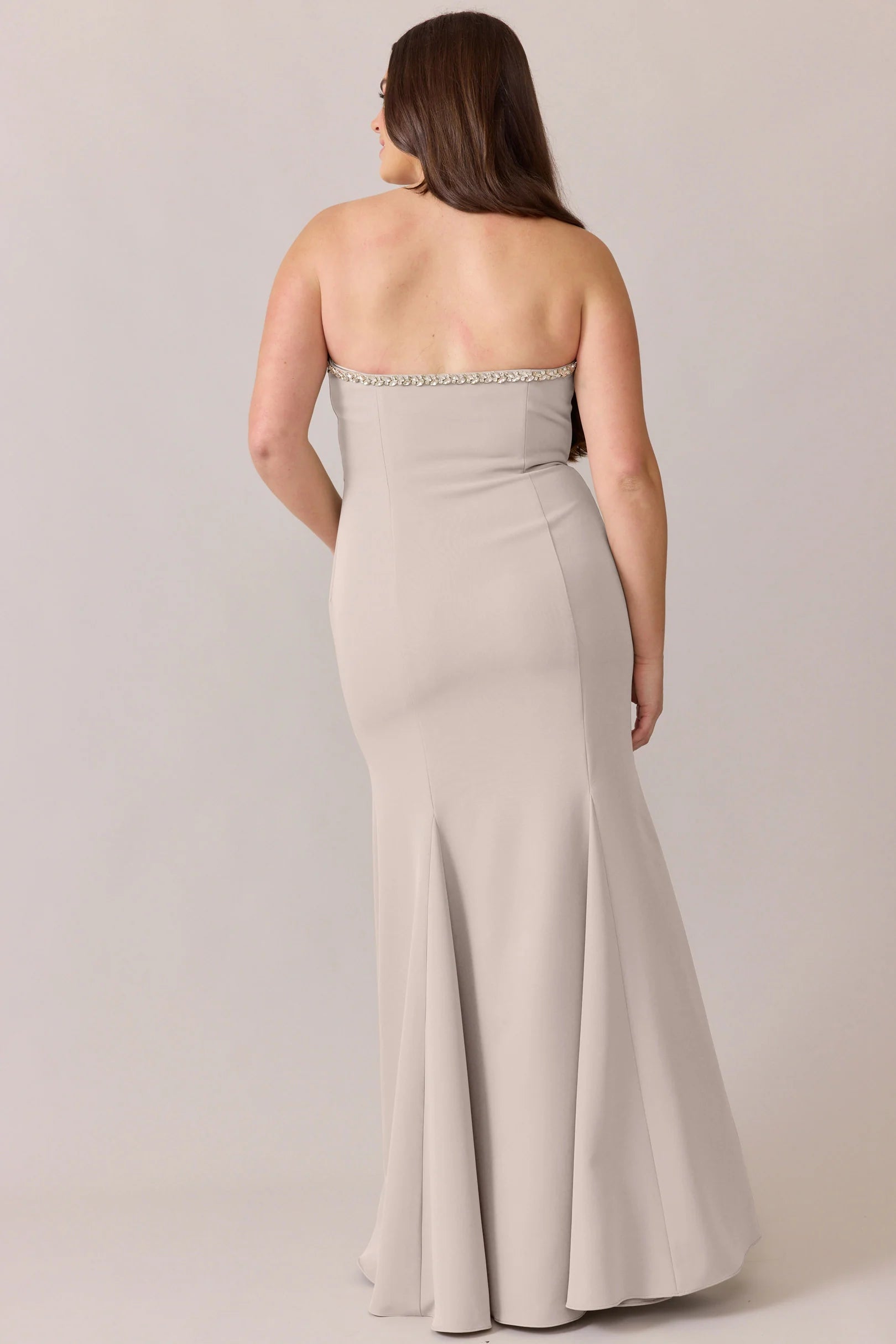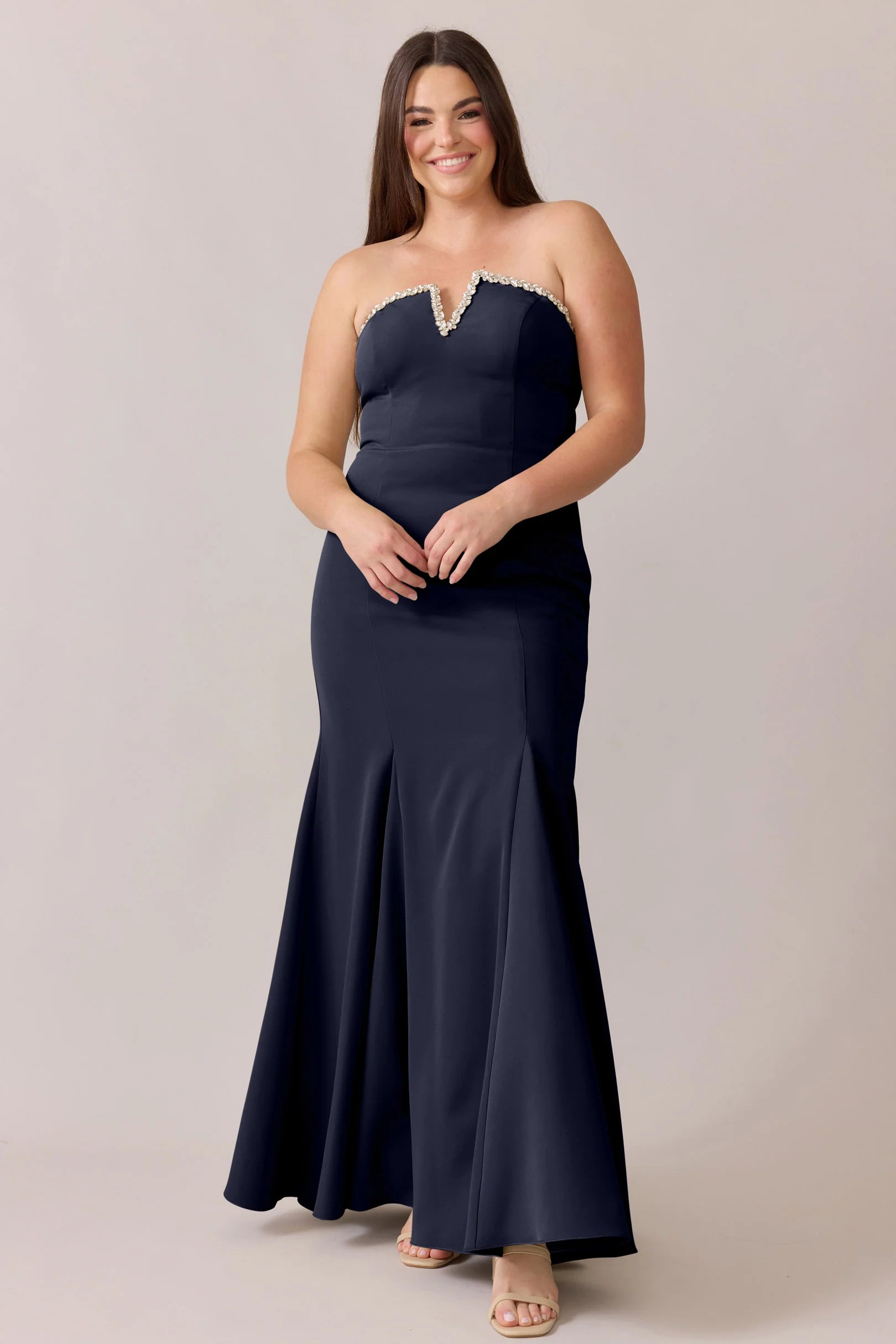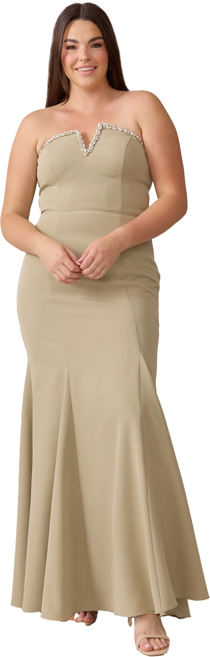 Understated, sculpted, and so refined. The Ellapink Luxe Crepe Dress stuns with a sleek mermaid silhouette, strapless V-notch neckline embellished with jewels, and a flowing godet pleated skirt that adds just the right amount of drama—without a slit. Built-in cups and boning keep things supported, while the full-length double lining ensures smooth, confident wear from ceremony to celebration.