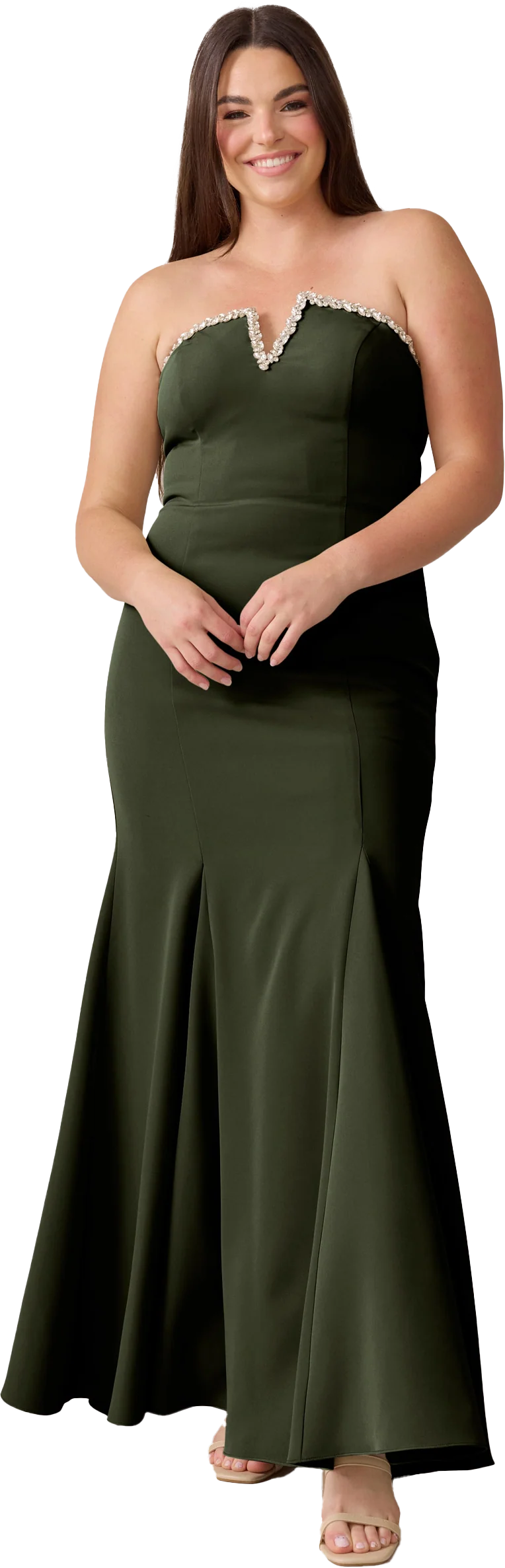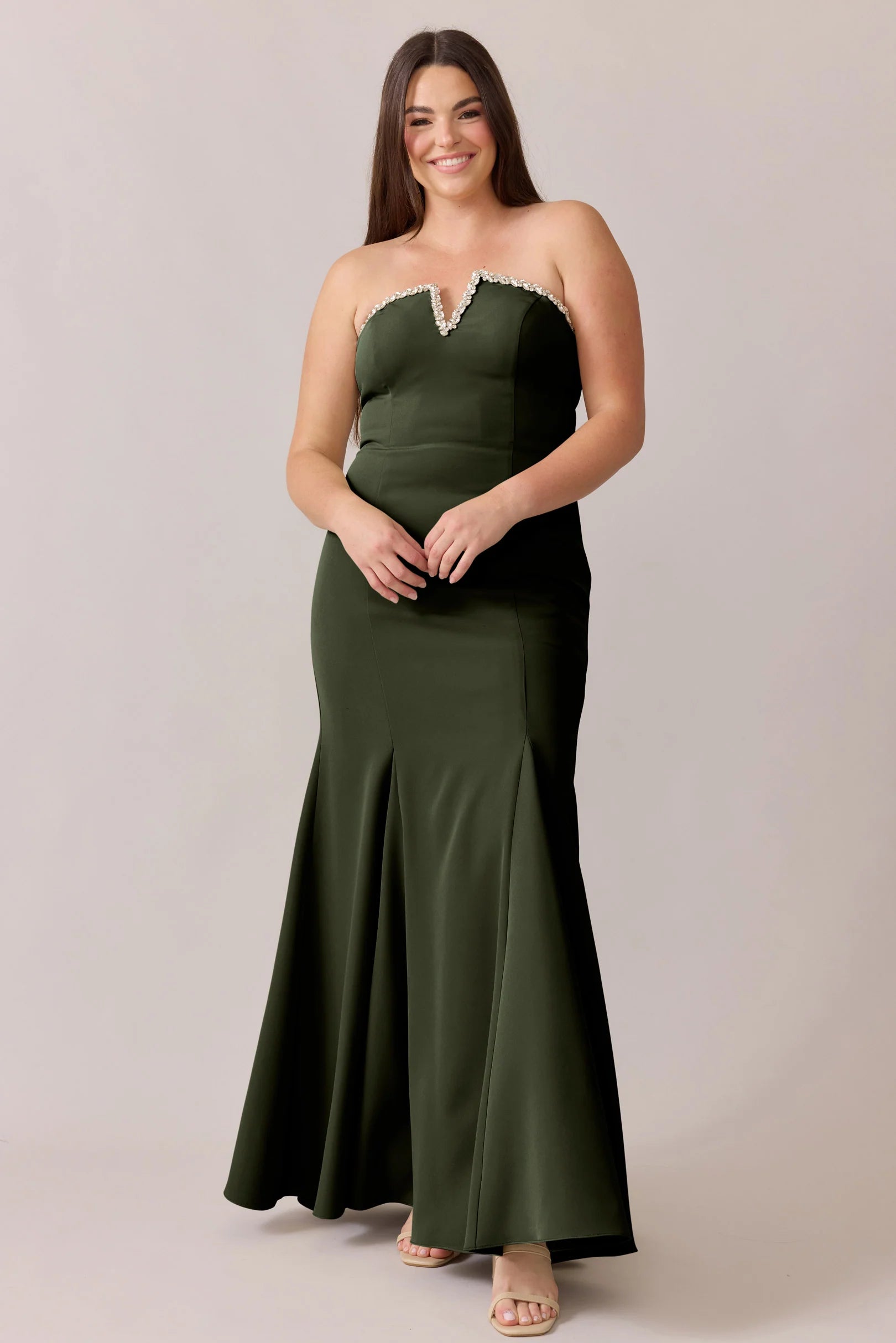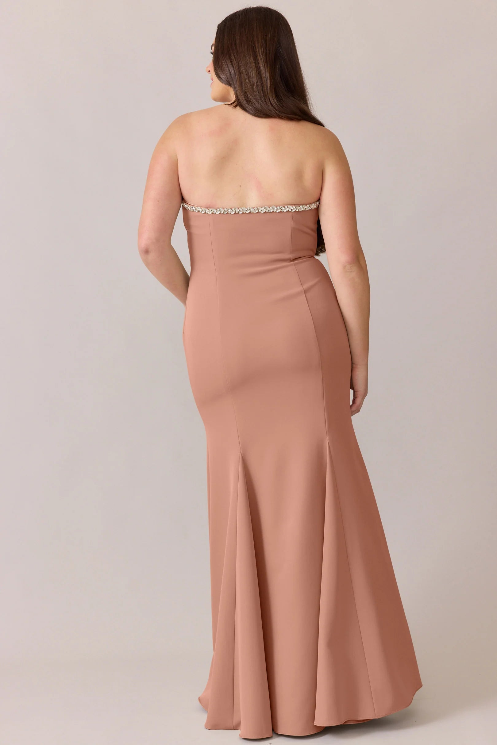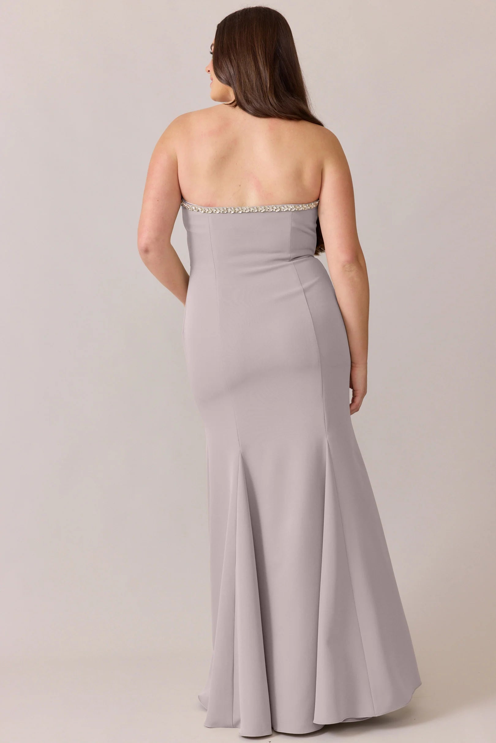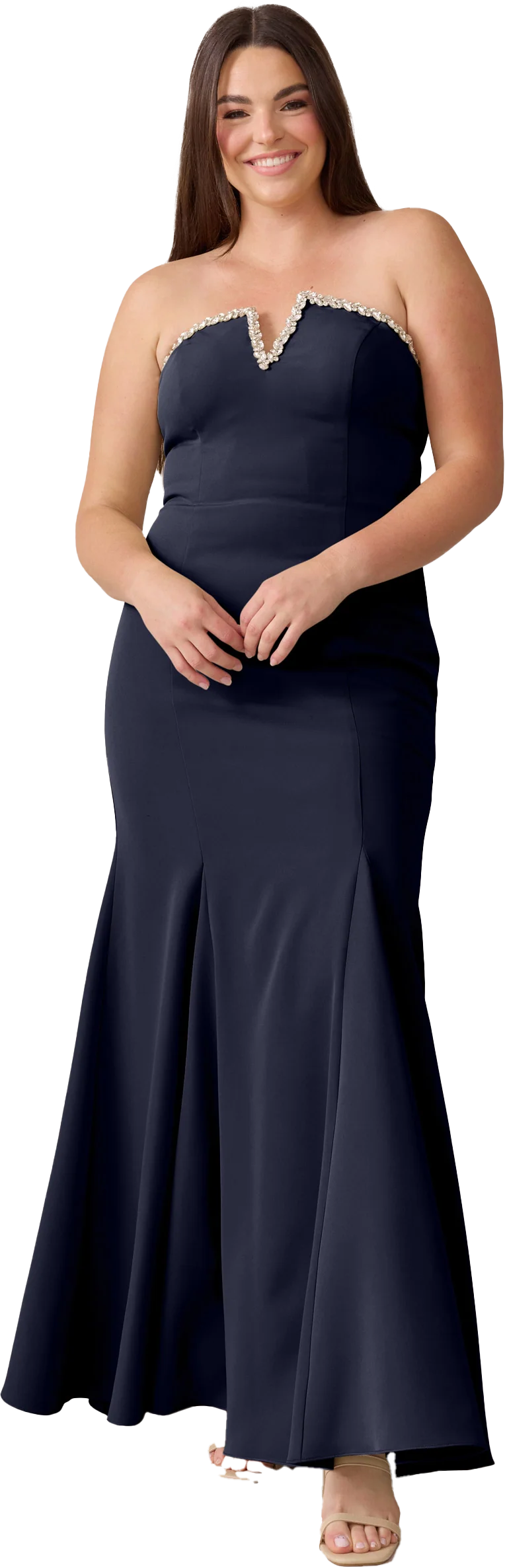 Understated, sculpted, and so refined. The Ellapink Luxe Crepe Dress stuns with a sleek mermaid silhouette, strapless V-notch neckline embellished with jewels, and a flowing godet pleated skirt that adds just the right amount of drama—without a slit. Built-in cups and boning keep things supported, while the full-length double lining ensures smooth, confident wear from ceremony to celebration.