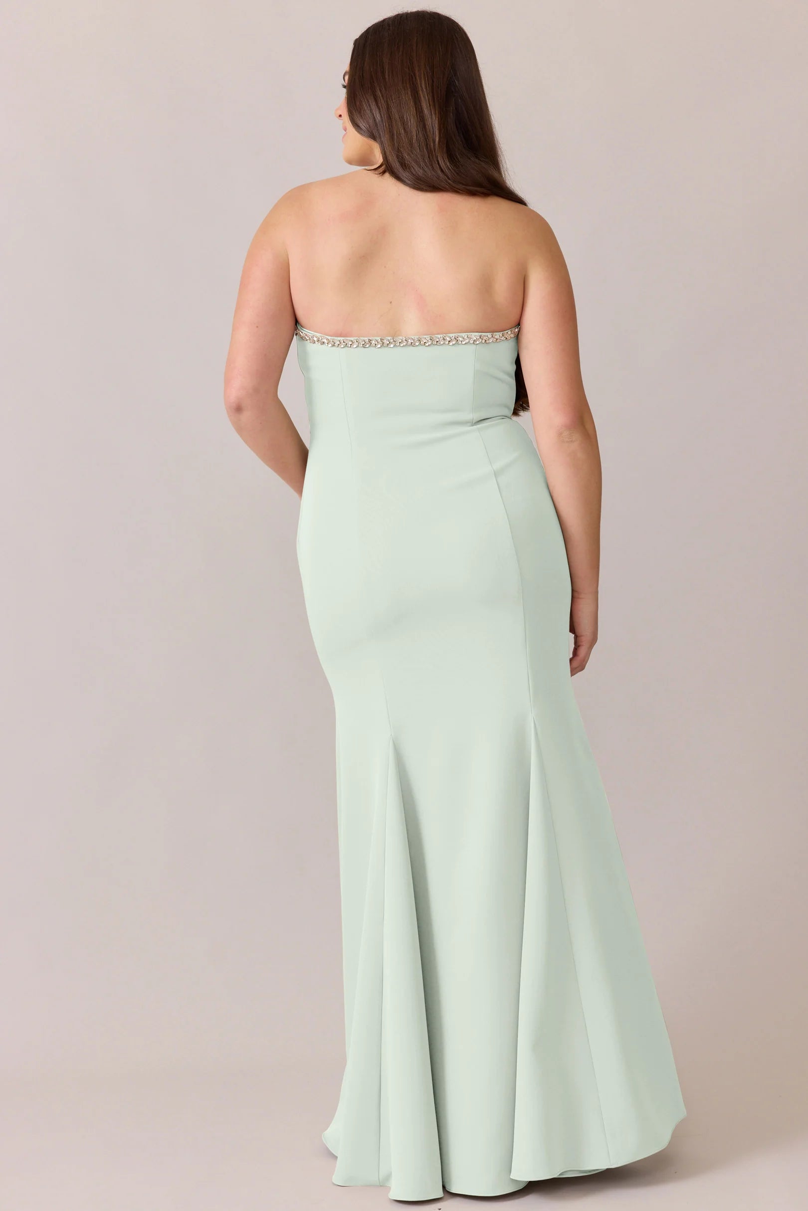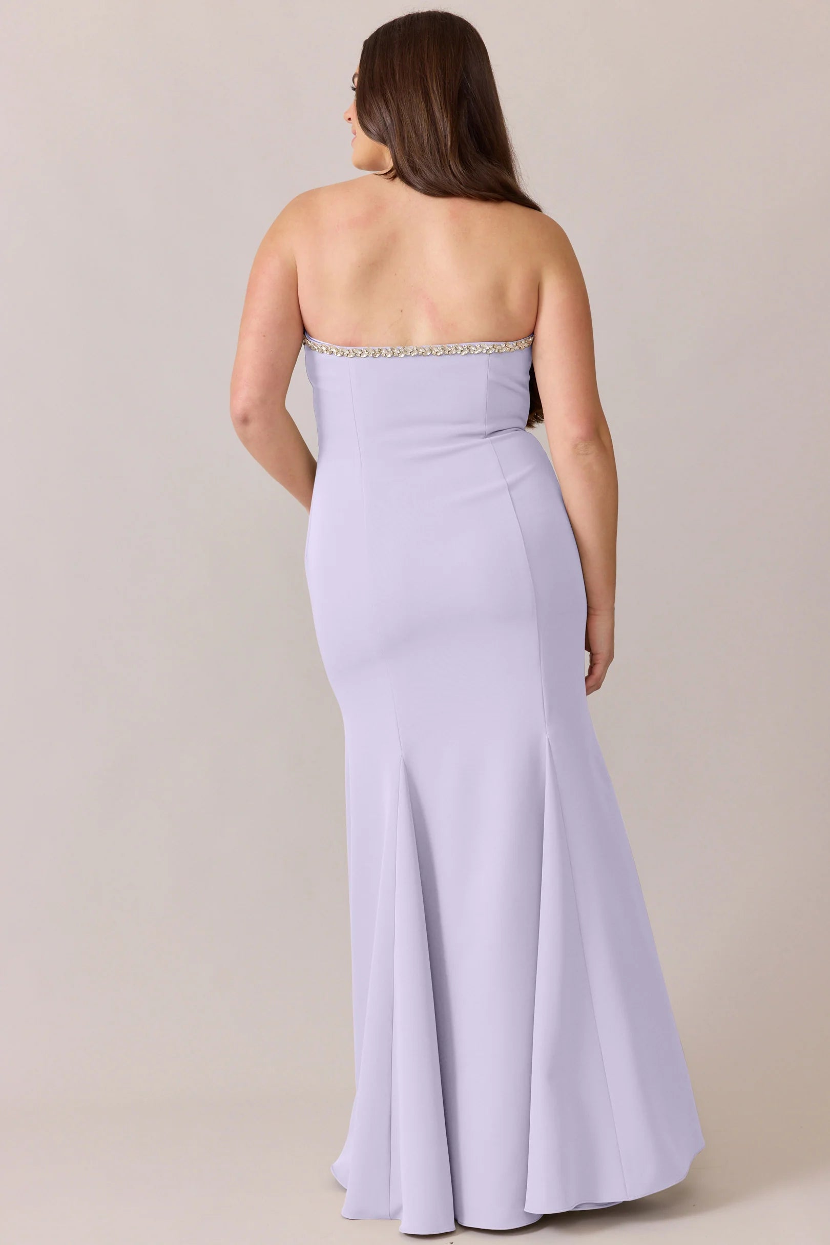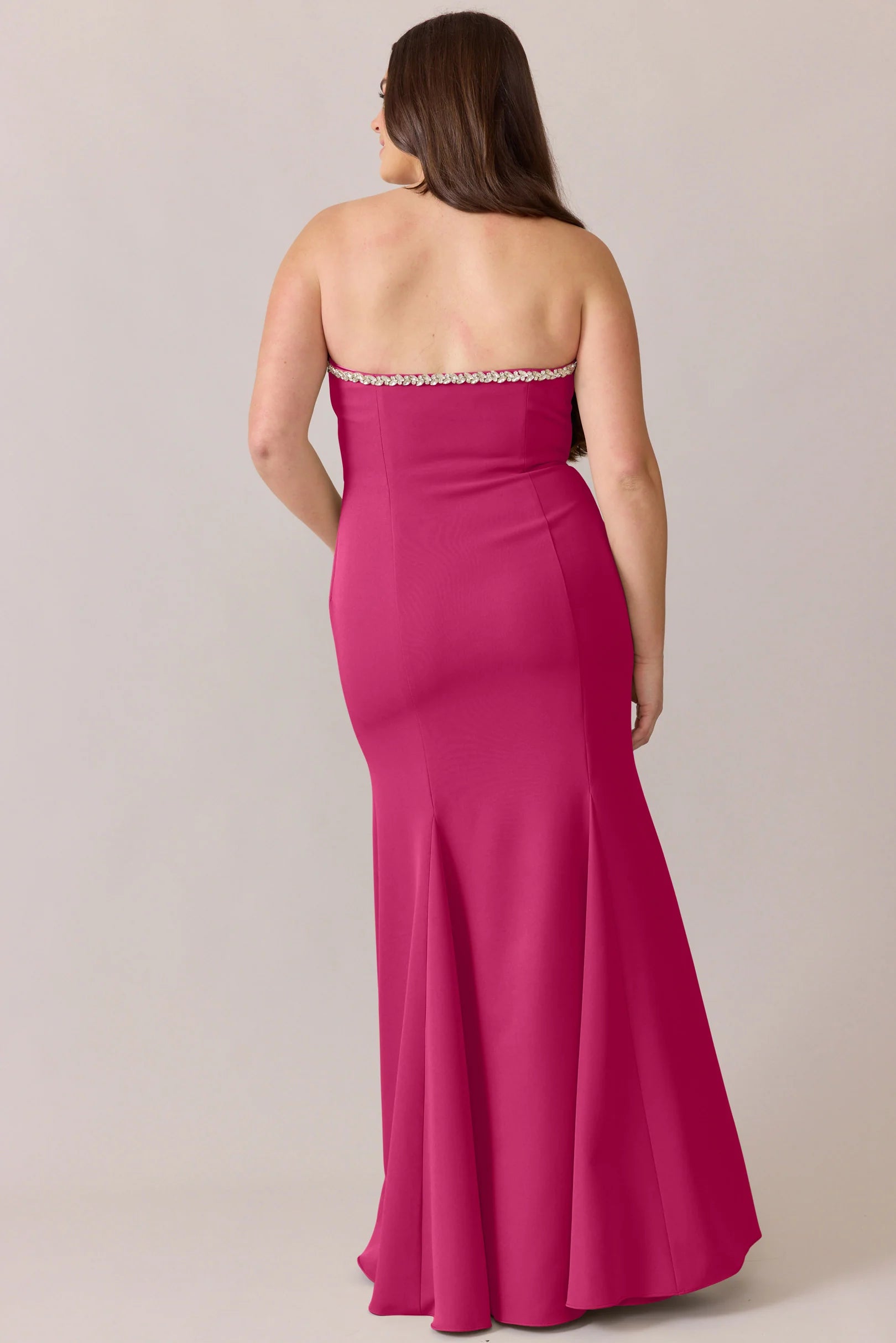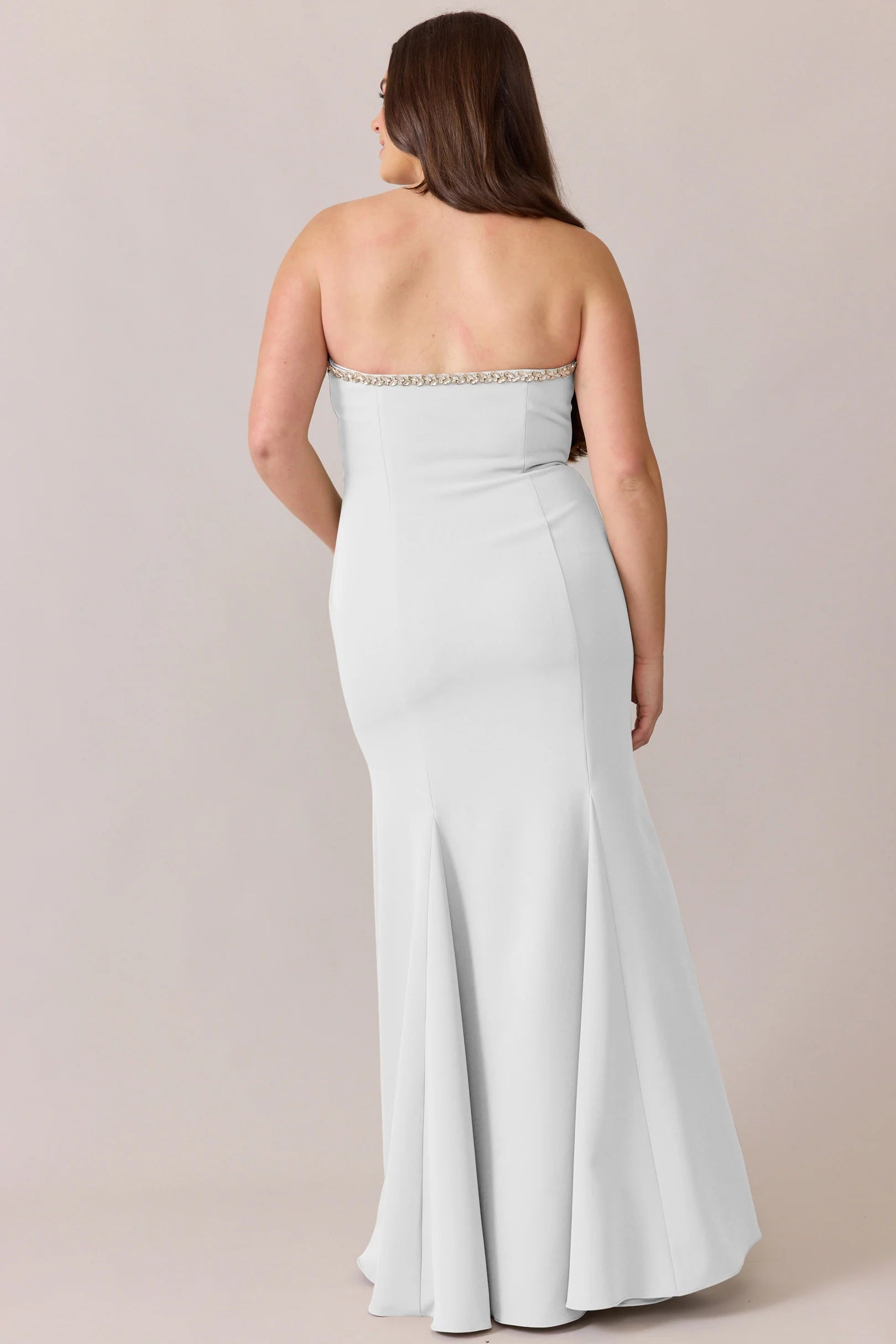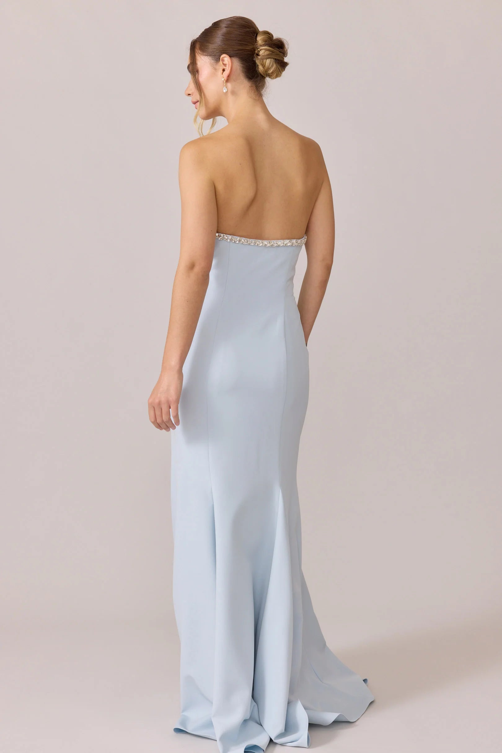 Understated, sculpted, and so refined. The Ellapink Luxe Crepe Dress stuns with a sleek mermaid silhouette, strapless V-notch neckline embellished with jewels, and a flowing godet pleated skirt that adds just the right amount of drama—without a slit. Built-in cups and boning keep things supported, while the full-length double lining ensures smooth, confident wear from ceremony to celebration.