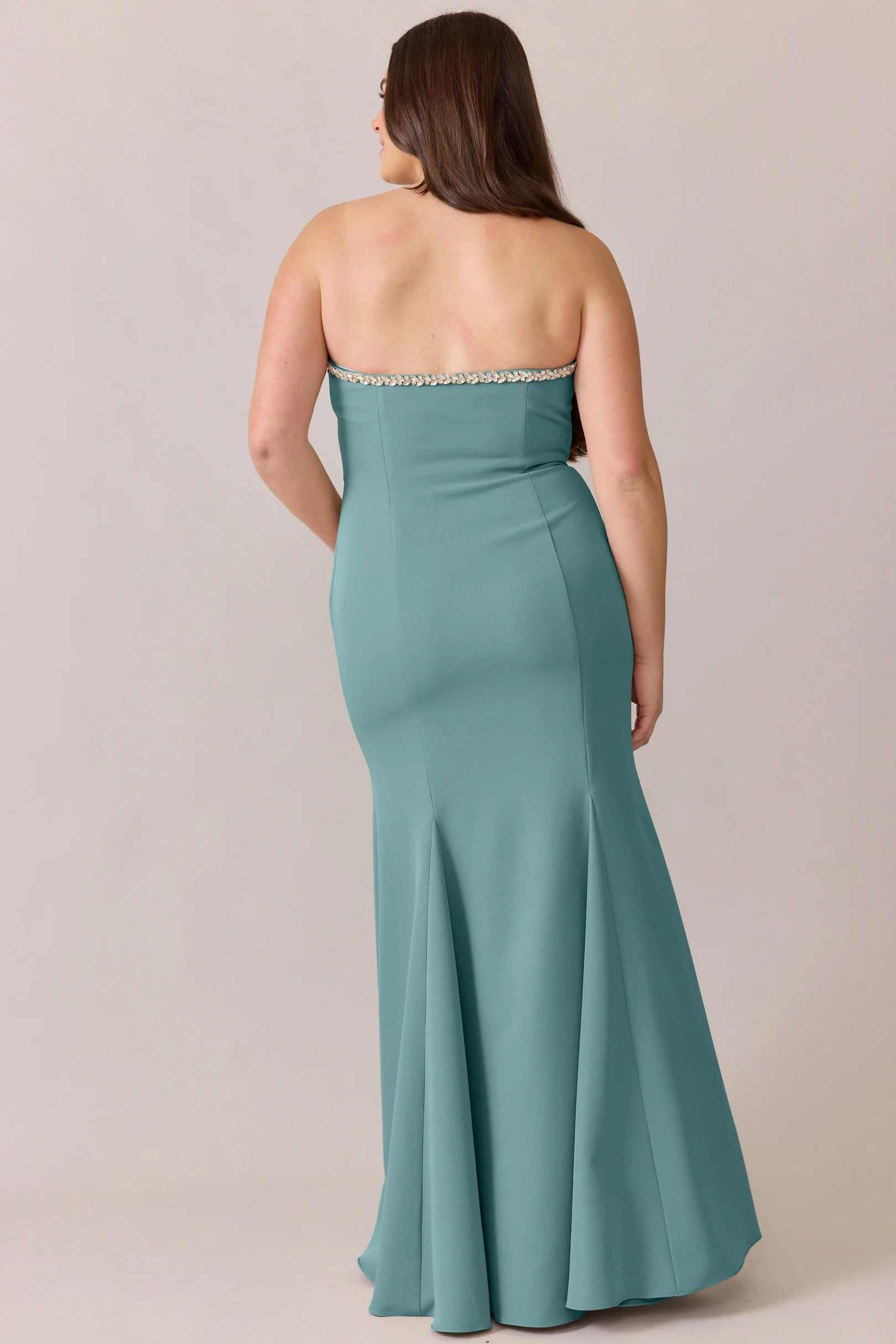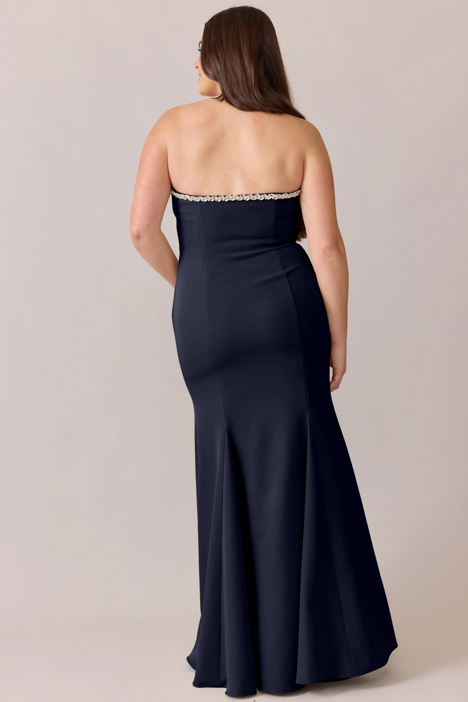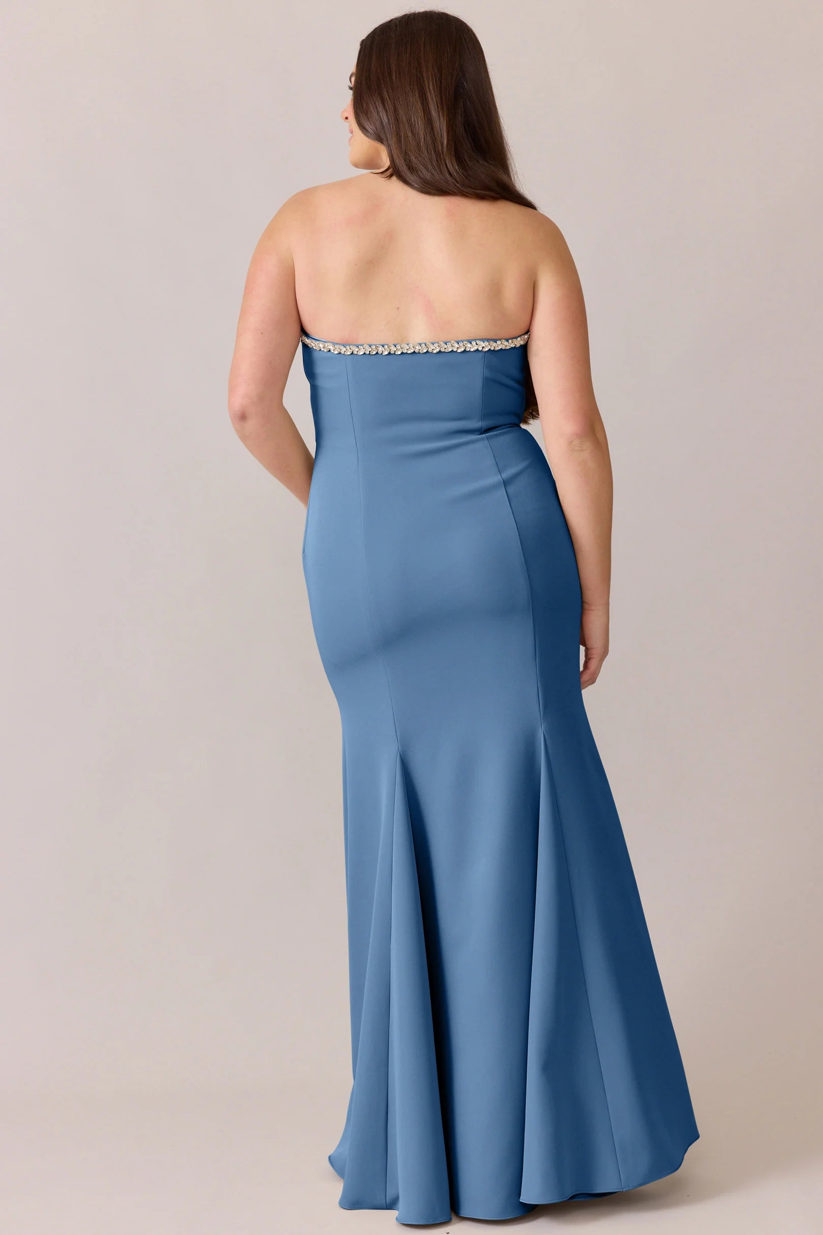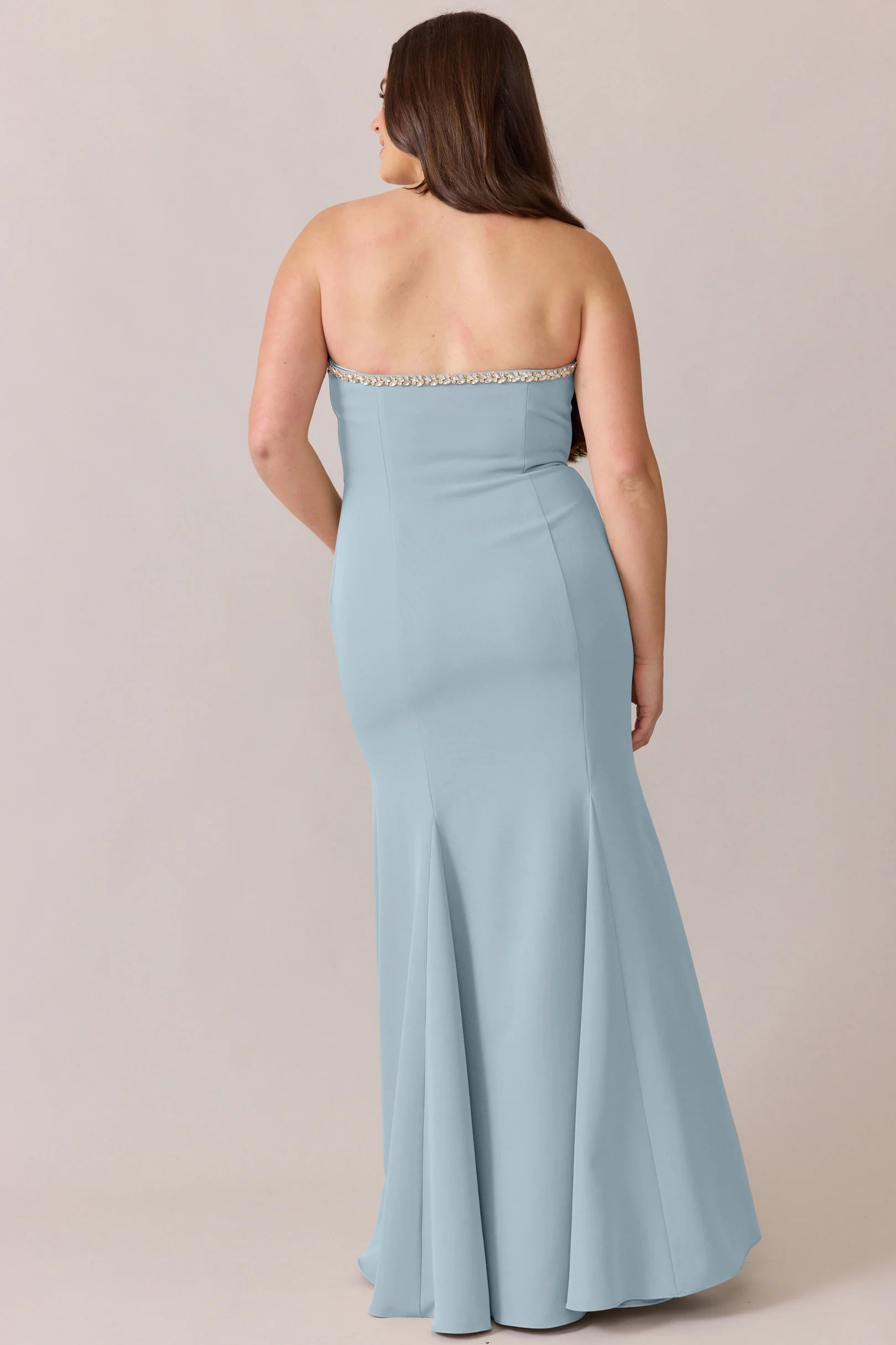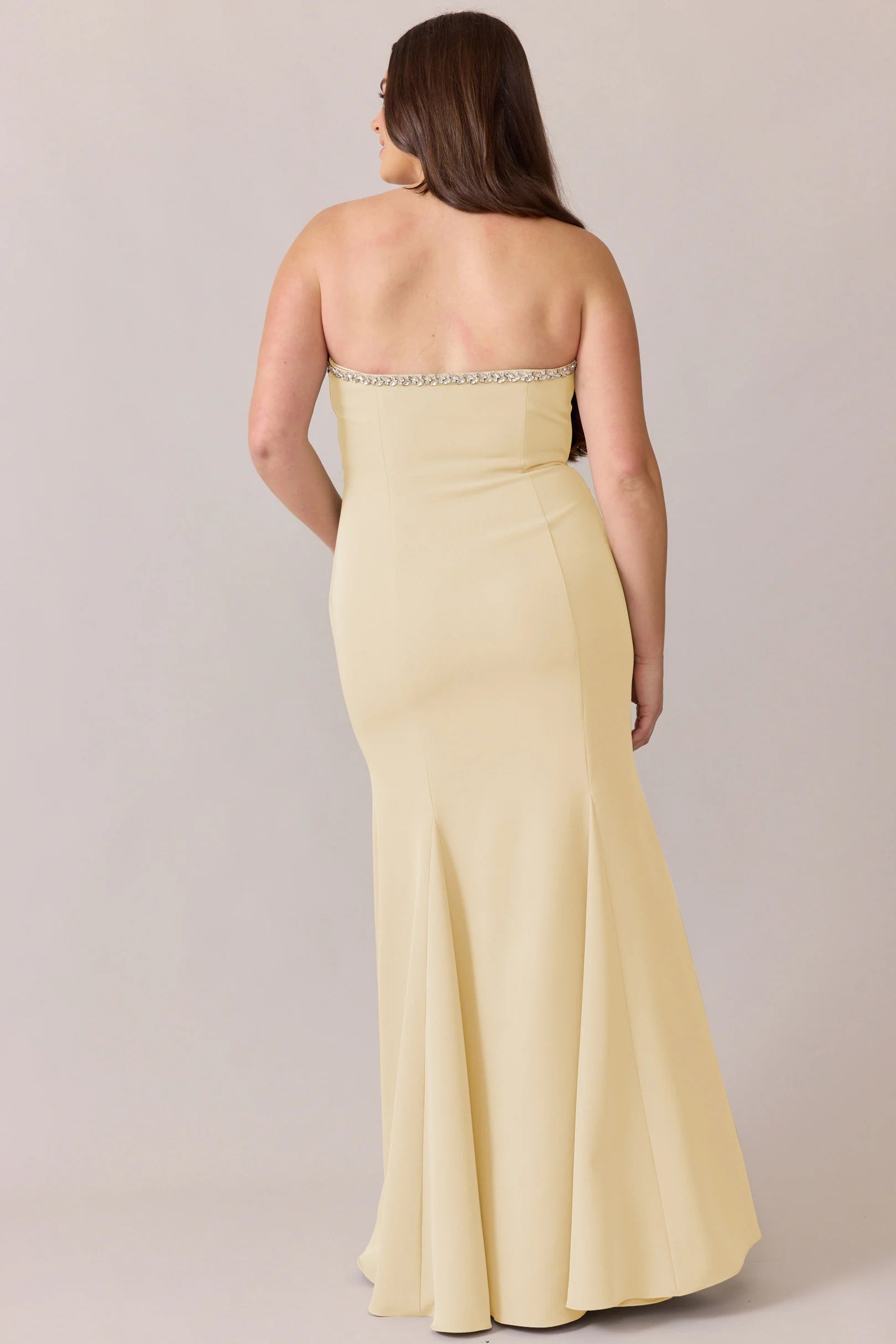 Understated, sculpted, and so refined. The Ellapink Luxe Crepe Dress stuns with a sleek mermaid silhouette, strapless V-notch neckline embellished with jewels, and a flowing godet pleated skirt that adds just the right amount of drama—without a slit. Built-in cups and boning keep things supported, while the full-length double lining ensures smooth, confident wear from ceremony to celebration.