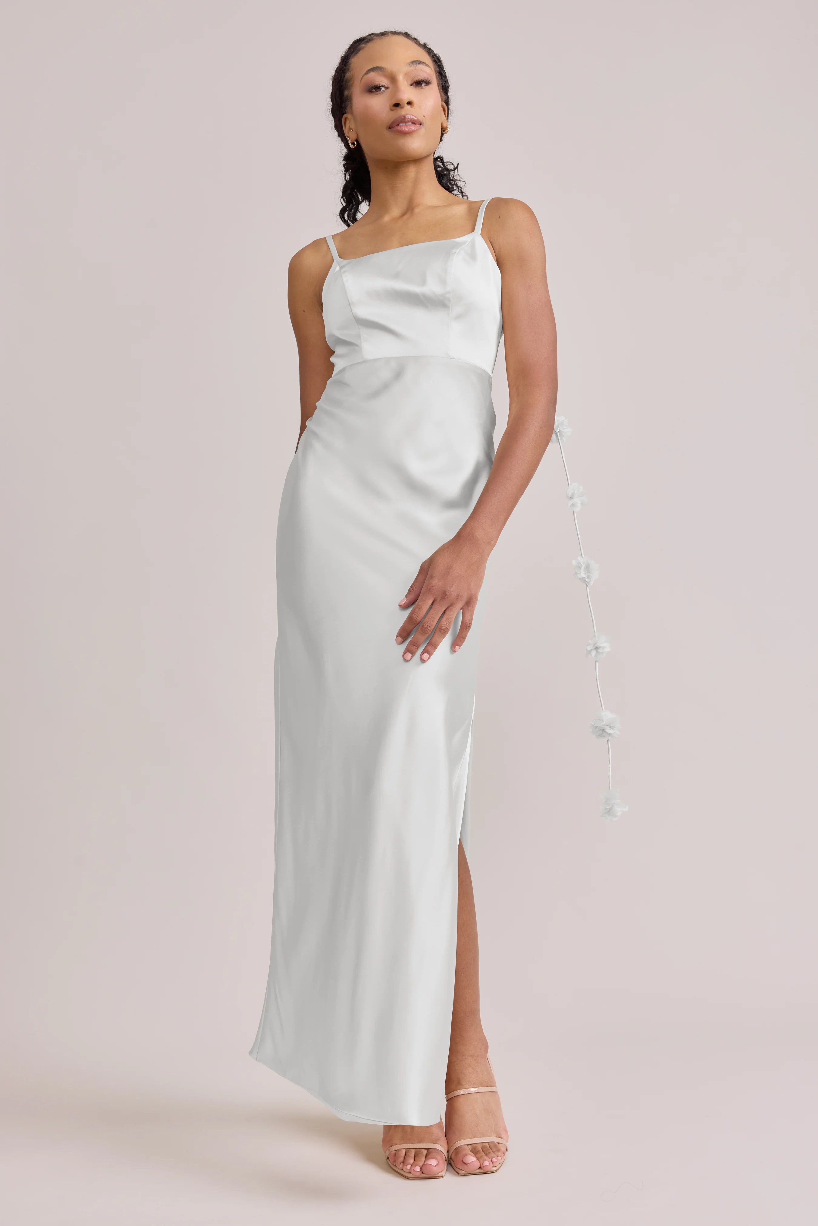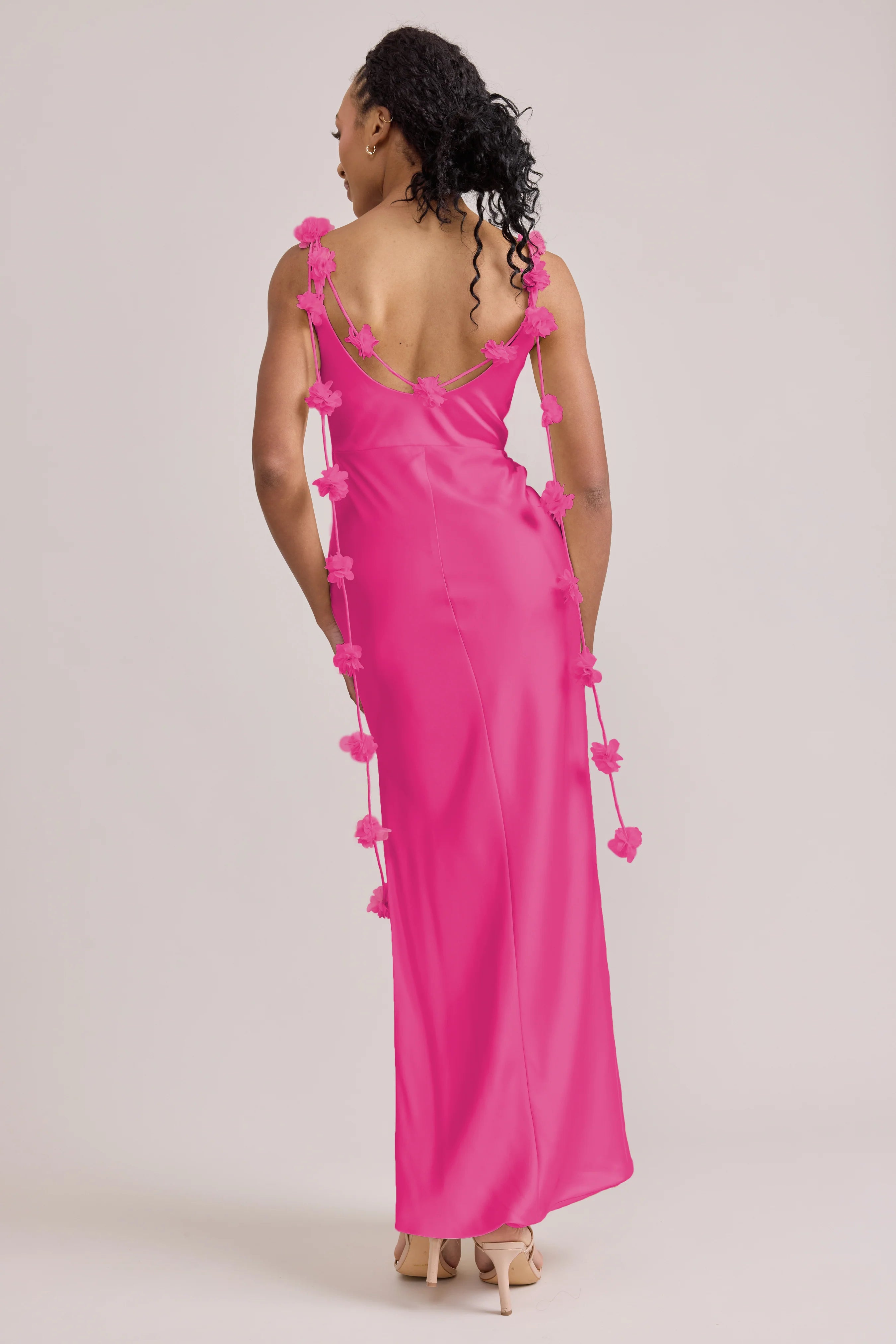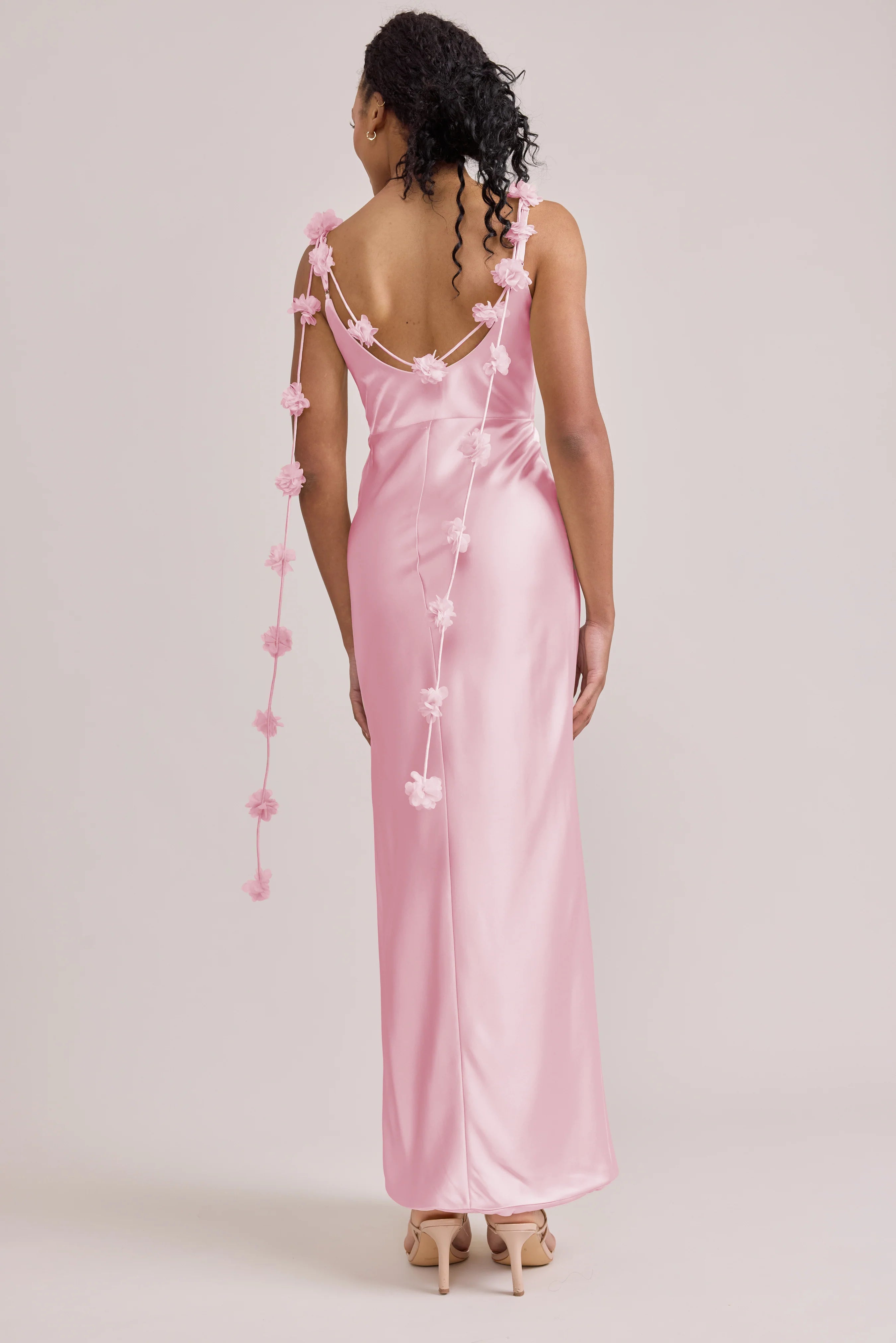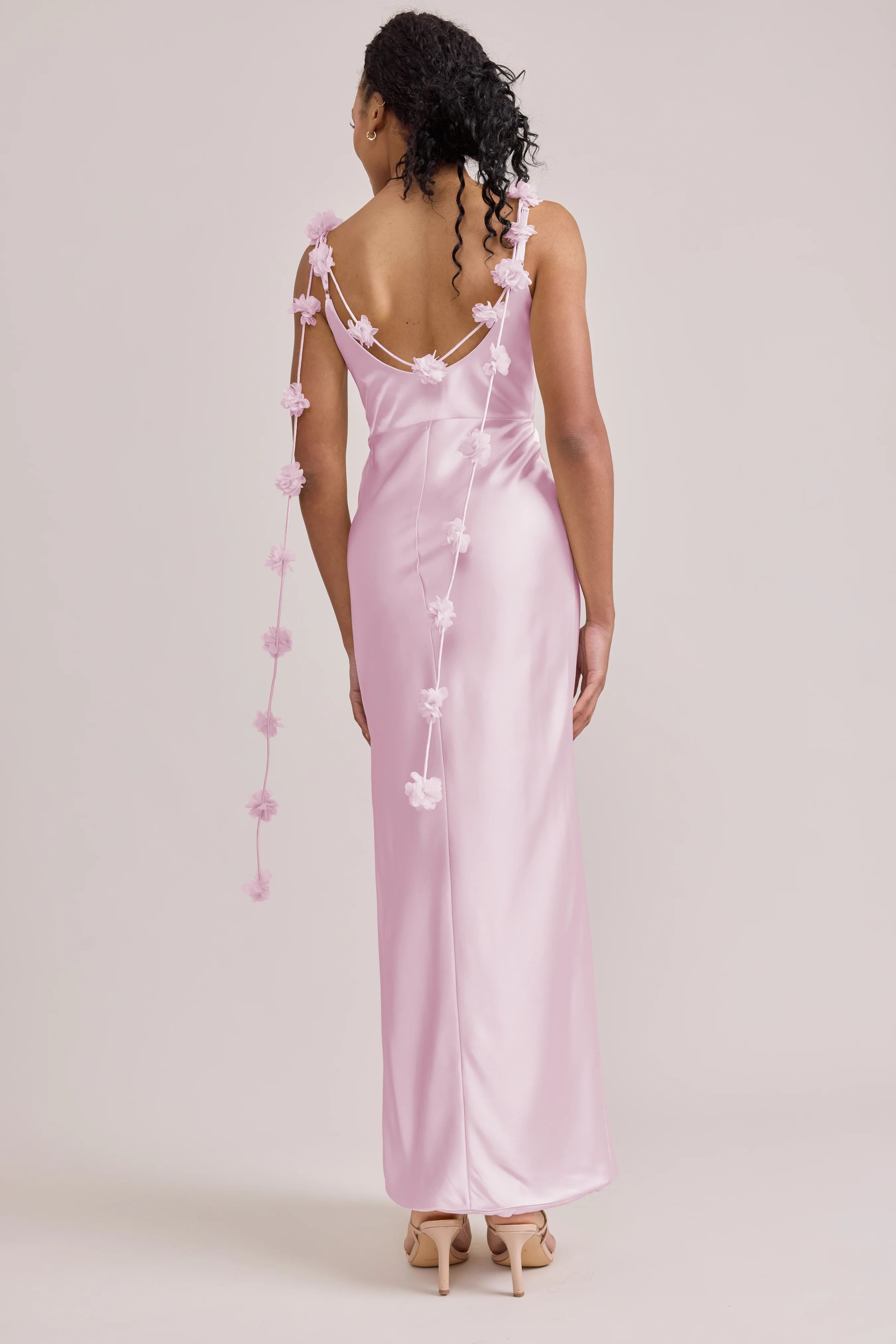 Sleek in the front, whimsy in the back, our LUXE Ellapink Satin Dress is an instant serotonin boost. Remi’s simple yet flattering silhouette is the perfect canvas for these beautifully draped florals to accessorize. This style features a fitted silhouette, left side slit and open back, where chiffon floral poofs are highlighted, attached to the adjustable spaghetti straps. Two additional floral strands hang off either shoulder, completing this playful and romantic dress.