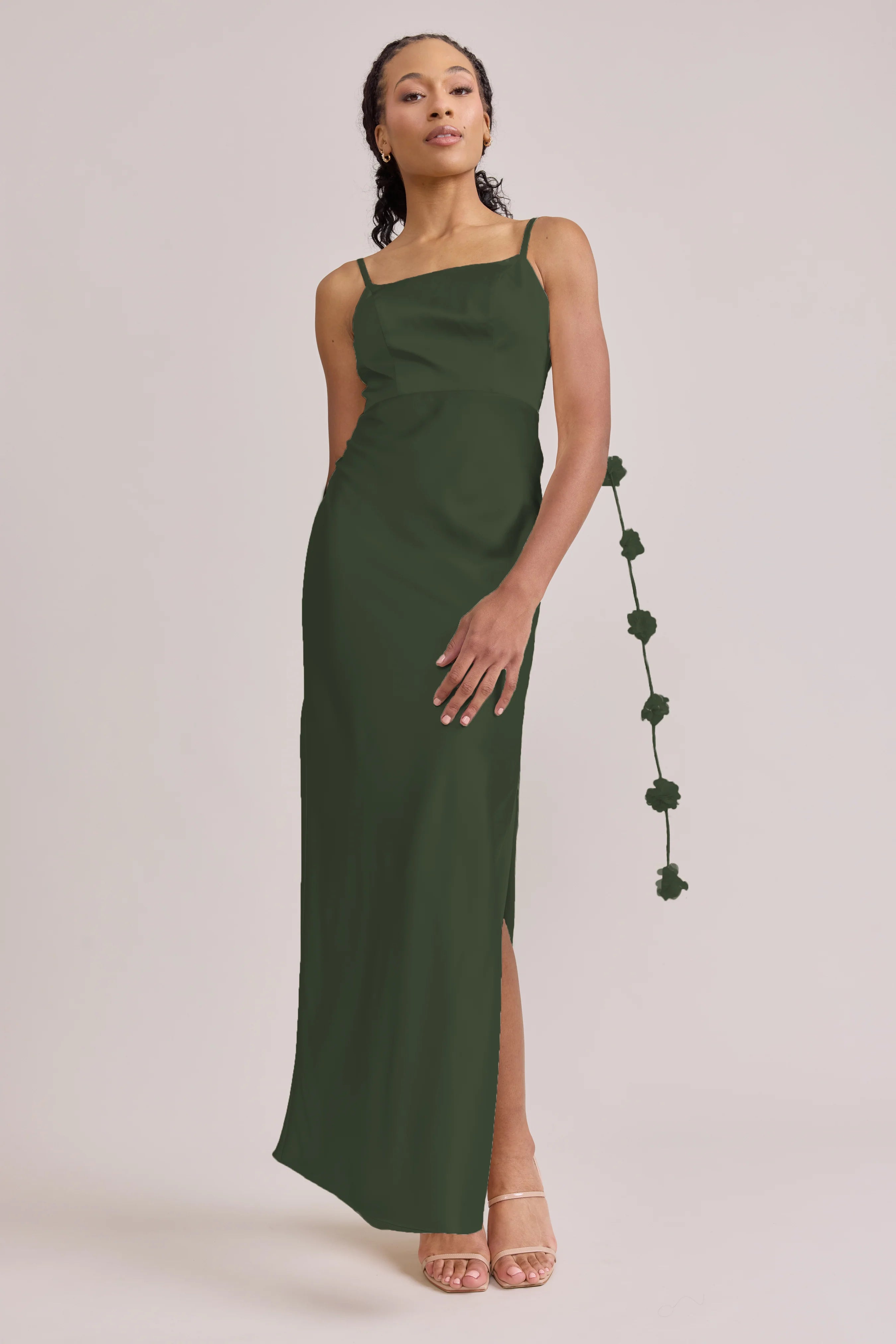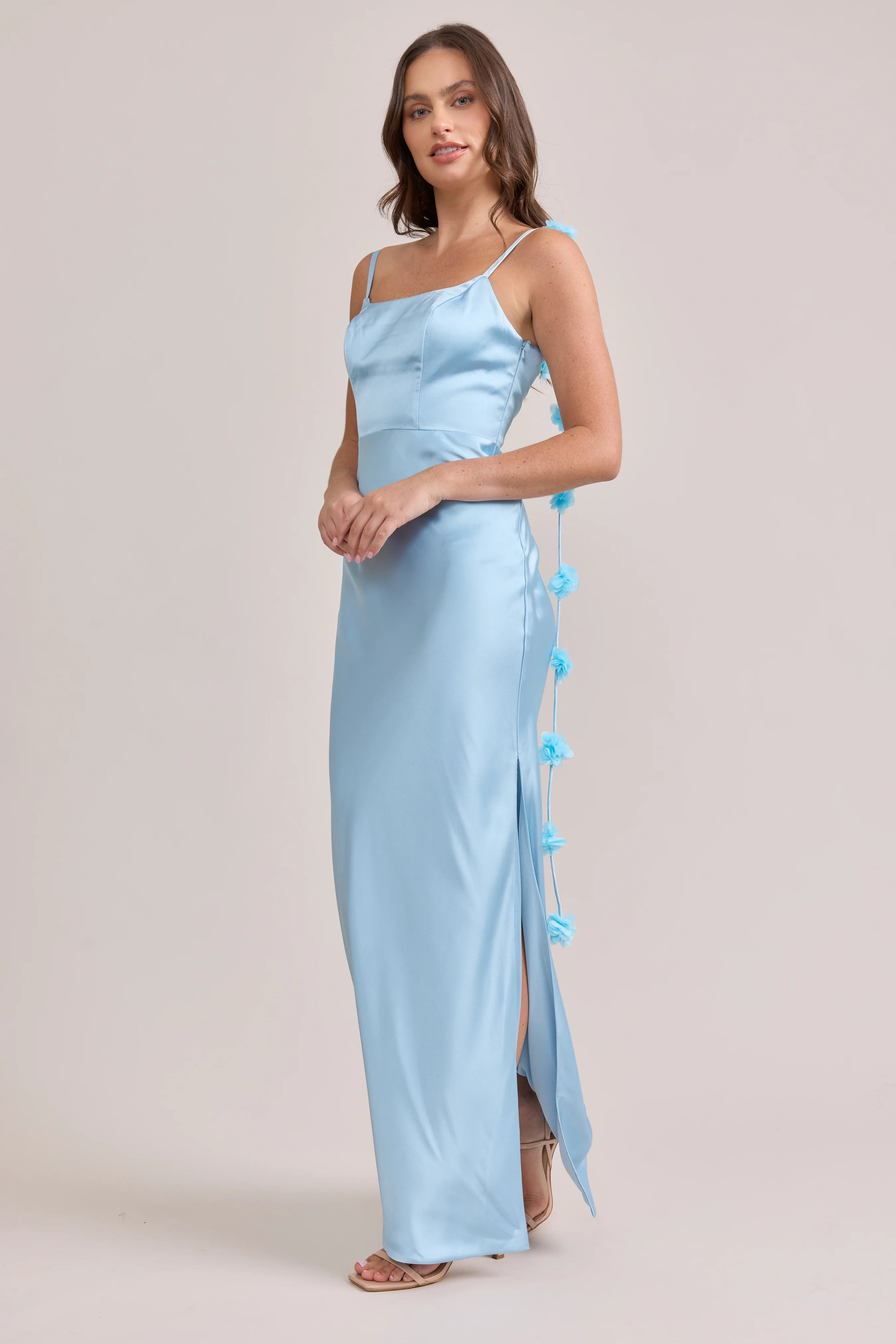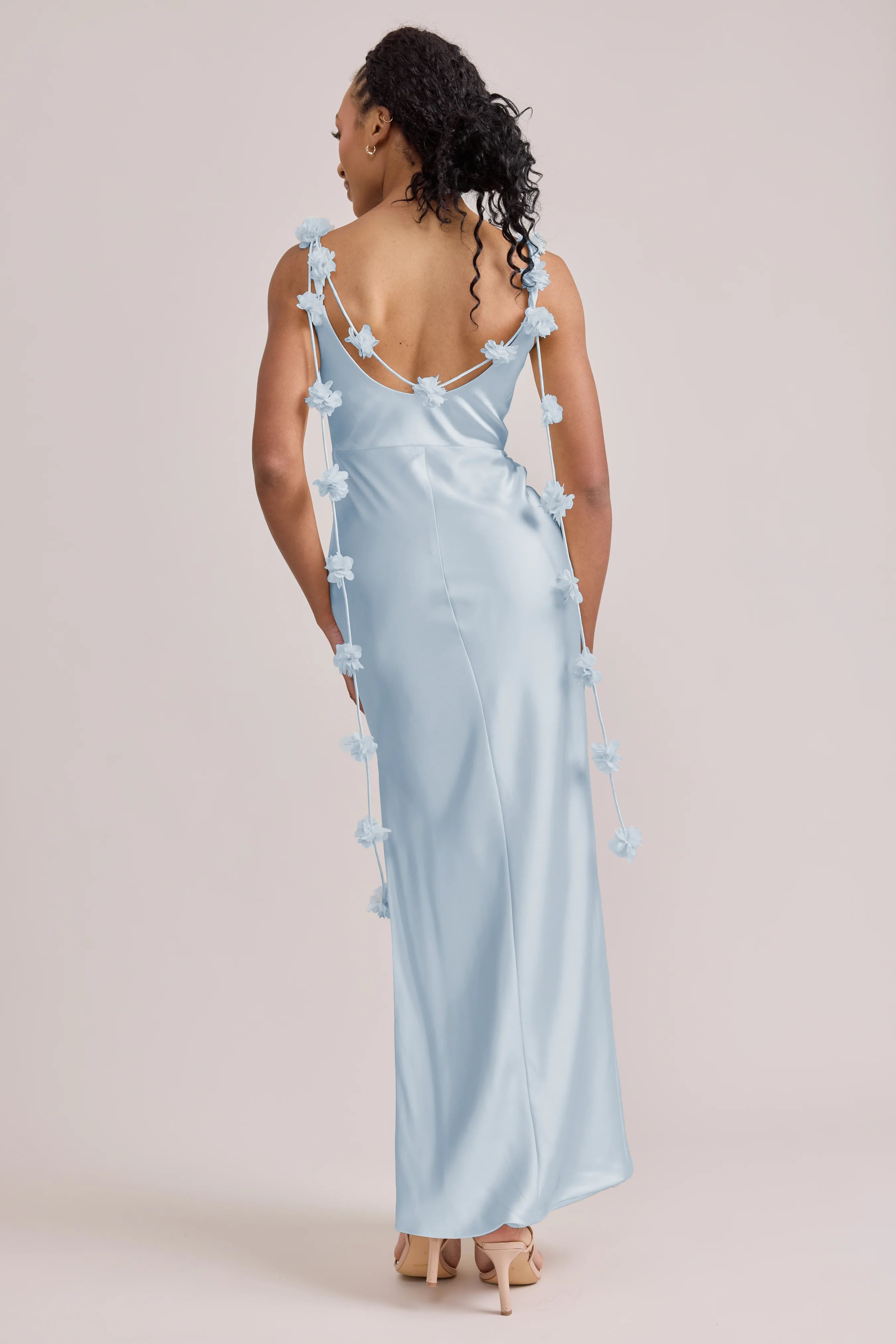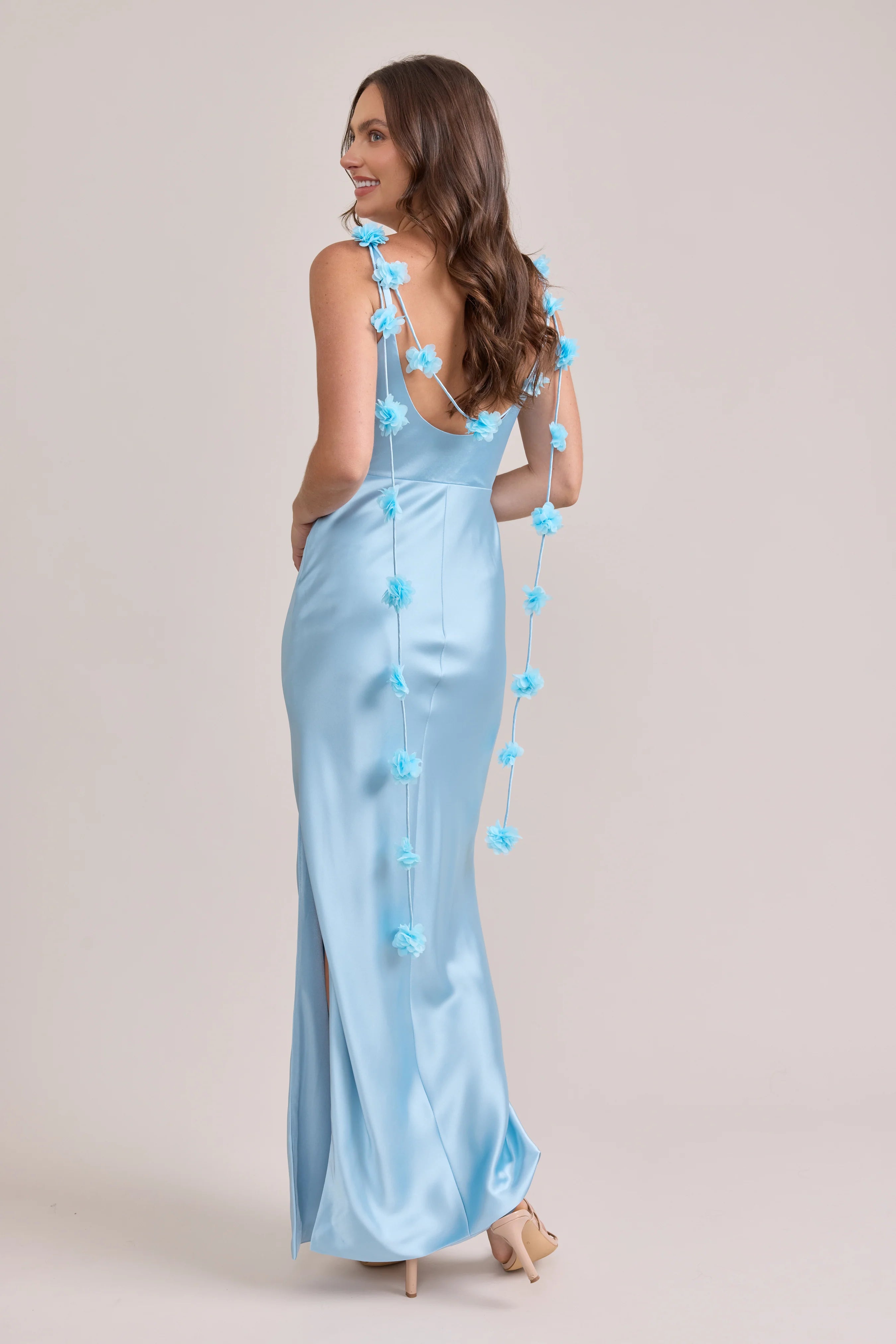 Sleek in the front, whimsy in the back, our LUXE Ellapink Satin Dress is an instant serotonin boost. Remi’s simple yet flattering silhouette is the perfect canvas for these beautifully draped florals to accessorize. This style features a fitted silhouette, left side slit and open back, where chiffon floral poofs are highlighted, attached to the adjustable spaghetti straps. Two additional floral strands hang off either shoulder, completing this playful and romantic dress.
