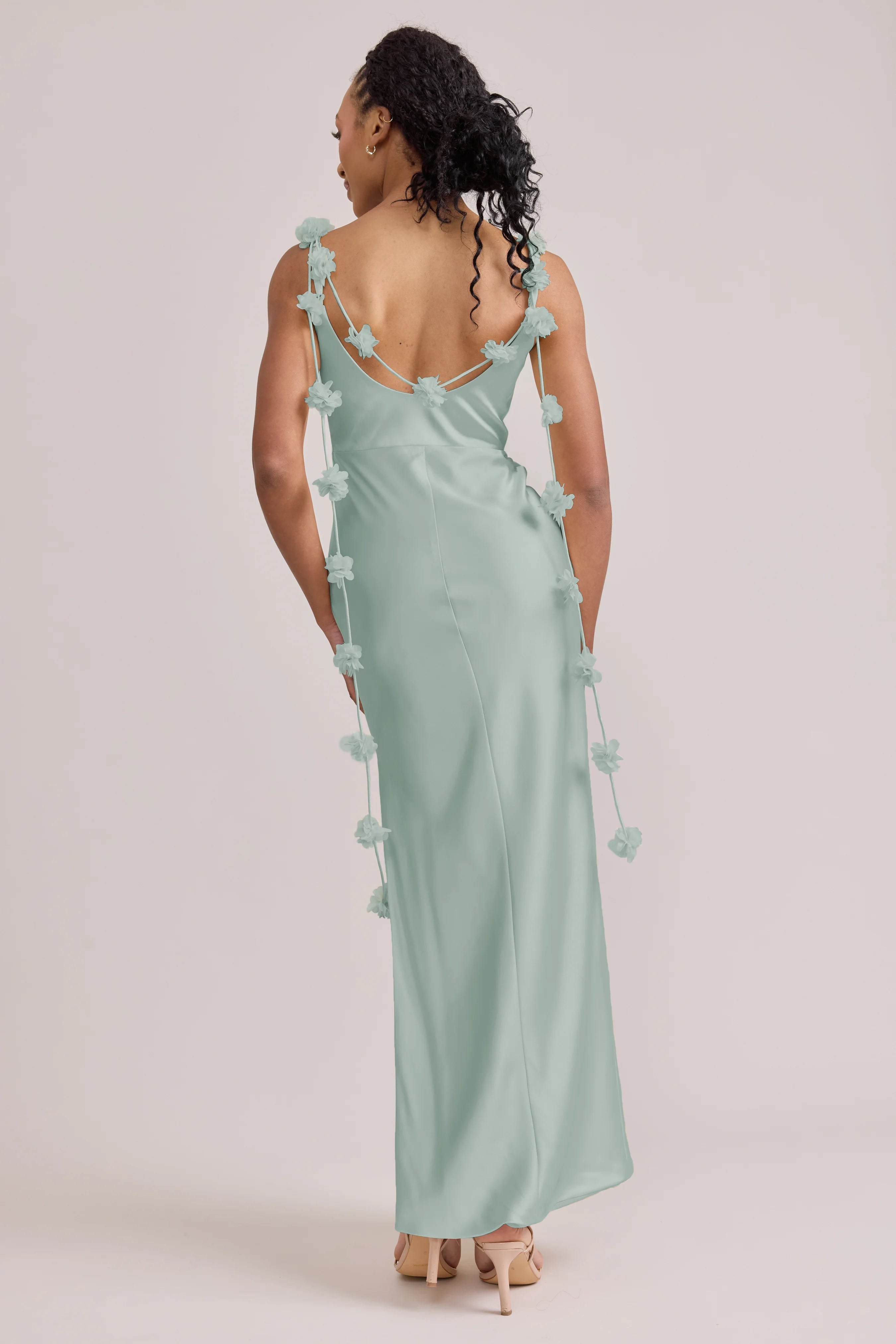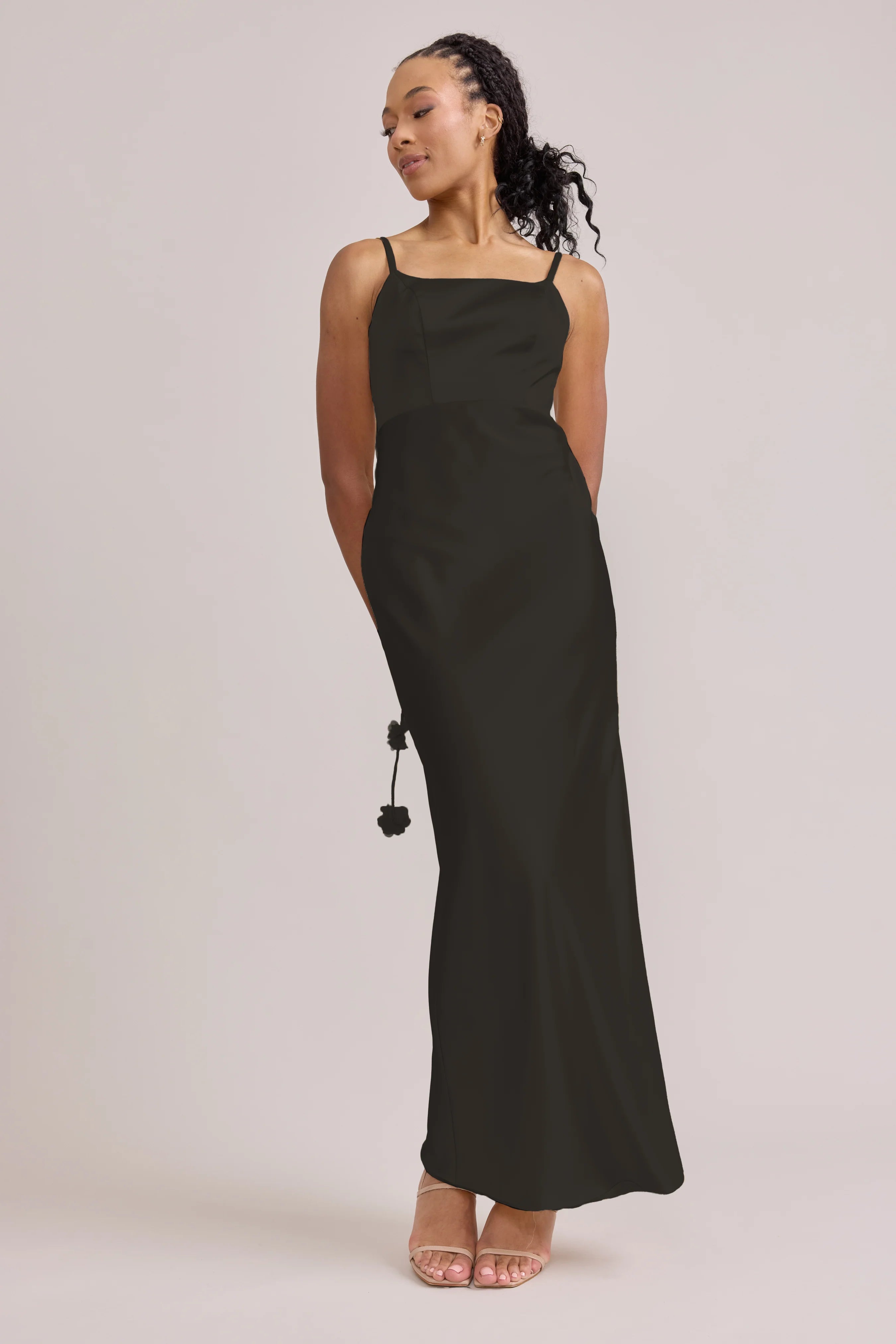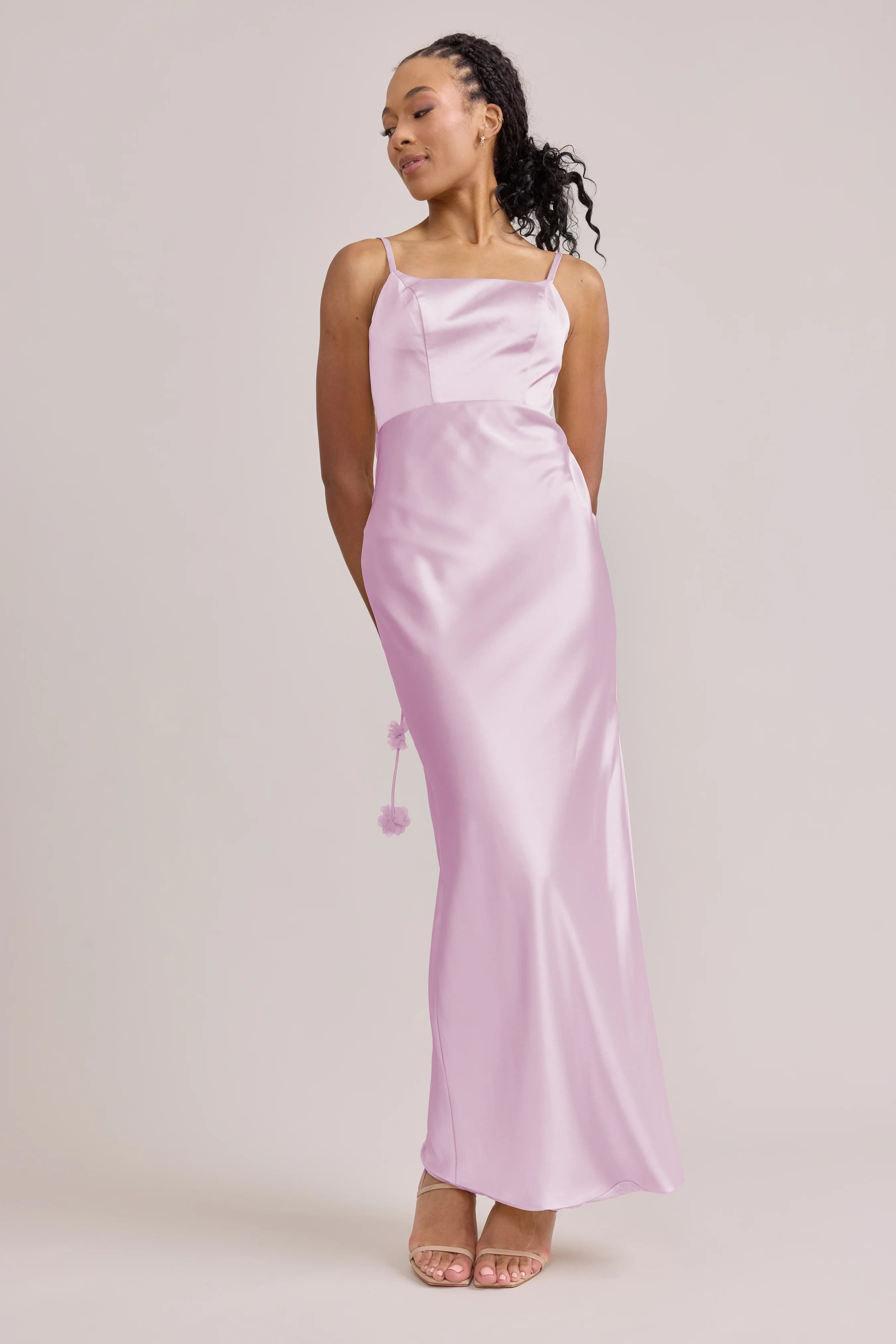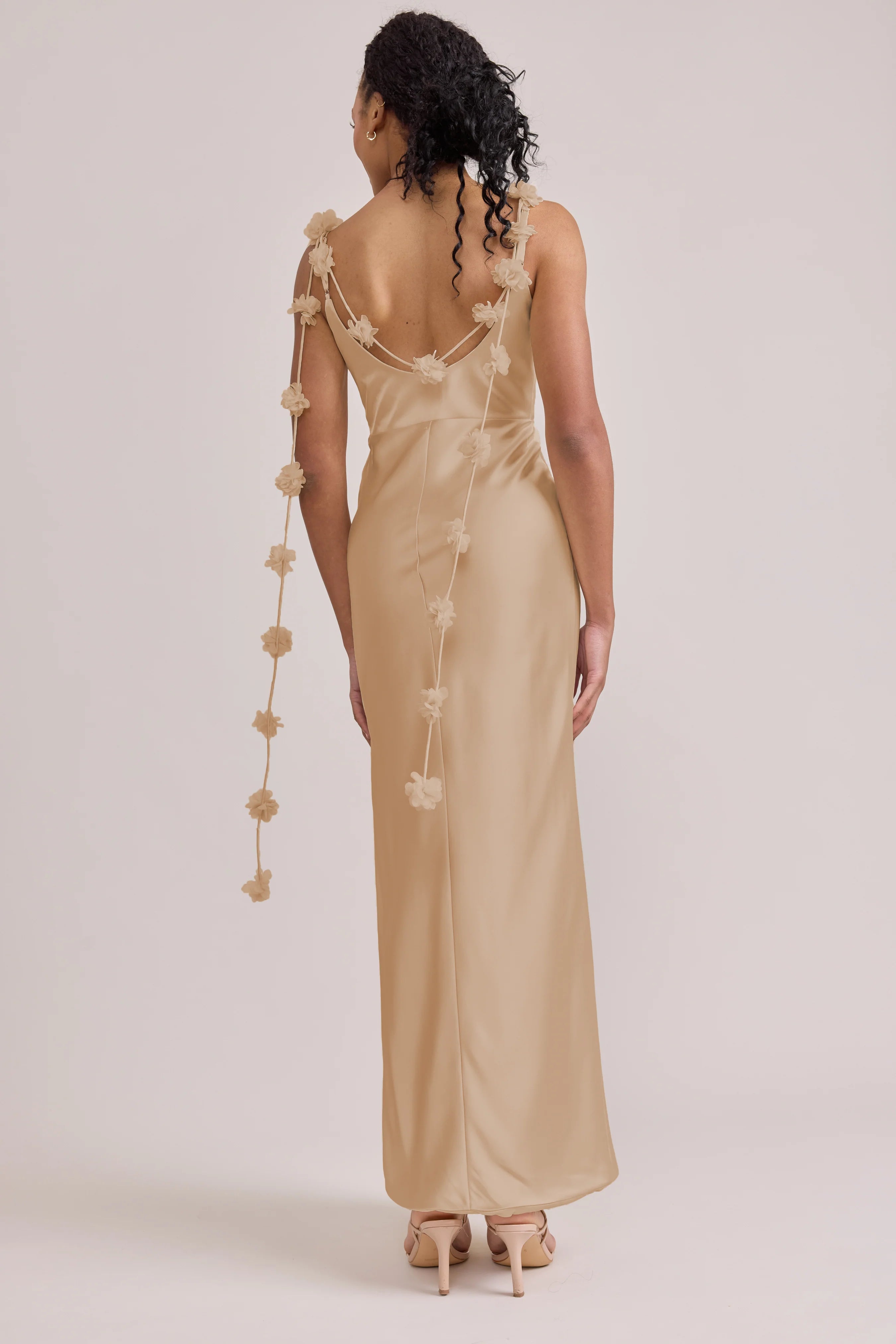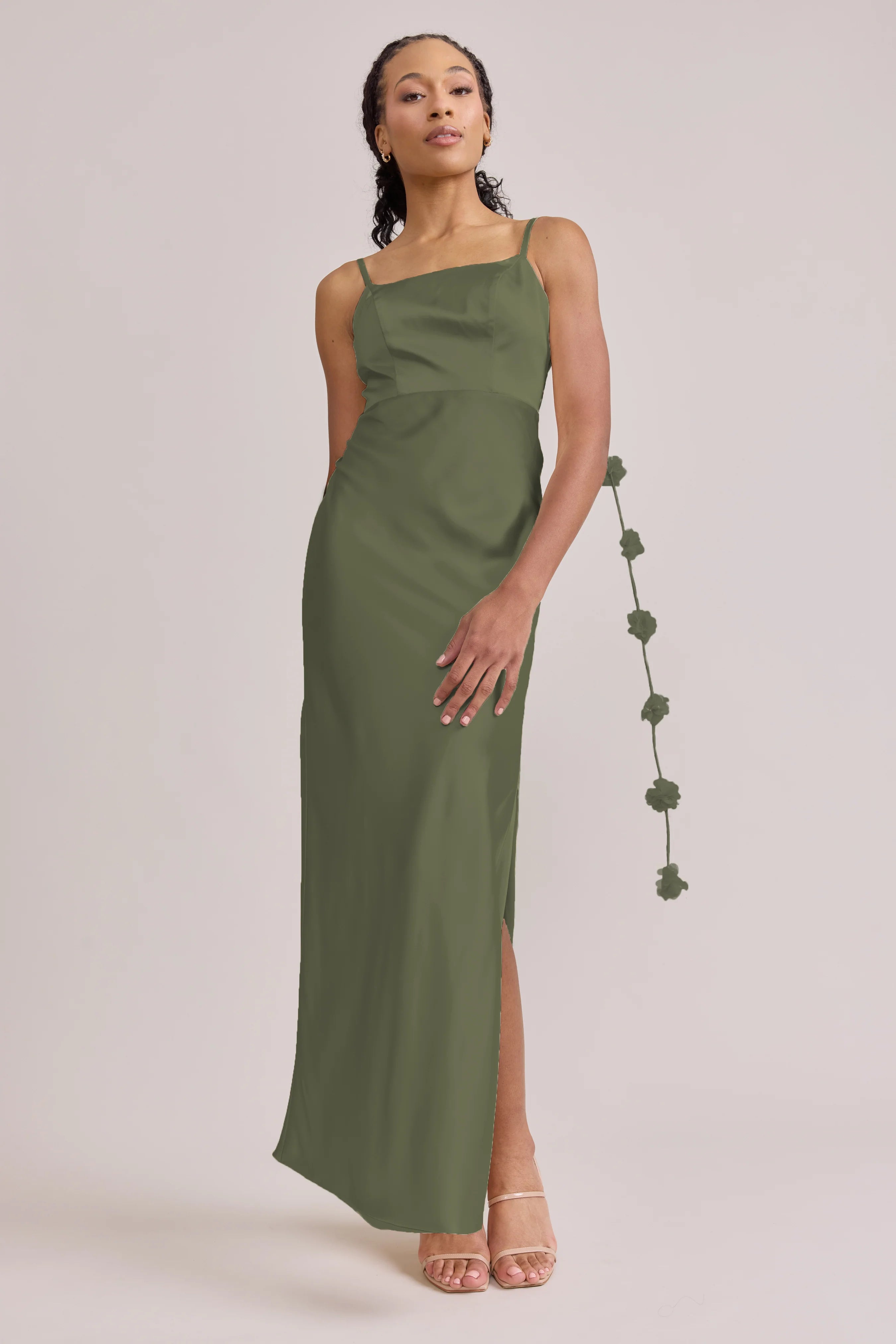 Sleek in the front, whimsy in the back, our LUXE Ellapink Satin Dress is an instant serotonin boost. Remi’s simple yet flattering silhouette is the perfect canvas for these beautifully draped florals to accessorize. This style features a fitted silhouette, left side slit and open back, where chiffon floral poofs are highlighted, attached to the adjustable spaghetti straps. Two additional floral strands hang off either shoulder, completing this playful and romantic dress.