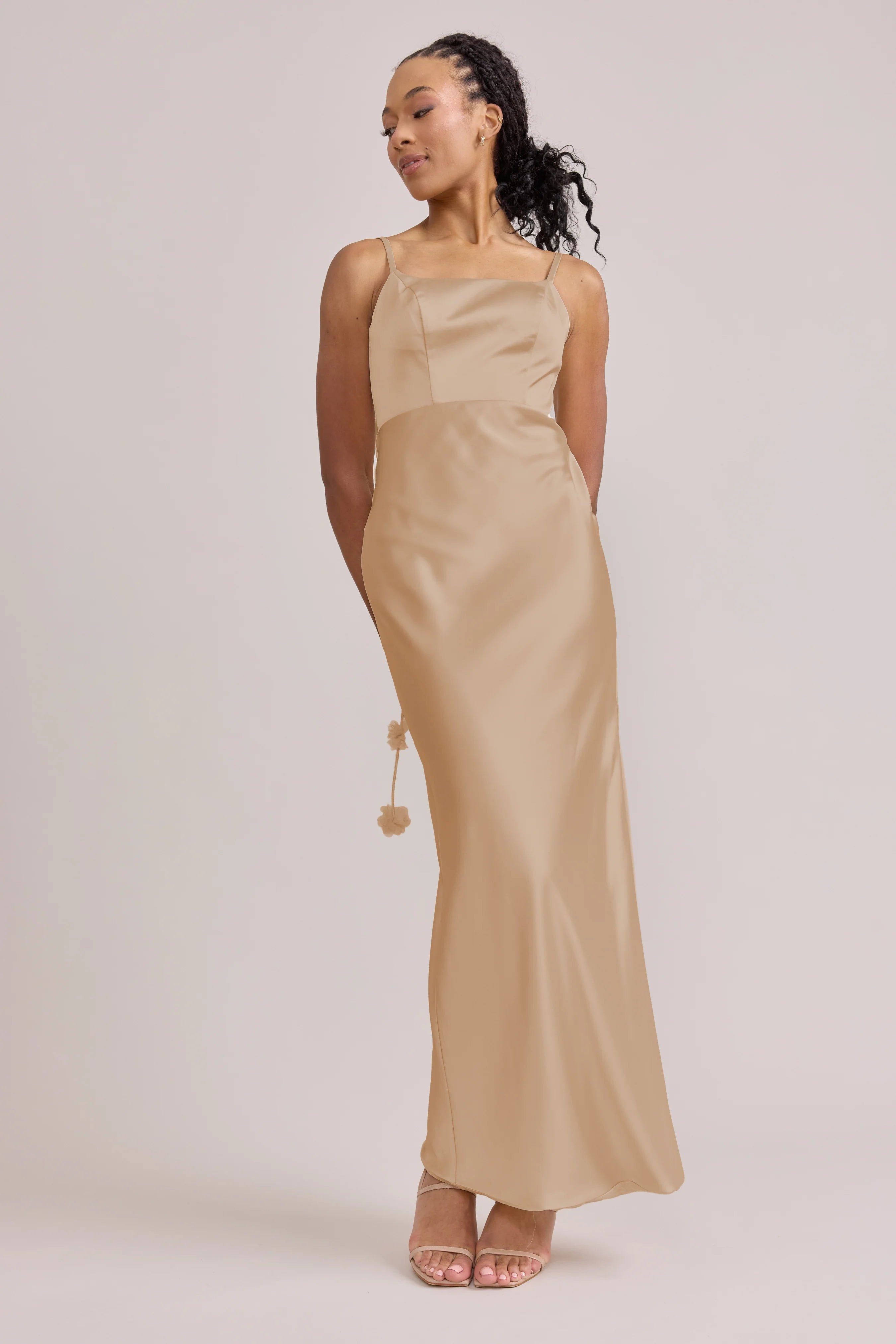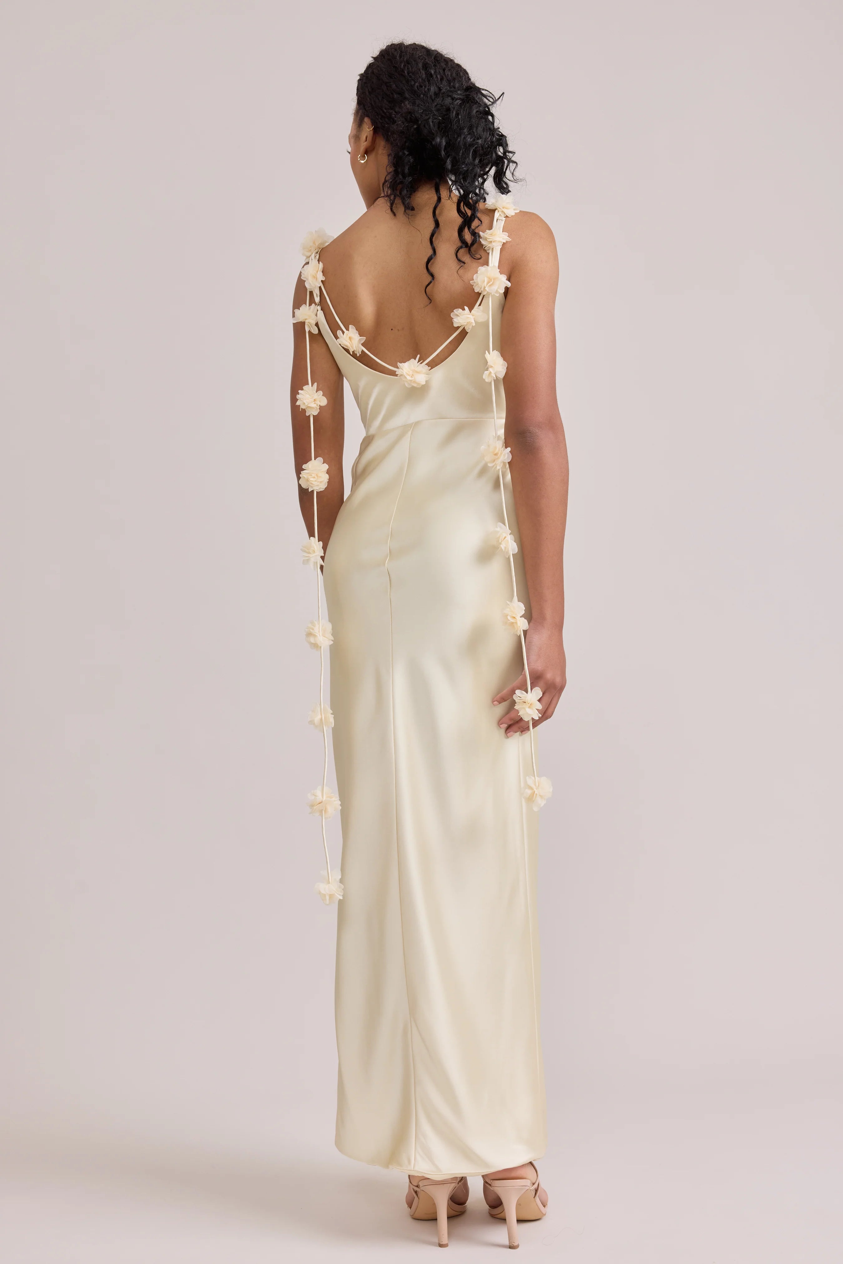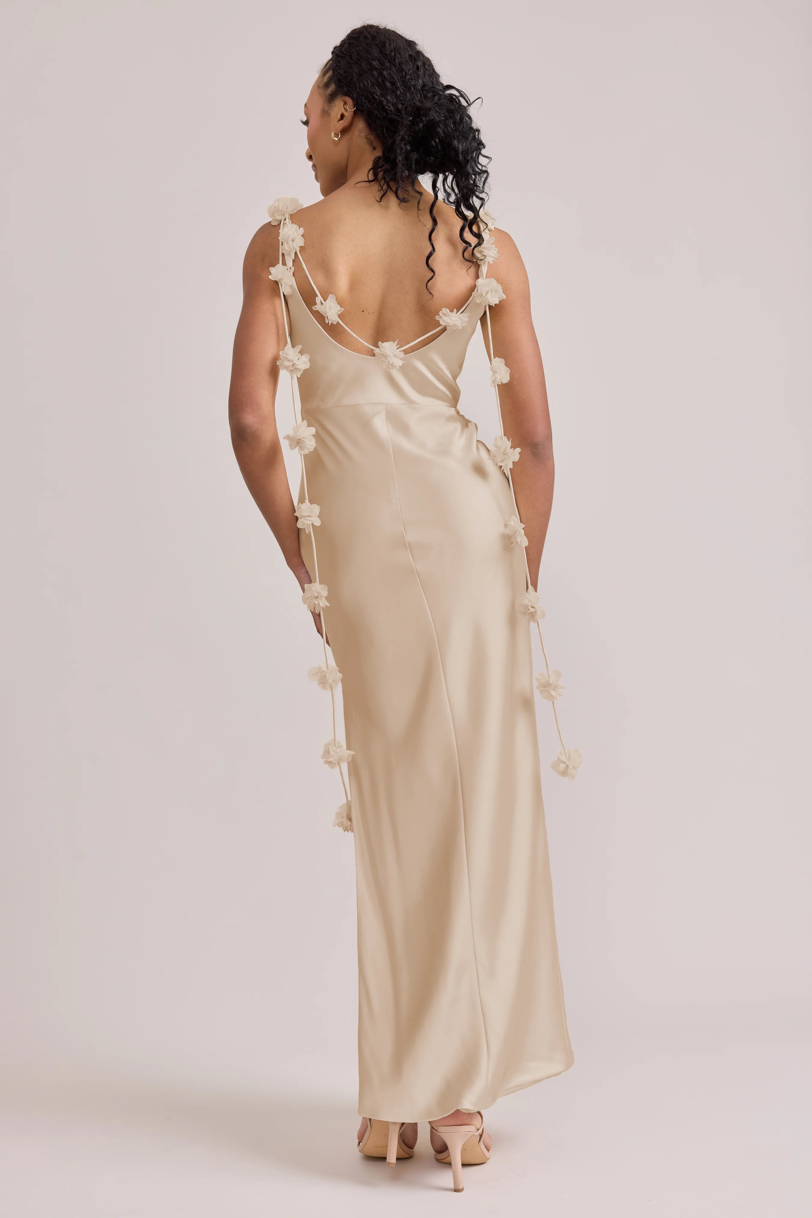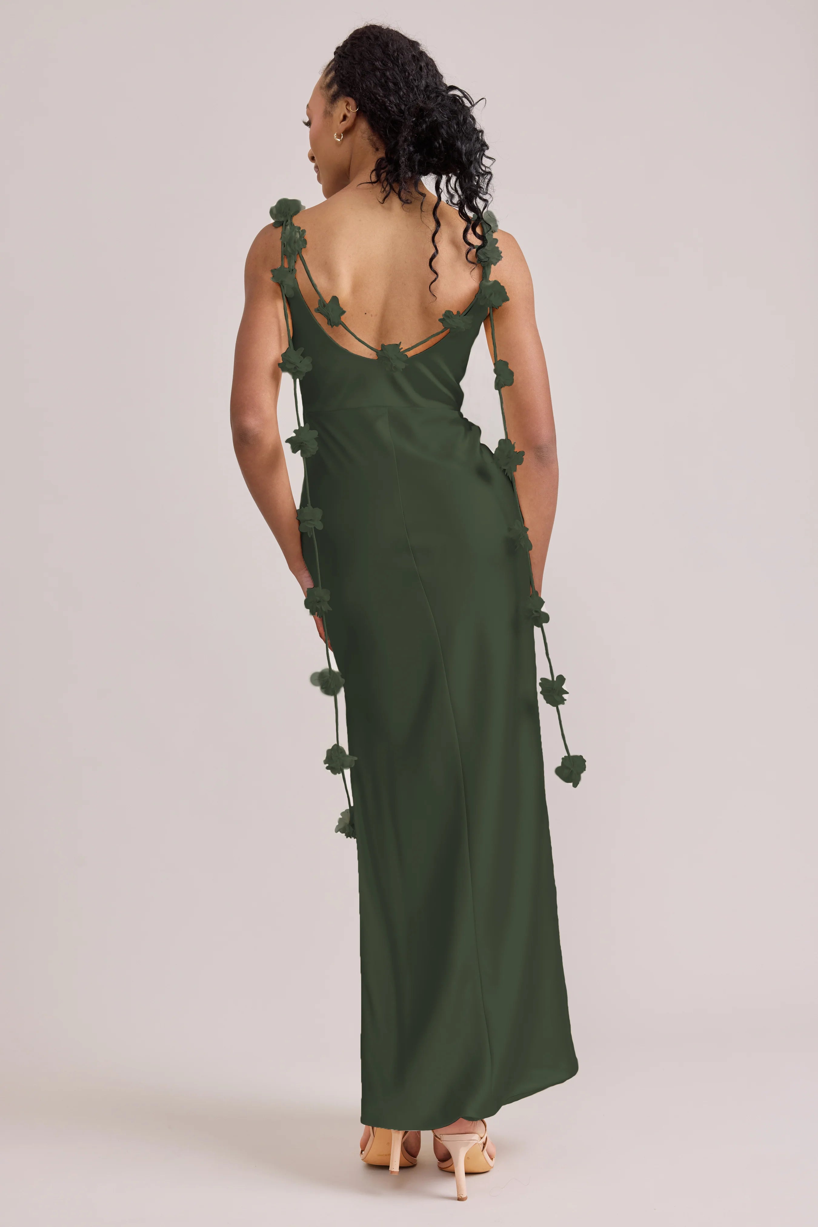 Sleek in the front, whimsy in the back, our LUXE Ellapink Satin Dress is an instant serotonin boost. Remi’s simple yet flattering silhouette is the perfect canvas for these beautifully draped florals to accessorize. This style features a fitted silhouette, left side slit and open back, where chiffon floral poofs are highlighted, attached to the adjustable spaghetti straps. Two additional floral strands hang off either shoulder, completing this playful and romantic dress.
