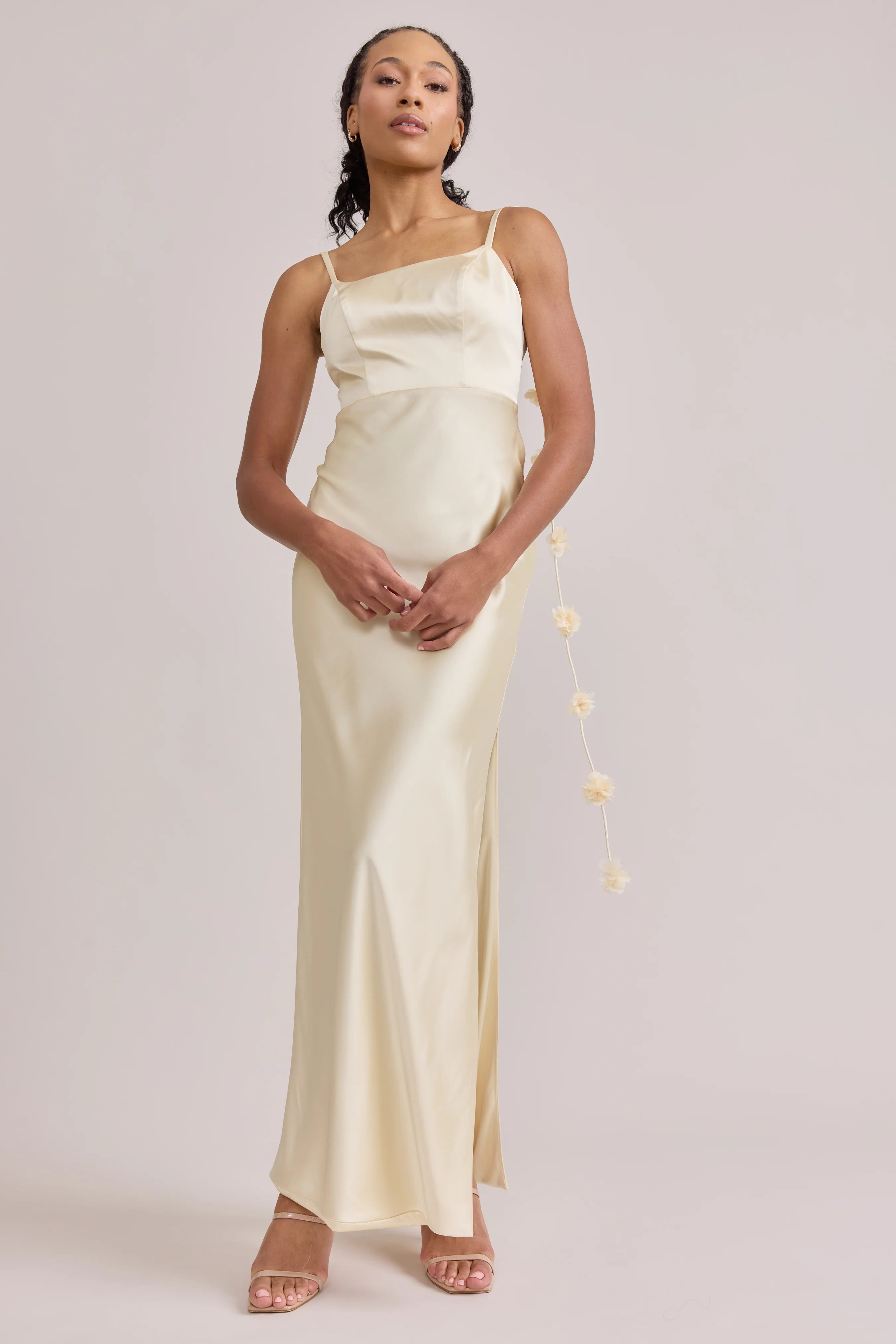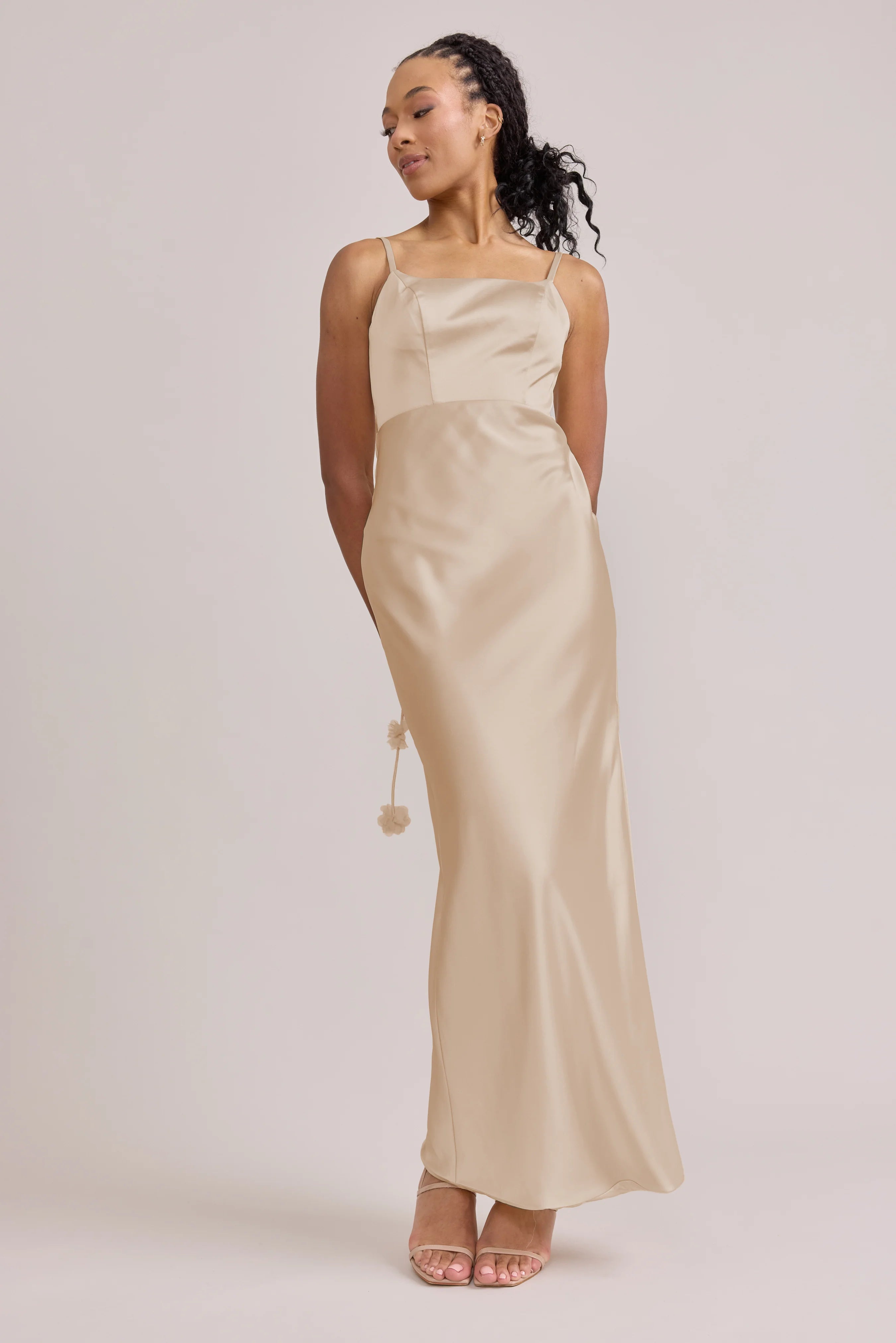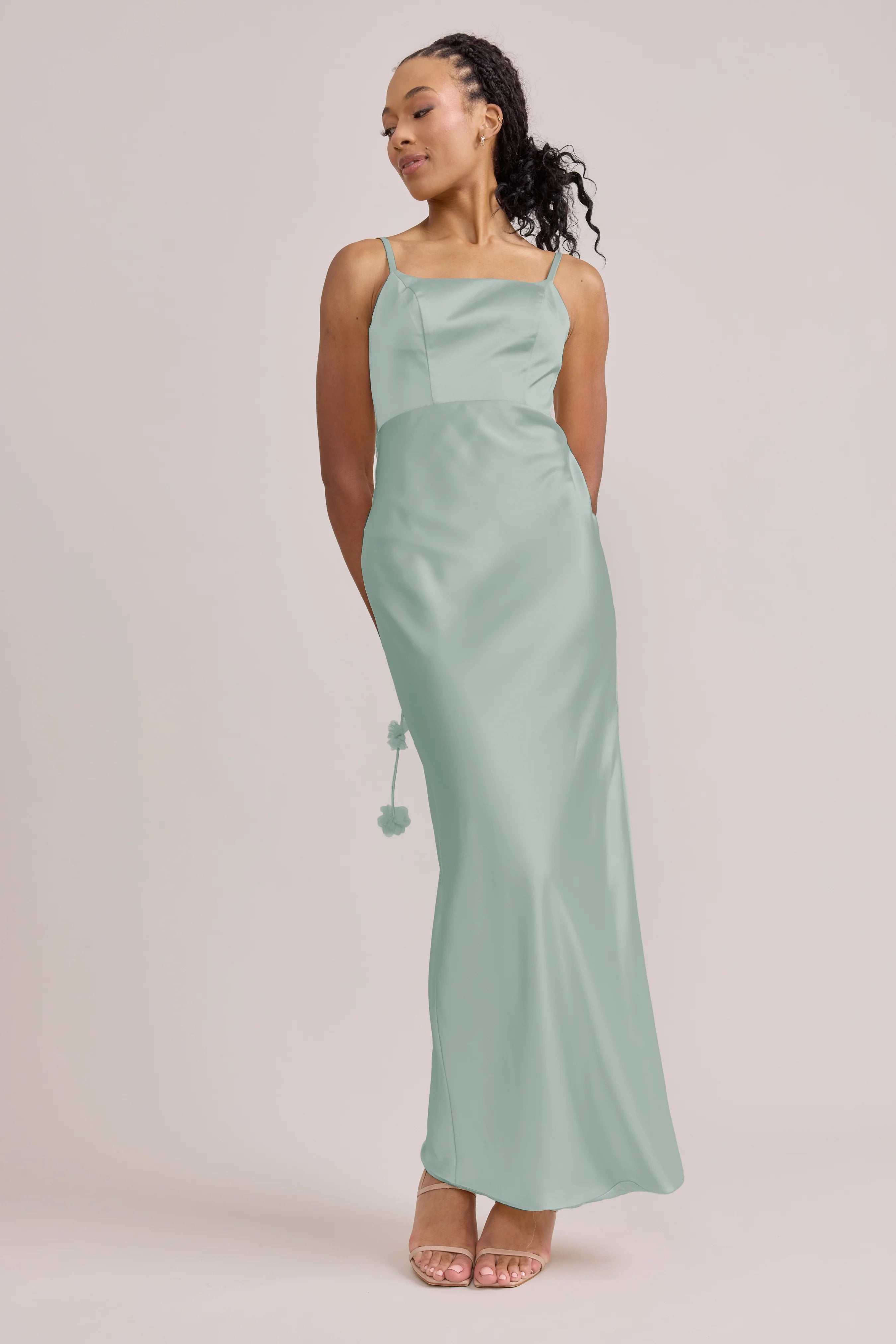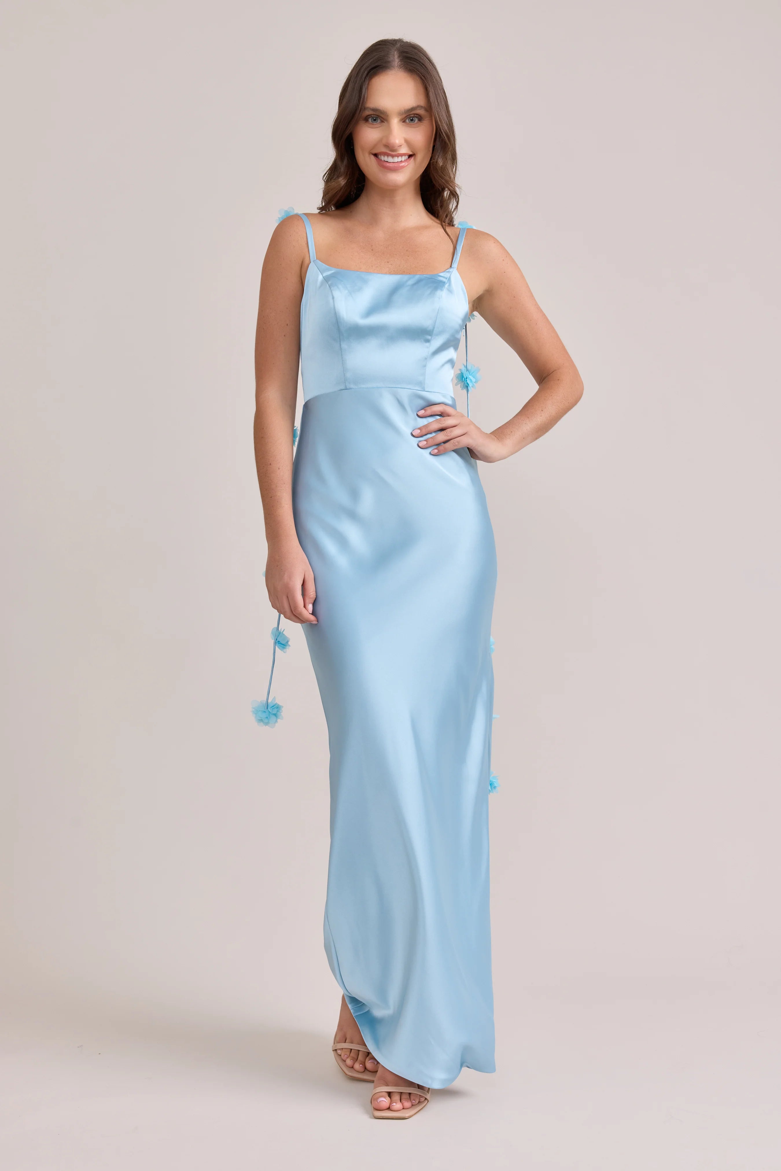 Sleek in the front, whimsy in the back, our LUXE Ellapink Satin Dress is an instant serotonin boost. Remi’s simple yet flattering silhouette is the perfect canvas for these beautifully draped florals to accessorize. This style features a fitted silhouette, left side slit and open back, where chiffon floral poofs are highlighted, attached to the adjustable spaghetti straps. Two additional floral strands hang off either shoulder, completing this playful and romantic dress.
