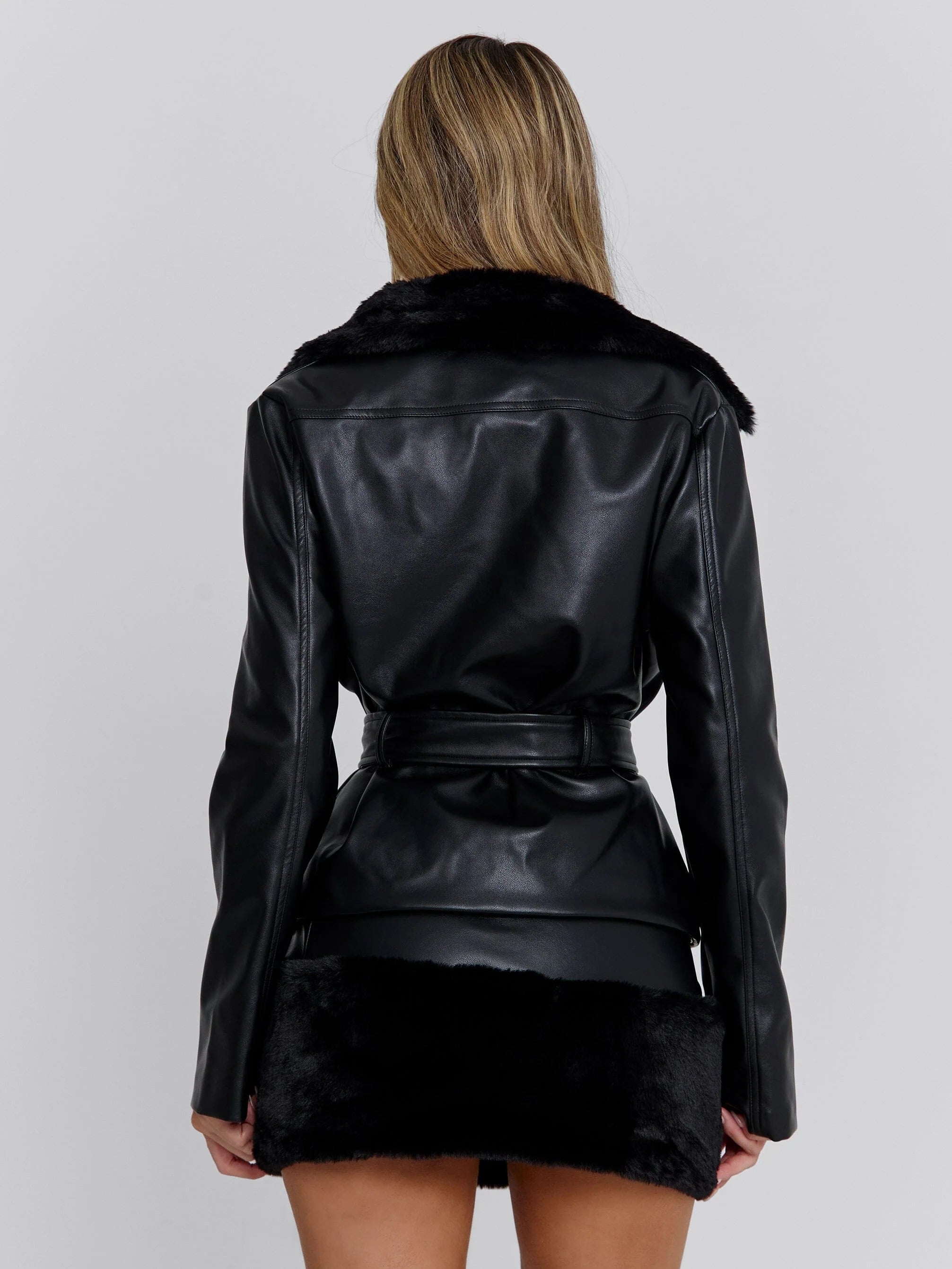 Designed for cooler nights, she features a sleek PU finish with plush faux fur detailing for added warmth and texture. Fully lined for comfort, she cinches at the waist with a tie belt to shape the silhouette while keeping the fit relaxed and wearable.