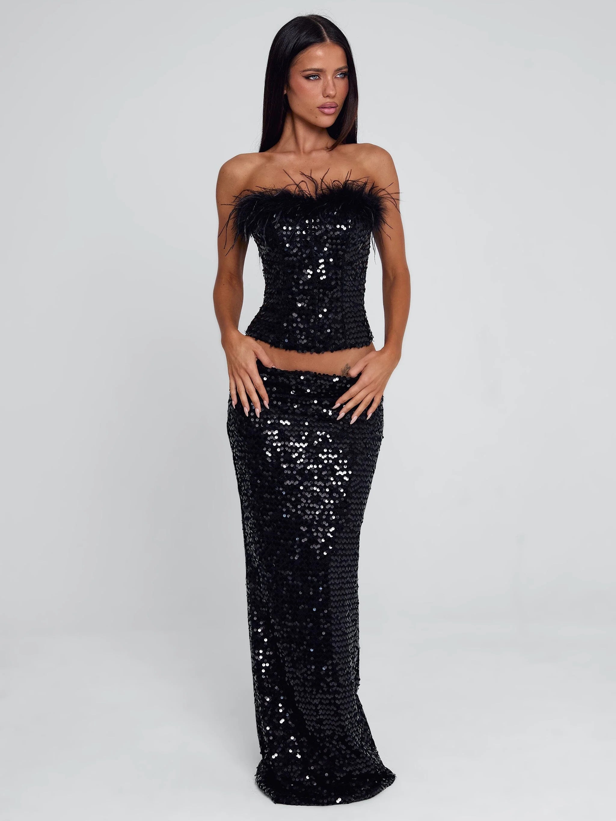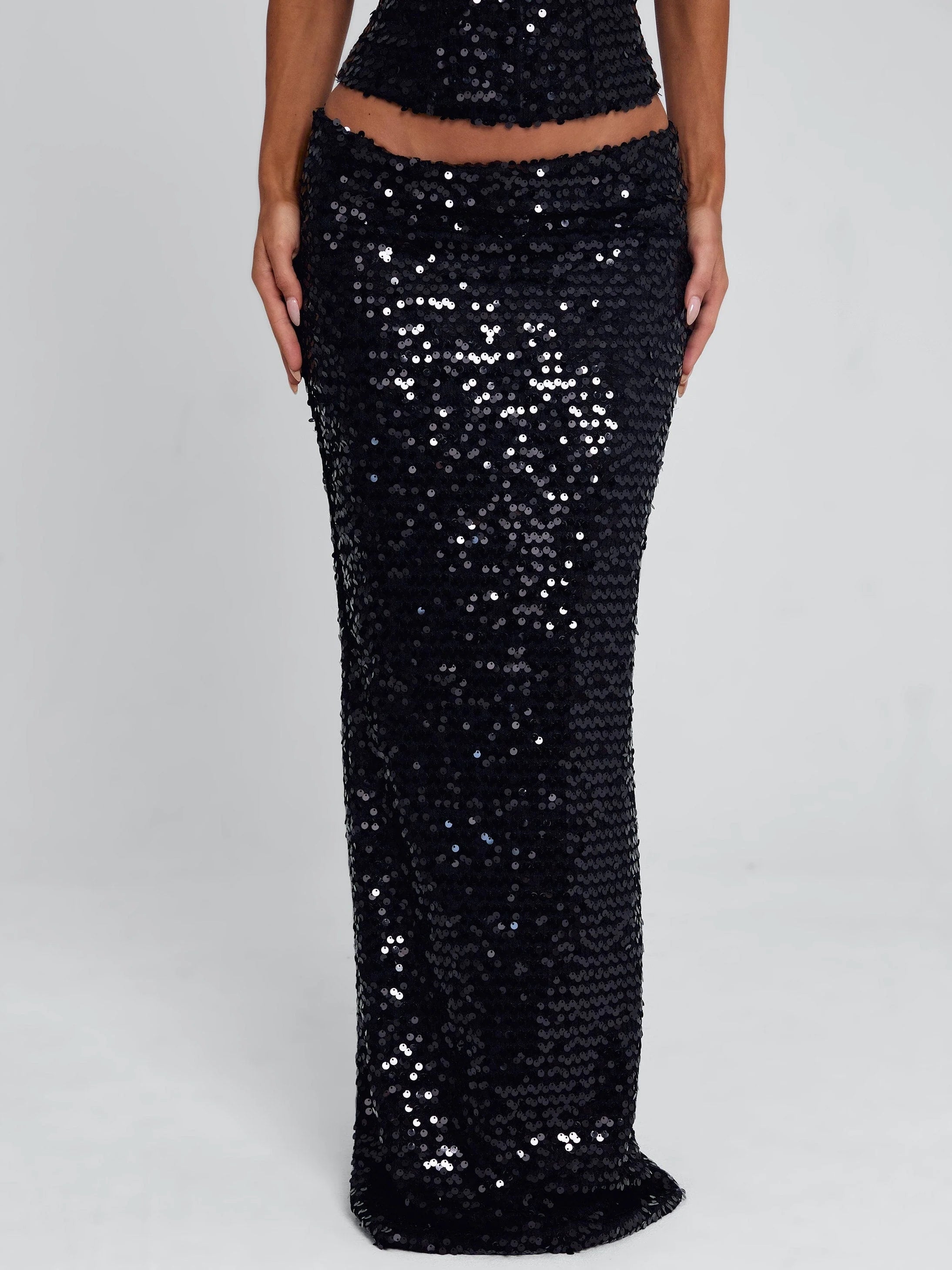 Made from stretch sequin fabrication, she sits low on the waist and falls into a straight, floor-grazing silhouette. Fully lined for comfort, she’s finished with a subtle zip entry to maintain a smooth, minimal look.