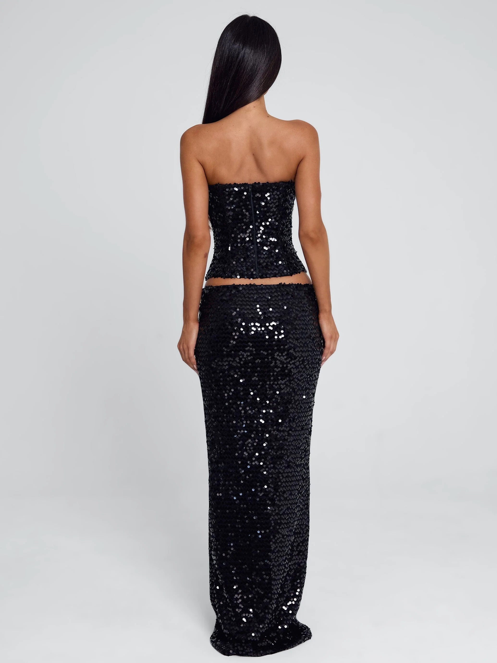 Crafted from stretch sequin fabric, she’s designed with a structured, corset-inspired fit featuring internal boning for shape and support. A feather-trimmed neckline adds soft texture and contrast, while a clean zip closure at the back keeps the silhouette sleek.
