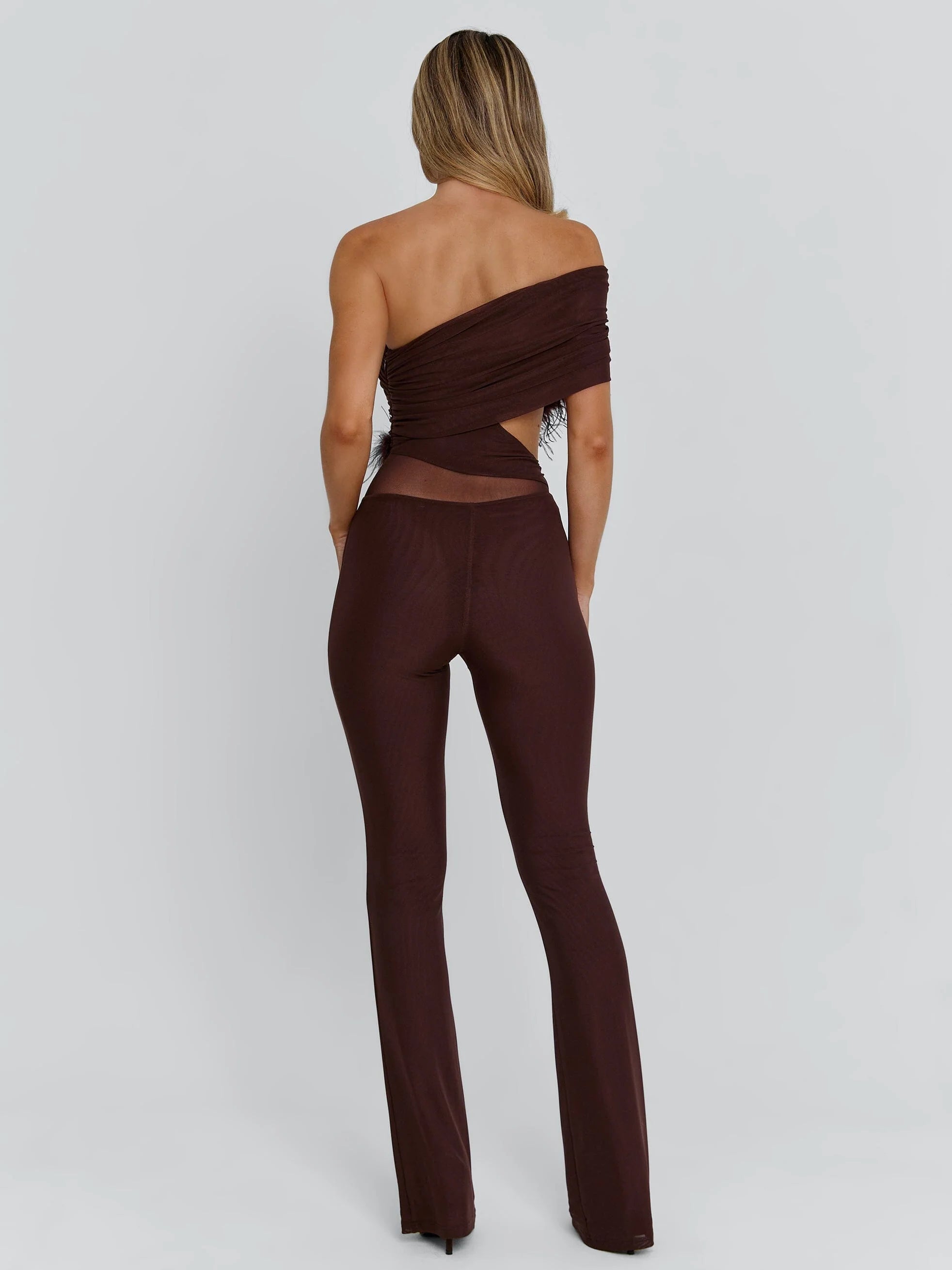 Crafted from soft mesh fabrication, she contours the body with a smooth, body-con fit while sheer panel detailing adds a subtle edge. Designed with a one-shoulder neckline, the feather trim at the bust brings a statement finish. A cut-out at the waist creates shape, while the fully lined construction ensures comfort and coverage. Finished with an invisible zip closure for a seamless fit.