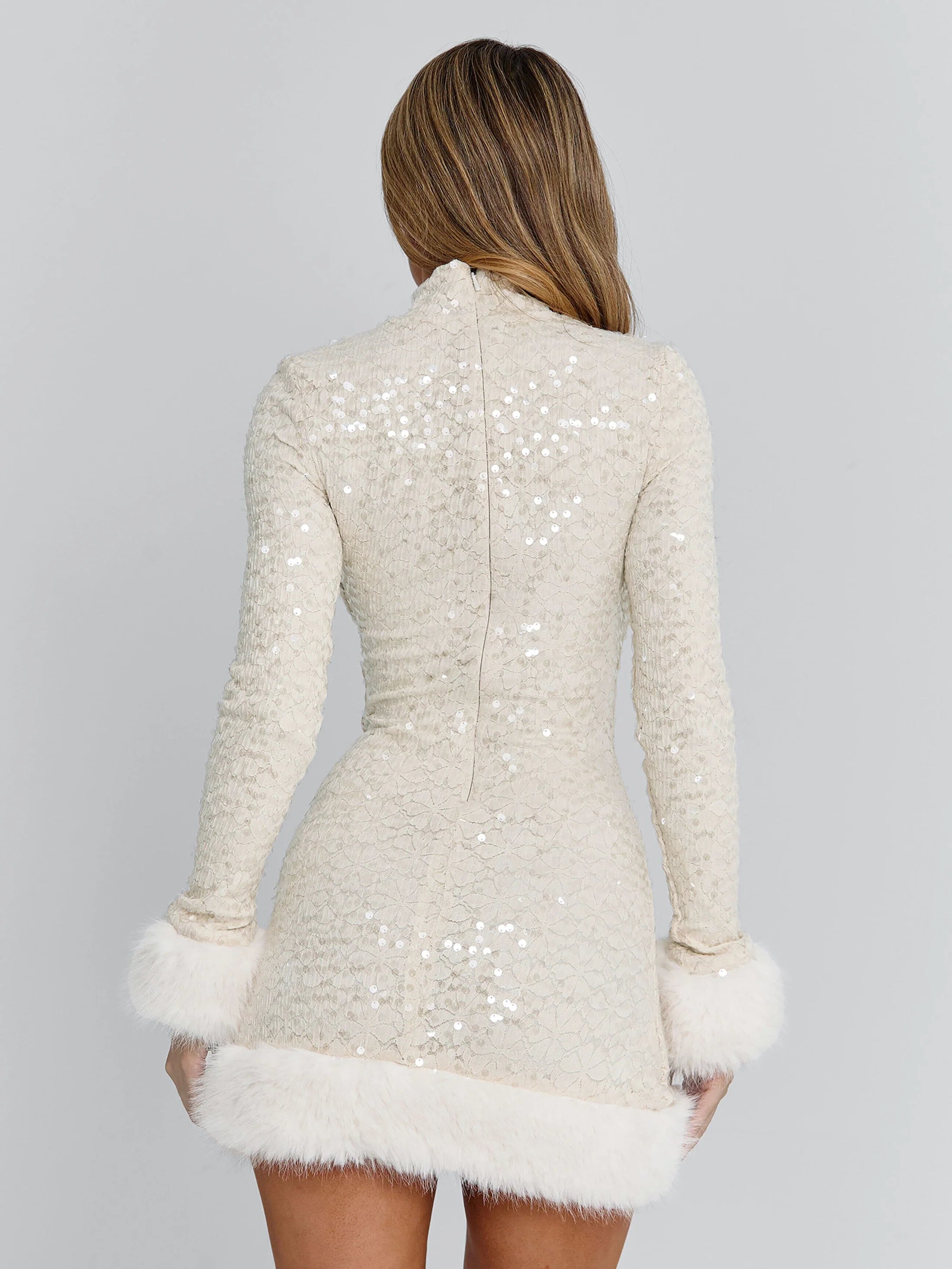 She’s crafted from a stretch sequin knit that catches the light with every move, balanced with a sleek high collar and a clean, body-skimming fit. Faux fur cuffs and hem add a luxe, seasonal touch, while the back zip closure keeps everything seamless. Fully lined for comfort, she’s made to stand out through the festive season, New Year’s Eve and any evening event.