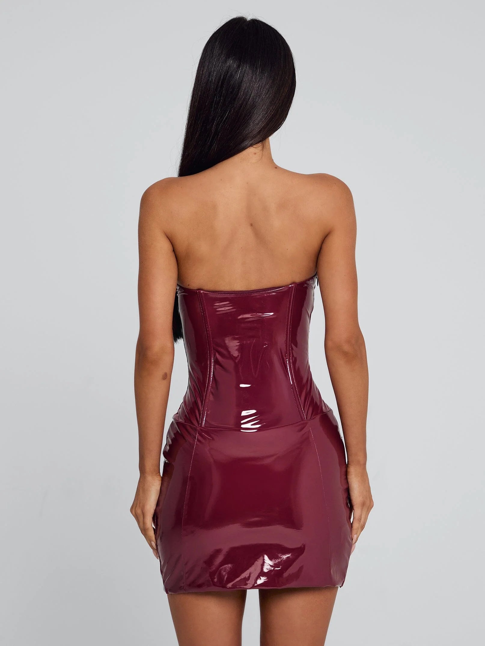 She’s crafted from a stretch PVC fabrication with scalloped trim and sheer lace paneling that contours the body. Designed with an underwired bust, body-con fit and mini length, she creates a structured, sculpted silhouette while still allowing movement. Featuring a sheer lace panel through the skirt and a secure zip closure, she has both texture, shine and shape.
