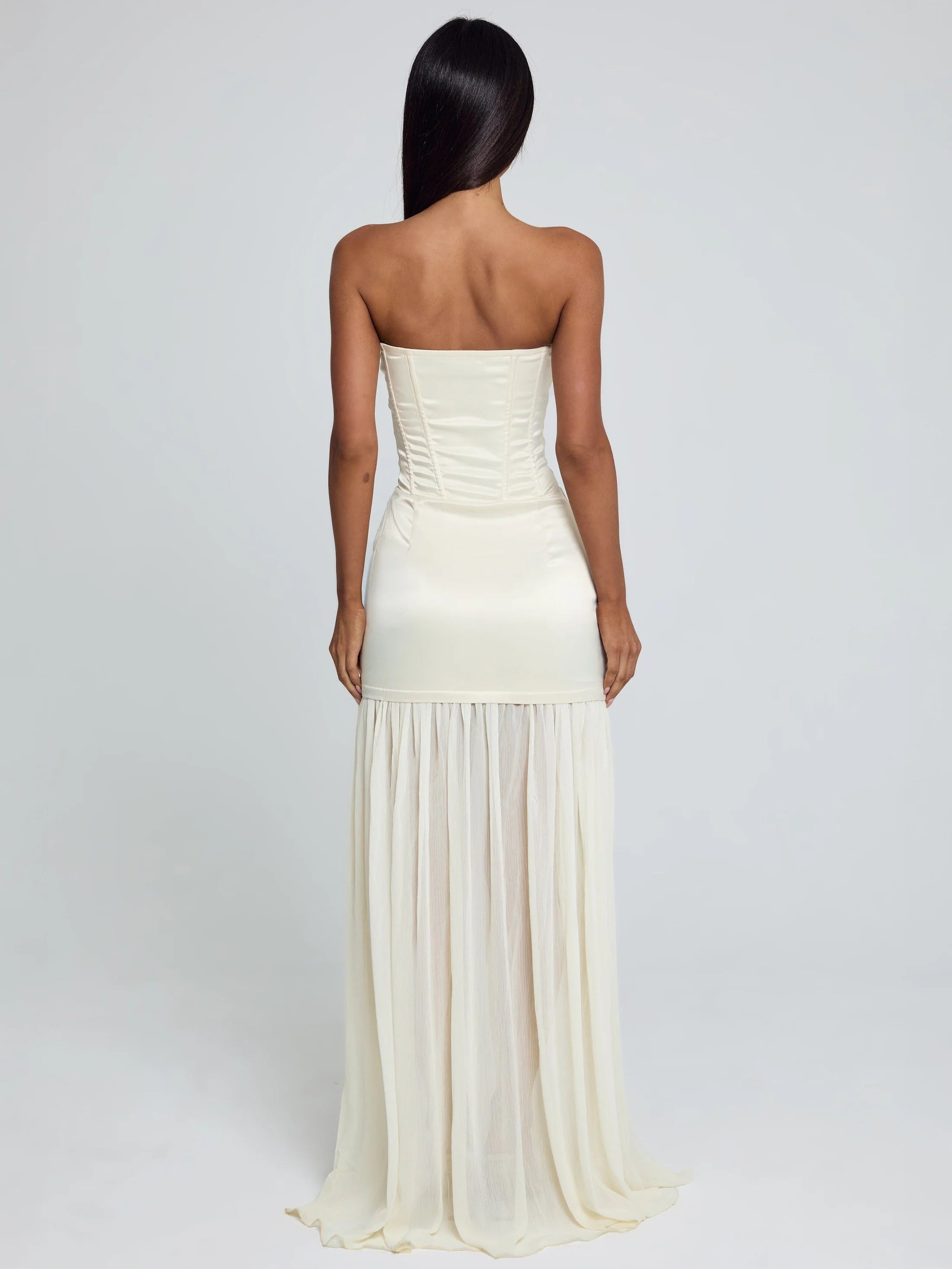 Designed in a smooth satin fabrication, she features a structured strapless bodice with internal boning and a zip closure for a secure fit. The lined mini skirt is finished with a sheer maxi-length georgette overlay, creating soft movement through the gathered skirt. Lace trim along the top edge of the bust adds a subtle, feminine detail to this elevated silhouette.