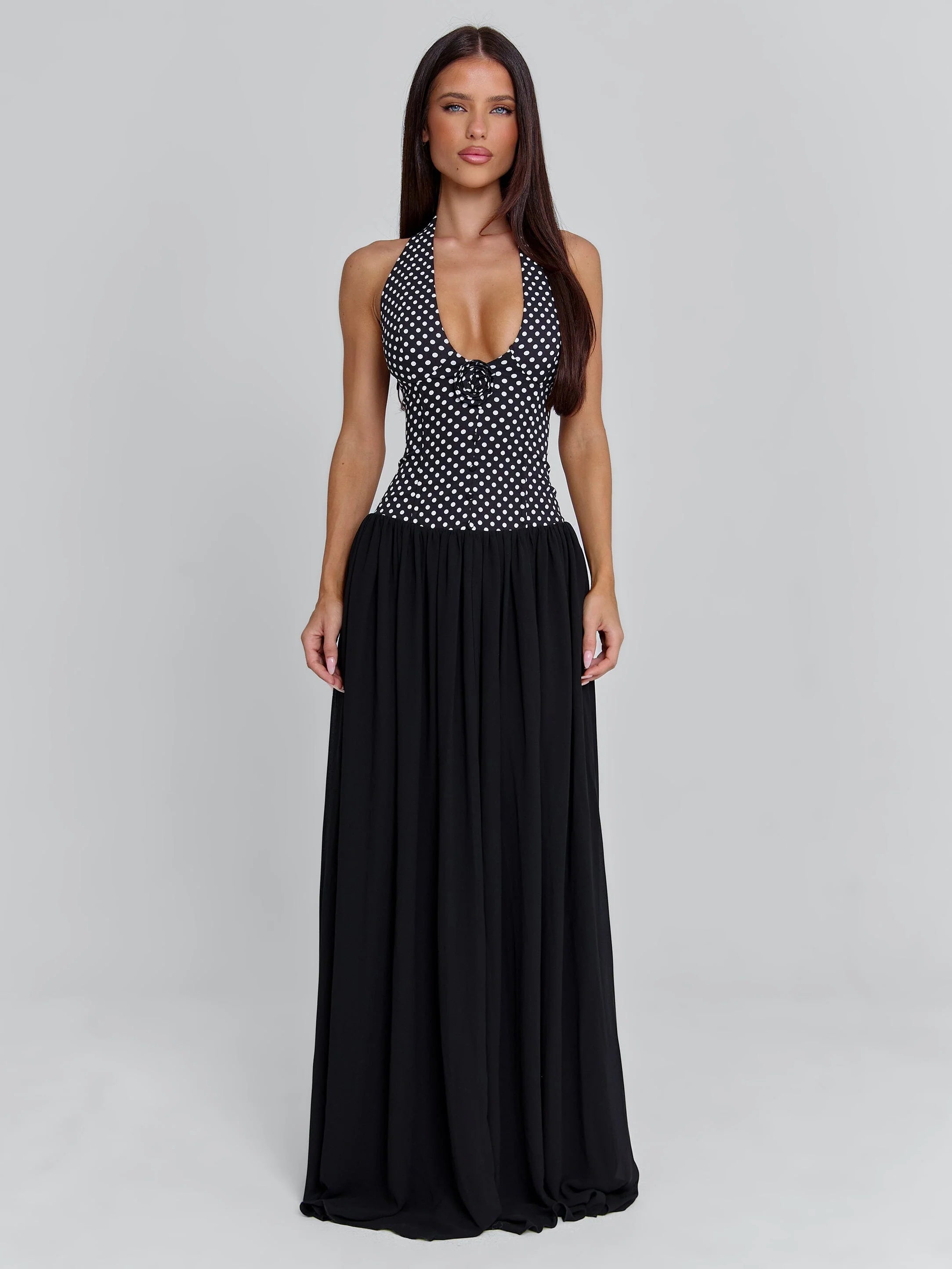 Designed as a maxi update of our best-selling Piai top, Rylie features a fitted stretch woven bodice with a soft polka dot print and subtle floral detail at the front. The bodice contours the body before flowing into a full georgette skirt in contrast black, creating an effortless, elongated silhouette.