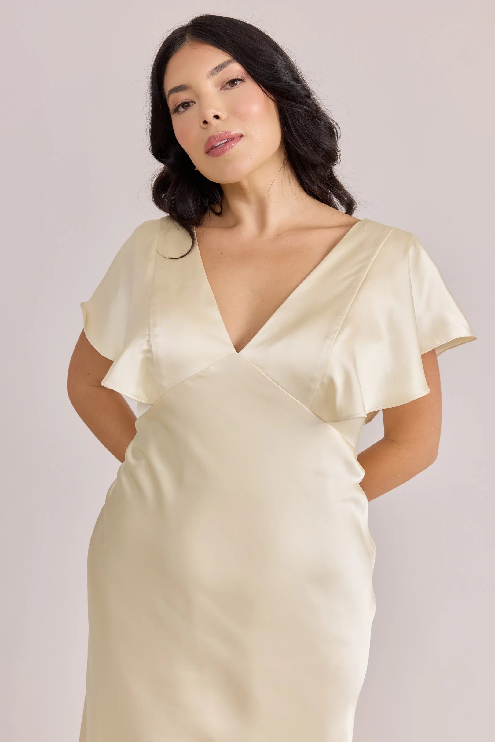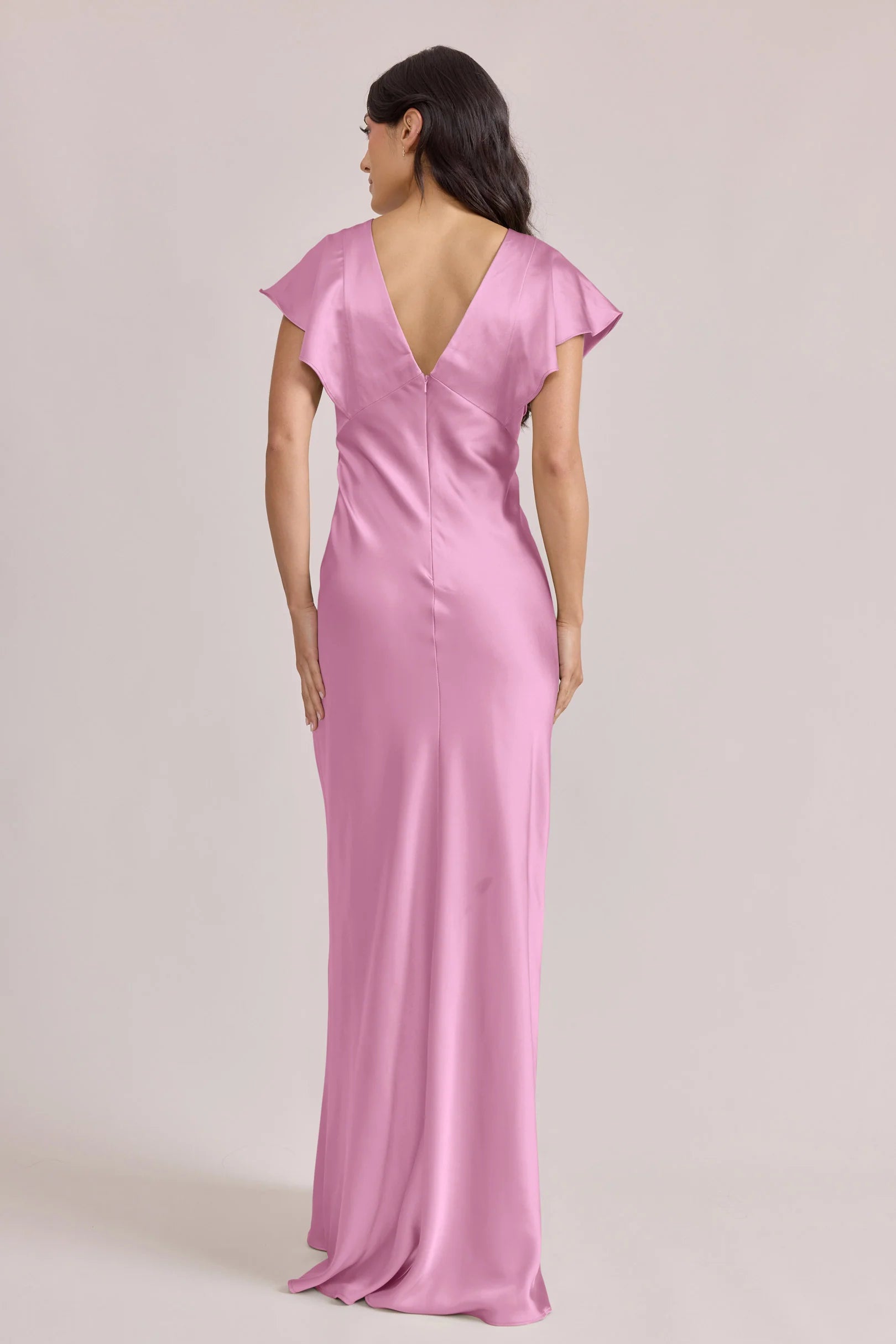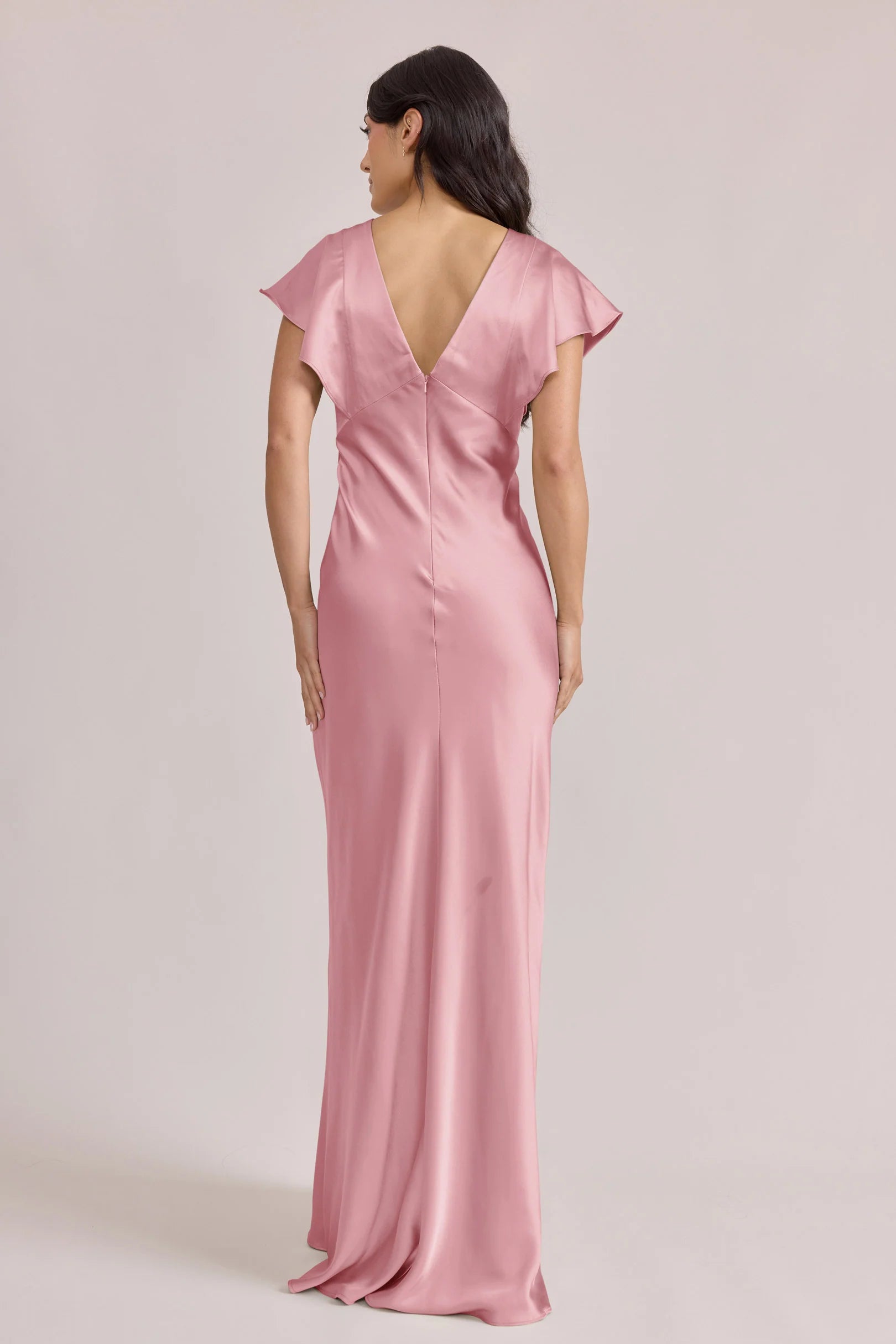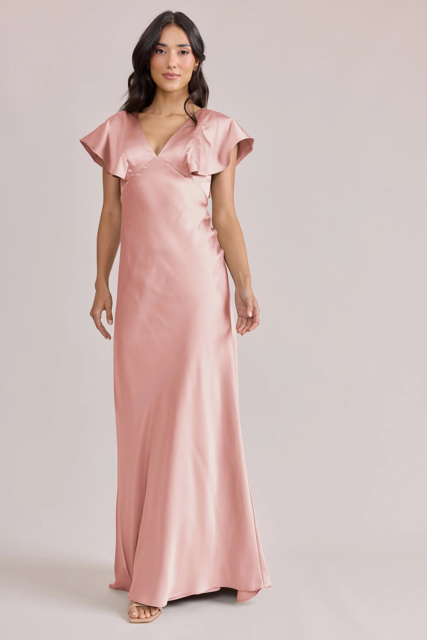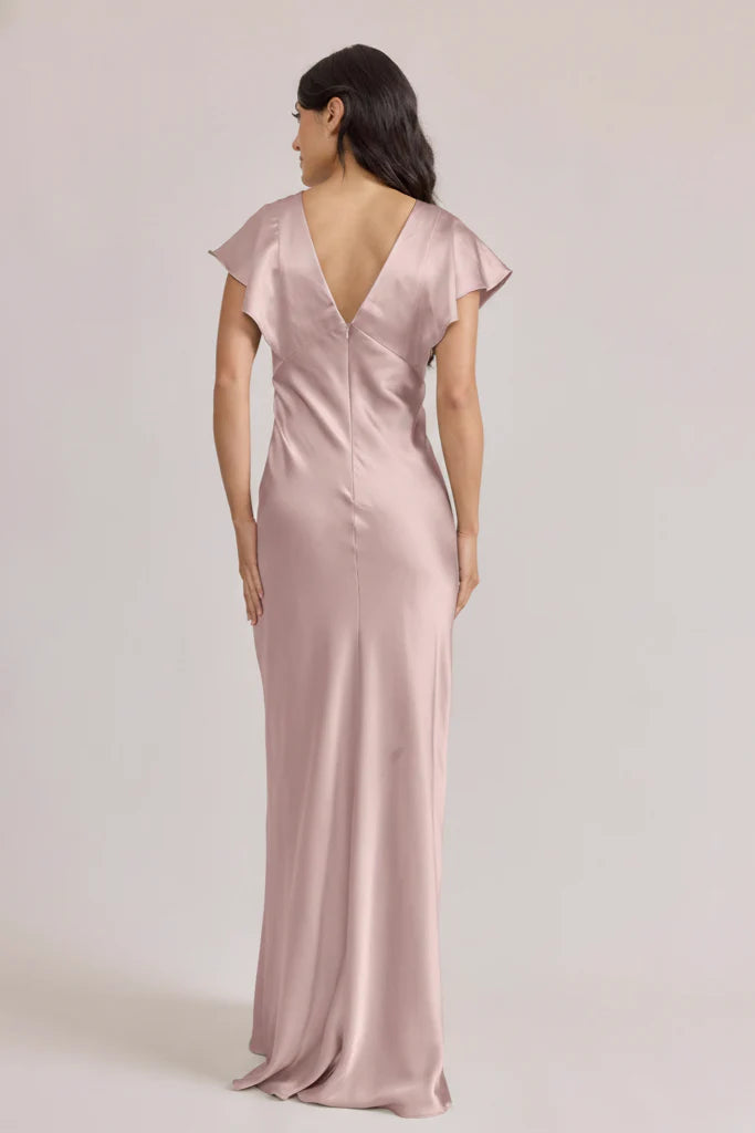 Effortlessly elegant, the Ellapink Satin Dress is a modern take on timeless romance. Designed with a sleek column silhouette and flattering empire waistline, Eden features a soft V-neckline and flutter sleeves that cascade from delicate princess seams. Built-in bra cups offer subtle support, while the back zipper ensures a smooth, tailored fit.