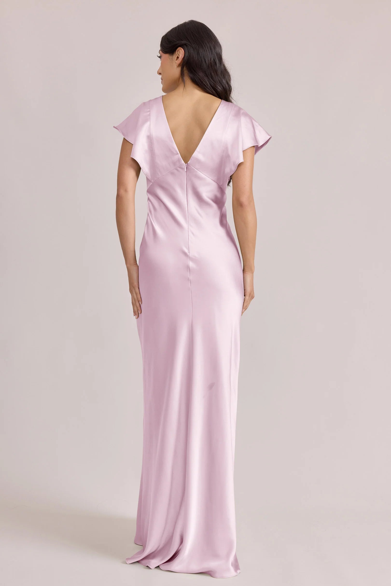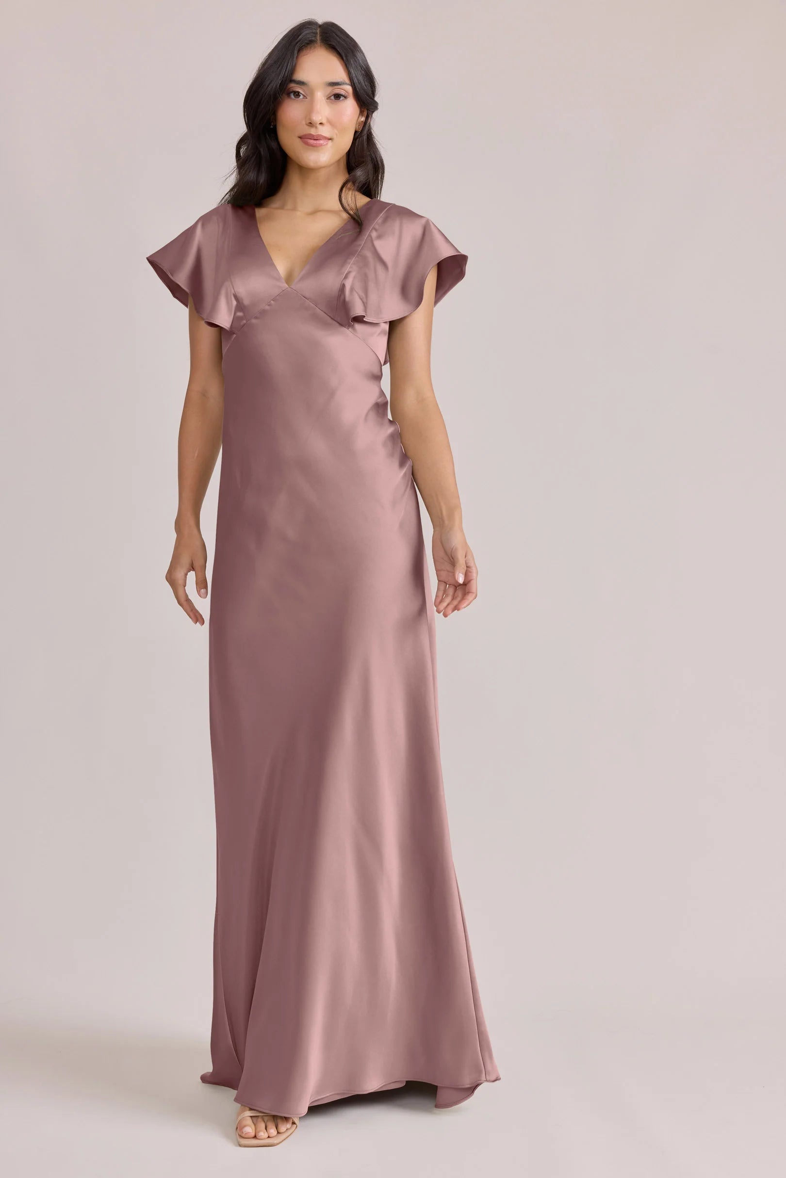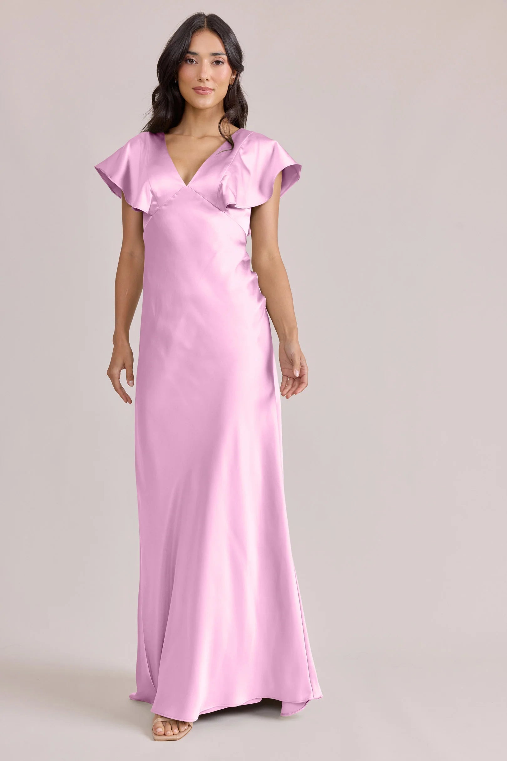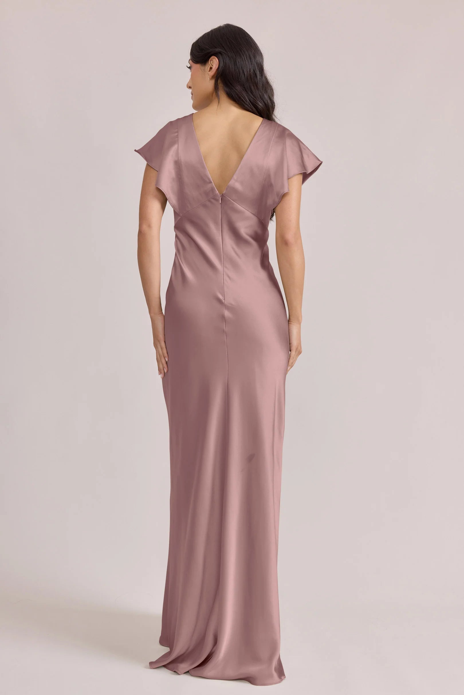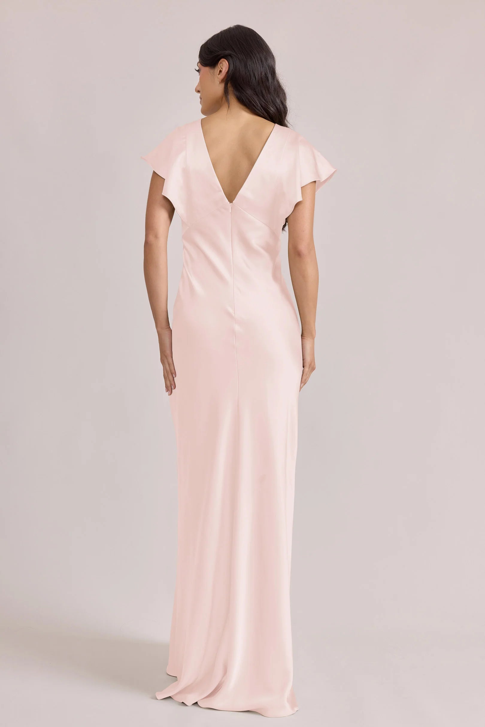Effortlessly elegant, the Ellapink Satin Dress is a modern take on timeless romance. Designed with a sleek column silhouette and flattering empire waistline, Eden features a soft V-neckline and flutter sleeves that cascade from delicate princess seams. Built-in bra cups offer subtle support, while the back zipper ensures a smooth, tailored fit.