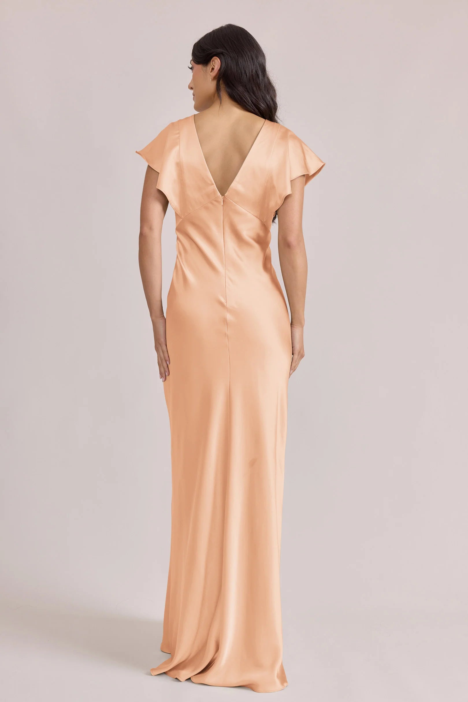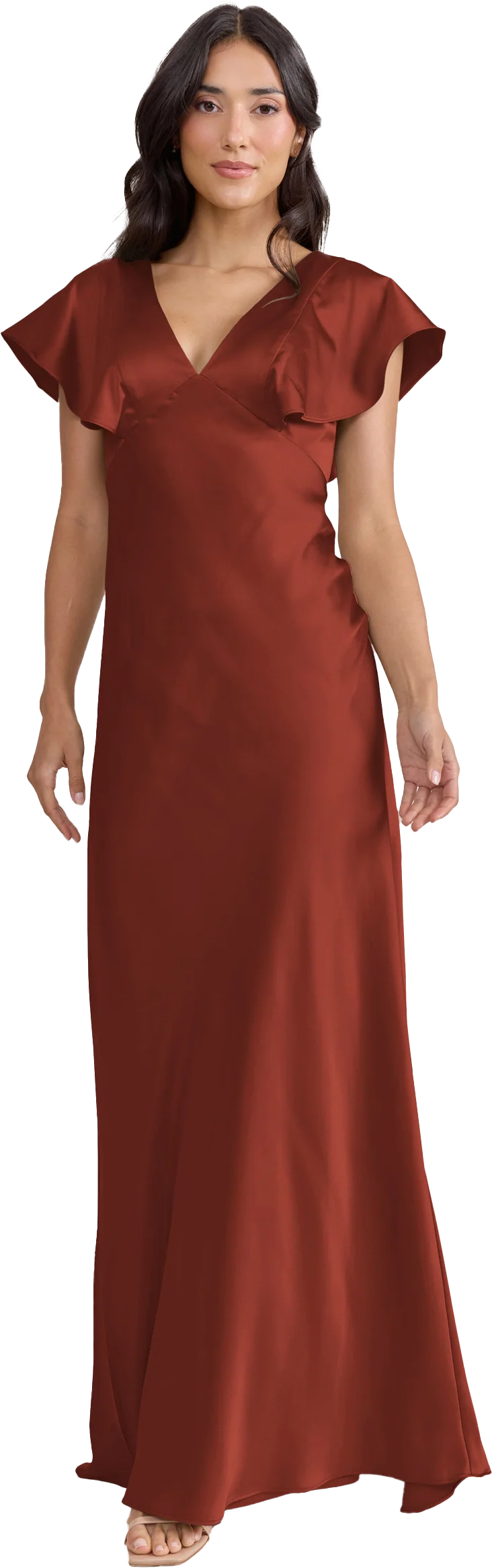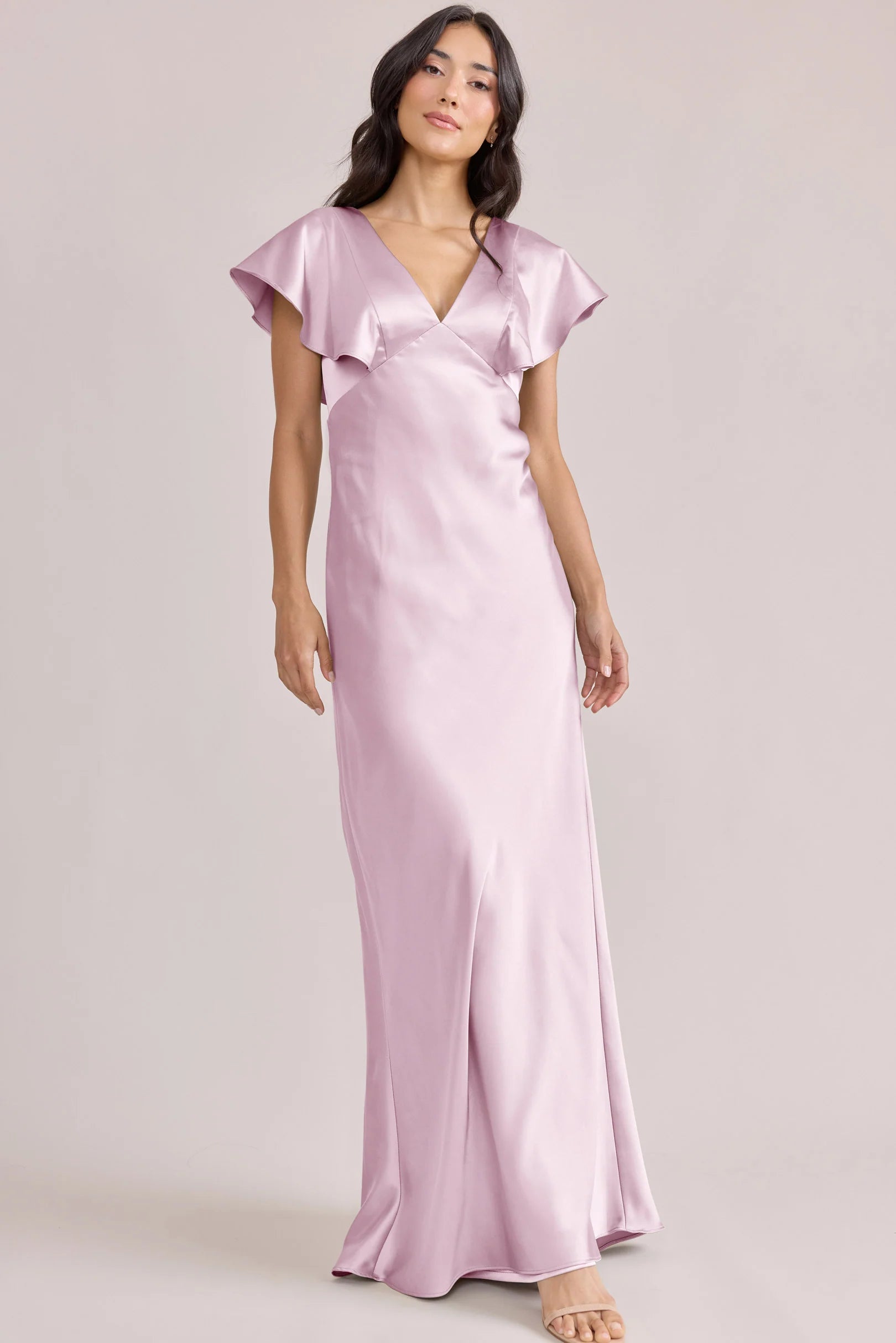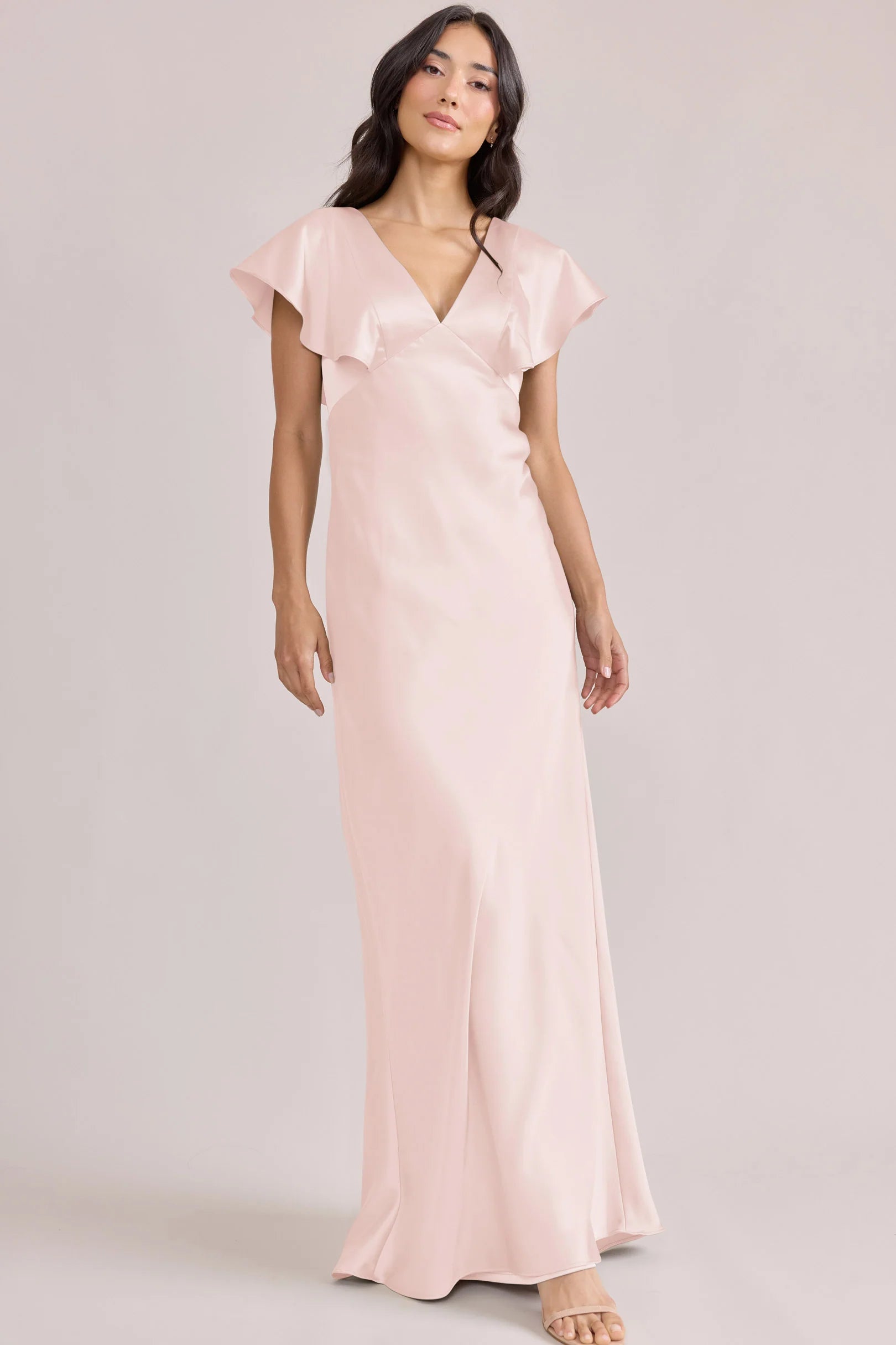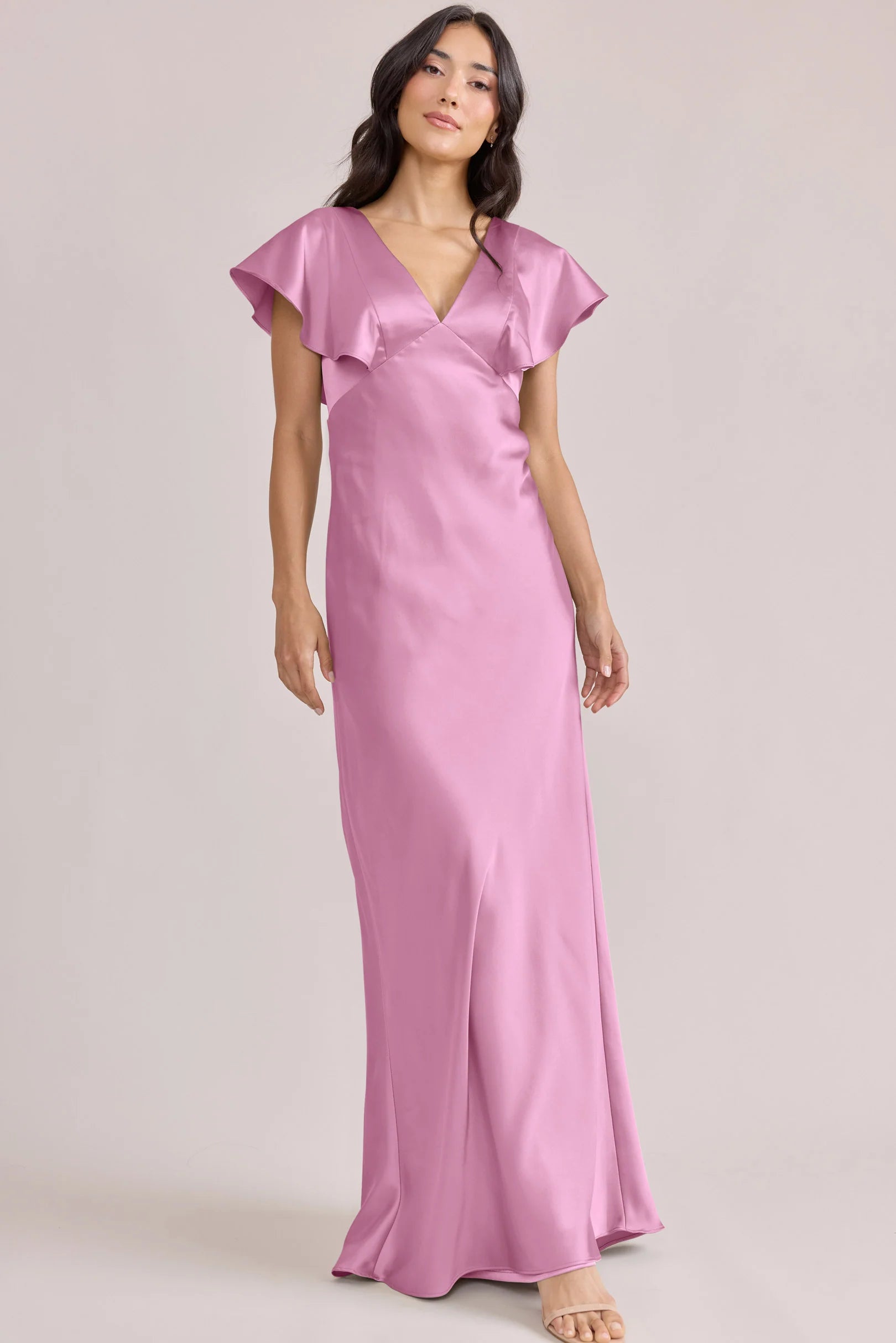 Effortlessly elegant, the Ellapink Satin Dress is a modern take on timeless romance. Designed with a sleek column silhouette and flattering empire waistline, Eden features a soft V-neckline and flutter sleeves that cascade from delicate princess seams. Built-in bra cups offer subtle support, while the back zipper ensures a smooth, tailored fit.